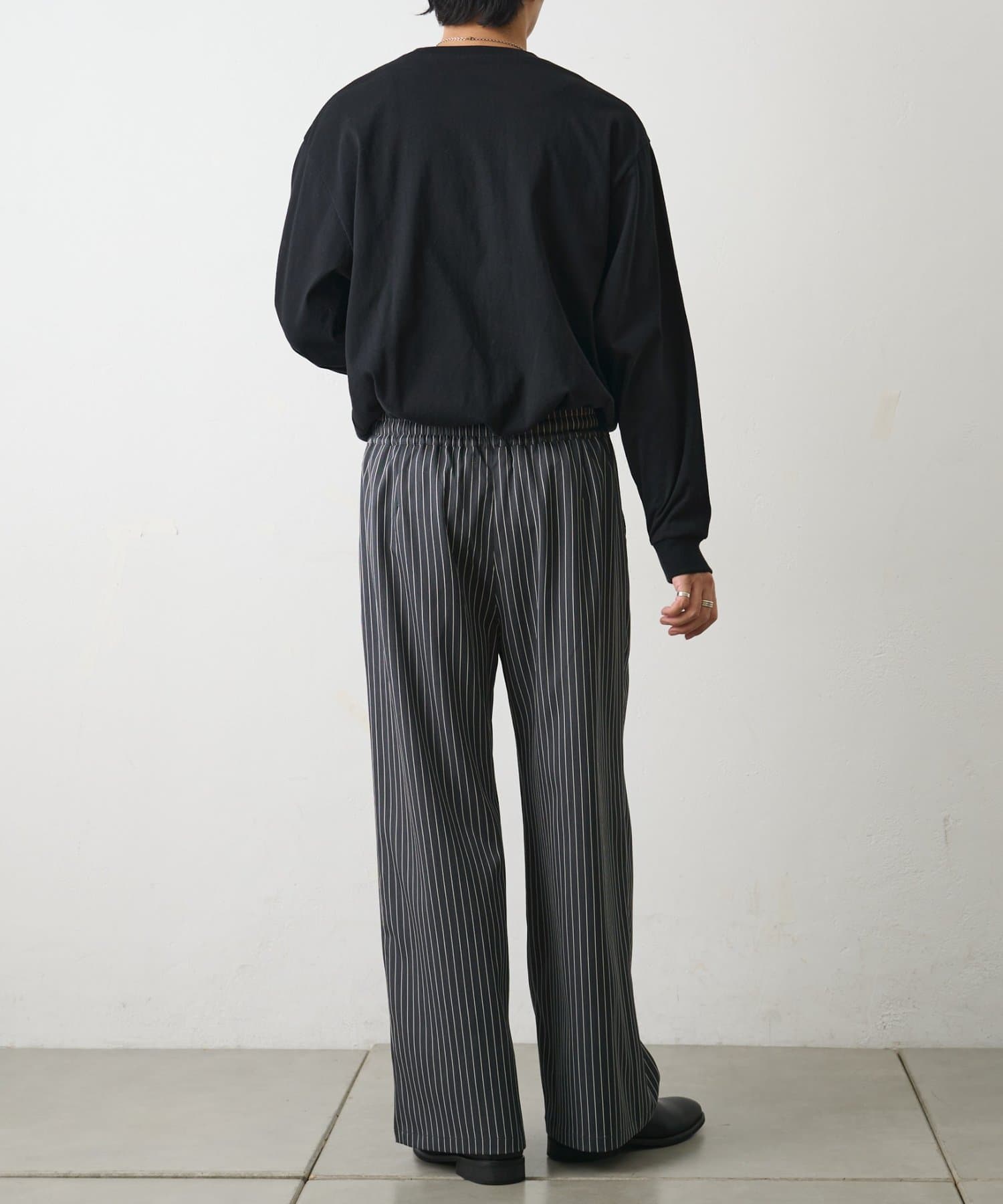 細かなピンストライプ柄が縦のラインを強調しすっきりとした印象を演出するイージーパンツです。