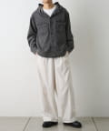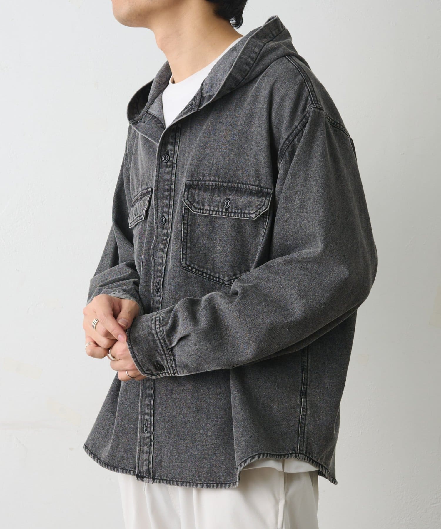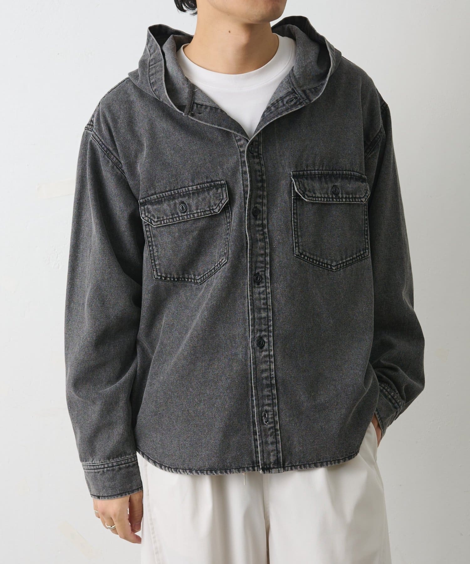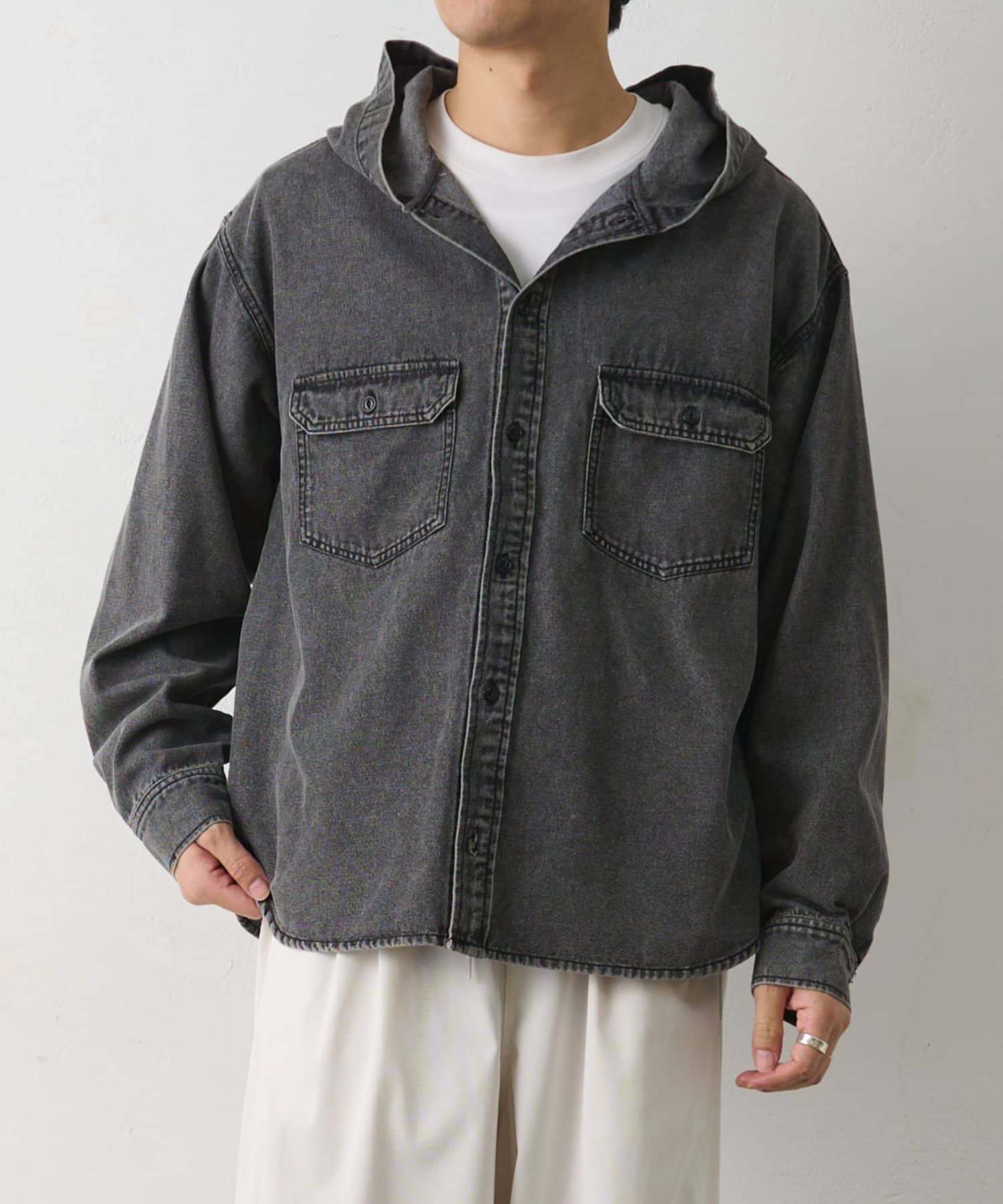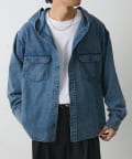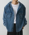 カジュアルなデニム素材にフードデザインを組み合わせた、シャツ感覚で羽織れるフードシャです。