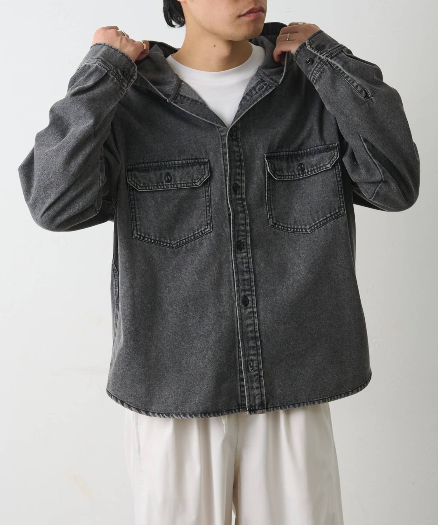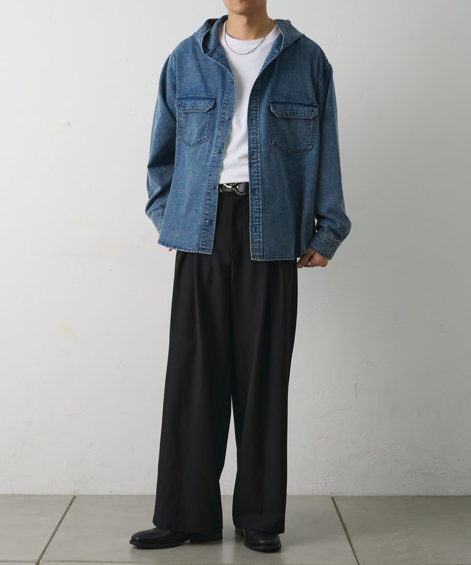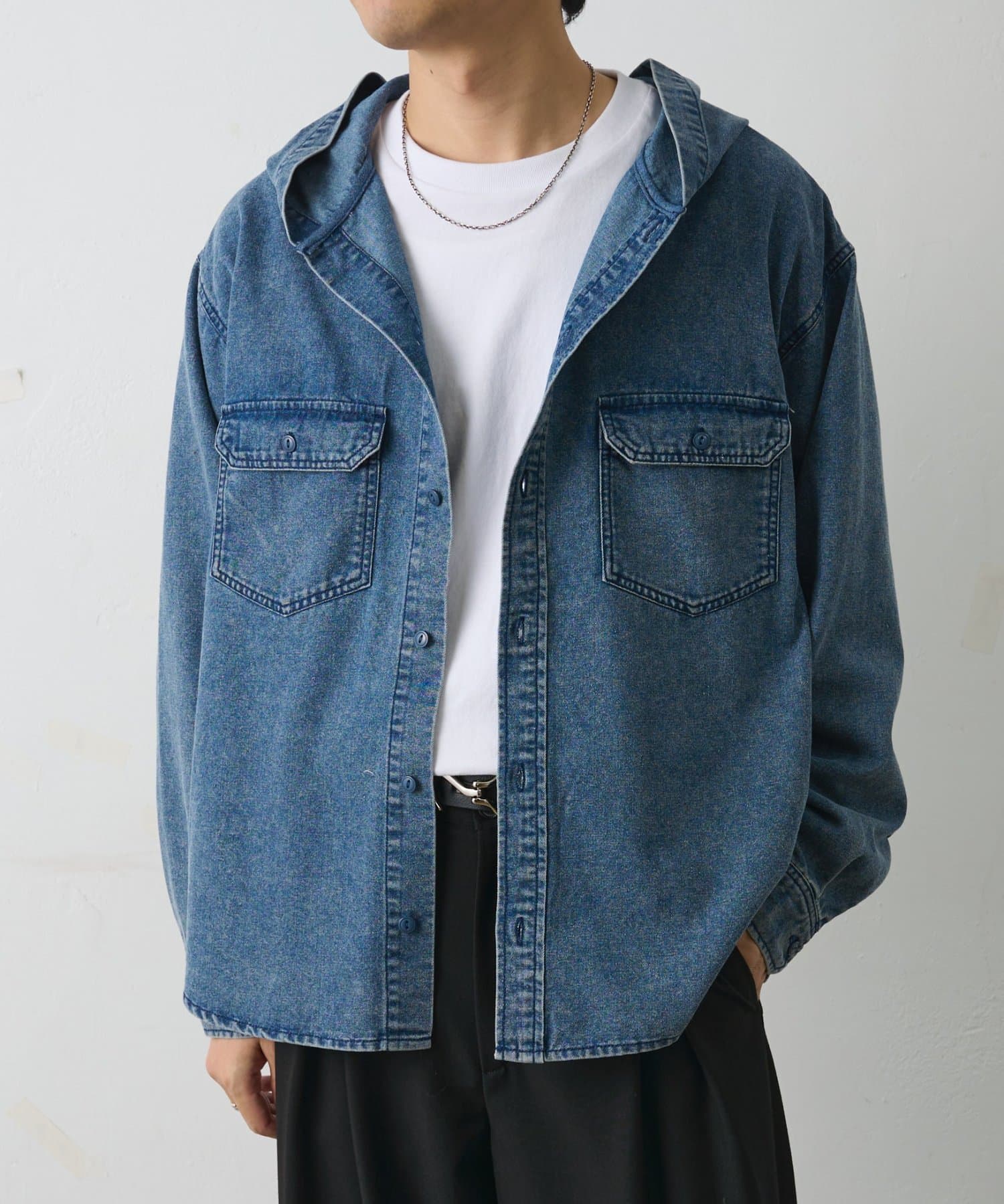 【シャツとパーカーの要素を掛け合わせたデニムフードシャツ】