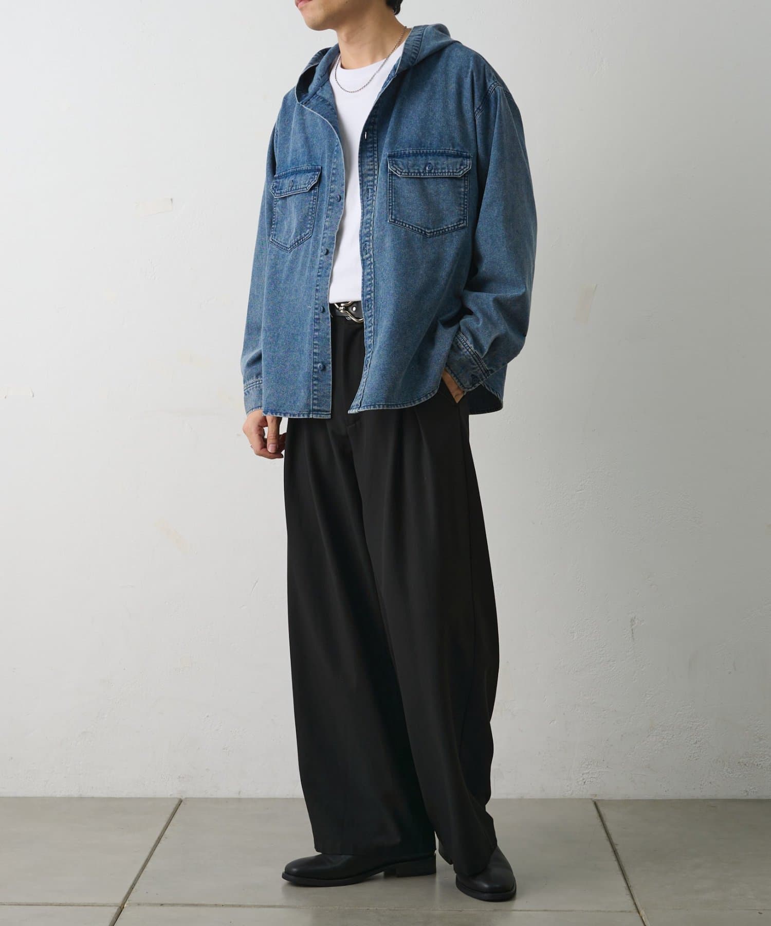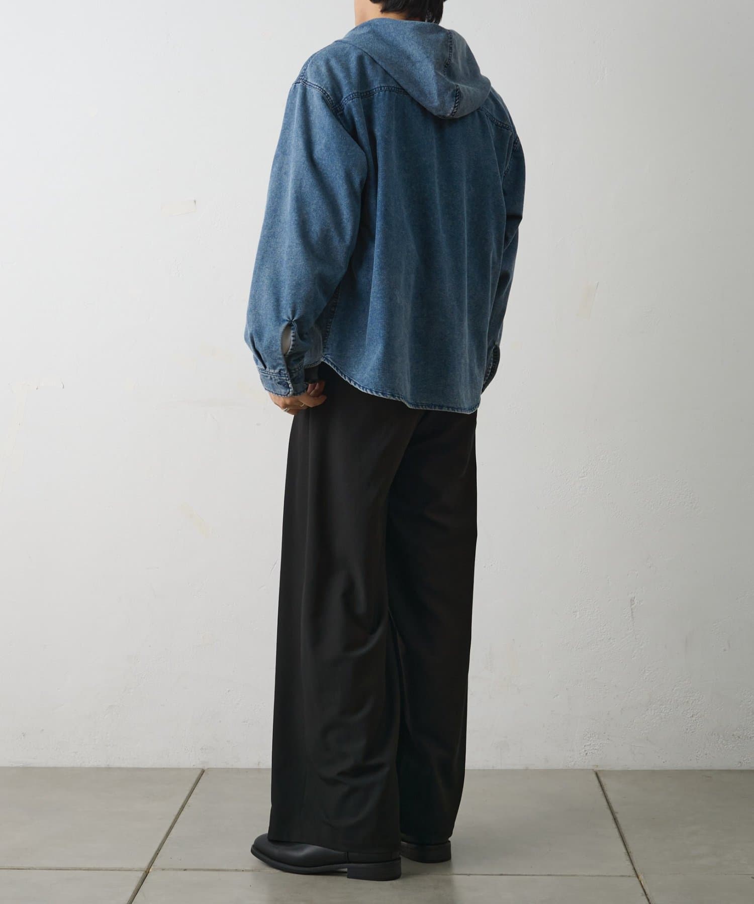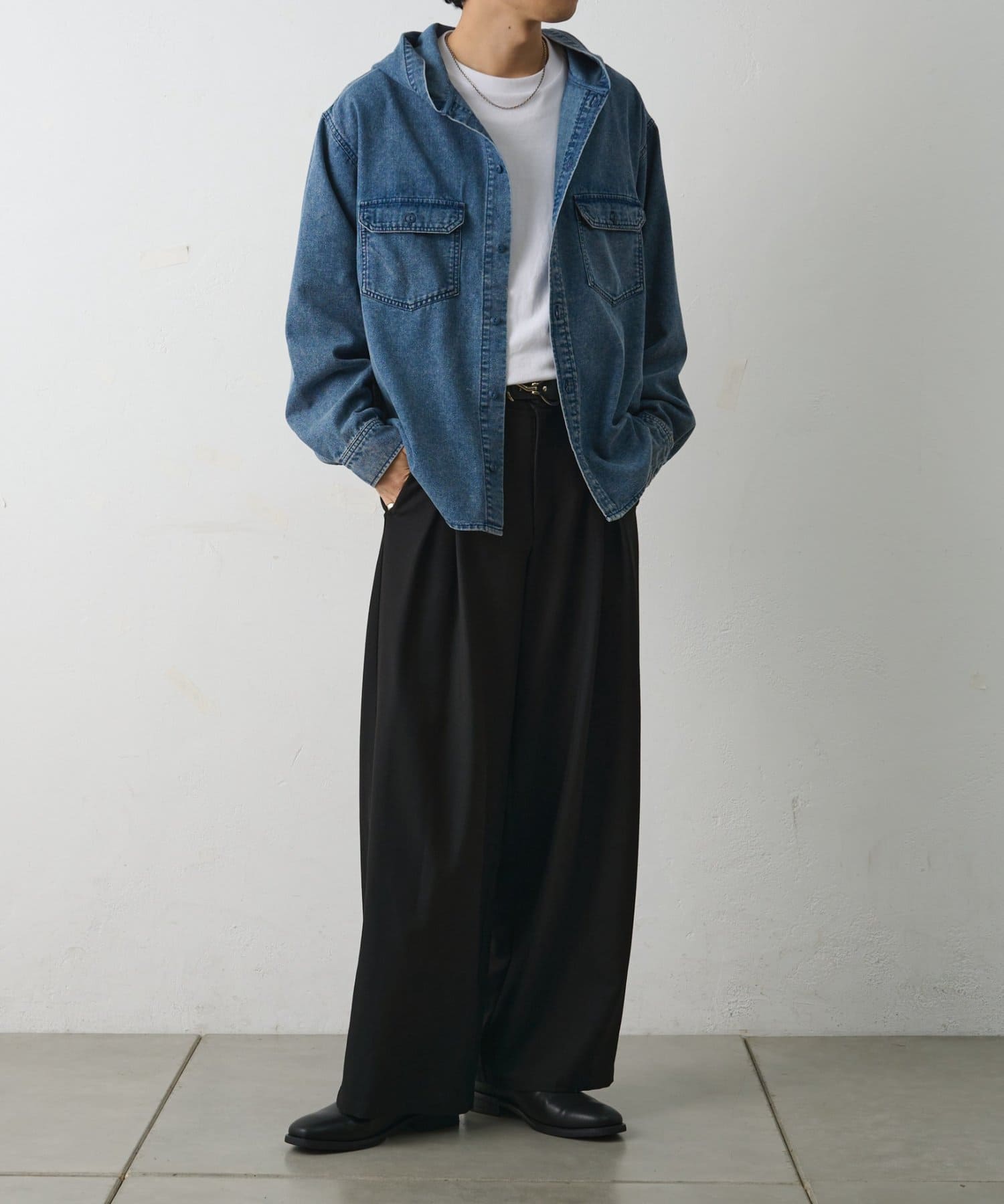 【シャツとパーカーの要素を掛け合わせたデニムフードシャツ】