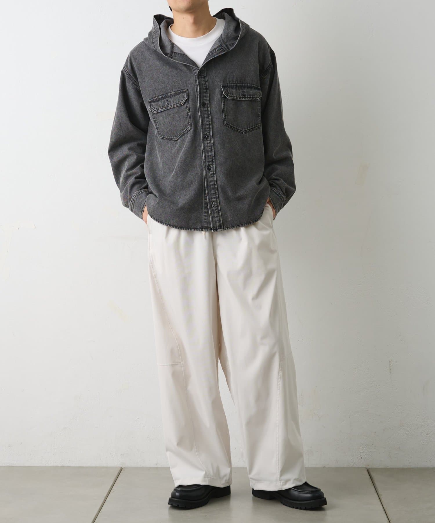 フードがスタイリングのアクセントになり、シンプルなコーディネートでも存在感を演出できます。