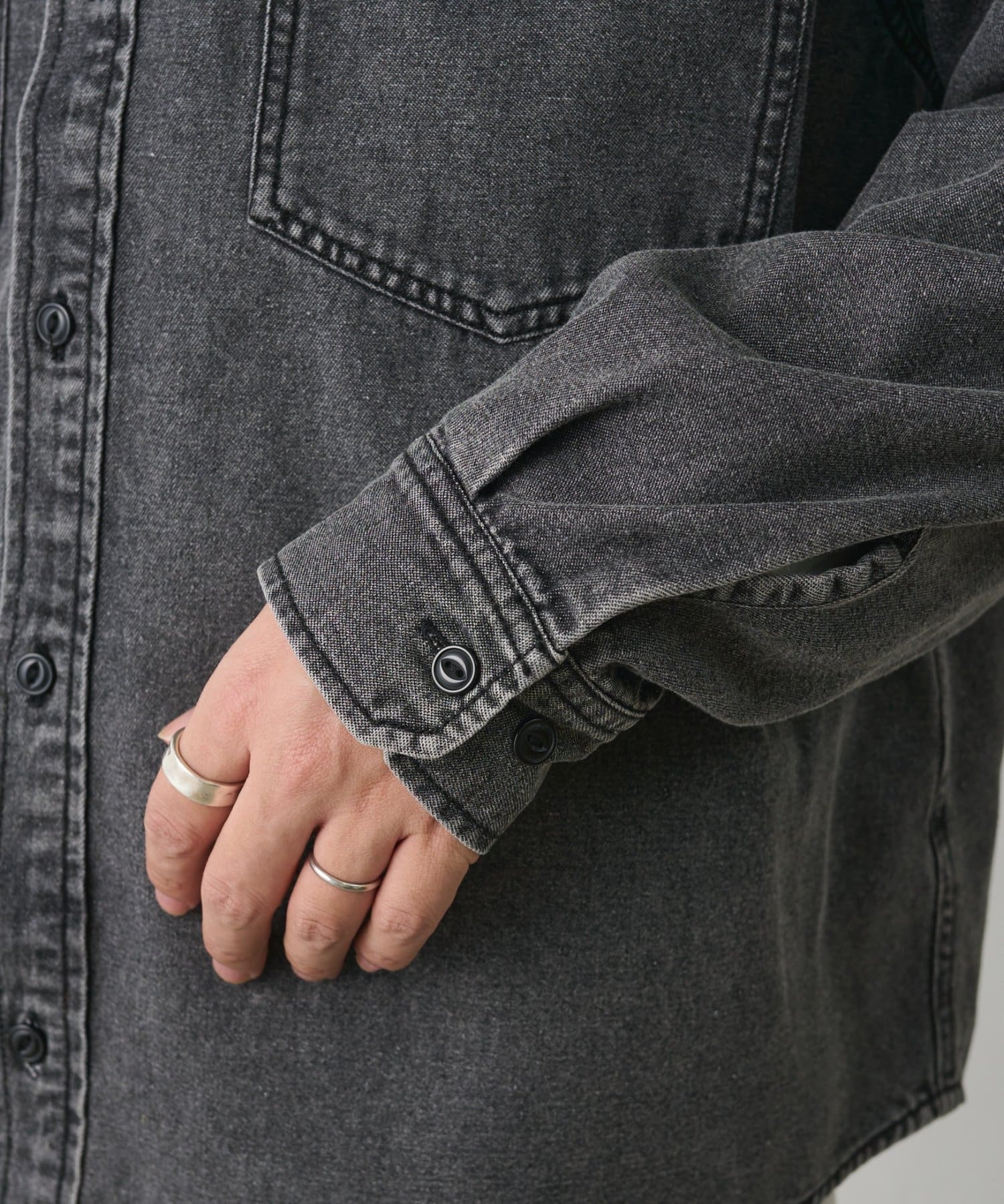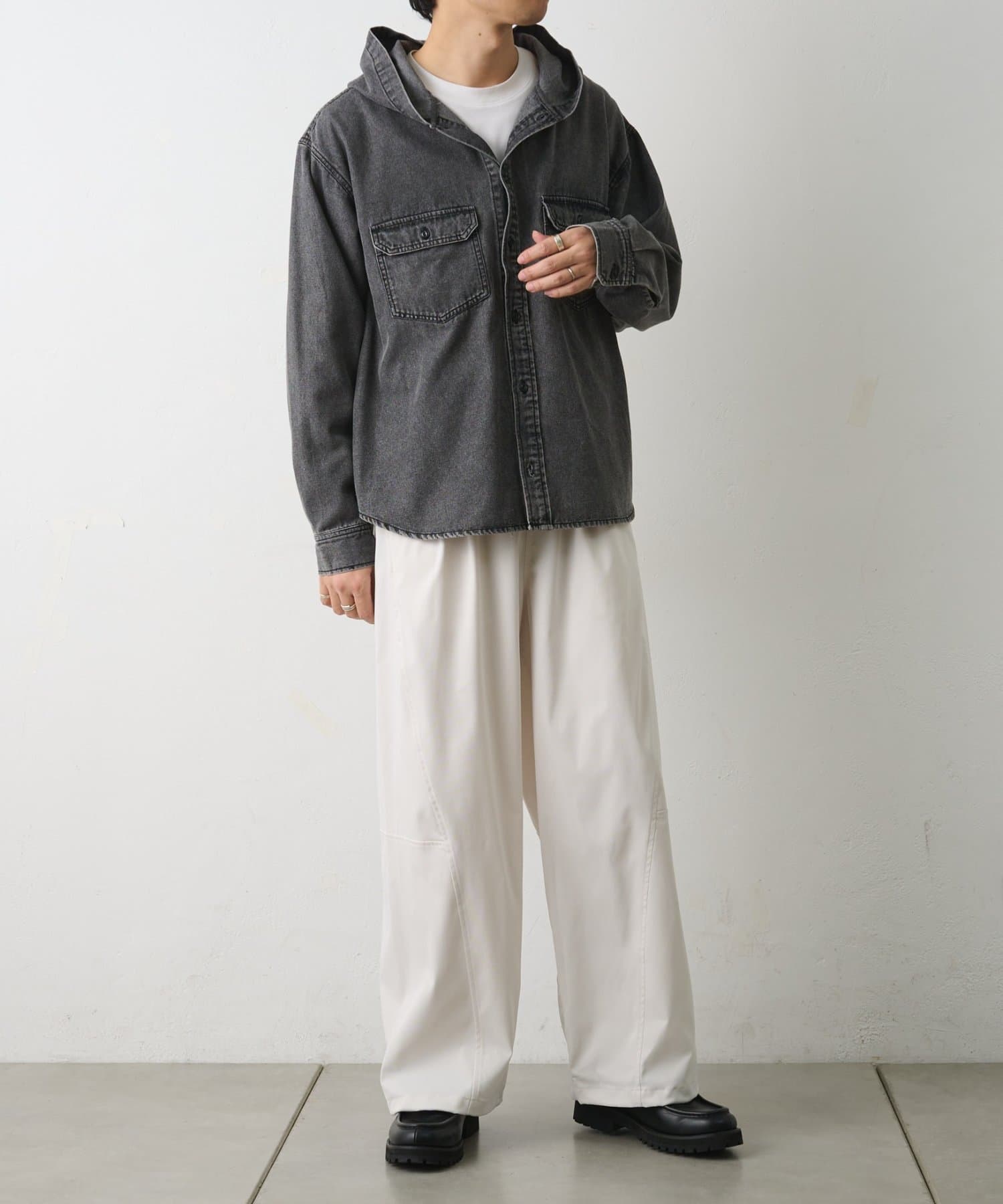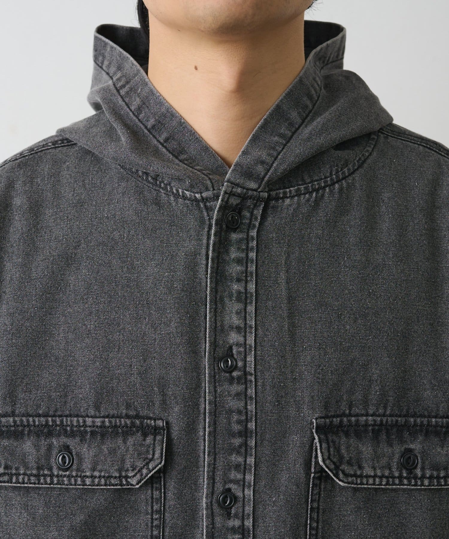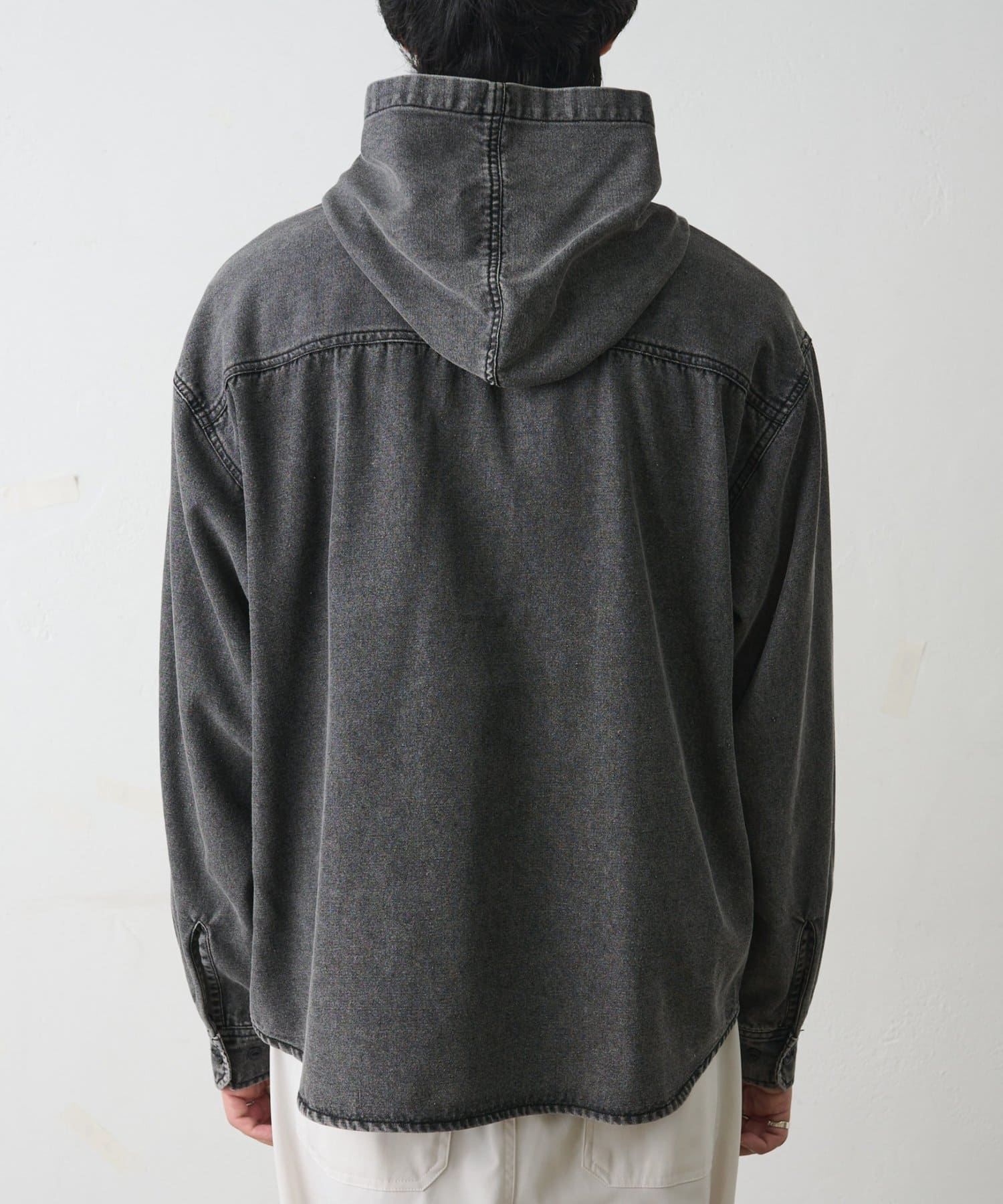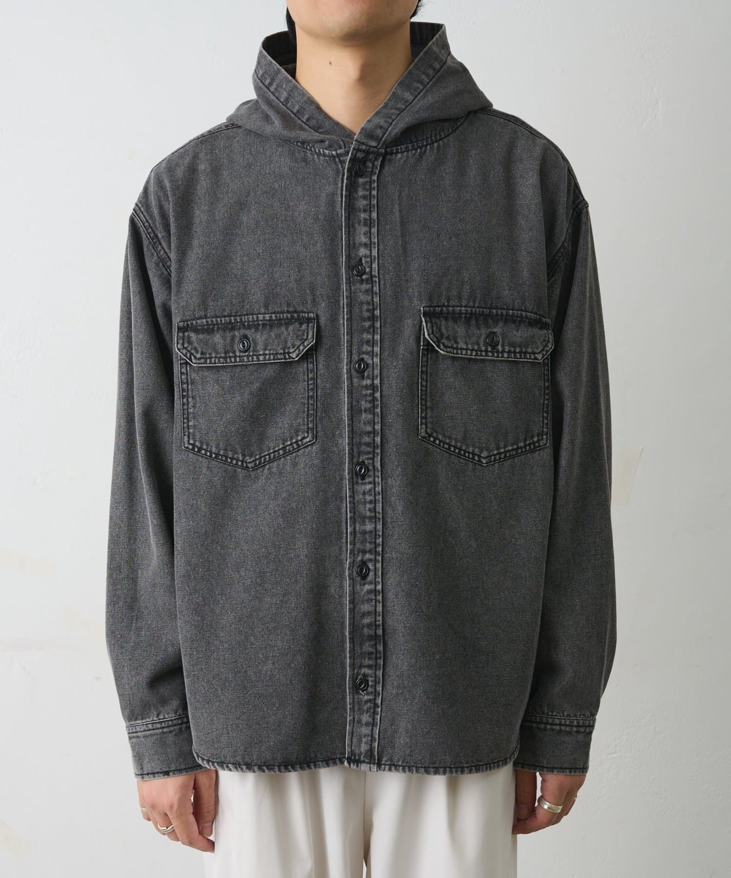 【シャツとパーカーの要素を掛け合わせたデニムフードシャツ】