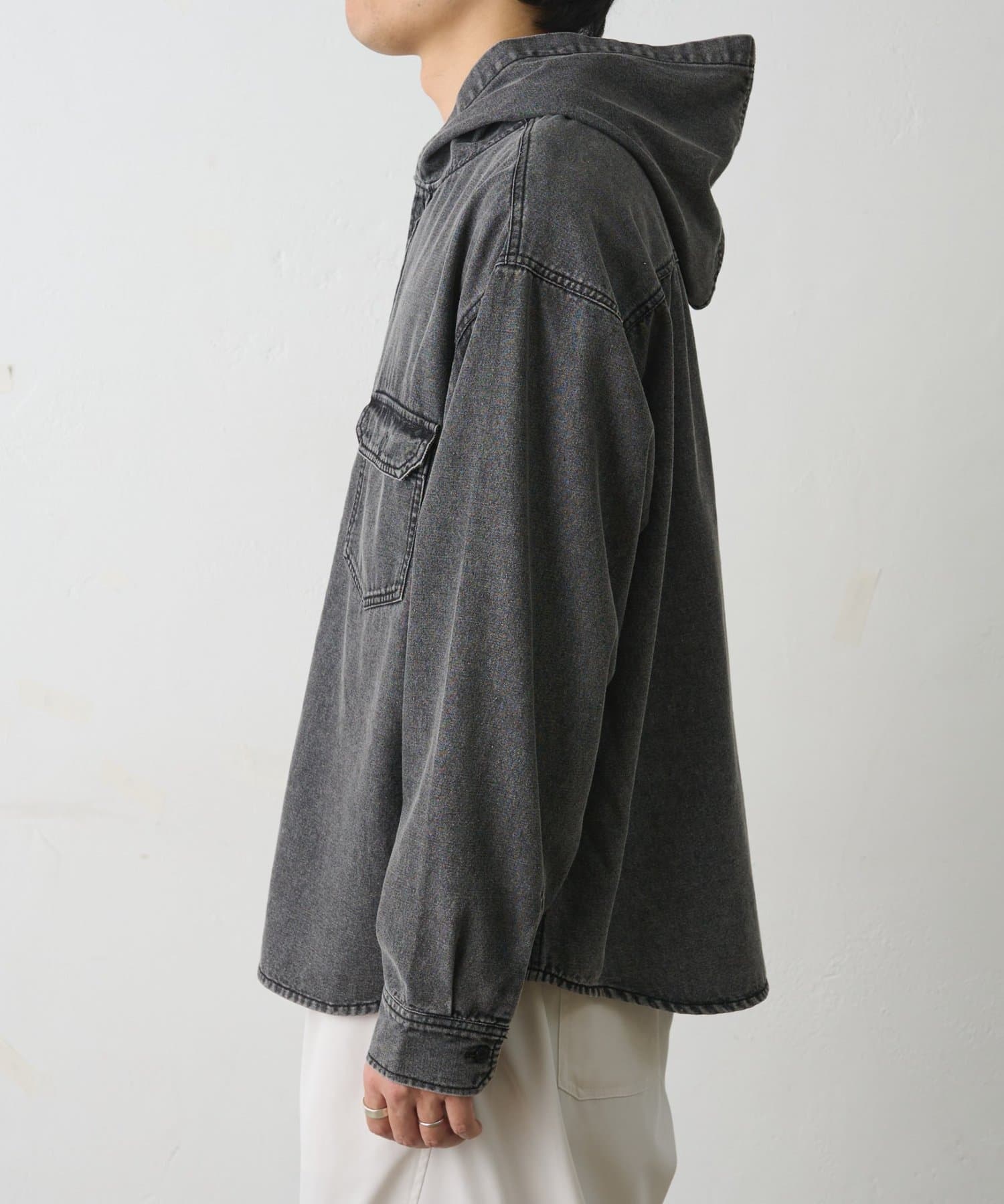 カジュアルなデニム素材にフードデザインを組み合わせた、シャツ感覚で羽織れるフードシャです。