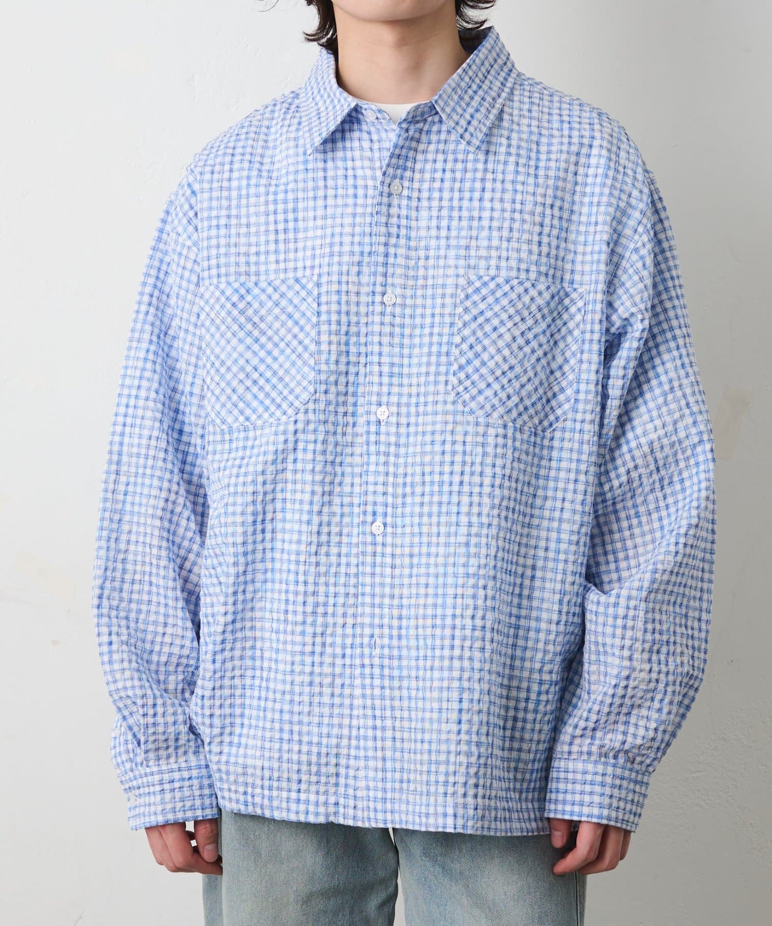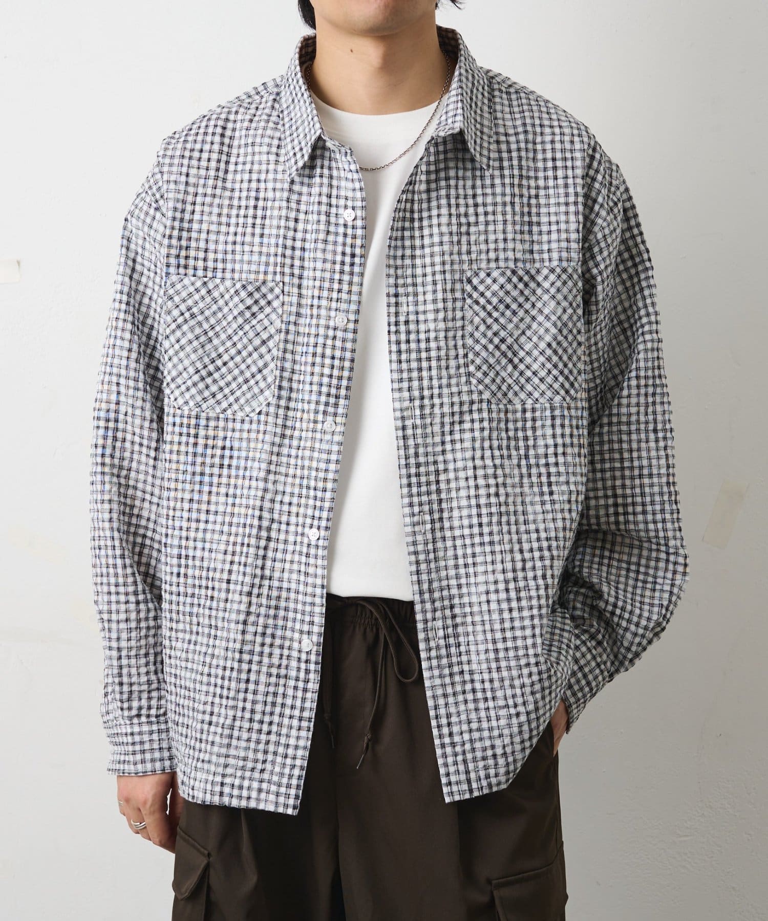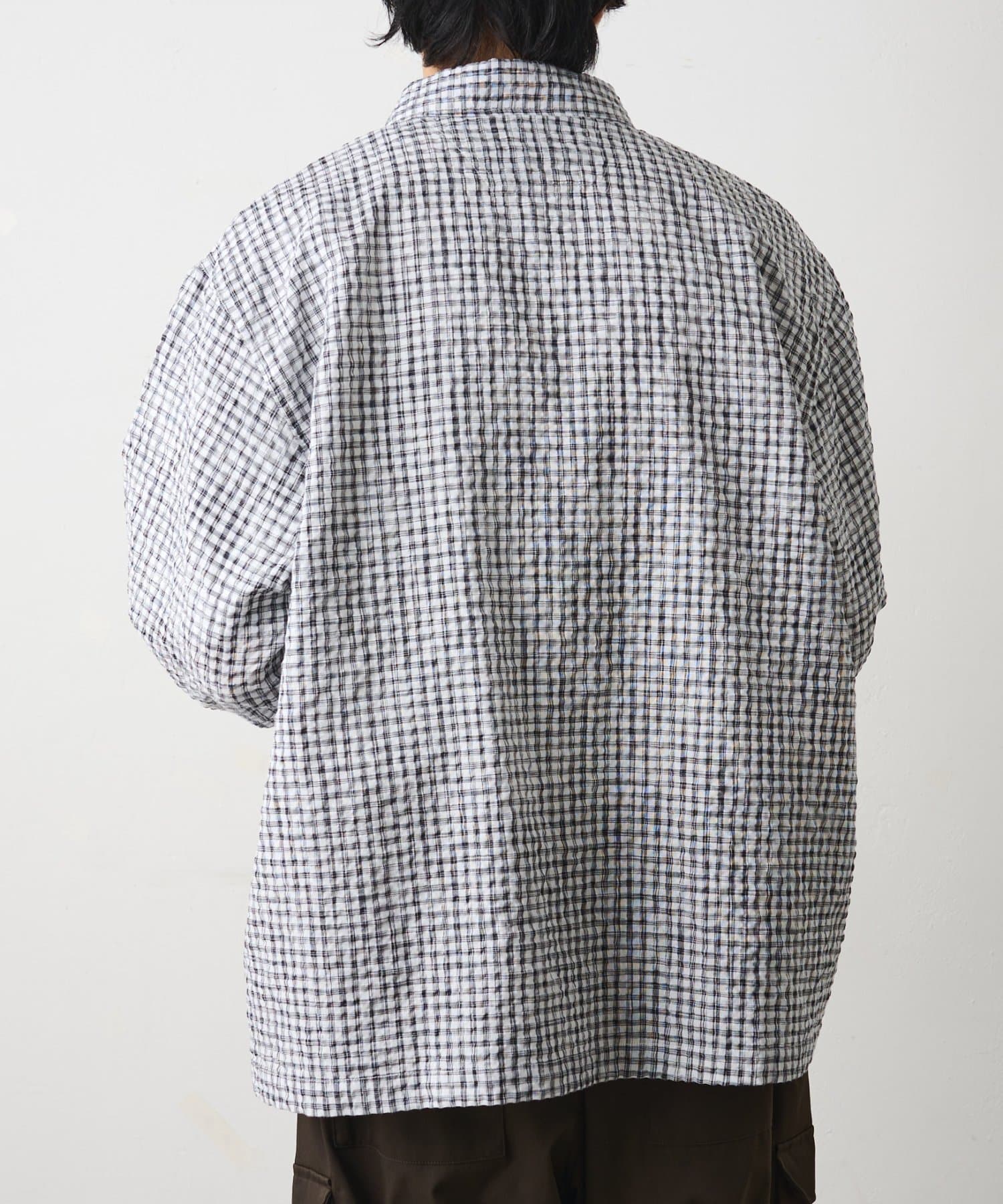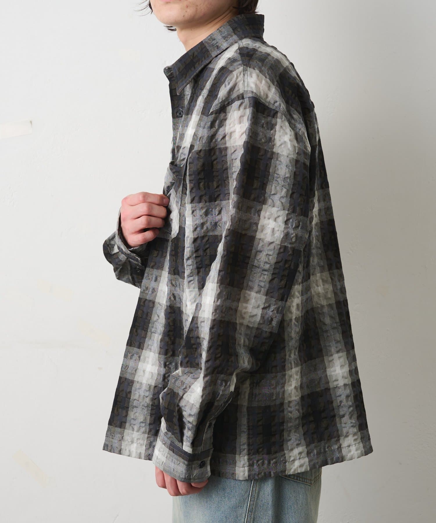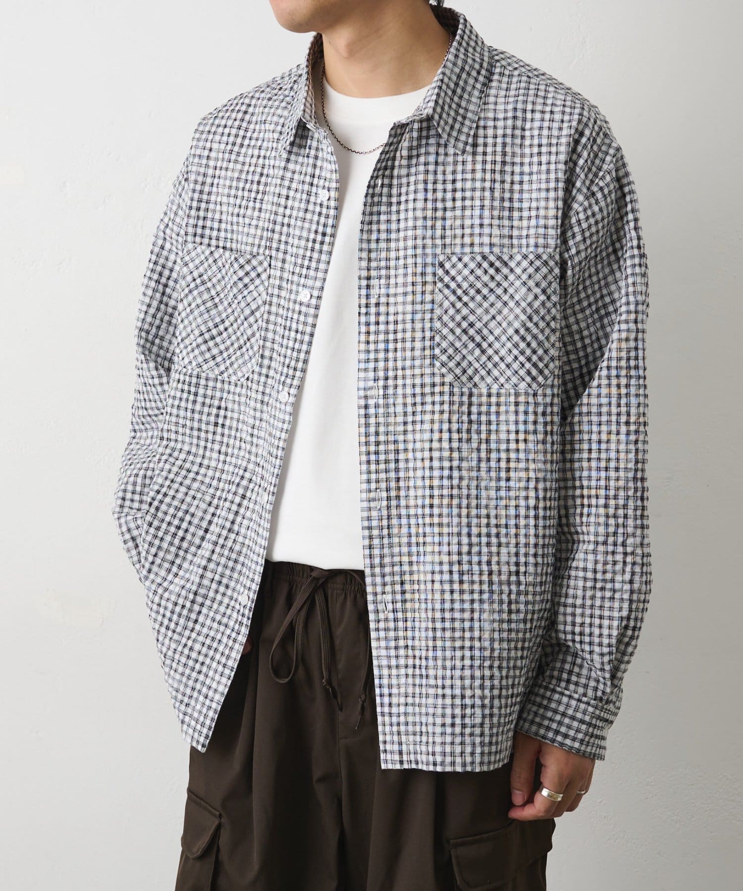肌への接地面が少なく、汗をかいてもベタつきにくいサッカー素材を採用。収縮率の異なるタテ糸を組み合わせて平織りし、凹凸(シボ)を出したすことで立体感のあるチェック柄シャツになっています。通気性が高く春から夏に着用可能。ややゆとりのあるリラックスシルエットになっているので、今年らしい抜け感のある着こなしが楽しめます。