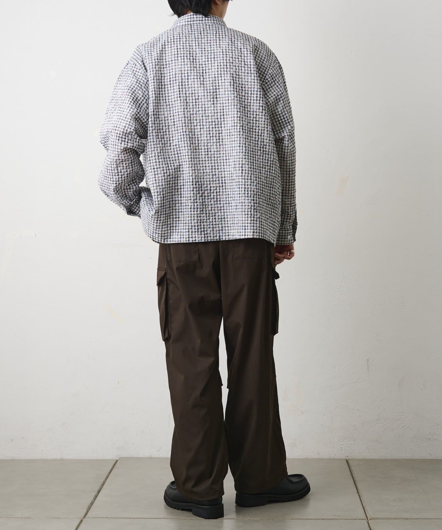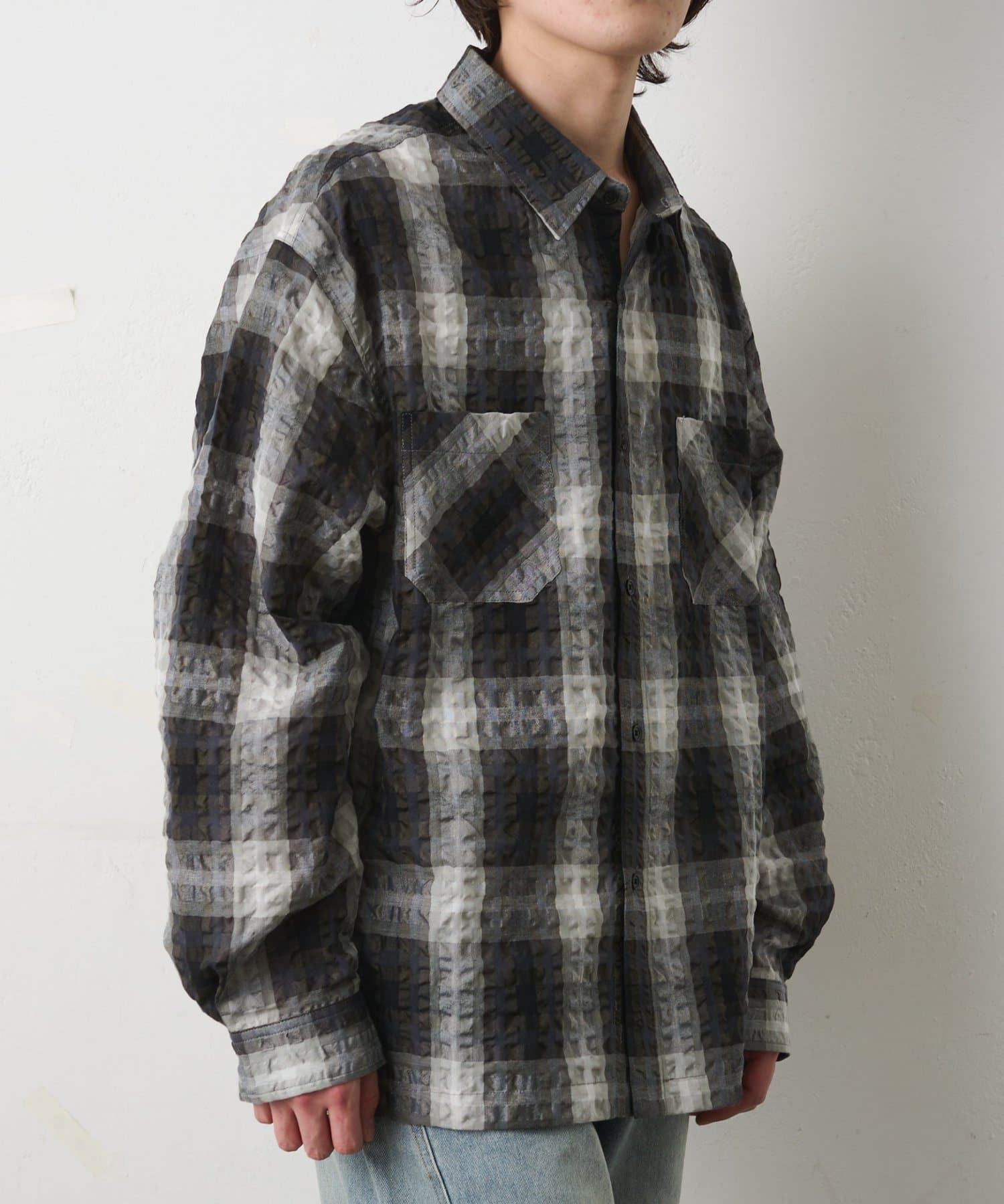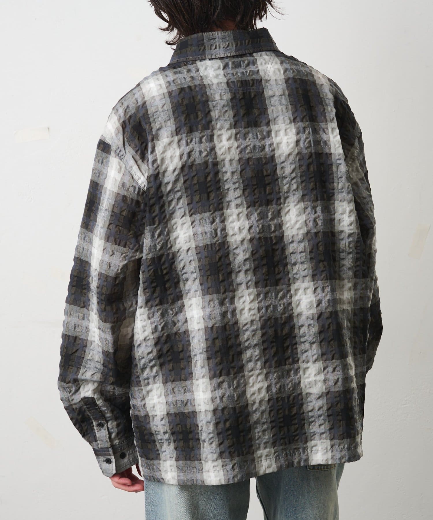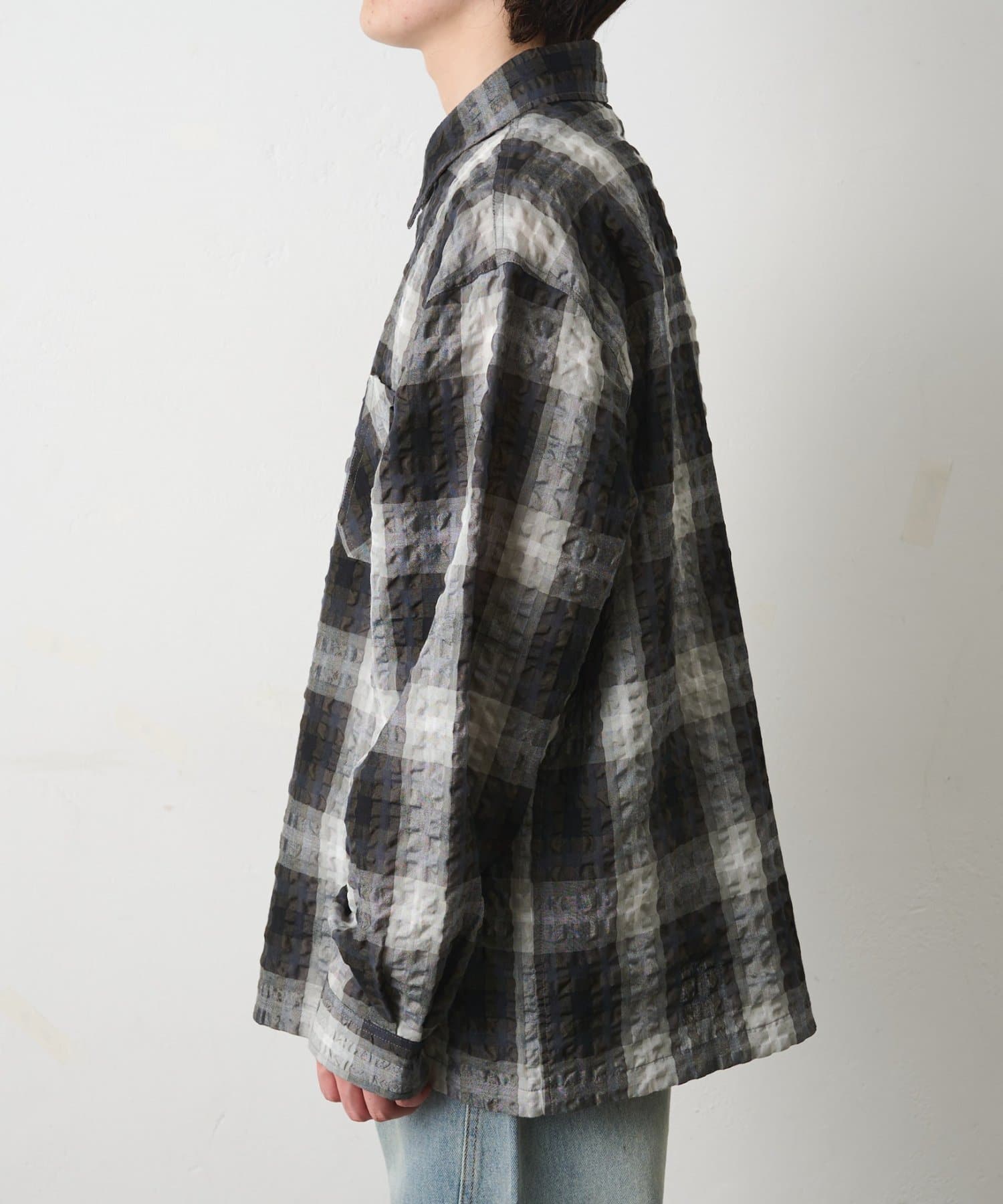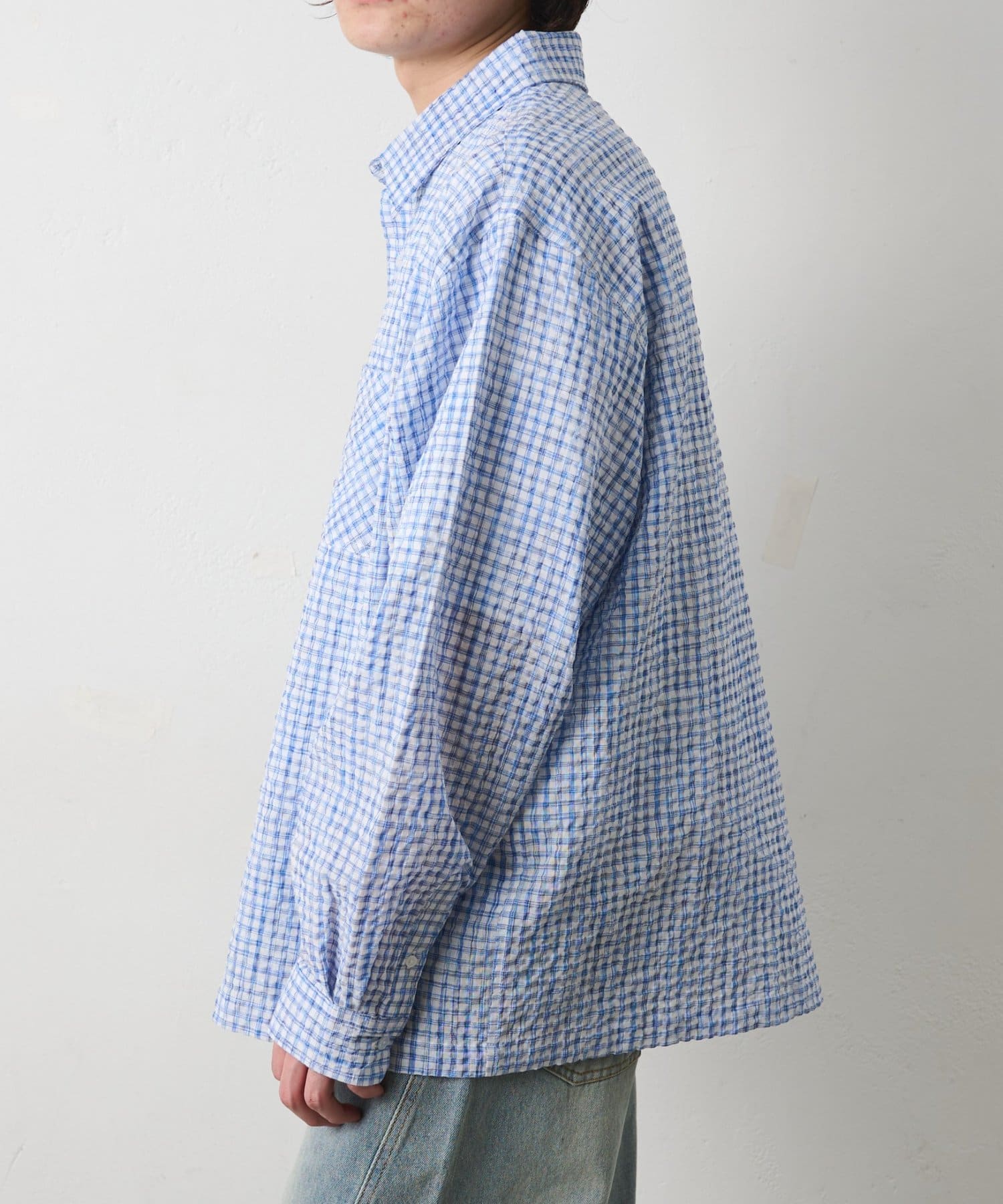 肌への接地面が少なく、汗をかいてもベタつきにくいサッカー素材を採用。収縮率の異なるタテ糸を組み合わせて平織りし、凹凸(シボ)を出したすことで立体感のあるチェック柄シャツになっています。通気性が高く春から夏に着用可能。ややゆとりのあるリラックスシルエットになっているので、今年らしい抜け感のある着こなしが楽しめます。