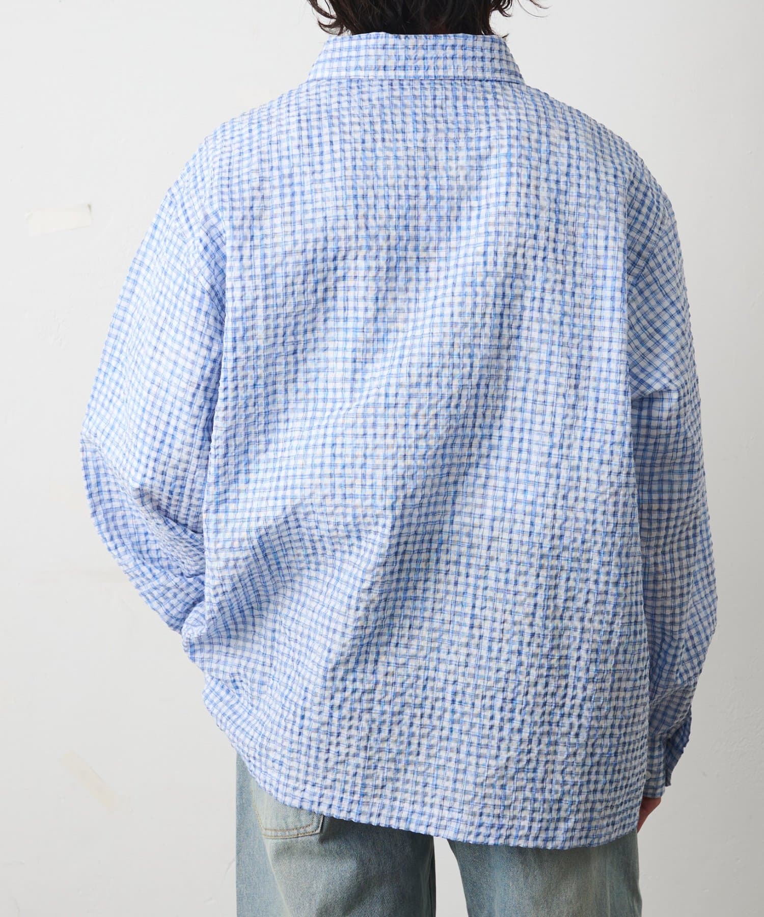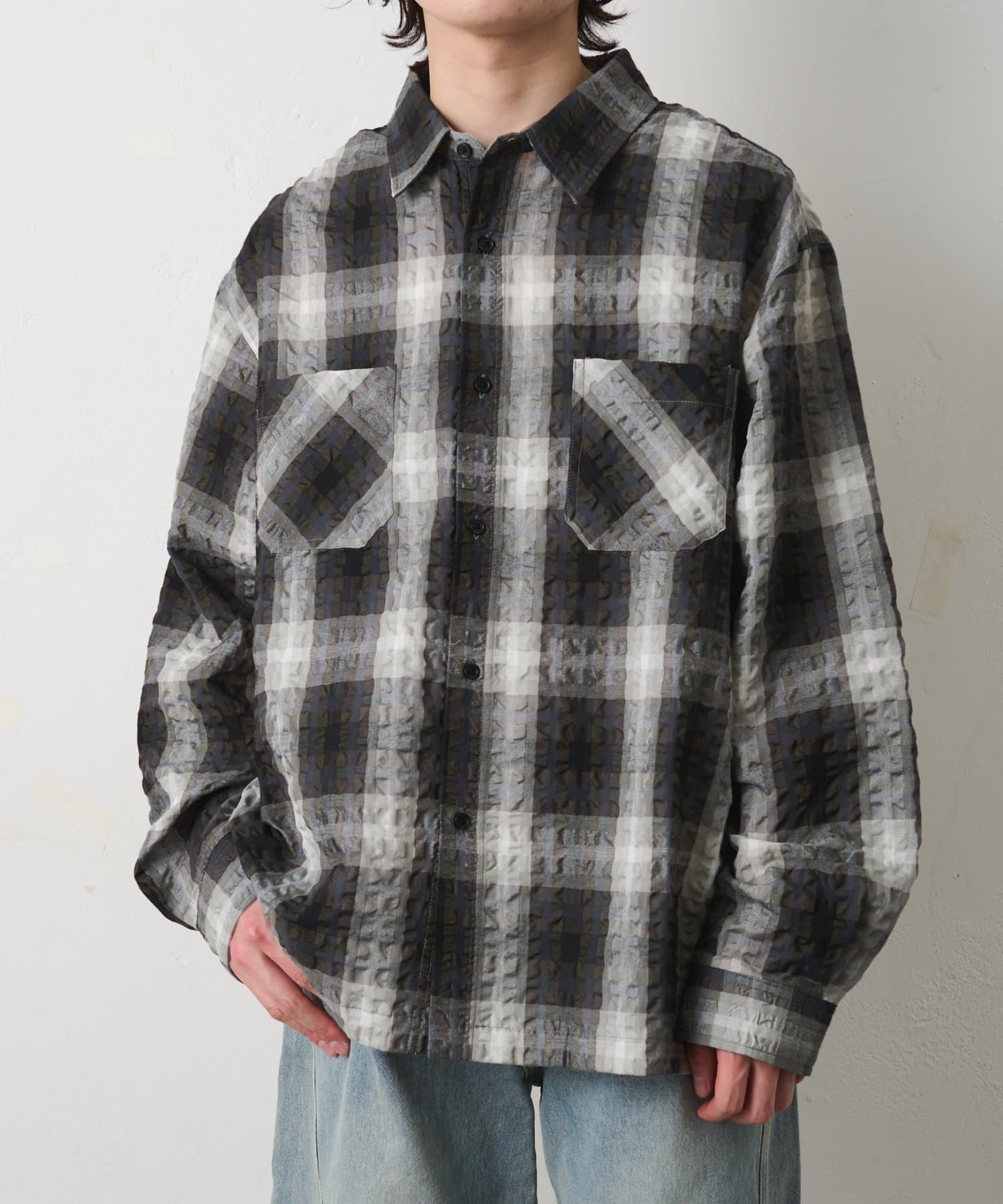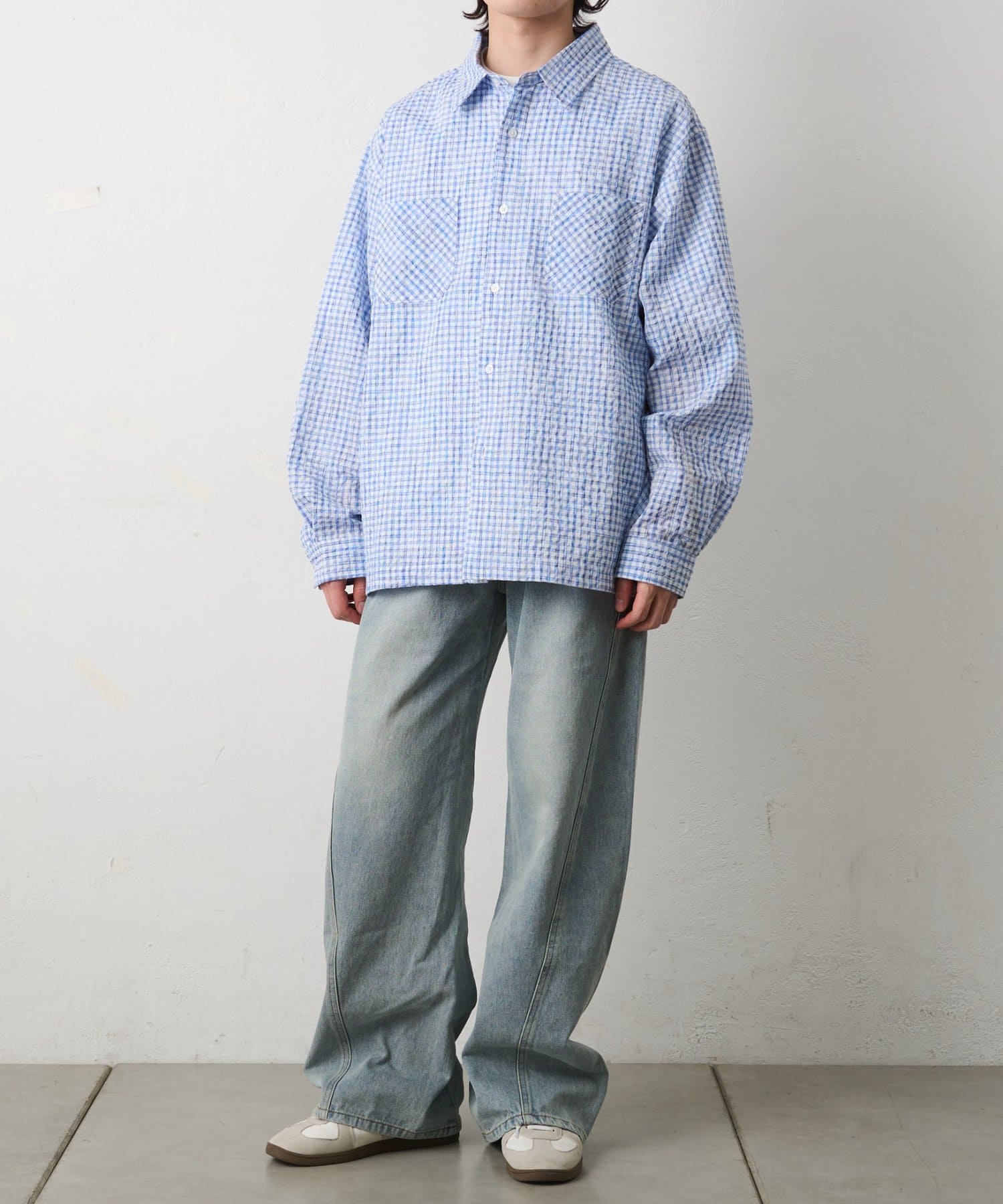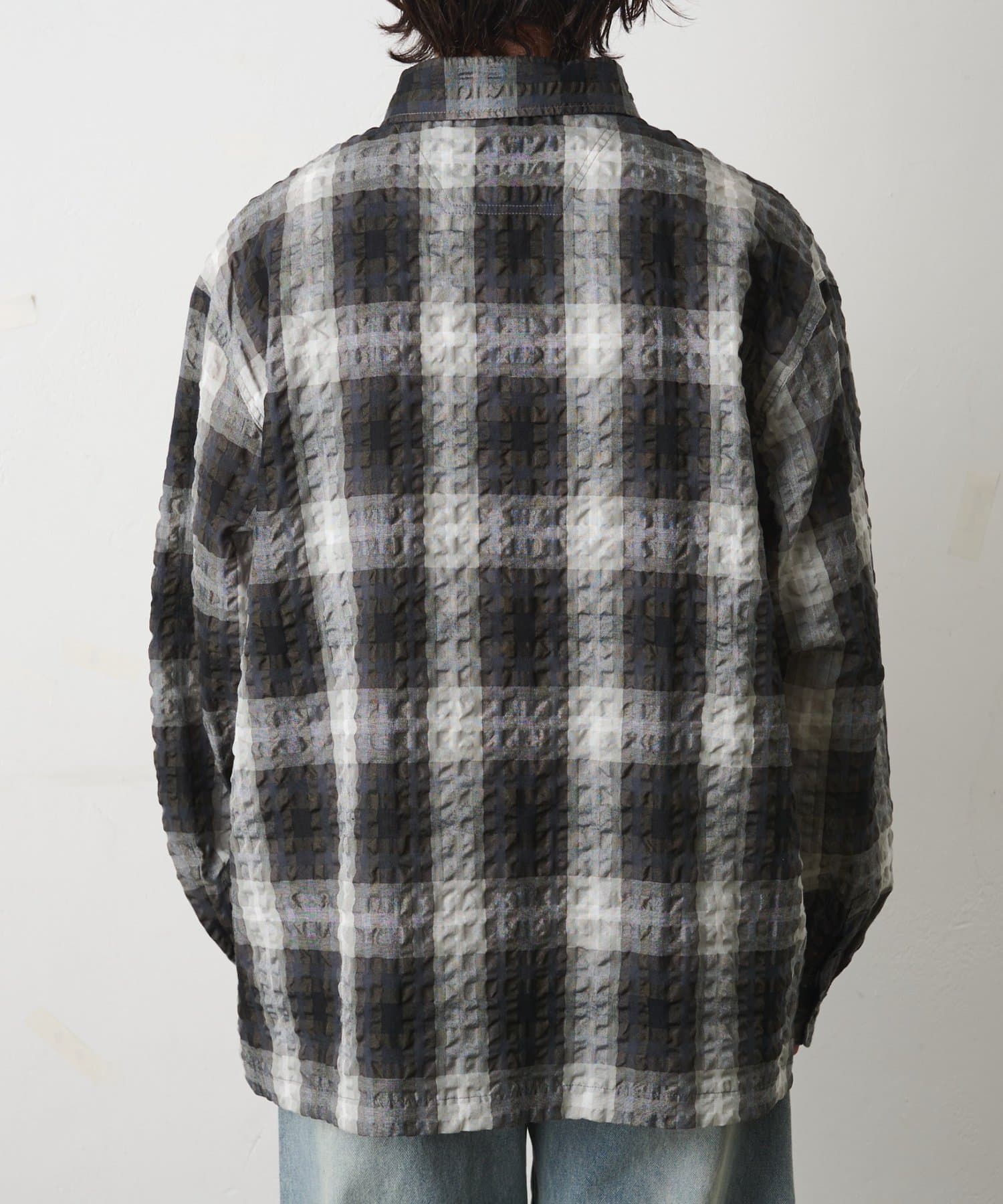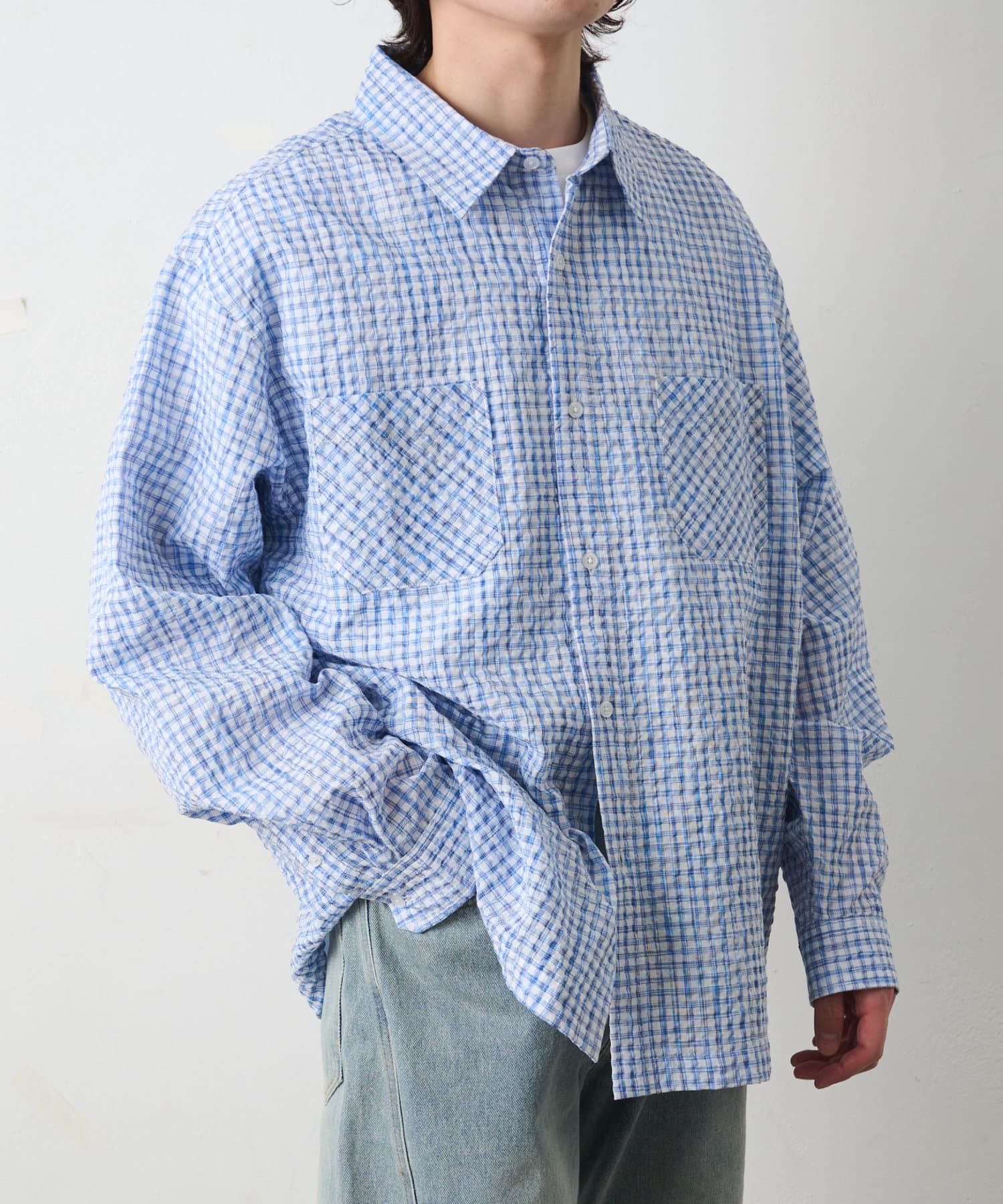 肌への接地面が少なく、汗をかいてもベタつきにくいサッカー素材を採用。収縮率の異なるタテ糸を組み合わせて平織りし、凹凸(シボ)を出したすことで立体感のあるチェック柄シャツになっています。通気性が高く春から夏に着用可能。ややゆとりのあるリラックスシルエットになっているので、今年らしい抜け感のある着こなしが楽しめます。