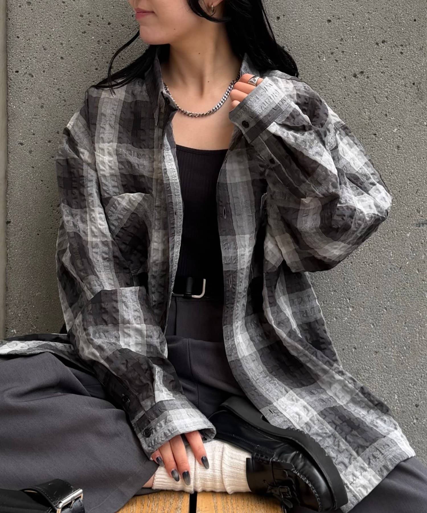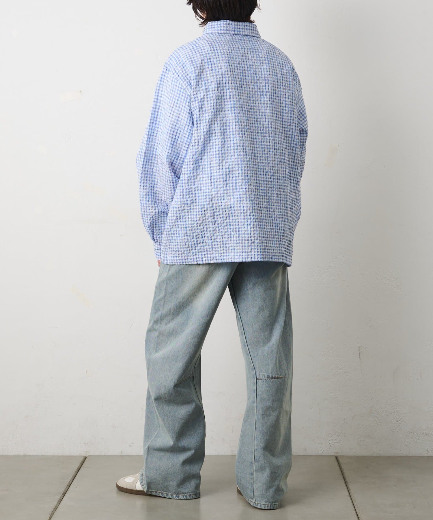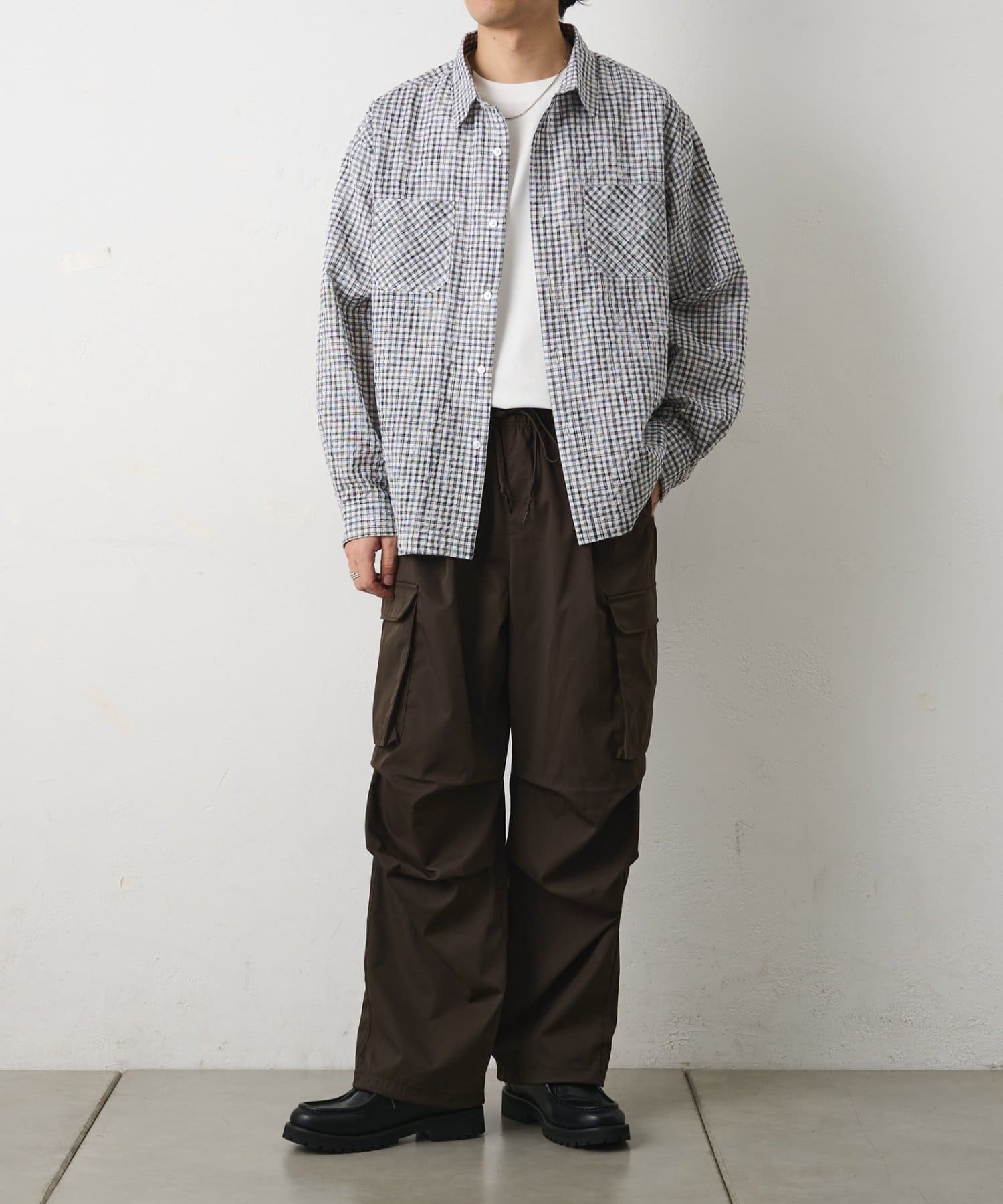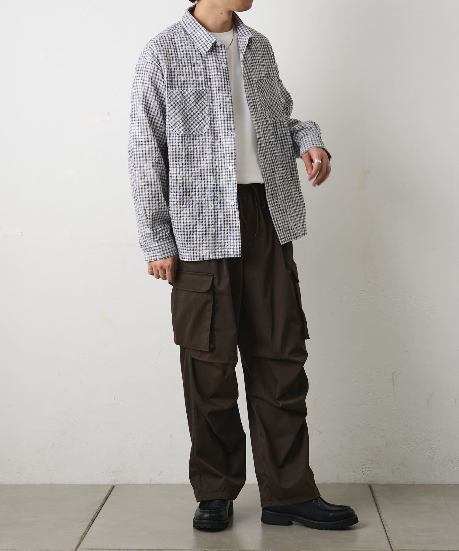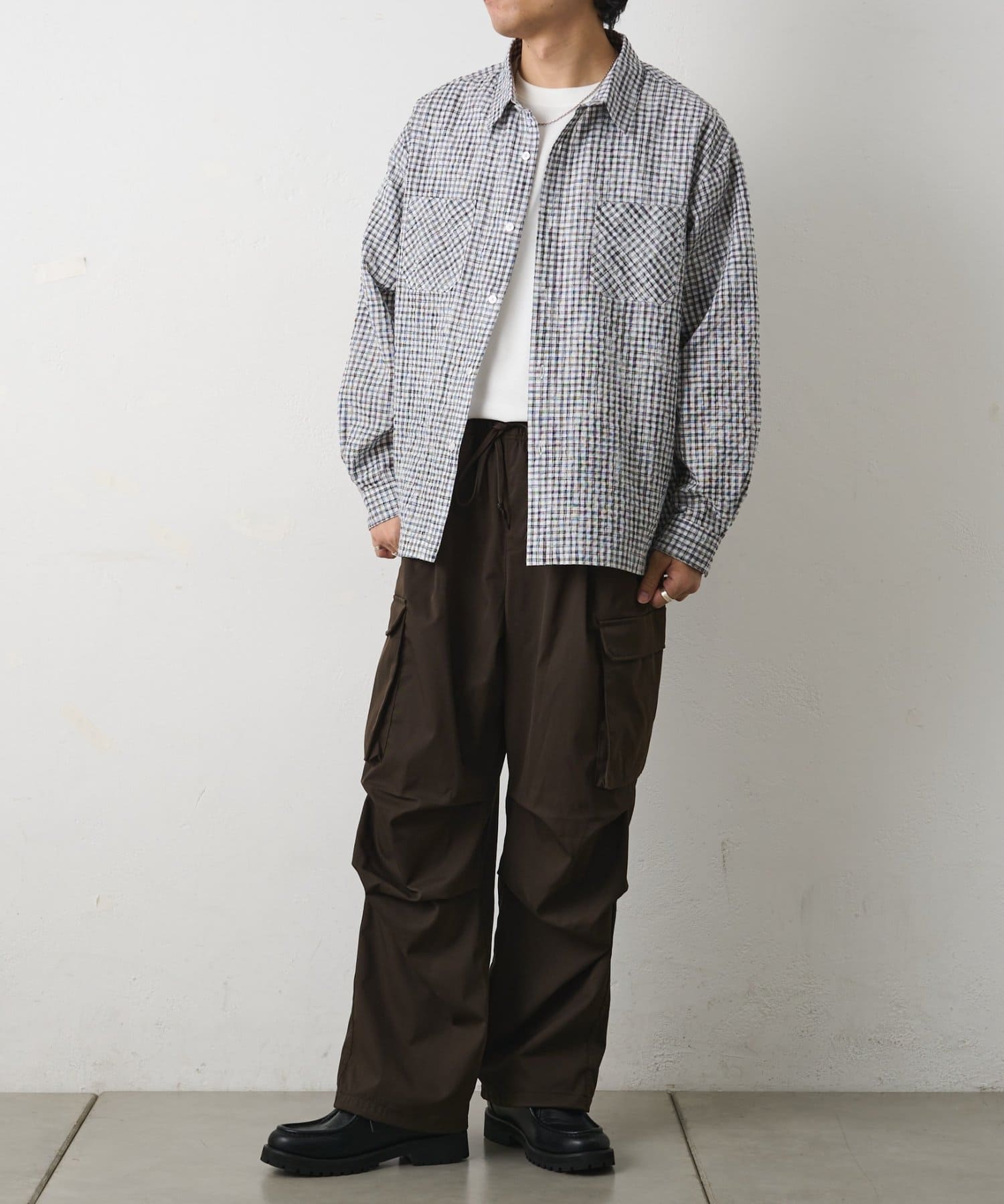 肌への接地面が少なく、汗をかいてもベタつきにくいサッカー素材を採用。収縮率の異なるタテ糸を組み合わせて平織りし、凹凸(シボ)を出したすことで立体感のあるチェック柄シャツになっています。通気性が高く春から夏に着用可能。ややゆとりのあるリラックスシルエットになっているので、今年らしい抜け感のある着こなしが楽しめます。