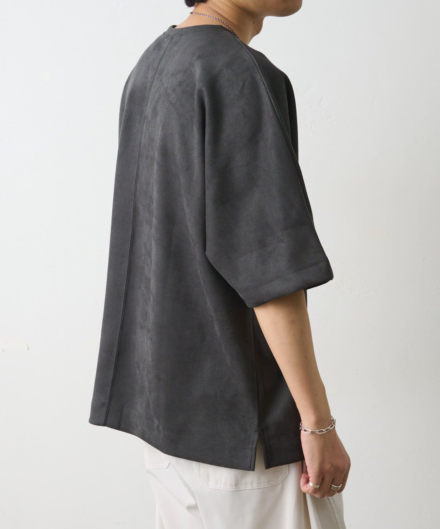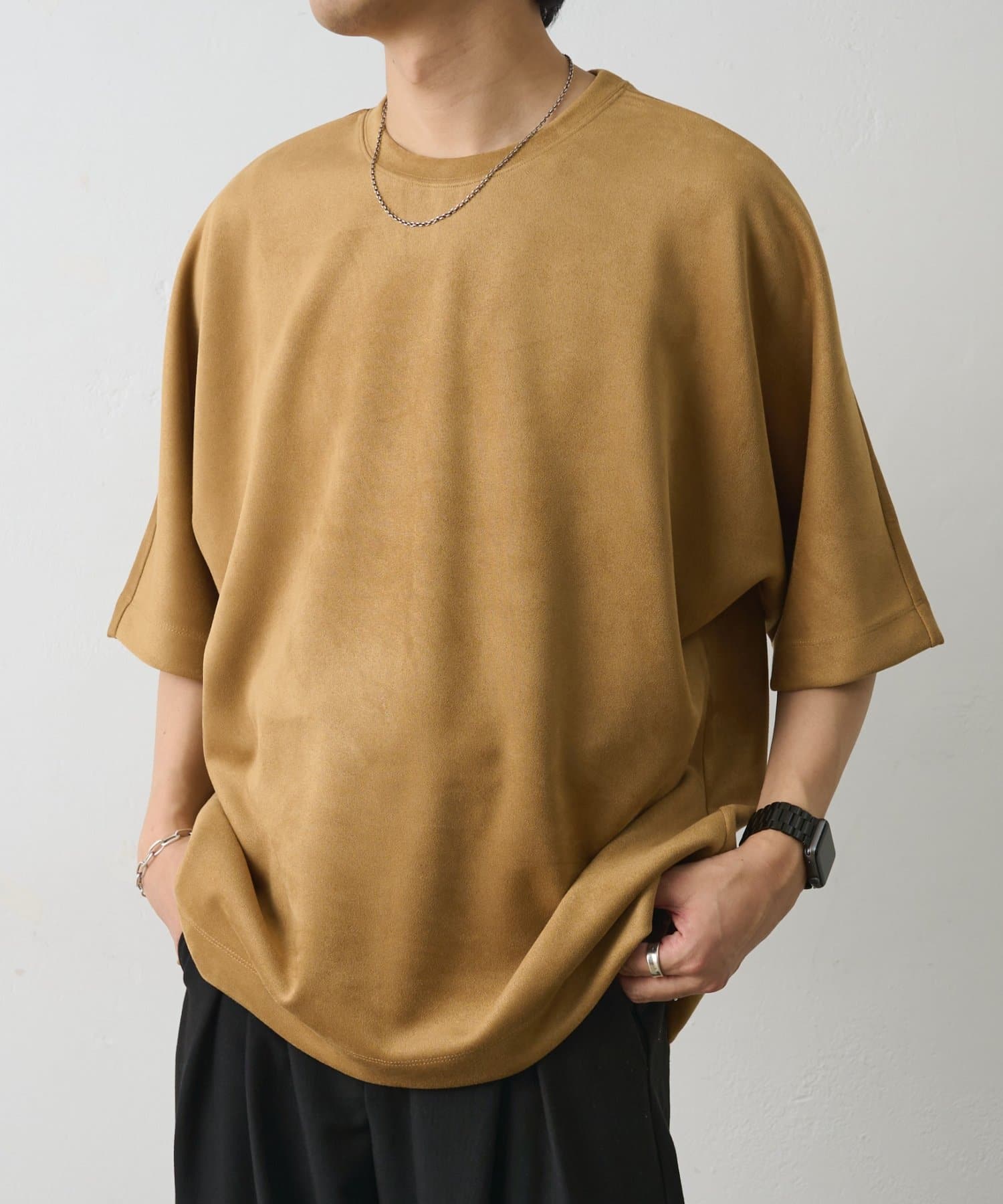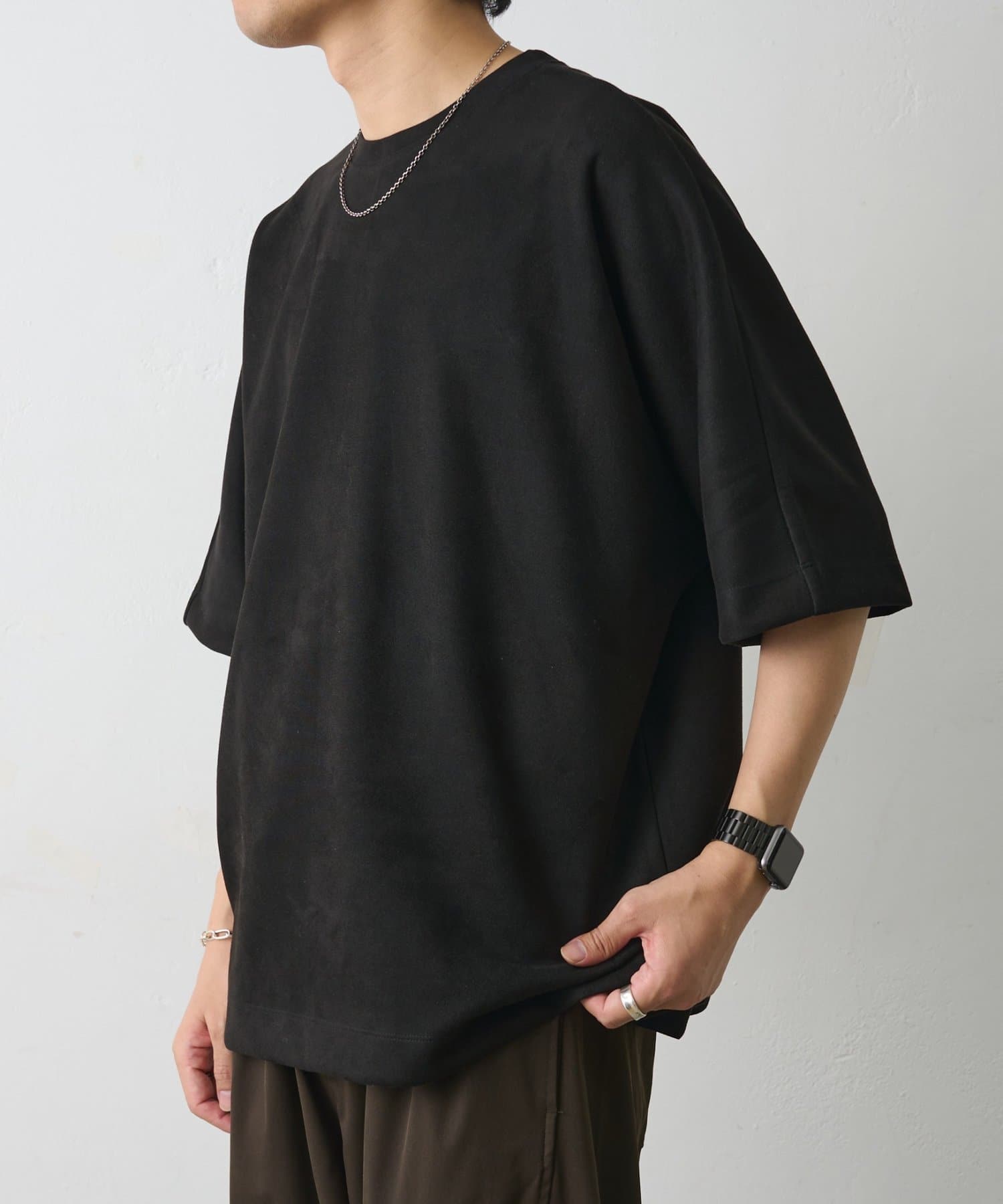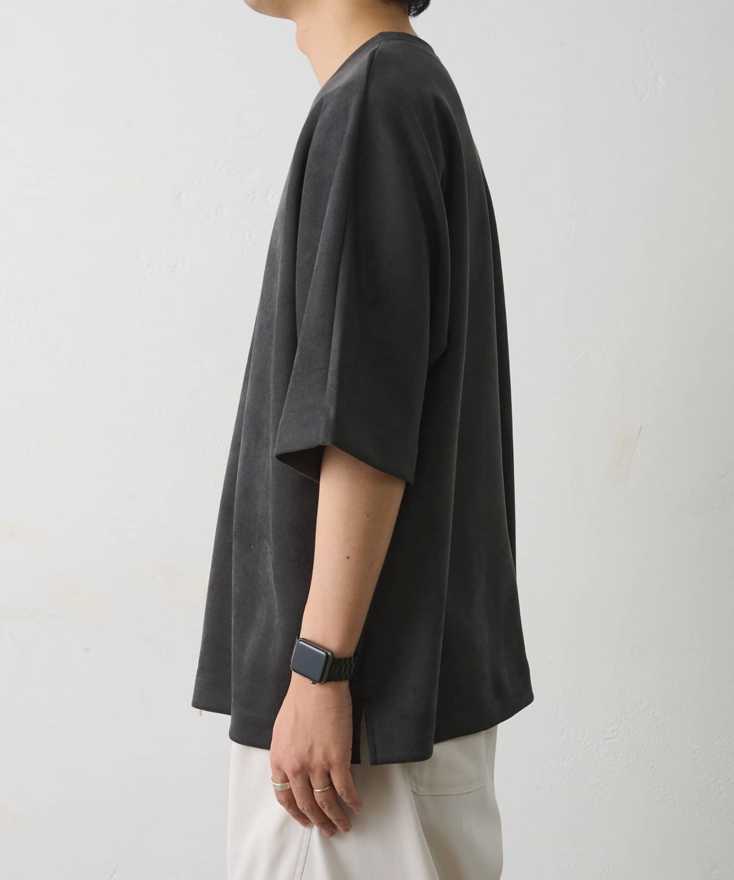 なめらかな起毛感が特徴のシンセティックスエード素材を使用したドルマンビッグTシャツです。