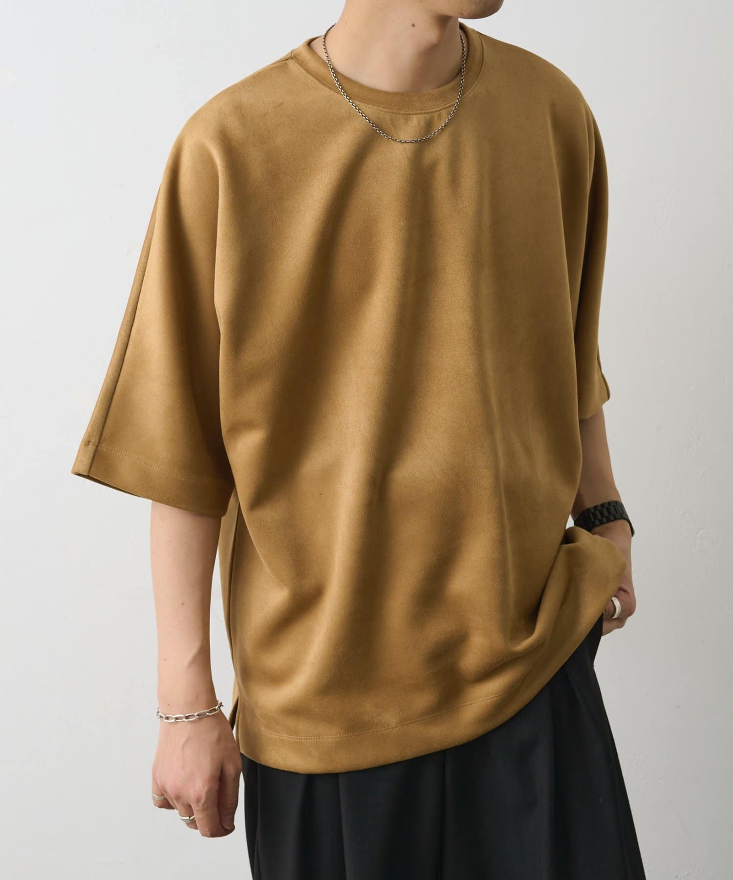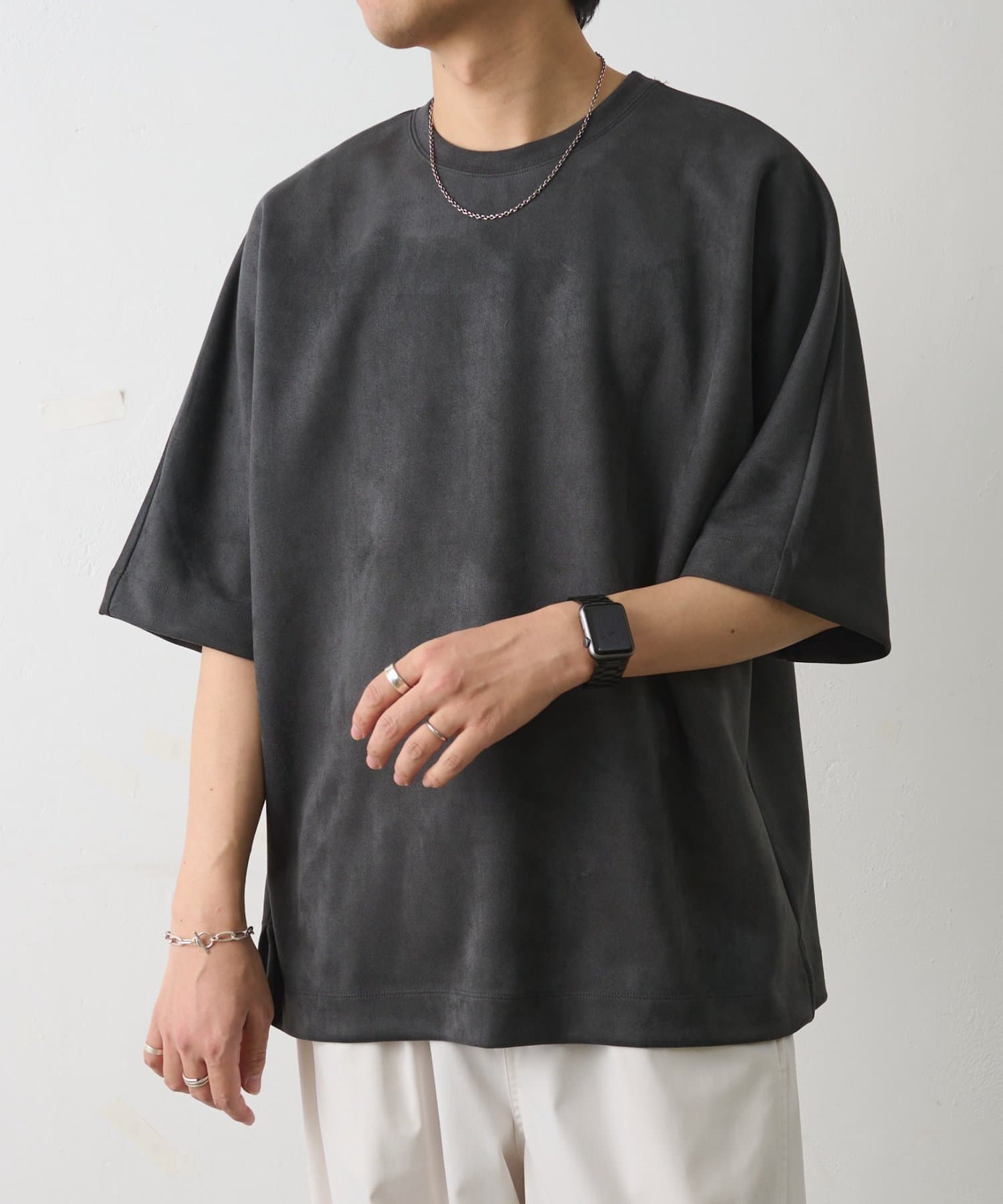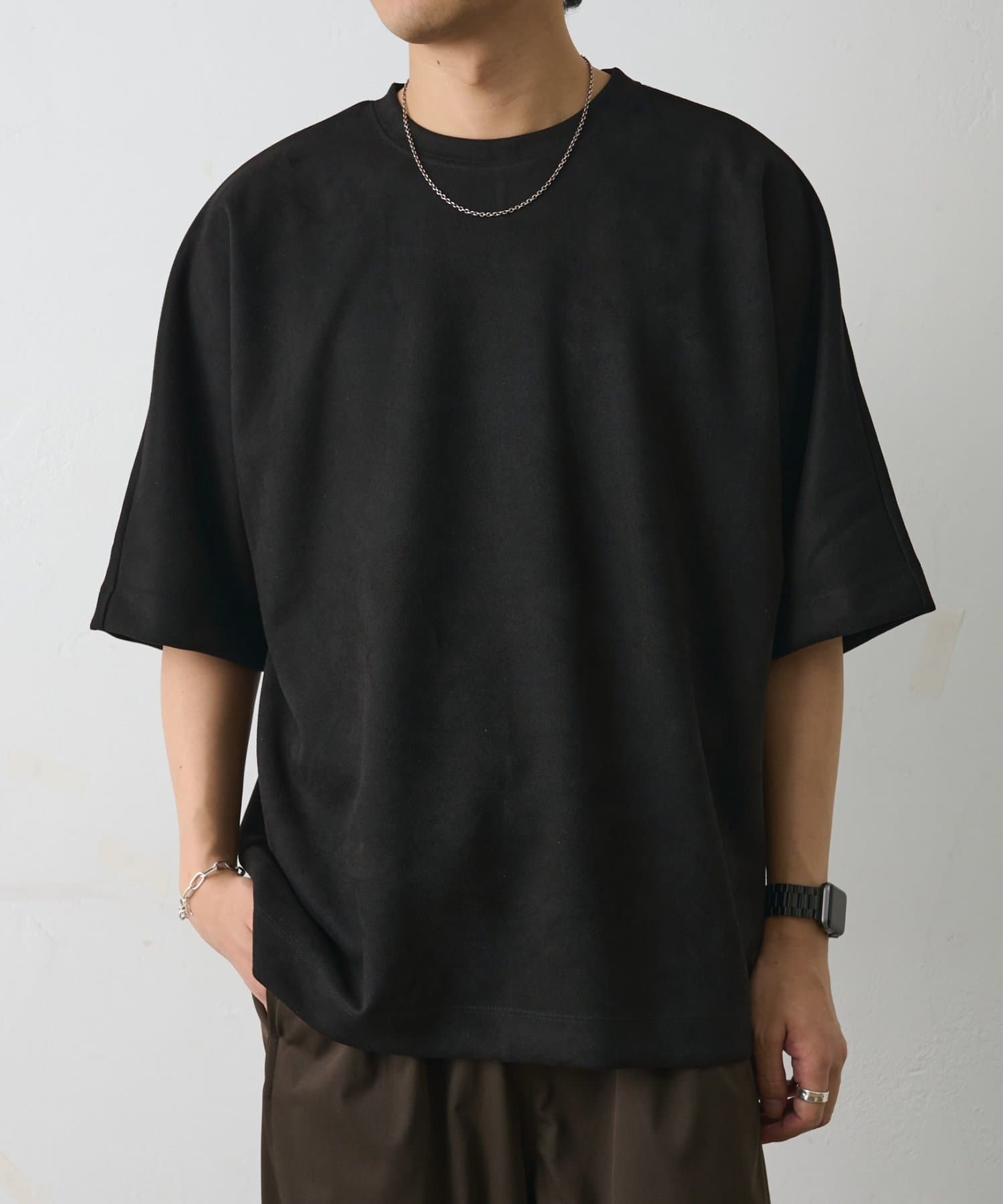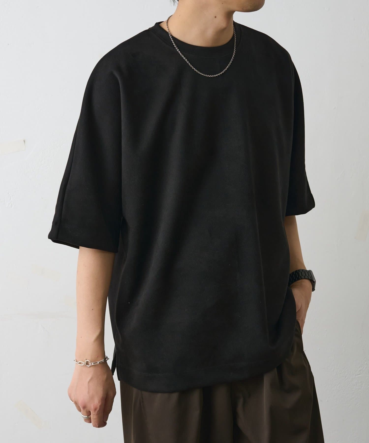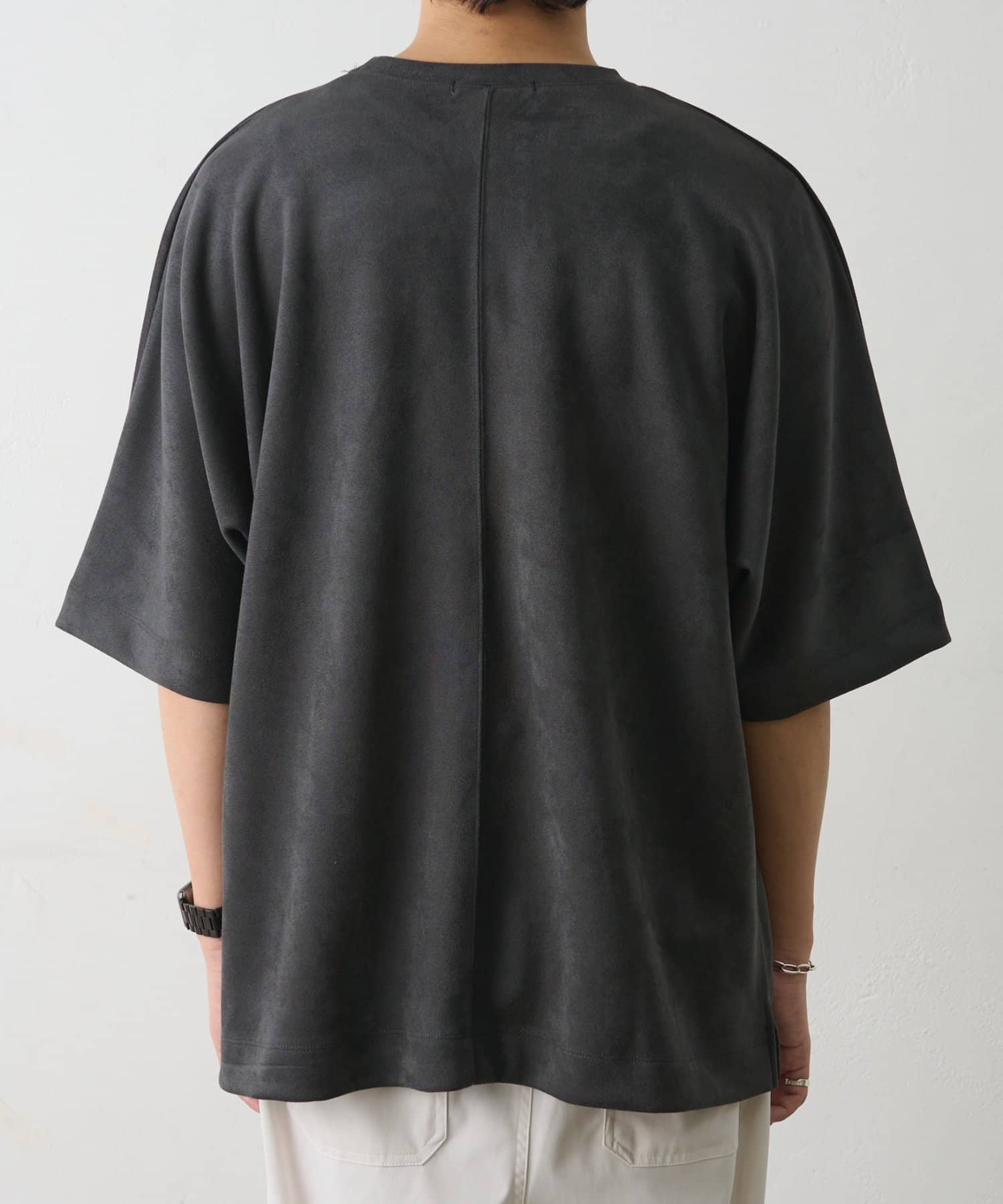 なめらかな起毛感が特徴のシンセティックスエード素材を使用したドルマンビッグTシャツです。
