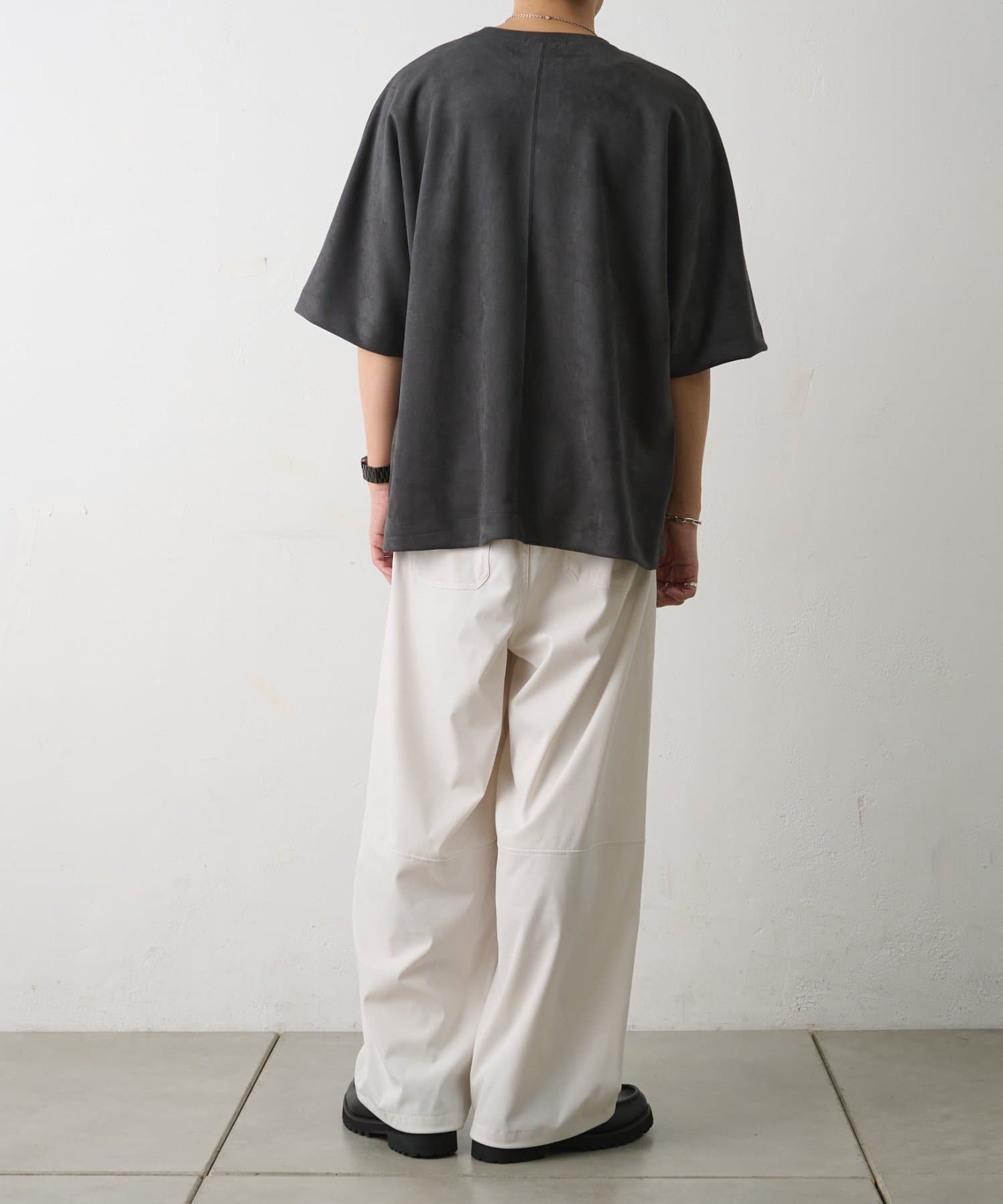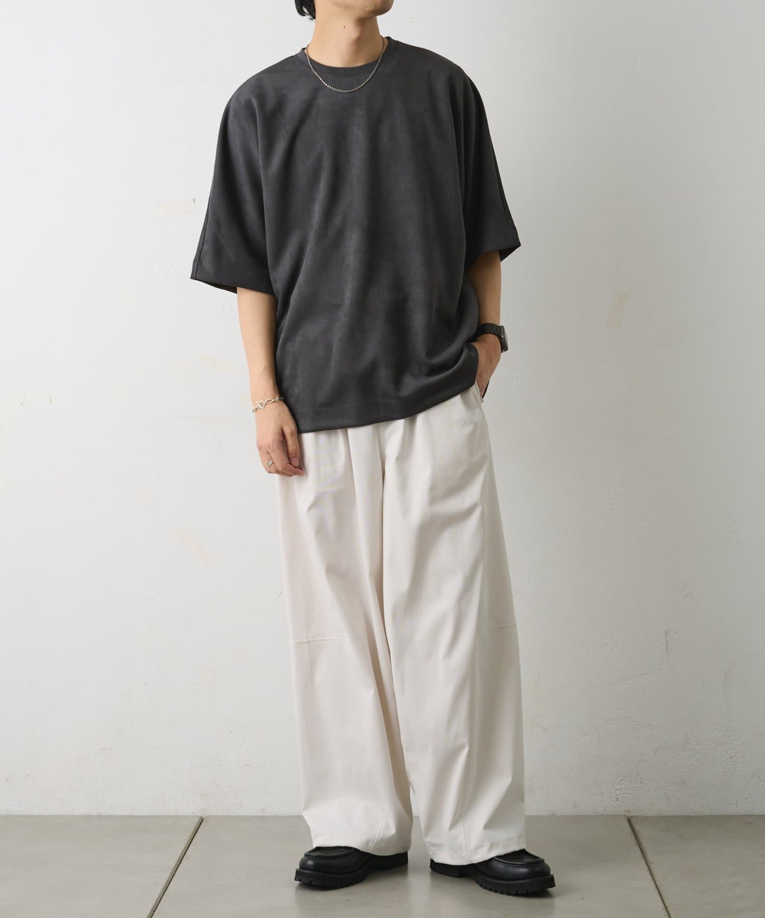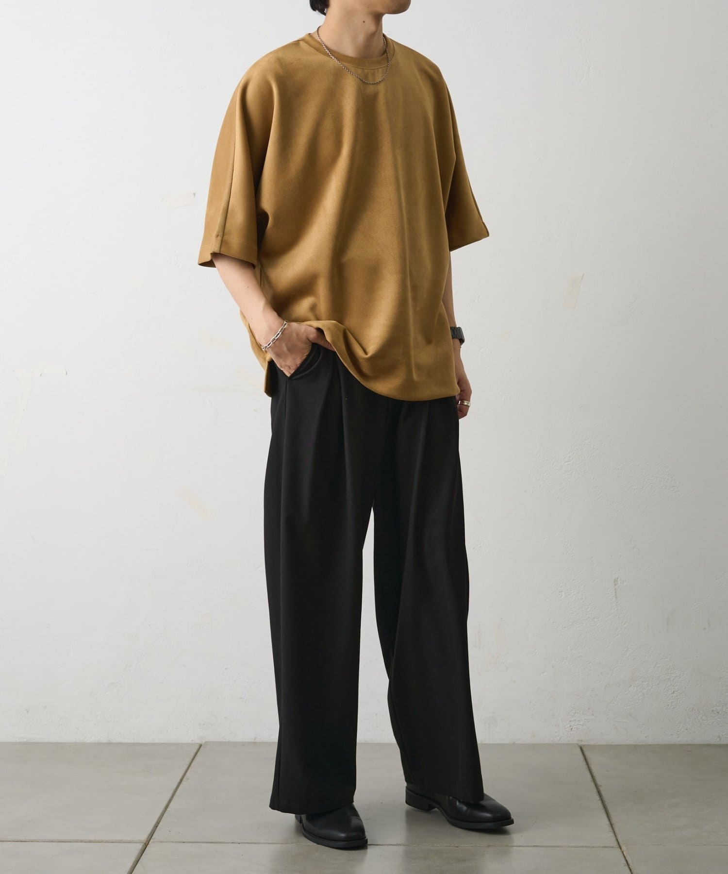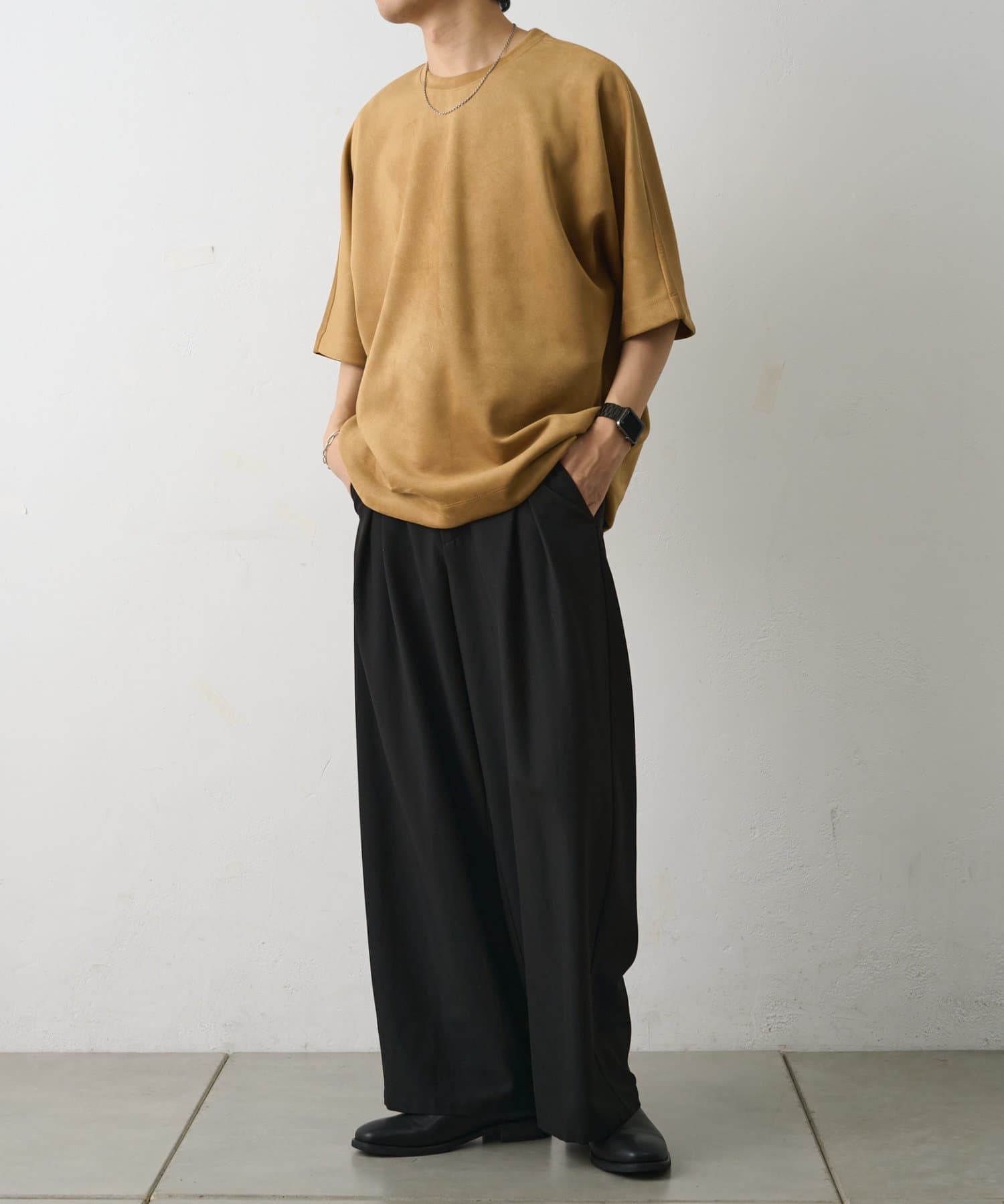 なめらかな起毛感が特徴のシンセティックスエード素材を使用したドルマンビッグTシャツです。