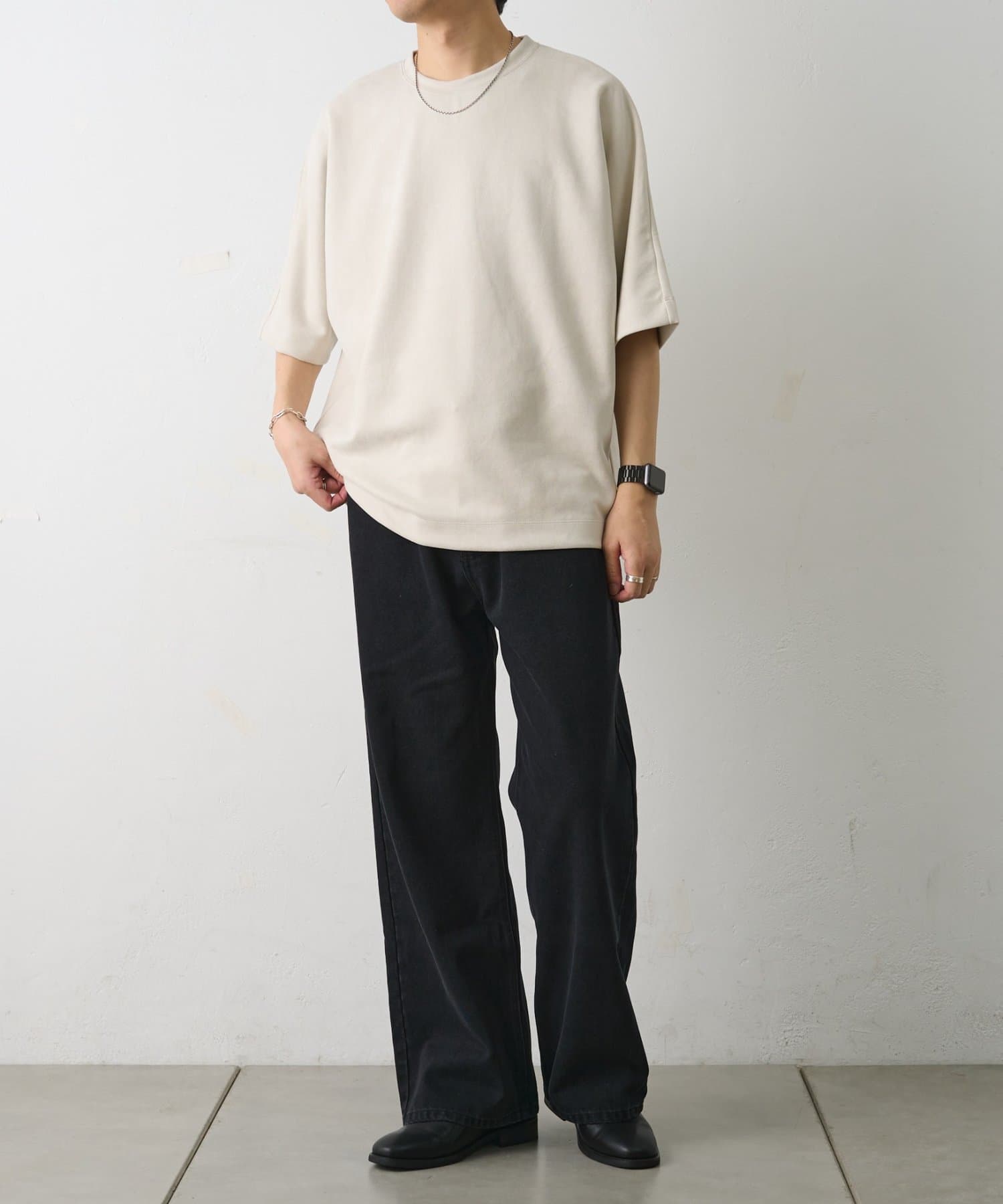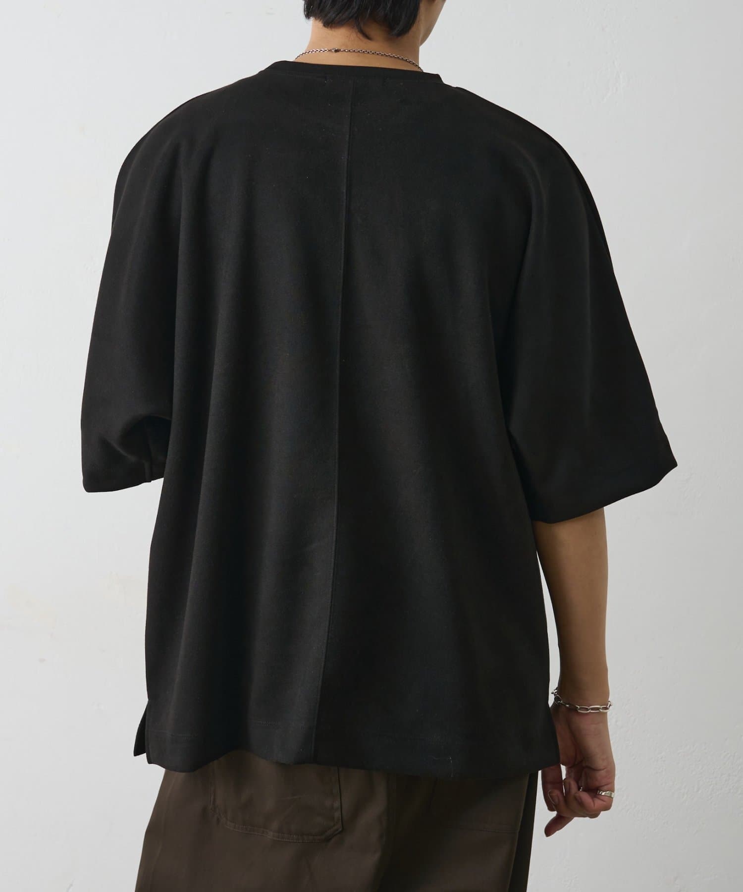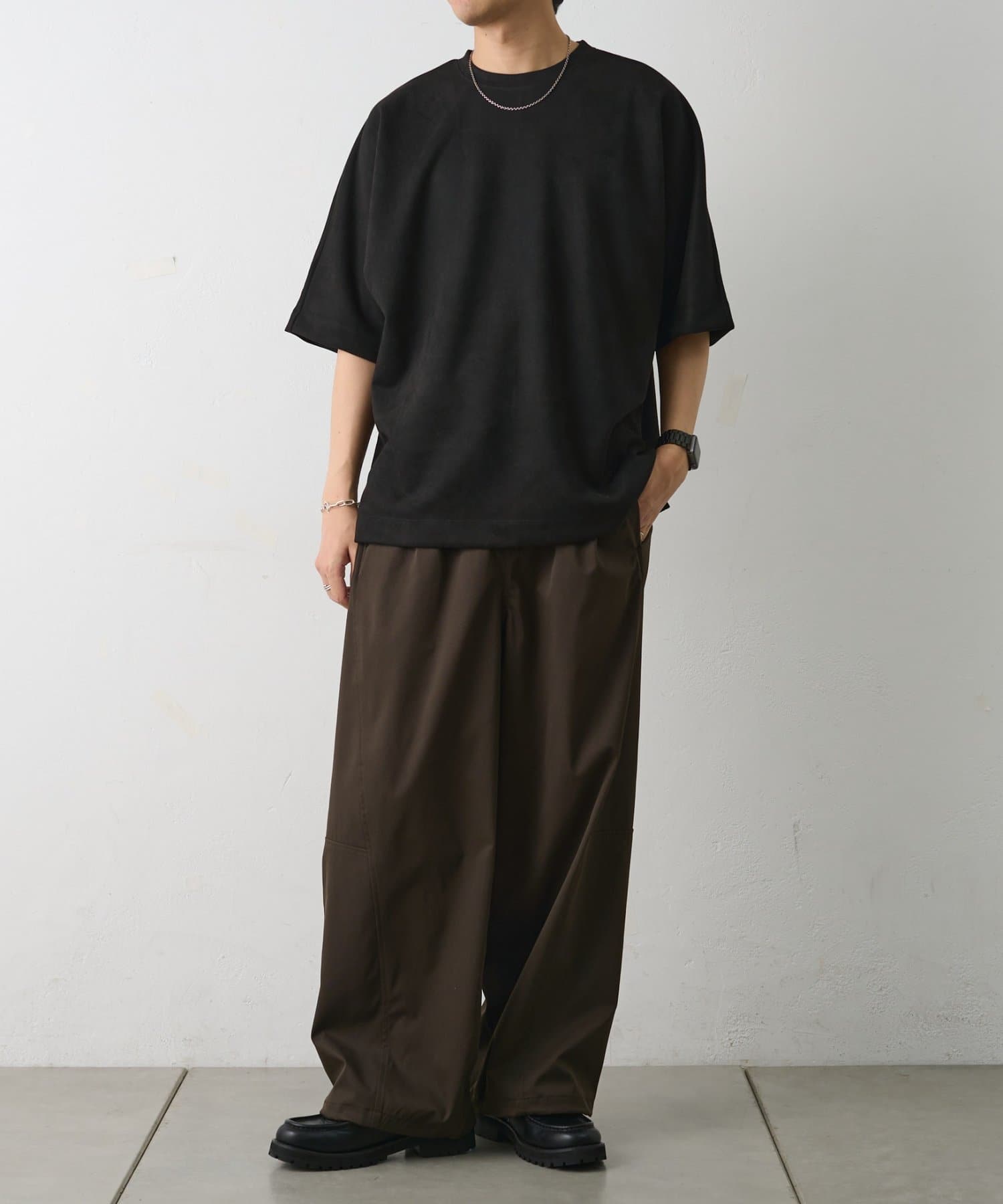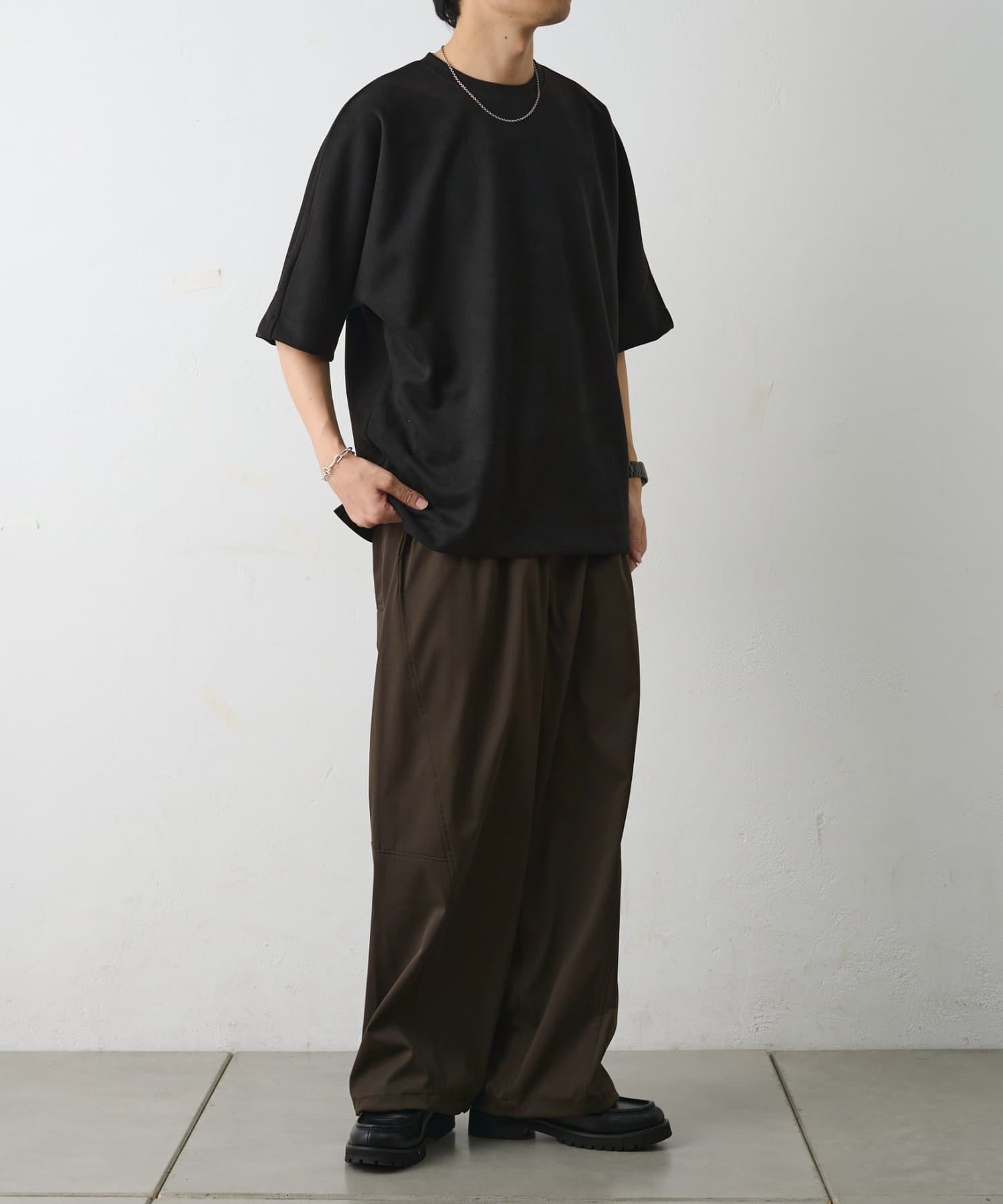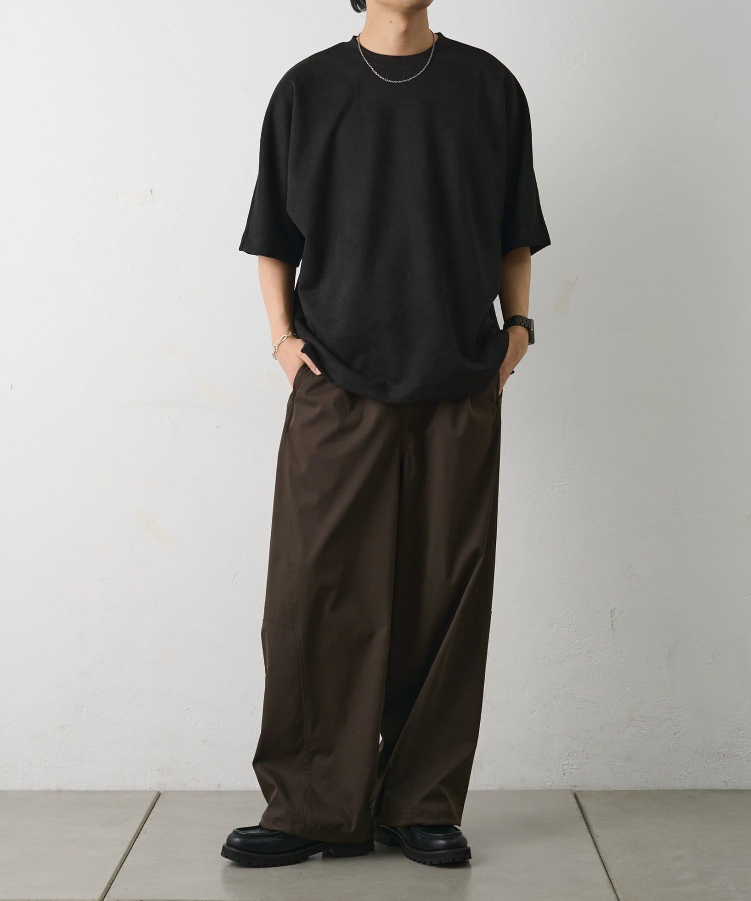 なめらかな起毛感が特徴のシンセティックスエード素材を使用したドルマンビッグTシャツです。