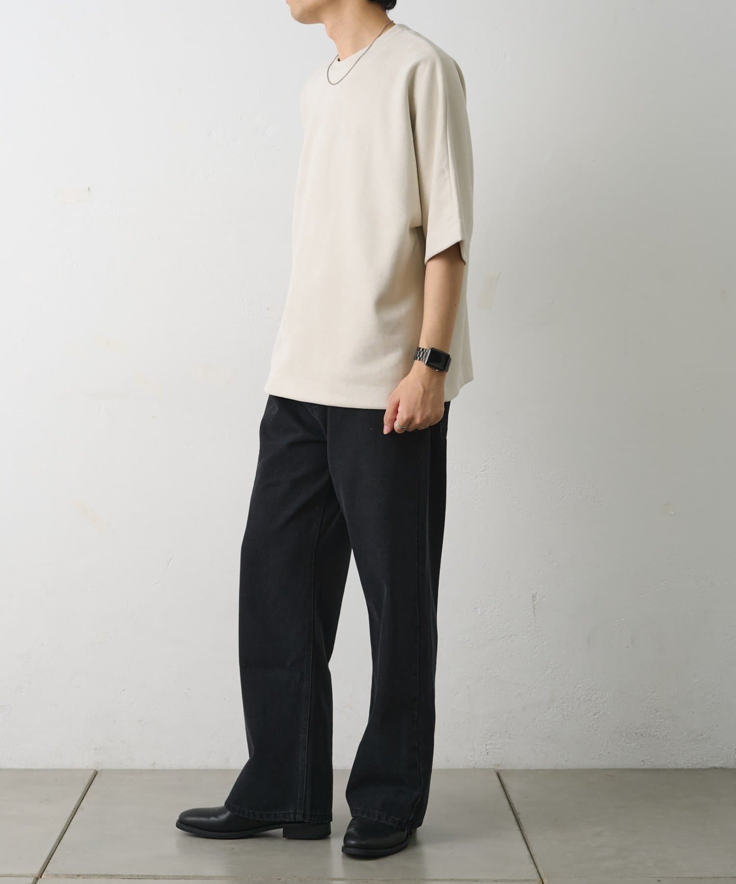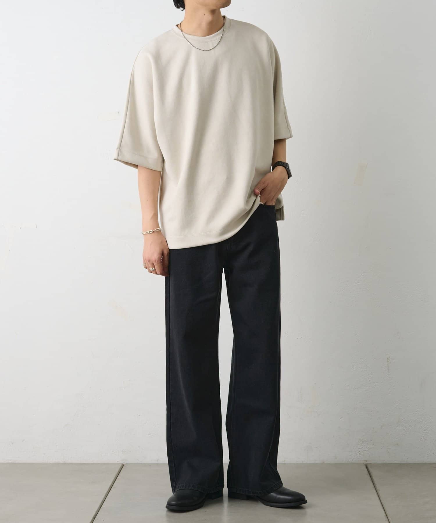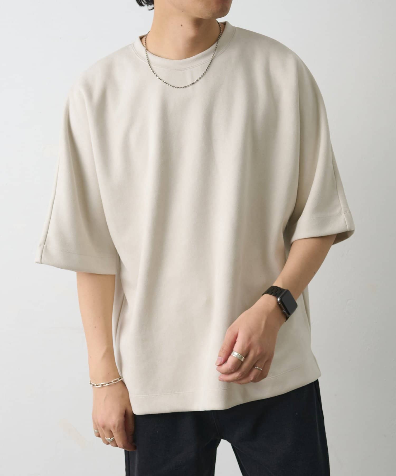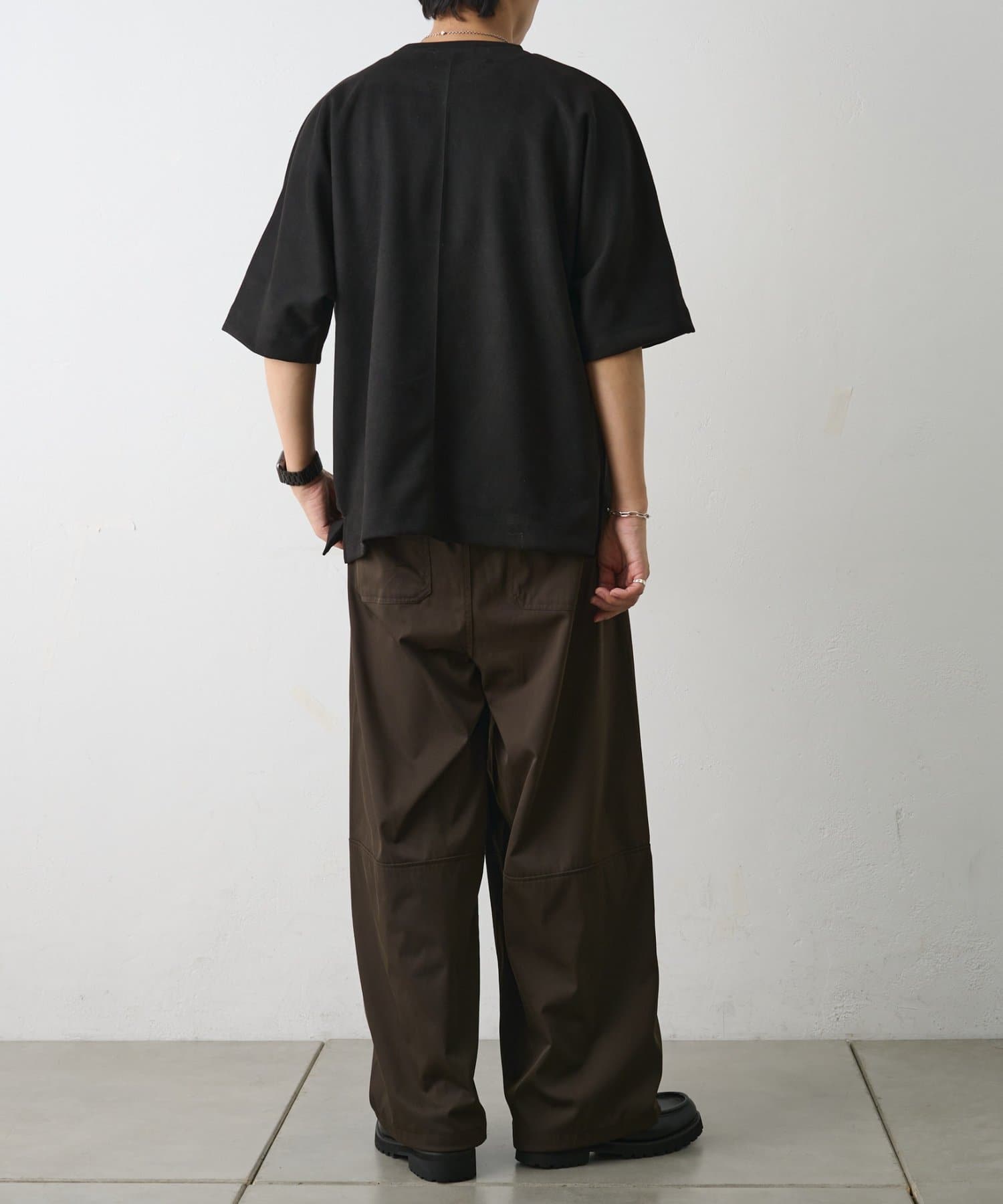 なめらかな起毛感が特徴のシンセティックスエード素材を使用したドルマンビッグTシャツです。
