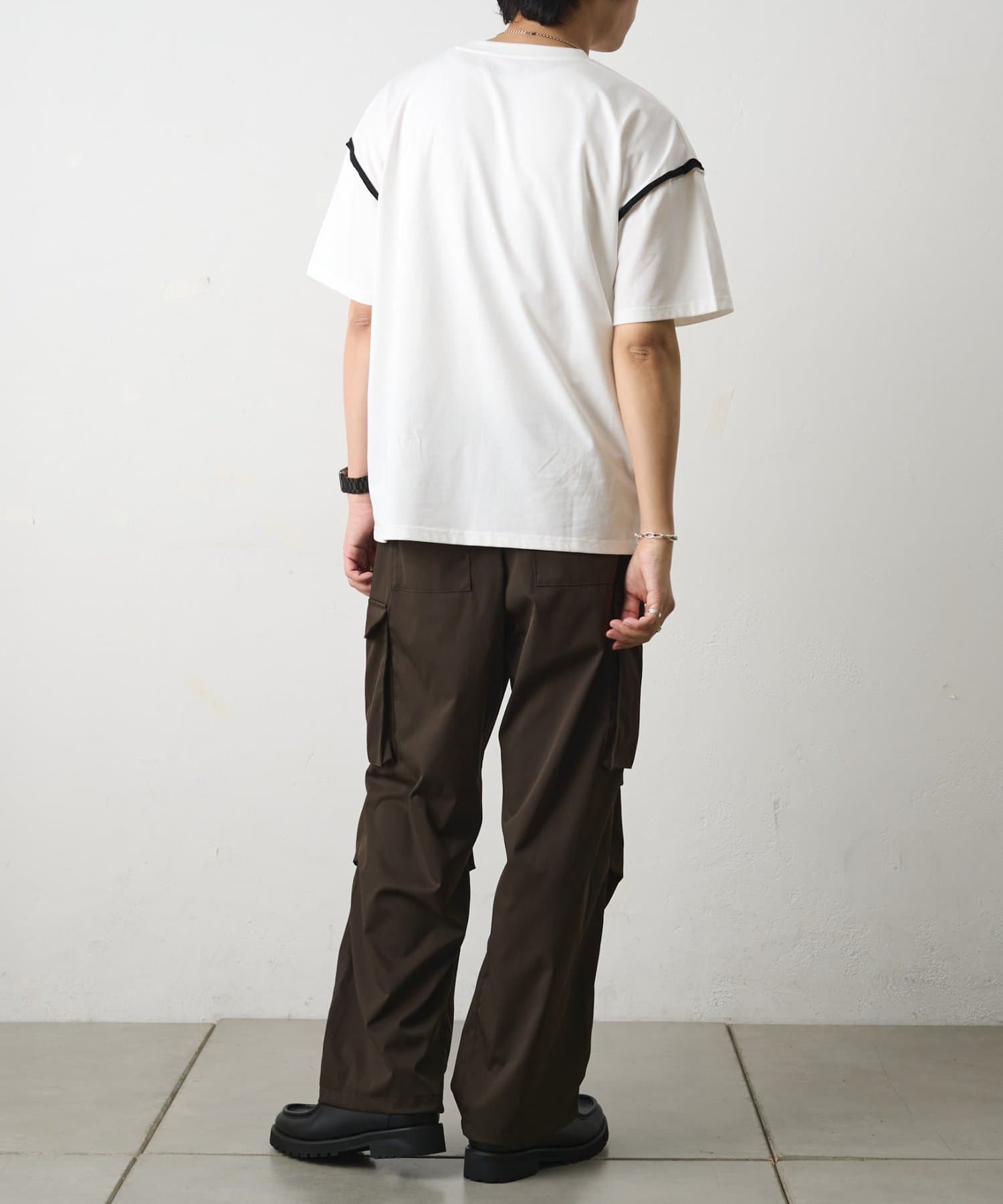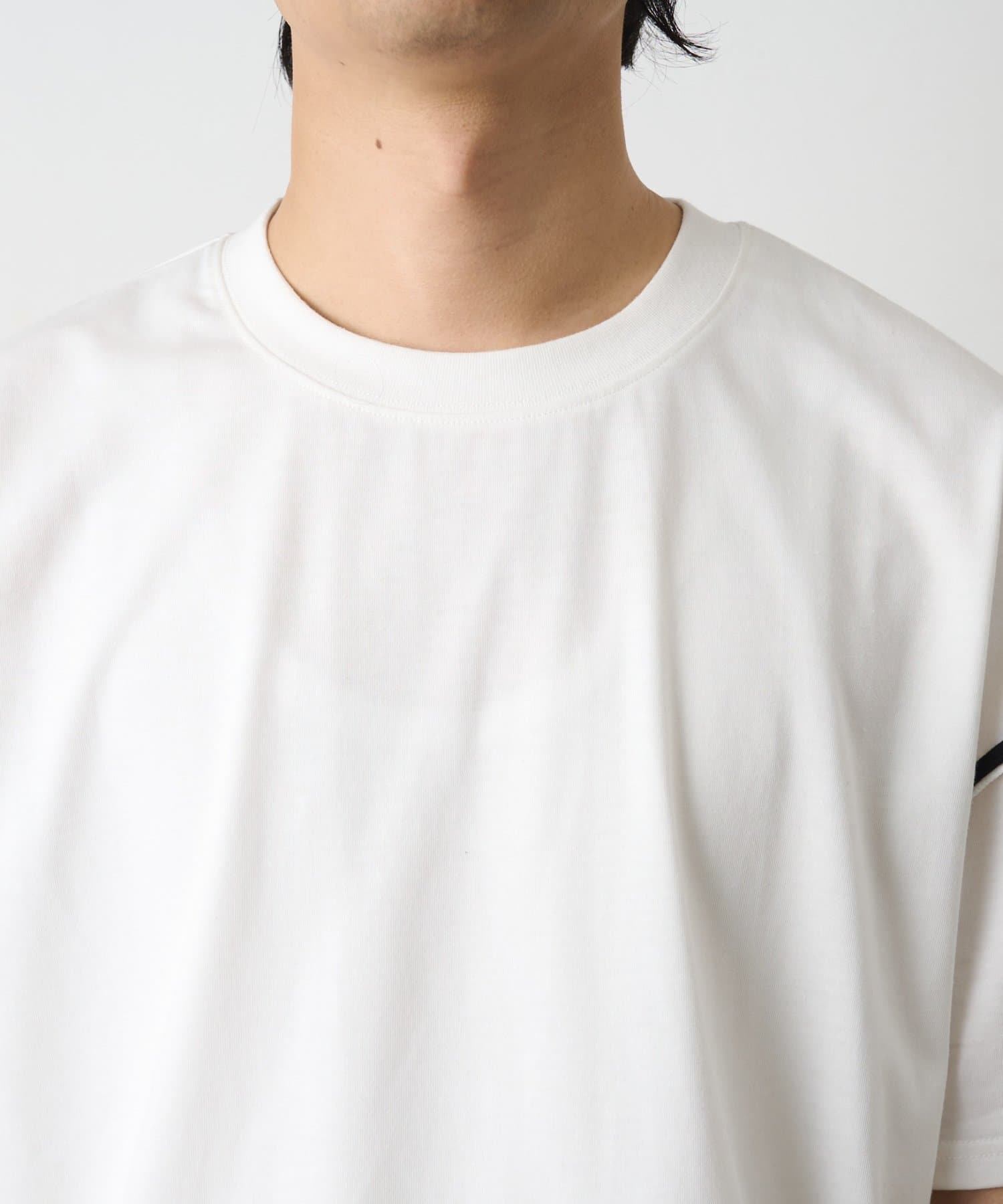 定番アイテムの無地Tは1枚でもキマる絶妙なルーズシルエットを採用。肩口のカットオフでデザイン性UP。