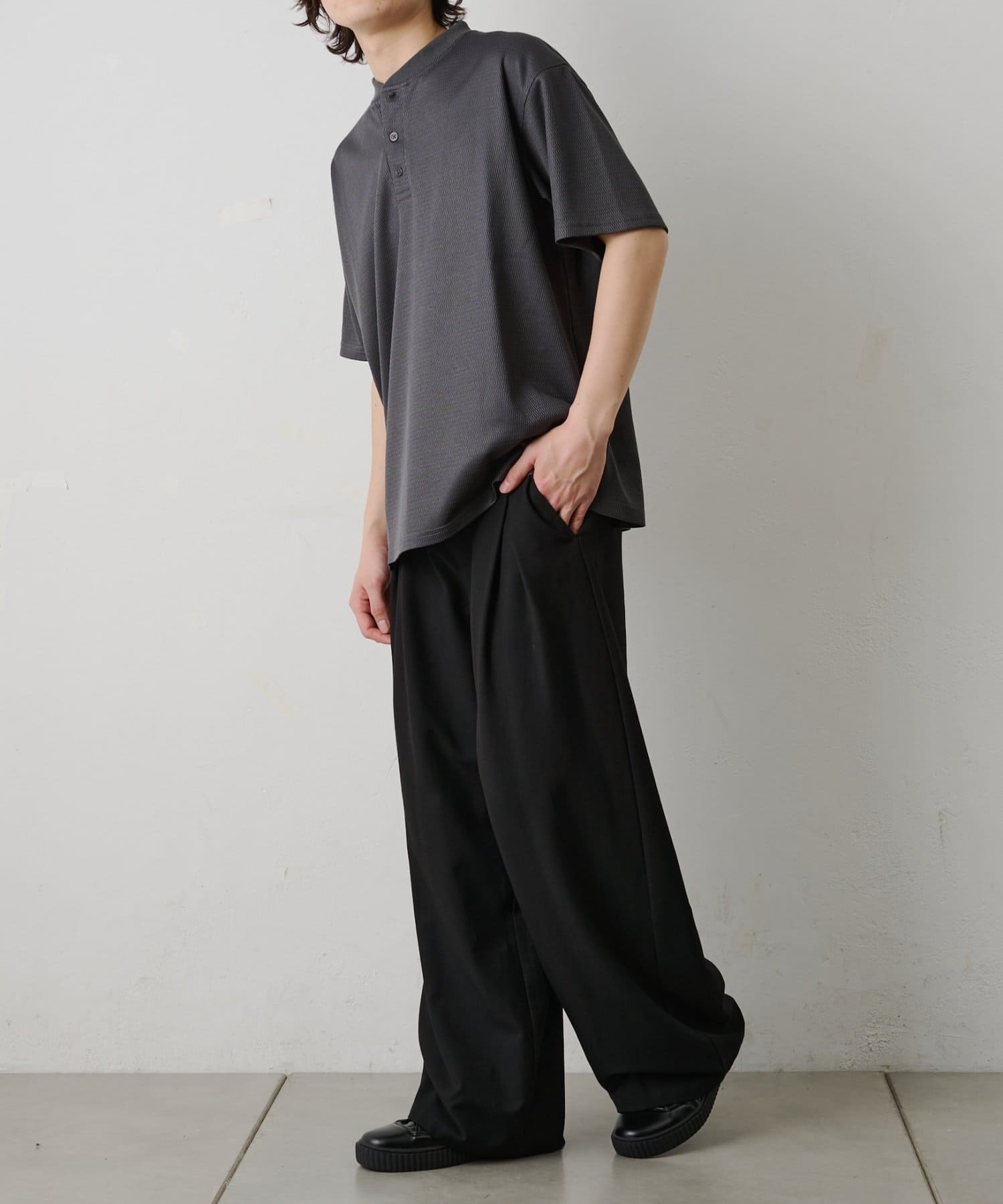 首元に程よい抜け感をつくるヘンリーネックデザインがカジュアルになりすぎず、落ち着いた印象を演出します。
