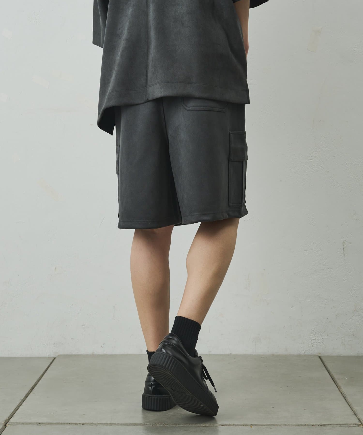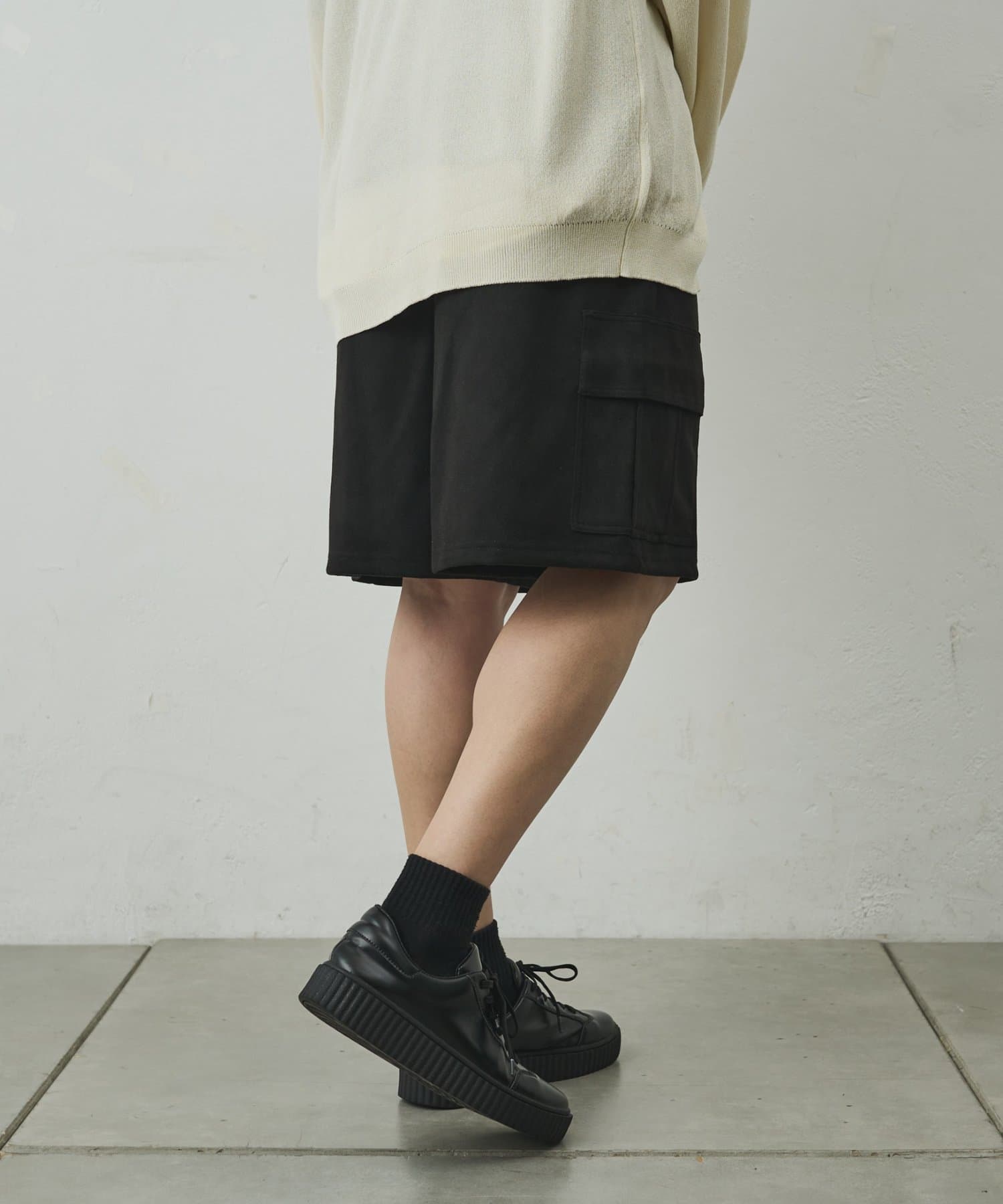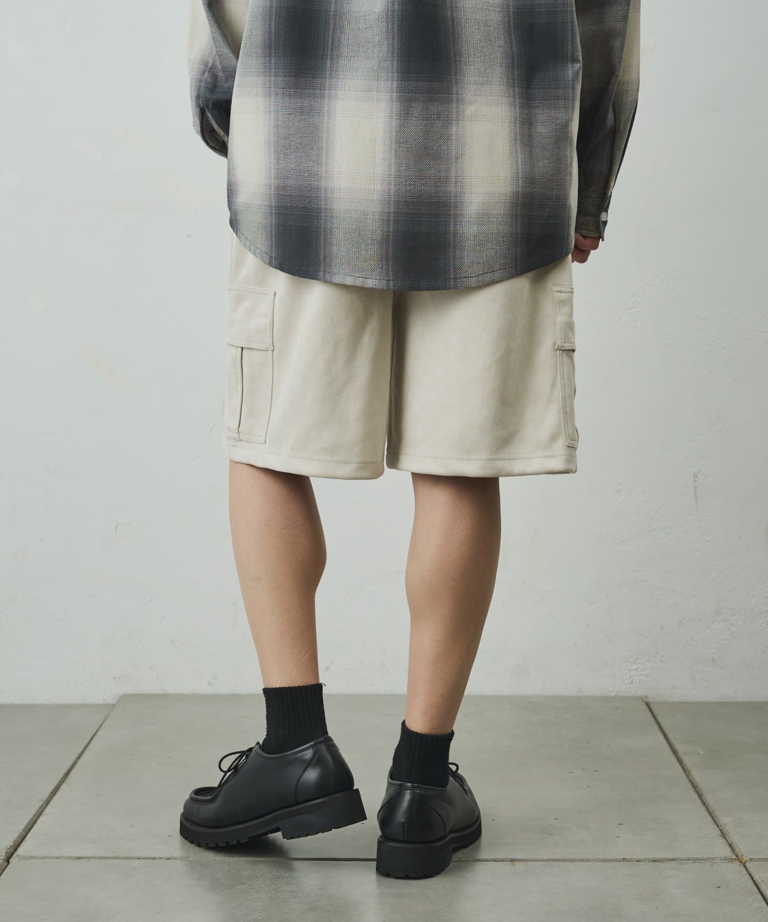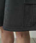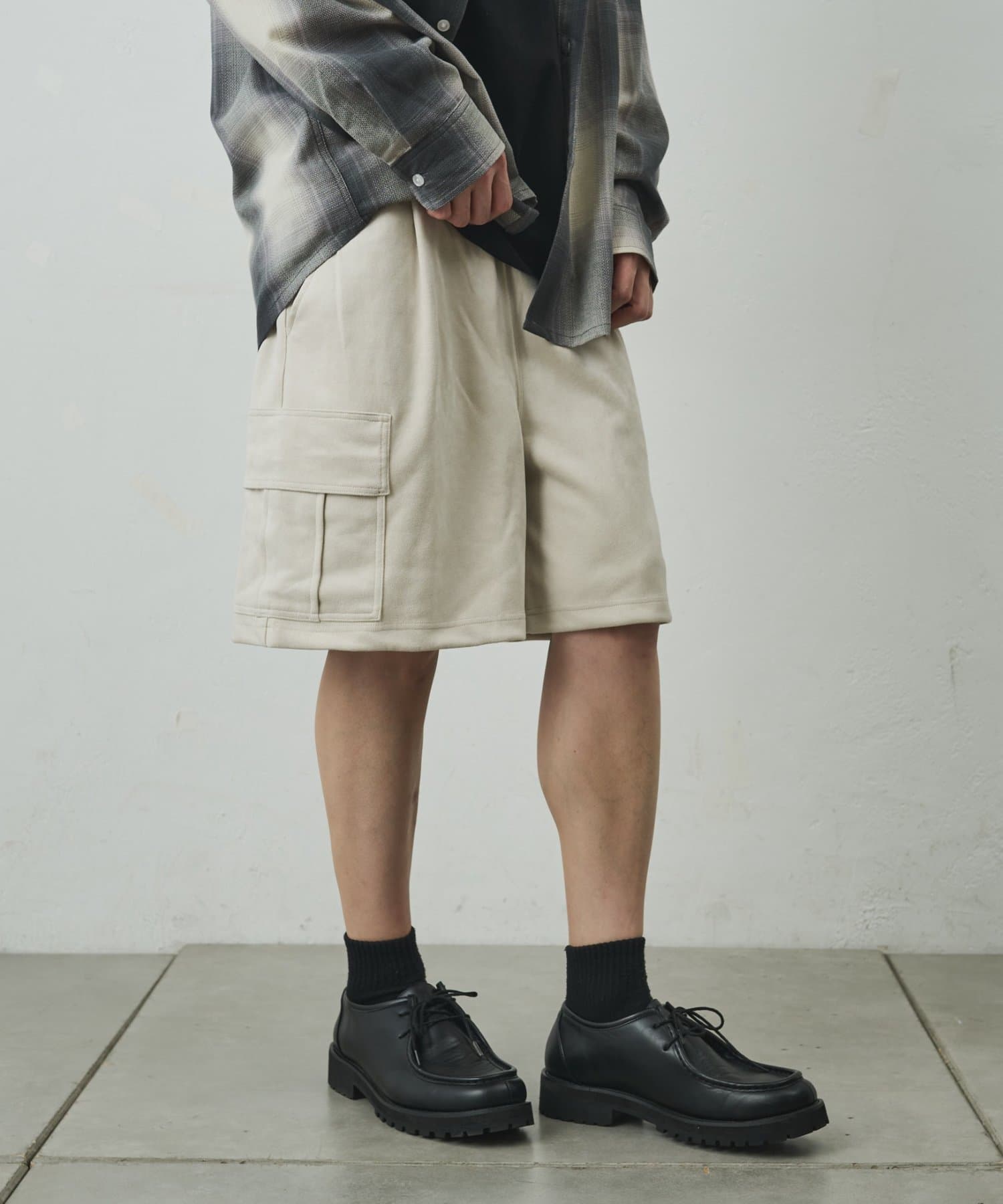 なめらかな起毛感が特徴のシンセティックスエード素材を使用した上品に穿けるカーゴショーツ。