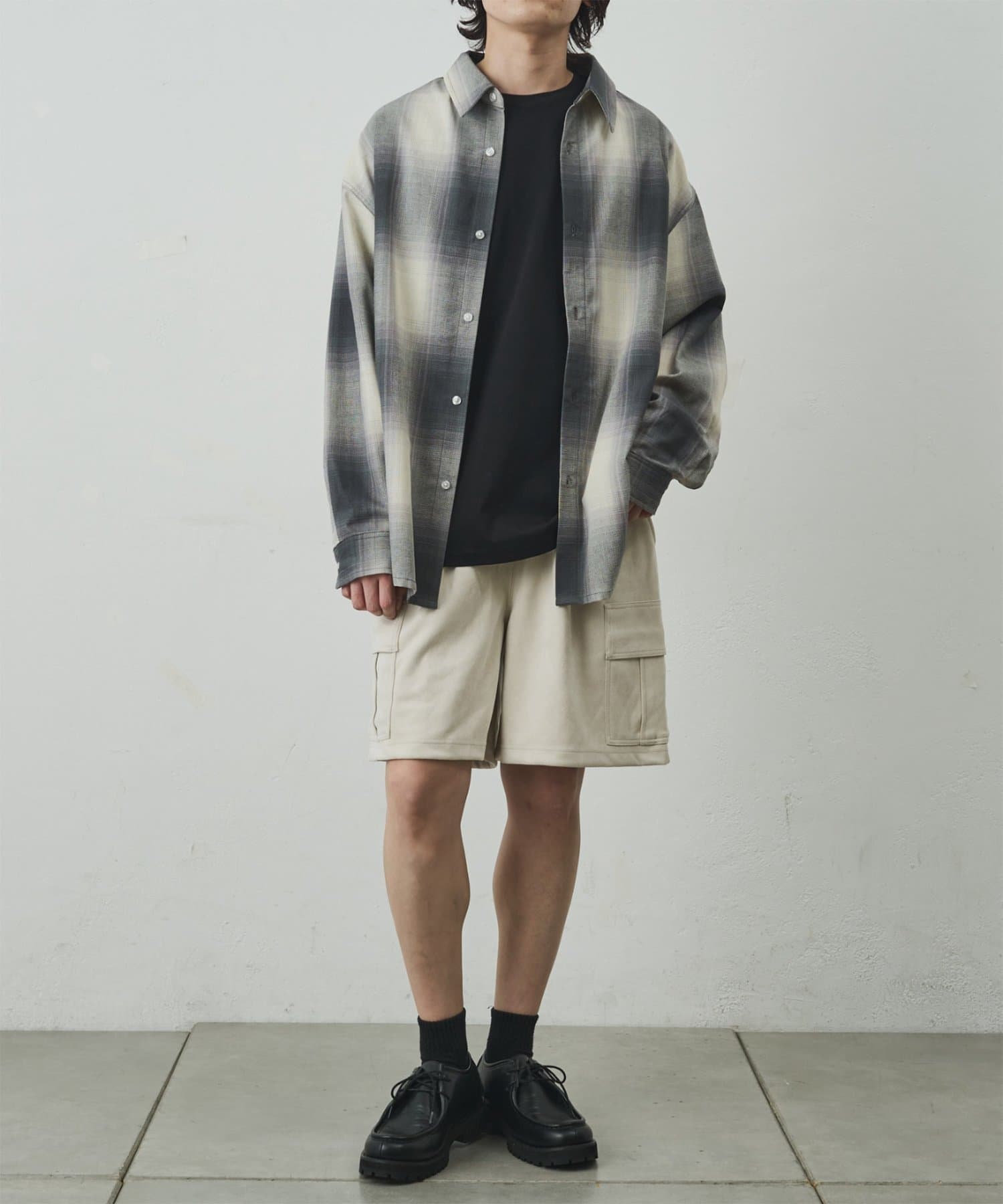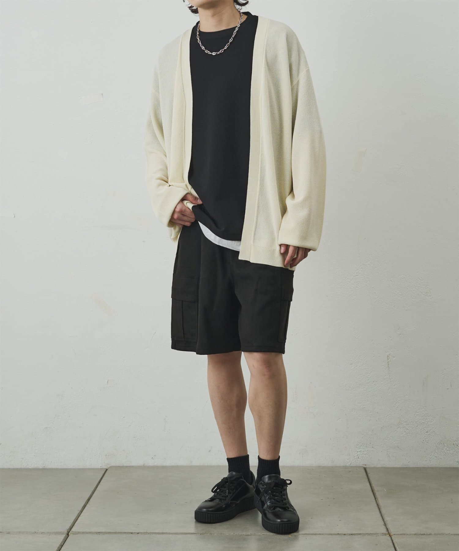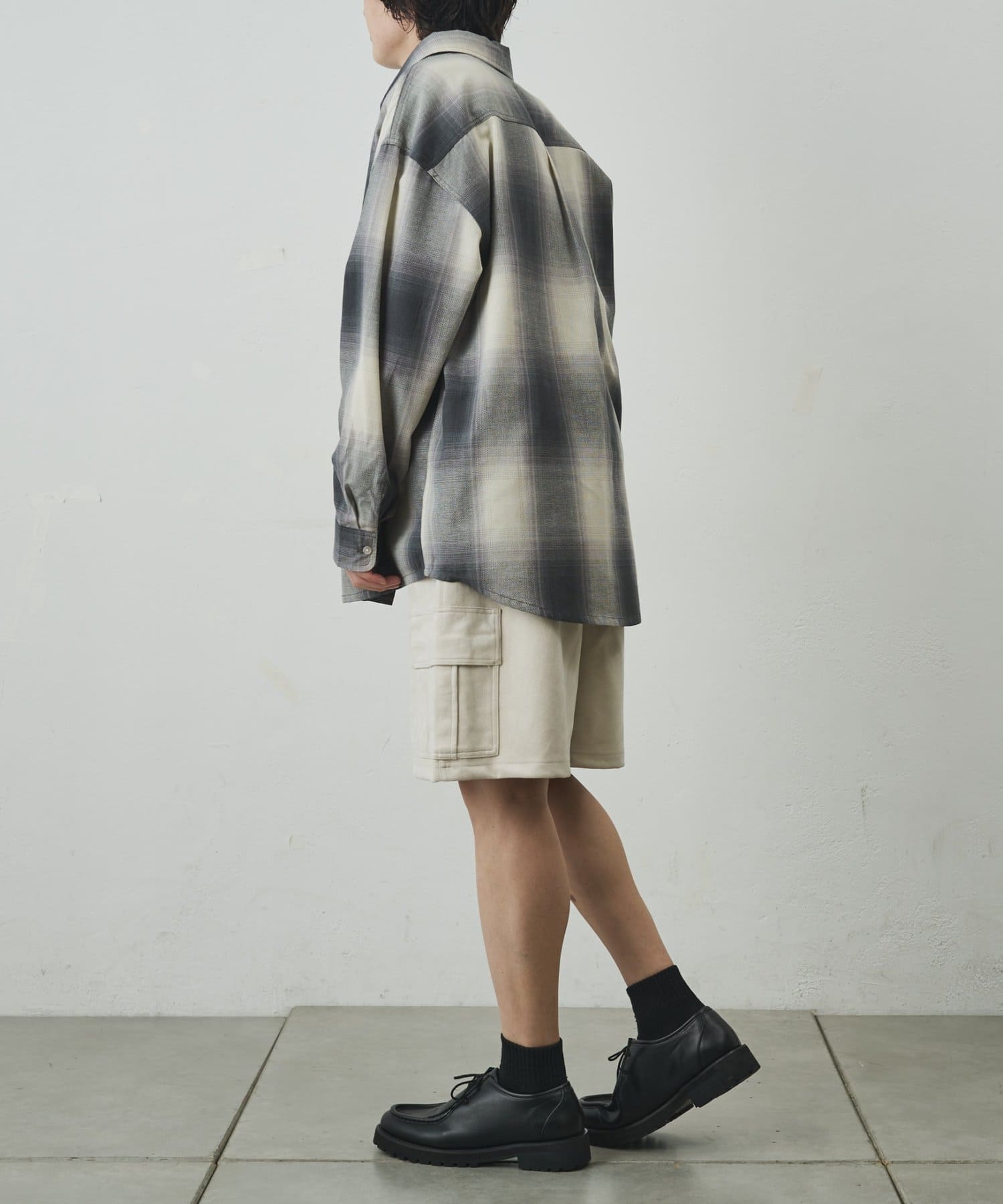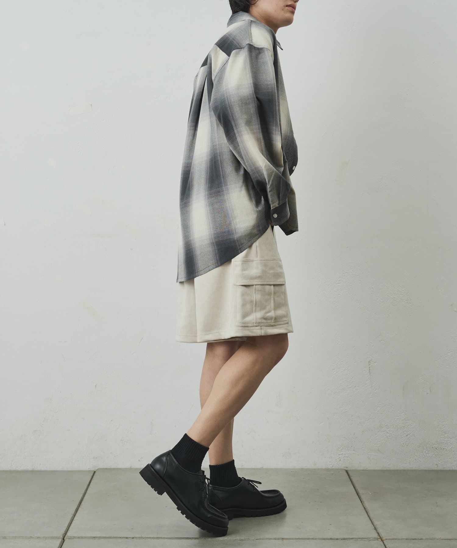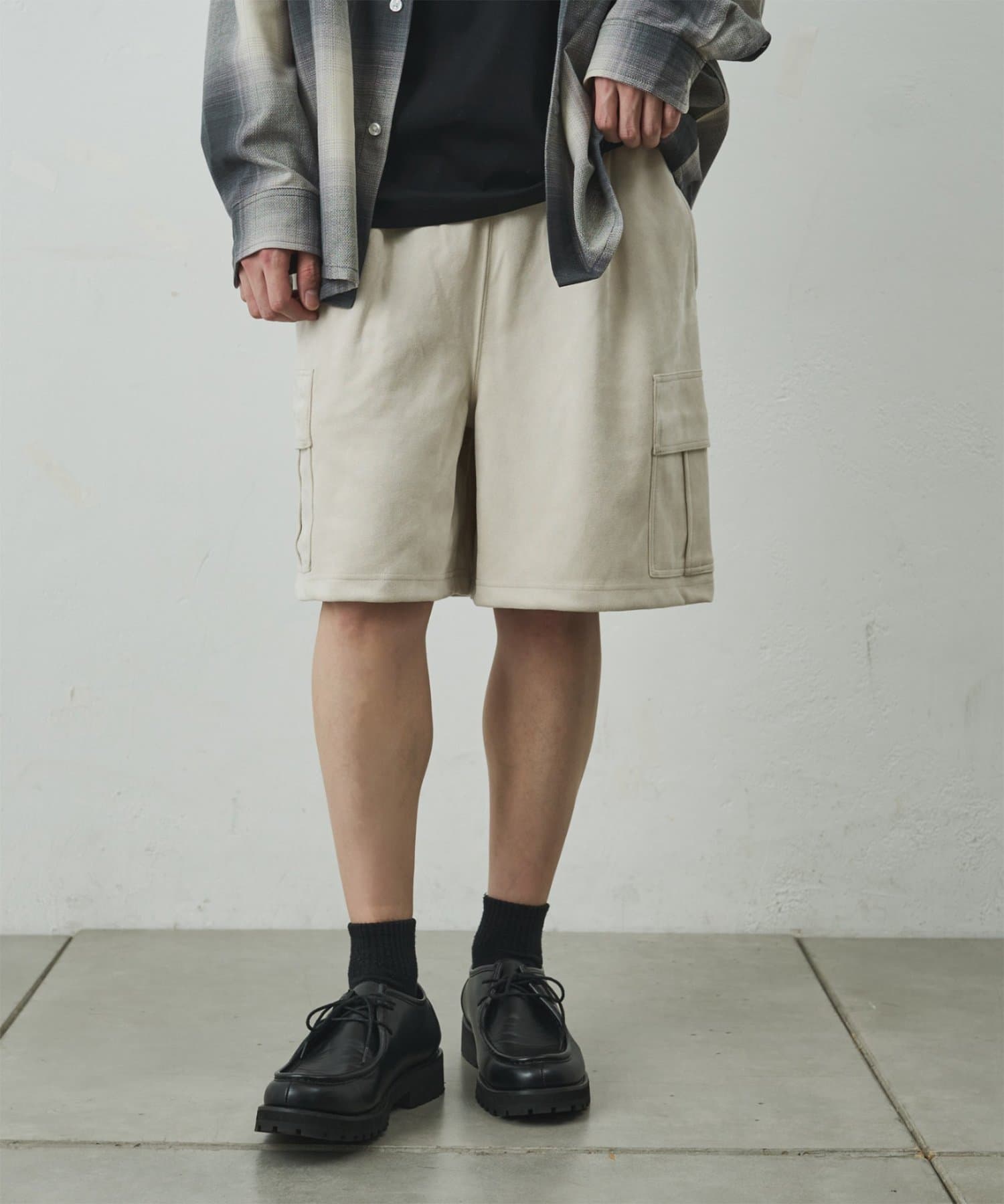 なめらかな起毛感が特徴のシンセティックスエード素材を使用した上品に穿けるカーゴショーツ。