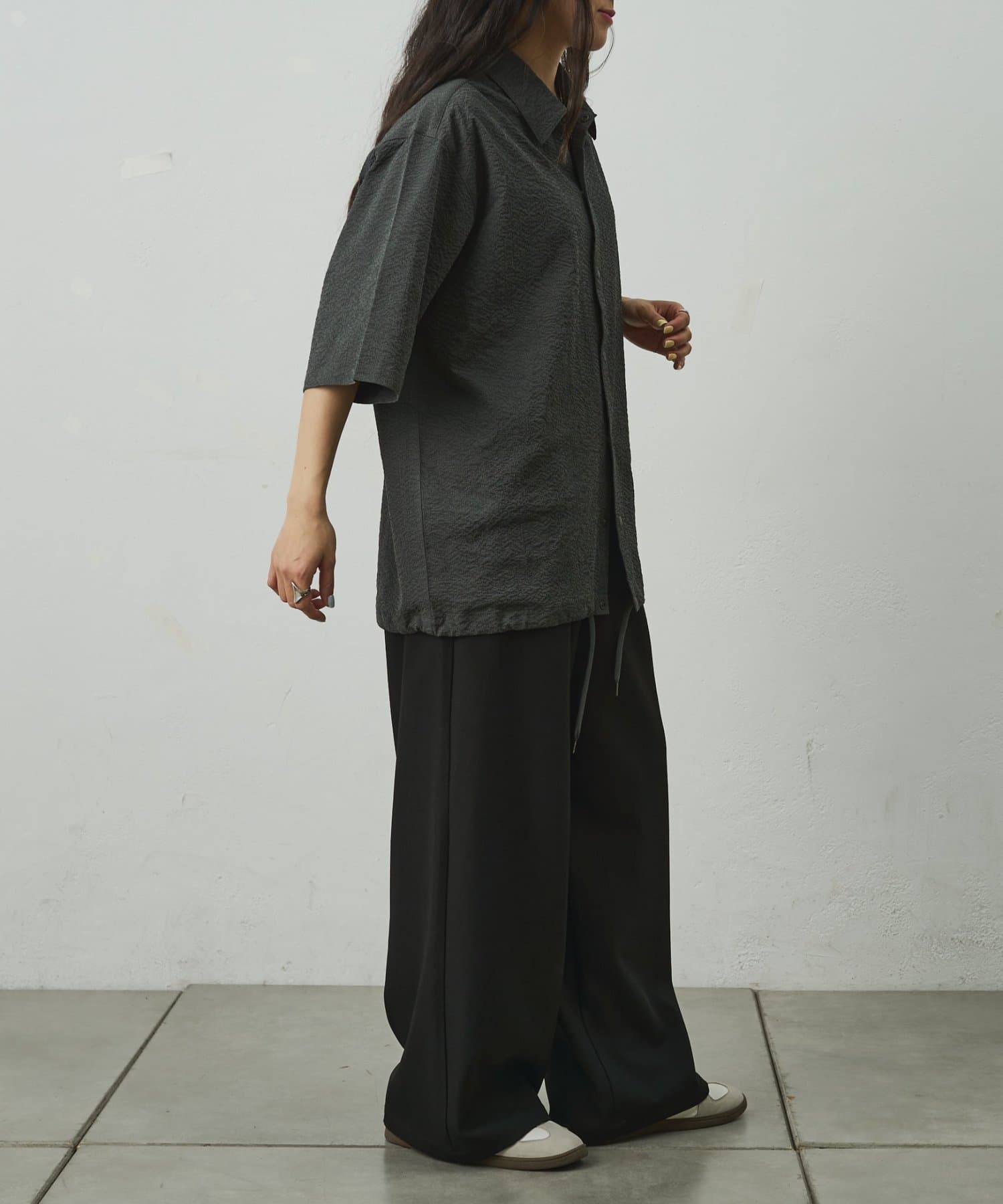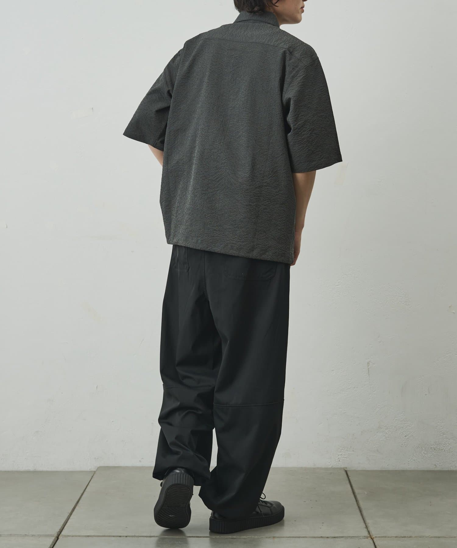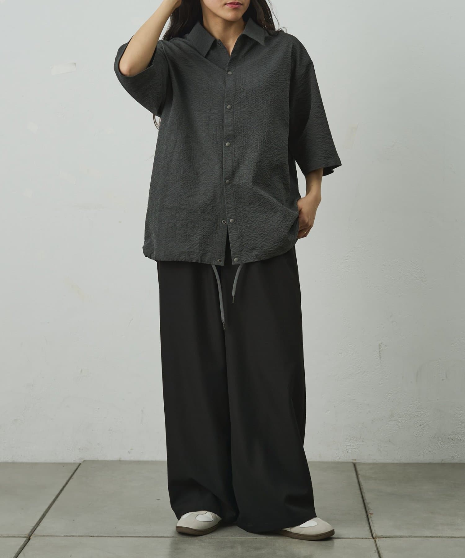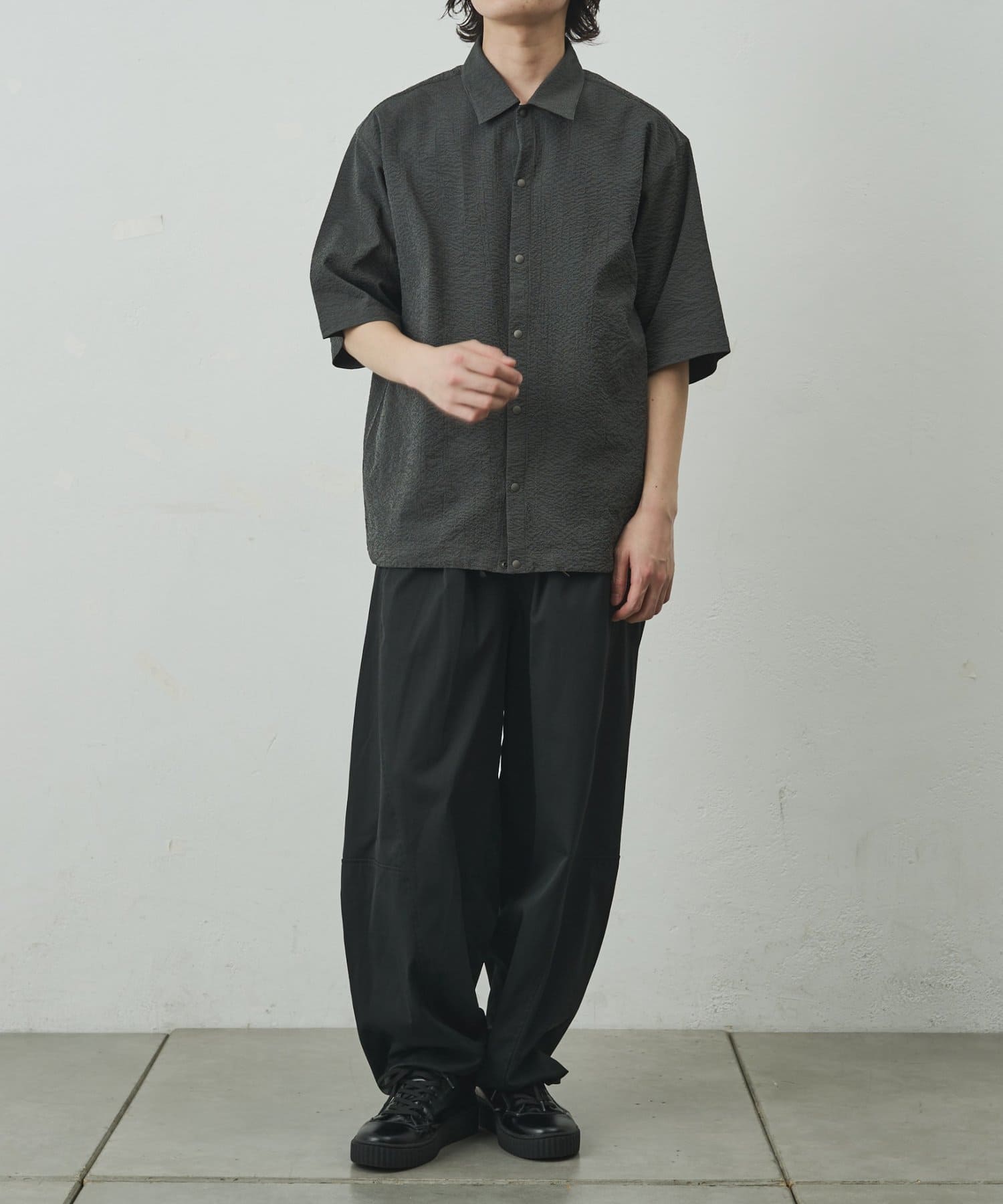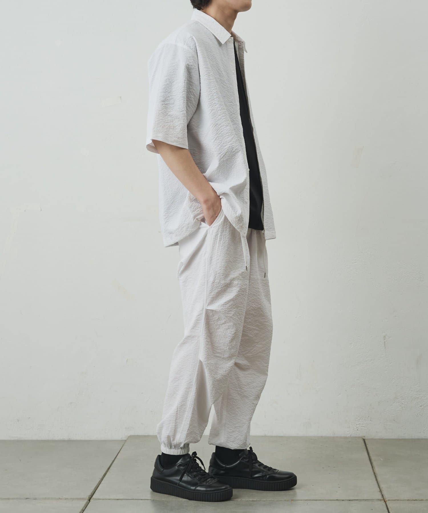 シンプルでありながら、ペーパーサッカー素材ならではの独特の風合いがコーディネートに少しのアクセントを加えてくれます。