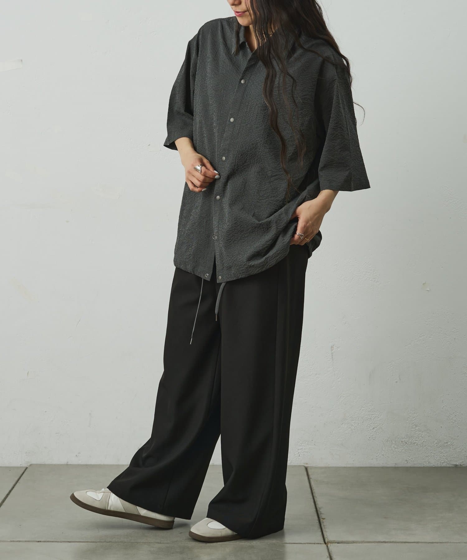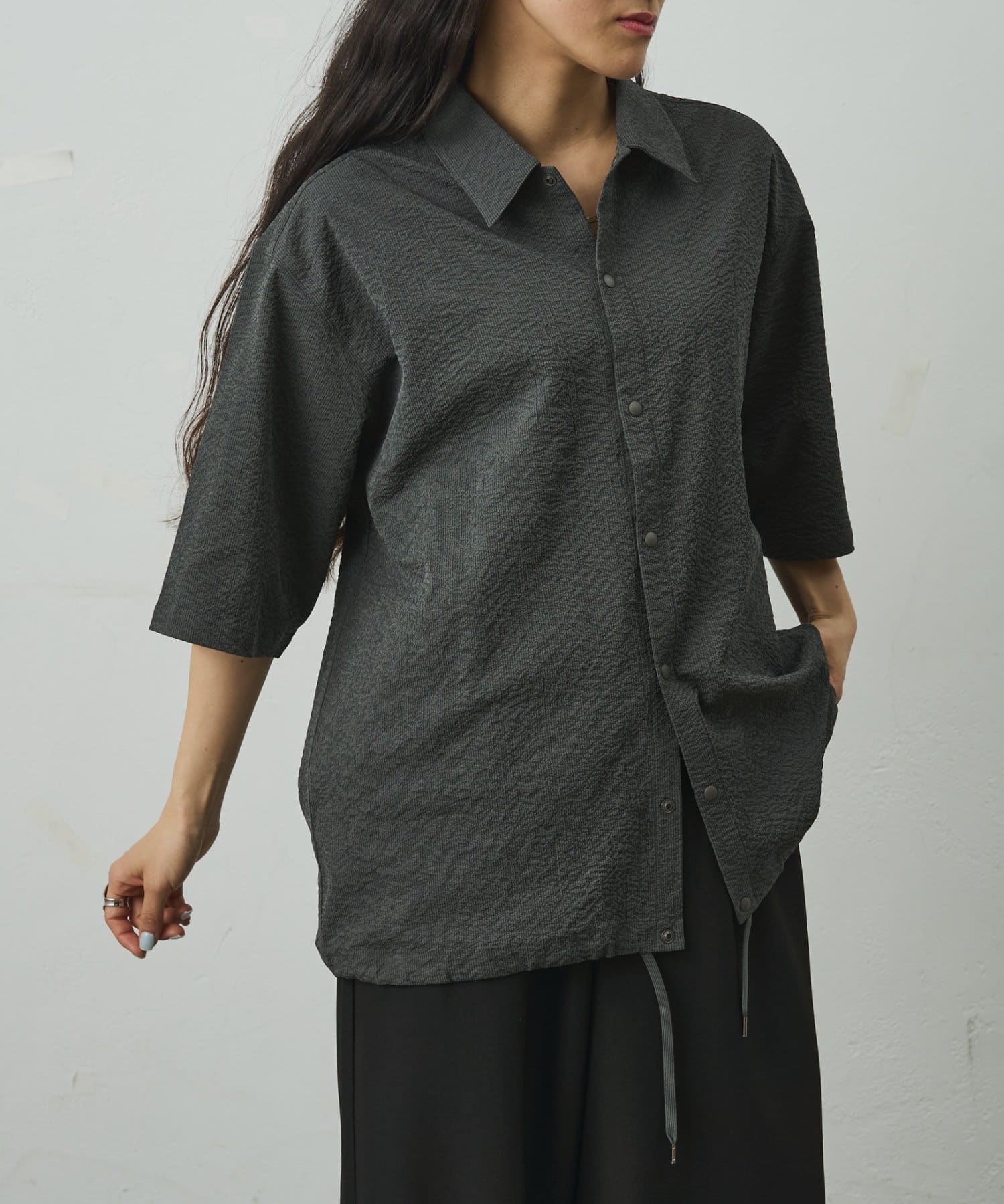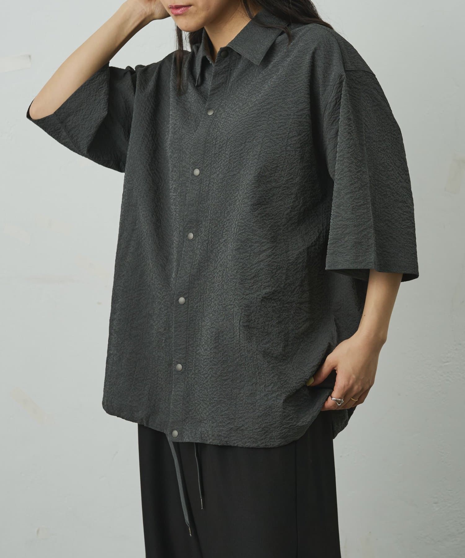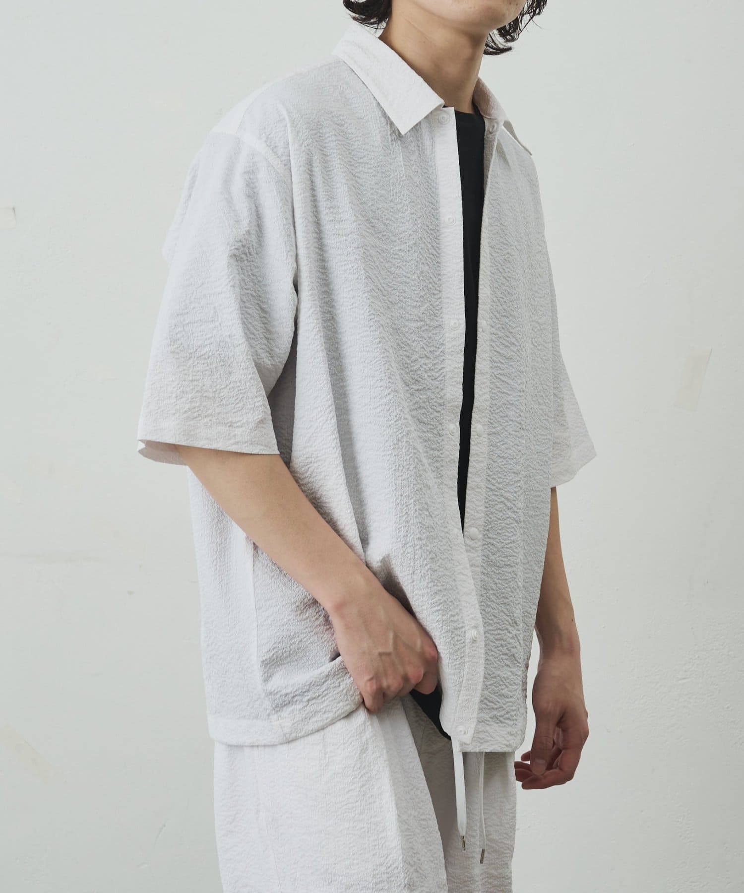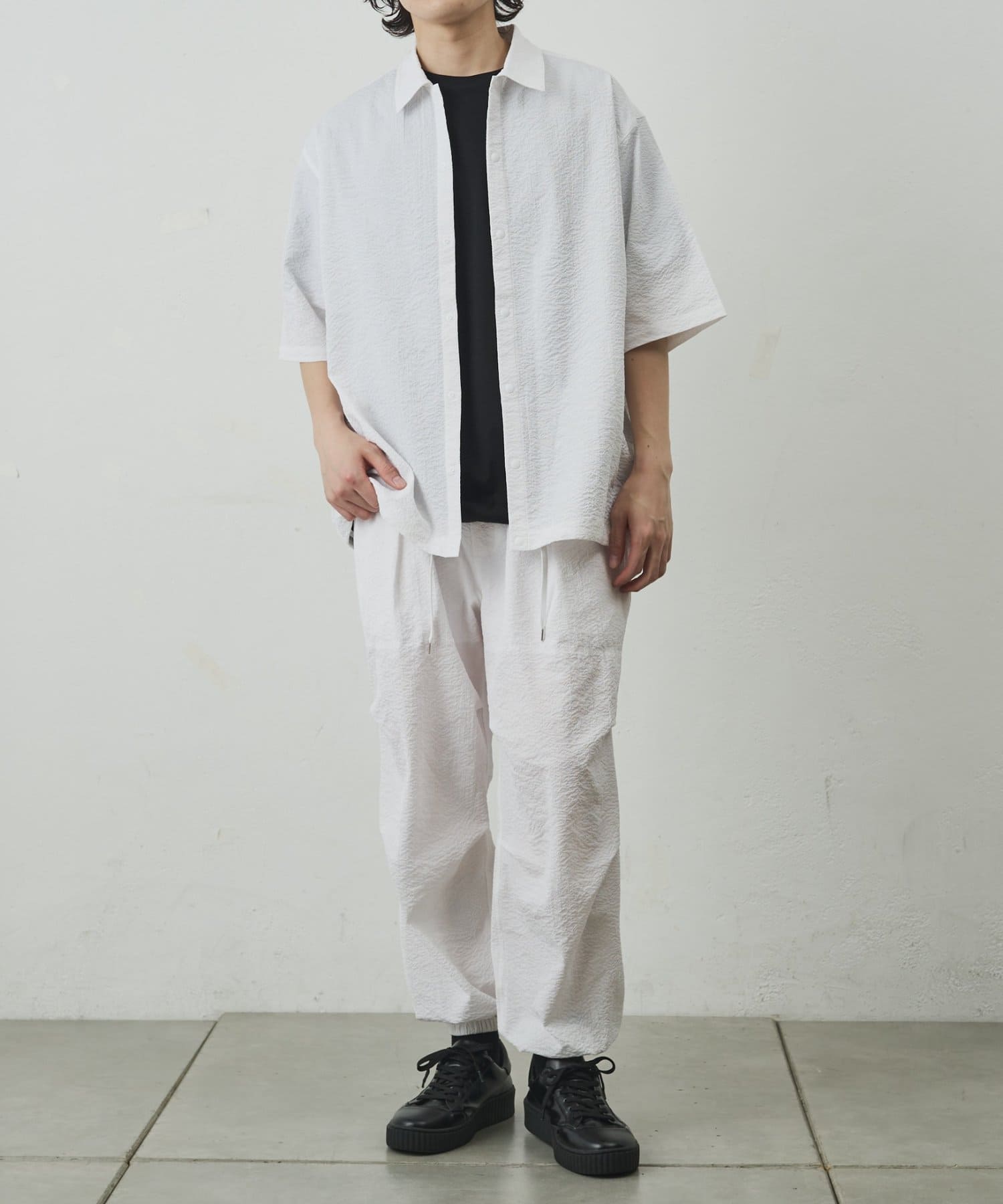 シンプルでありながら、ペーパーサッカー素材ならではの独特の風合いがコーディネートに少しのアクセントを加えてくれます。