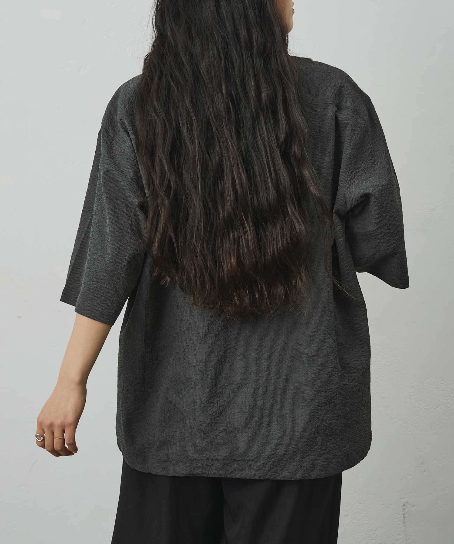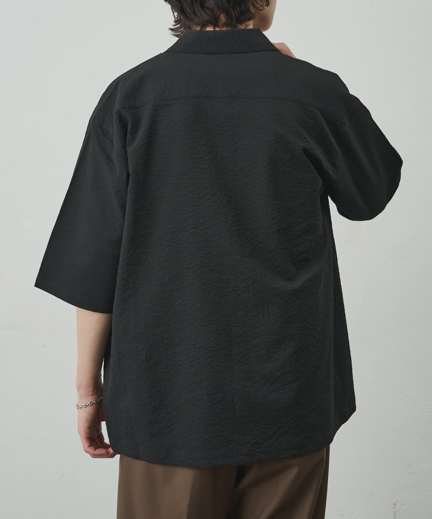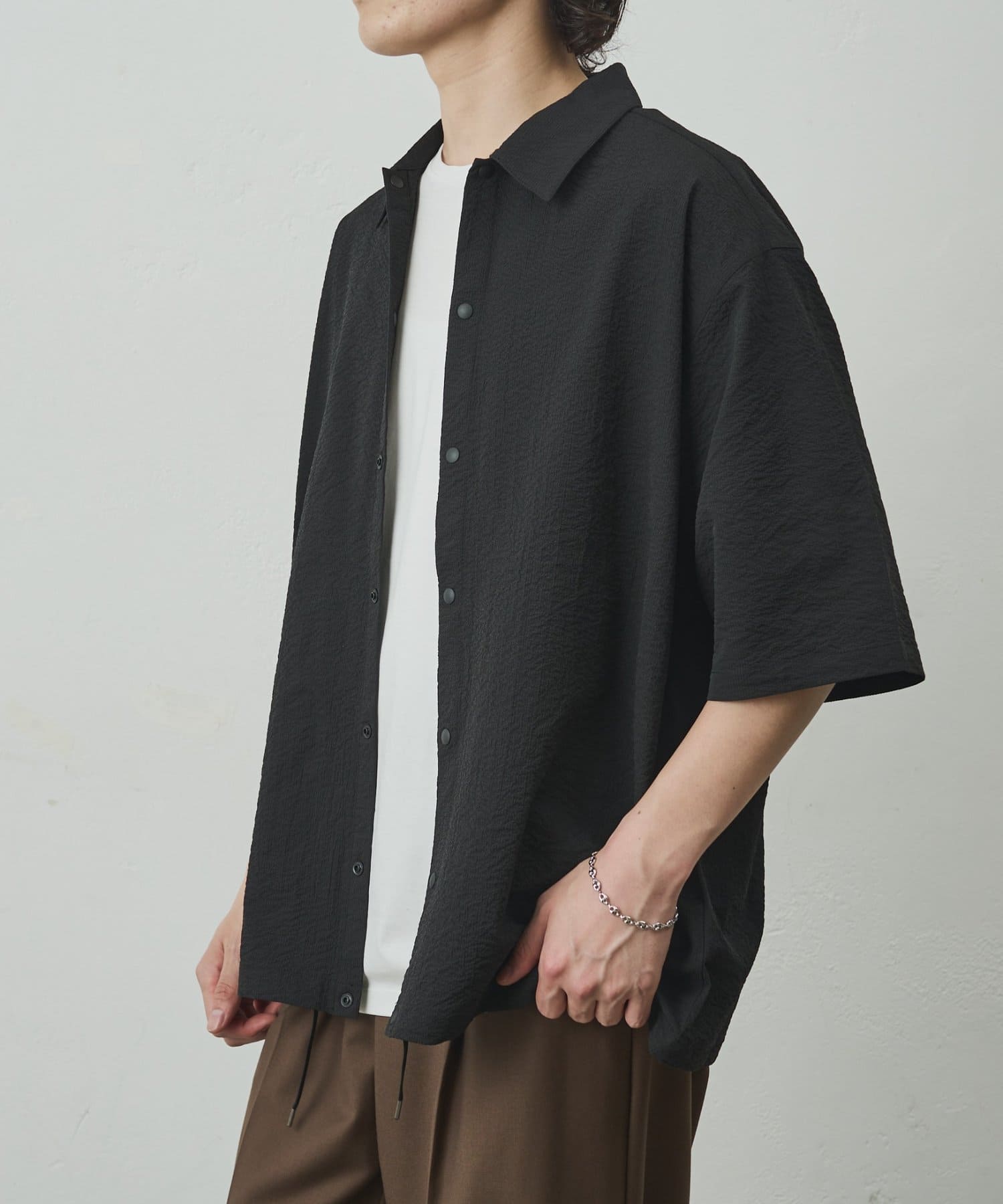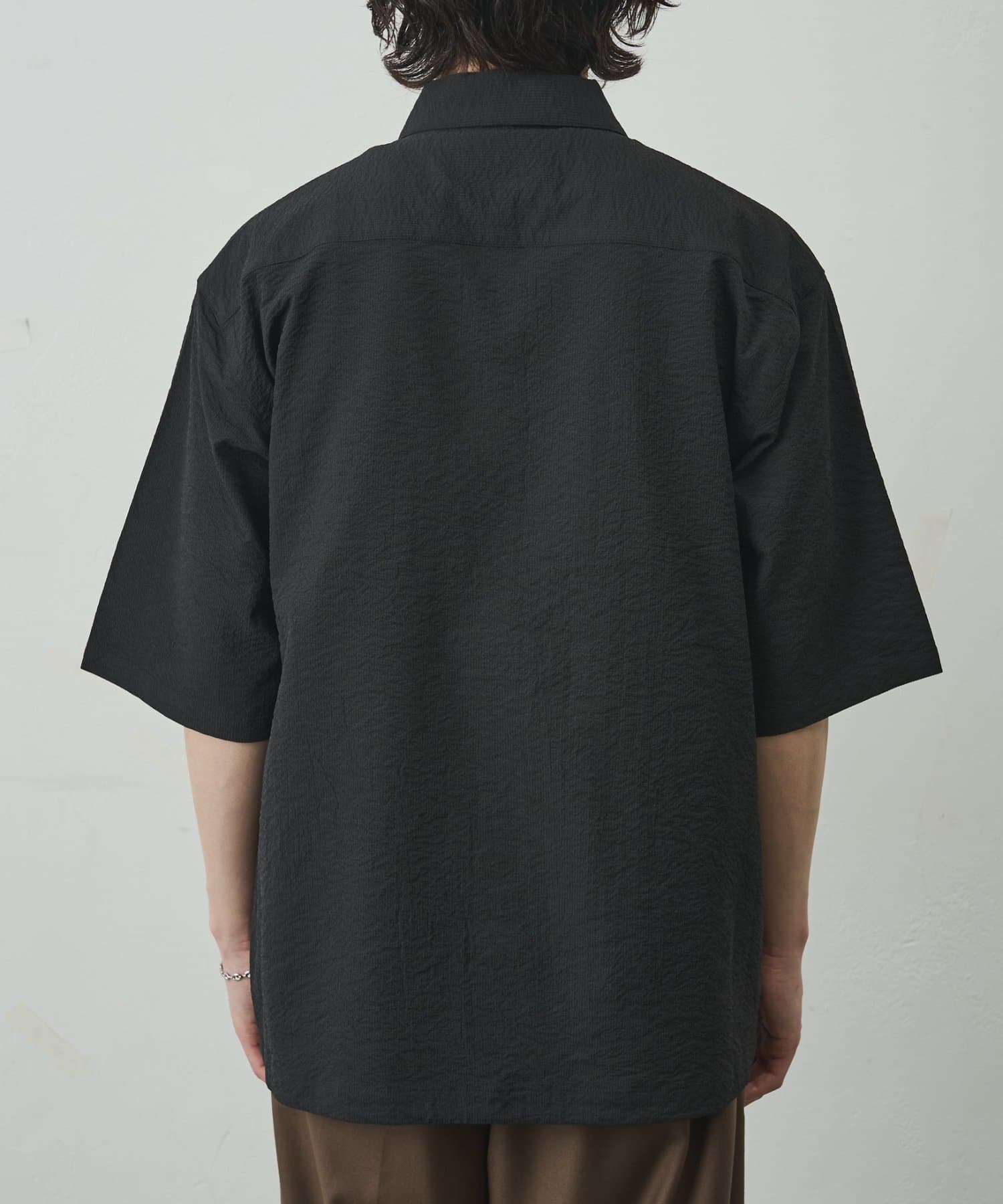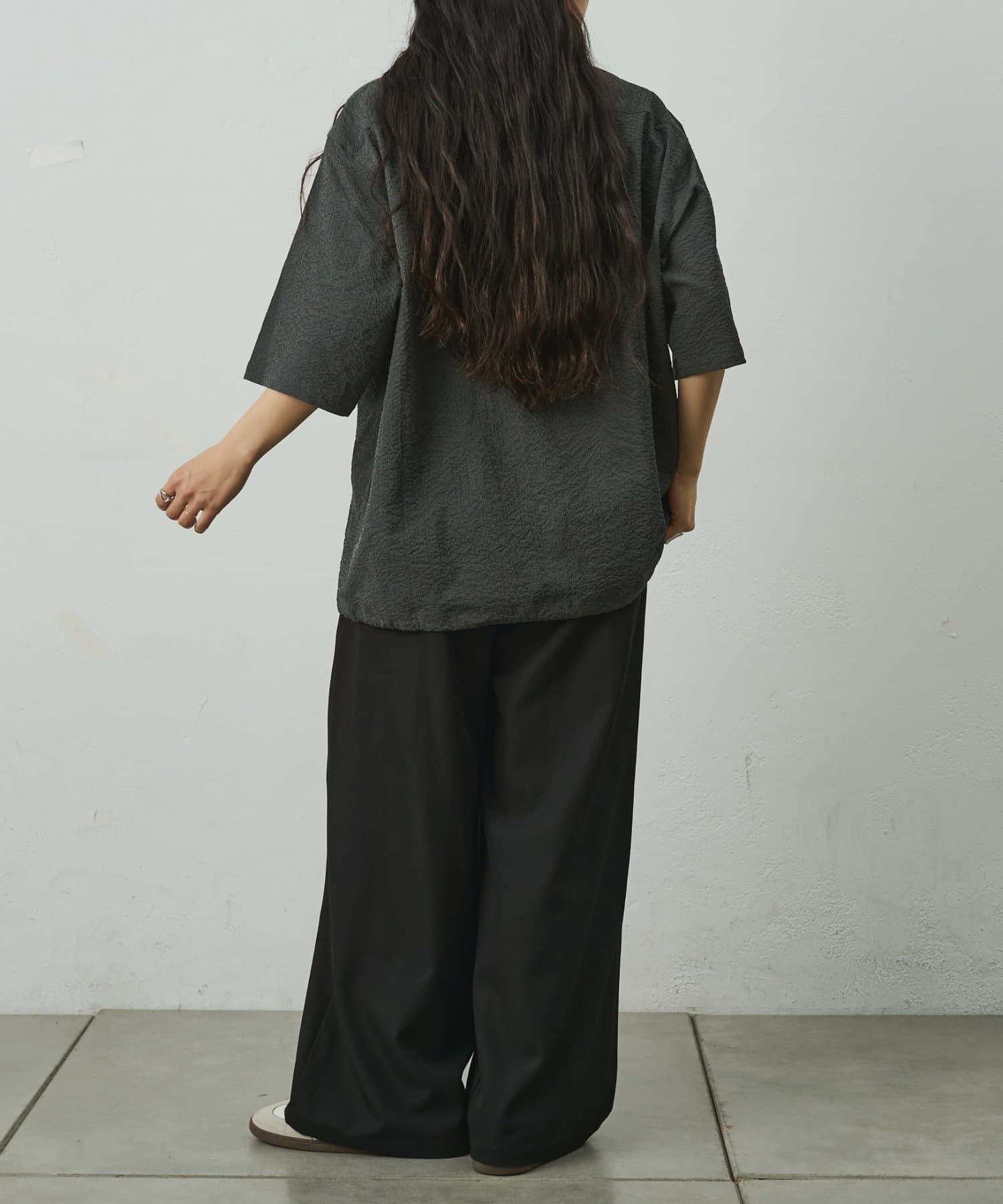 シンプルでありながら、ペーパーサッカー素材ならではの独特の風合いがコーディネートに少しのアクセントを加えてくれます。