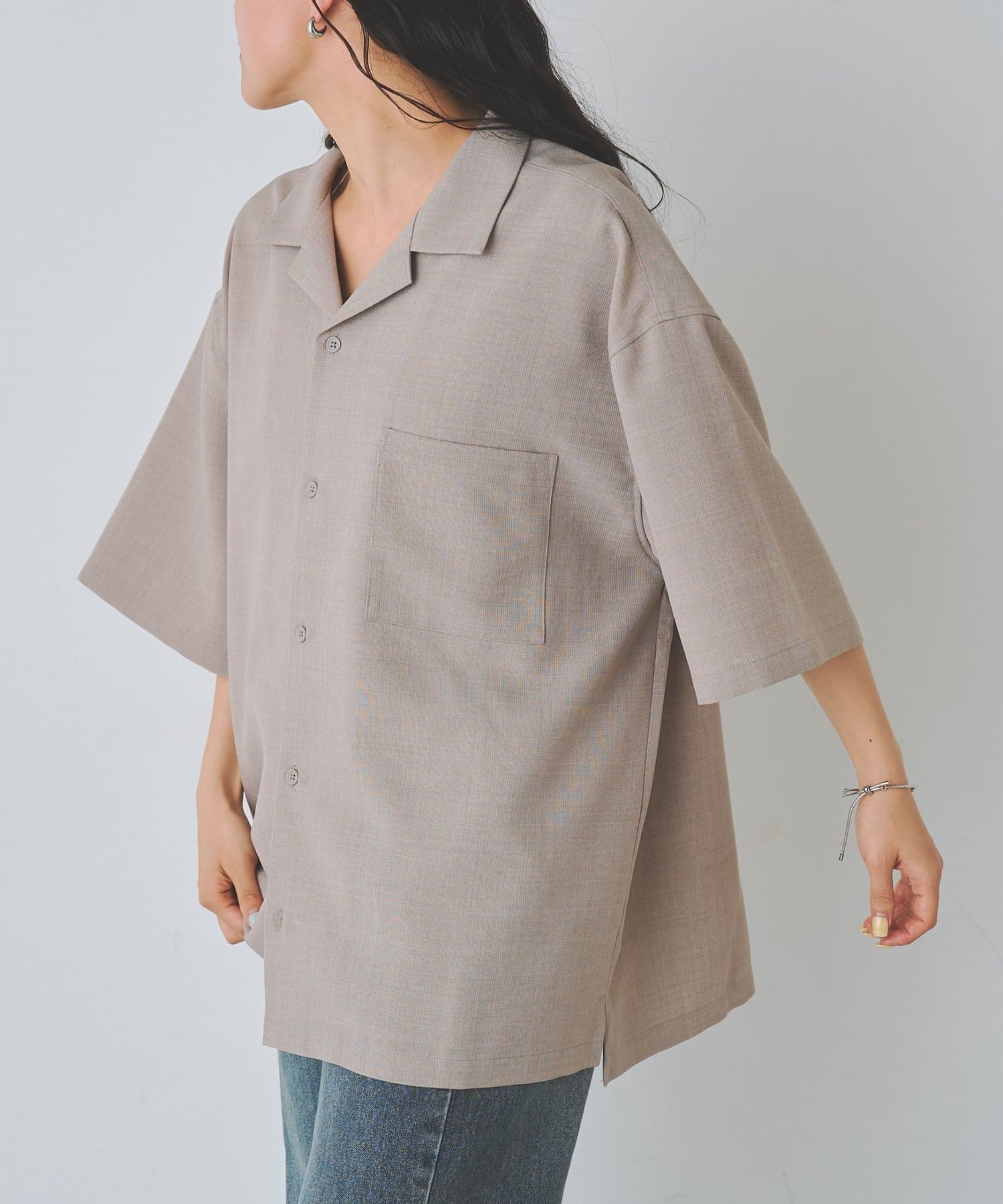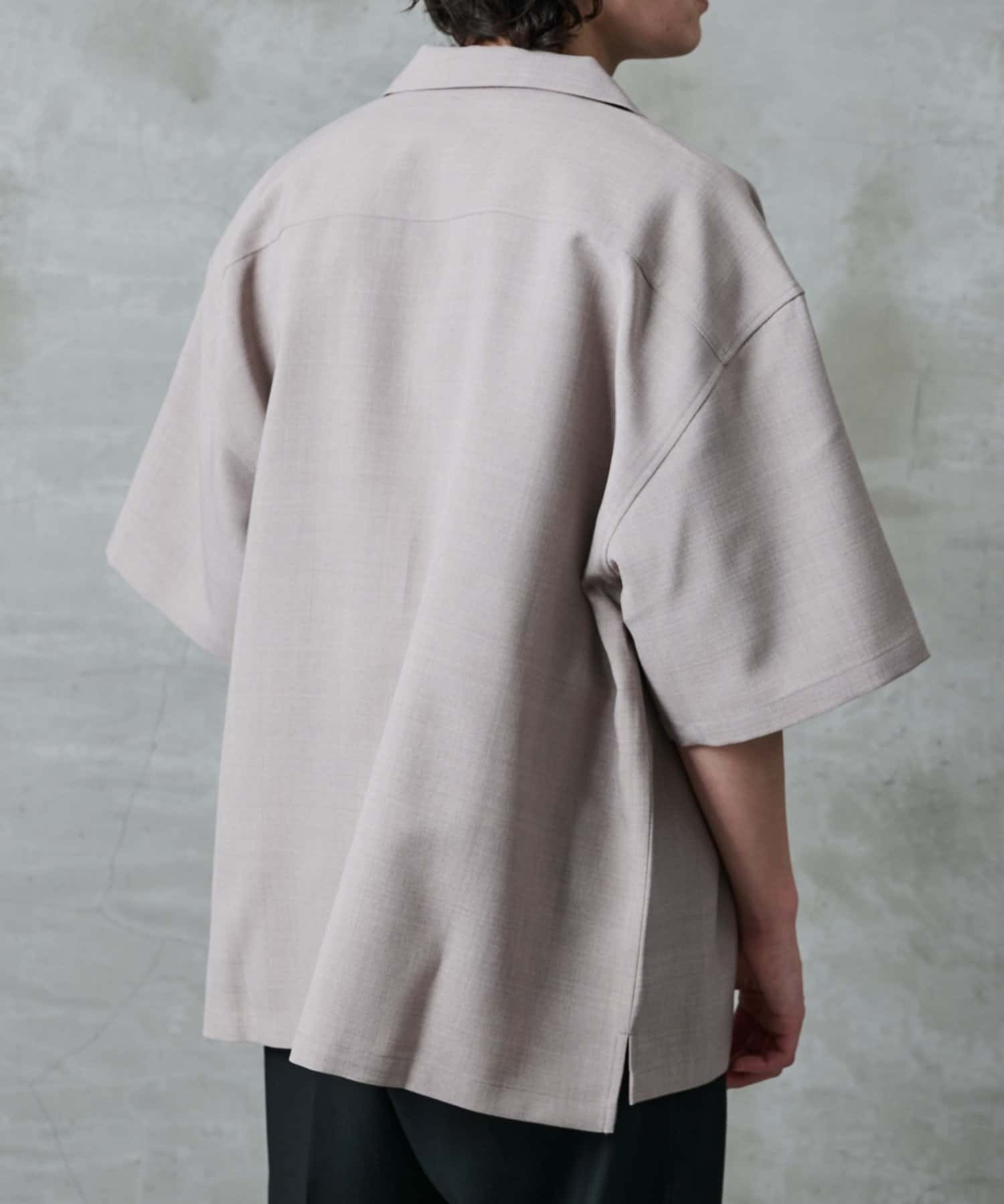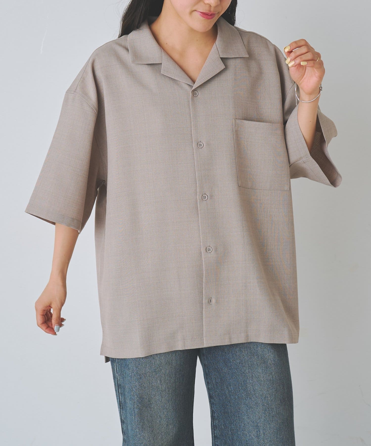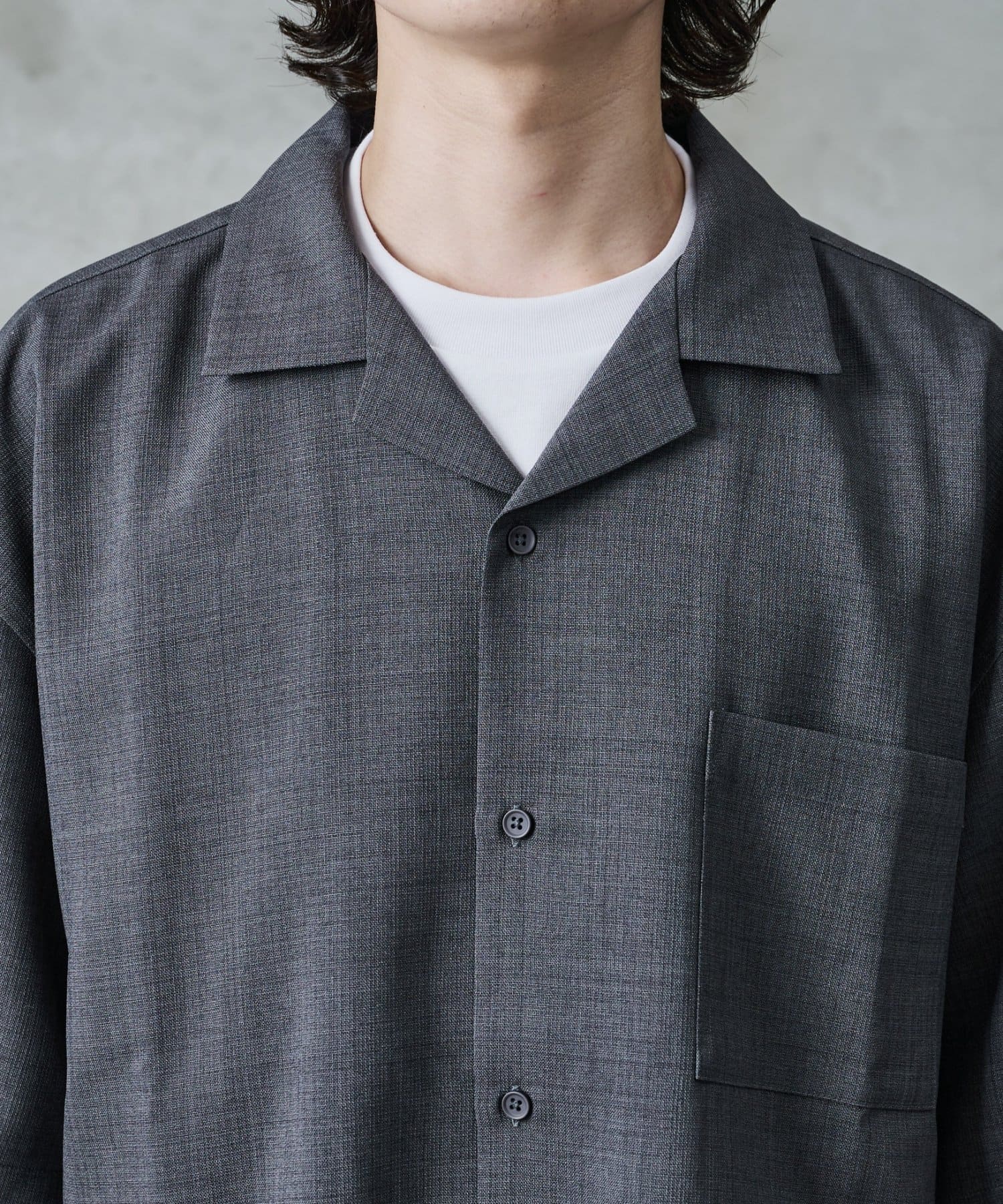 襟元はオープンカラーなので抜け感をプラスするだけでなく、ネックレスのレイヤードなどもお楽しみいただけます。