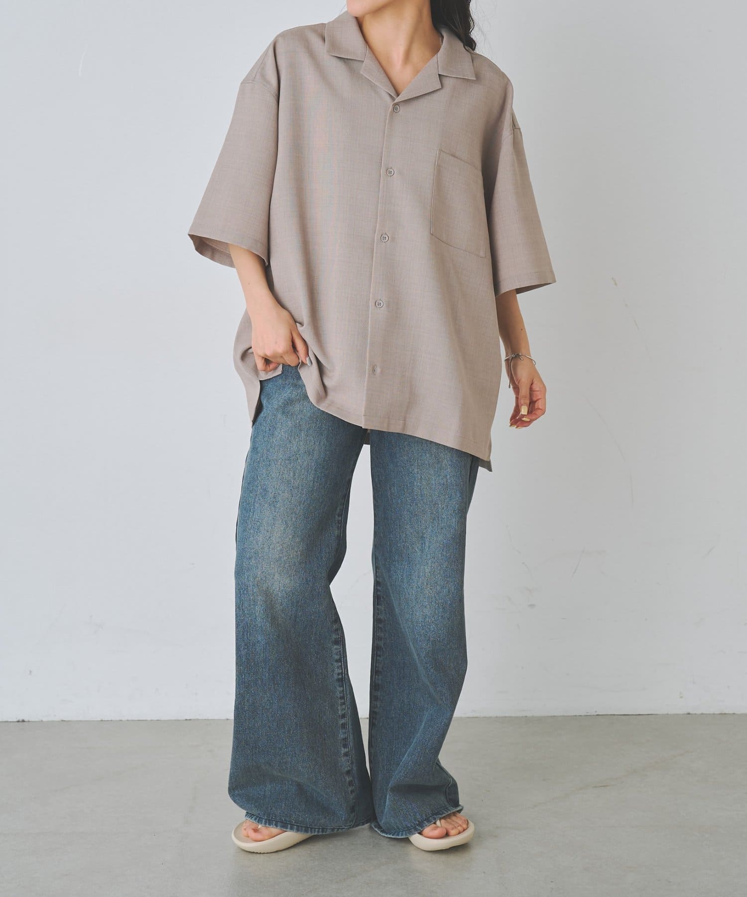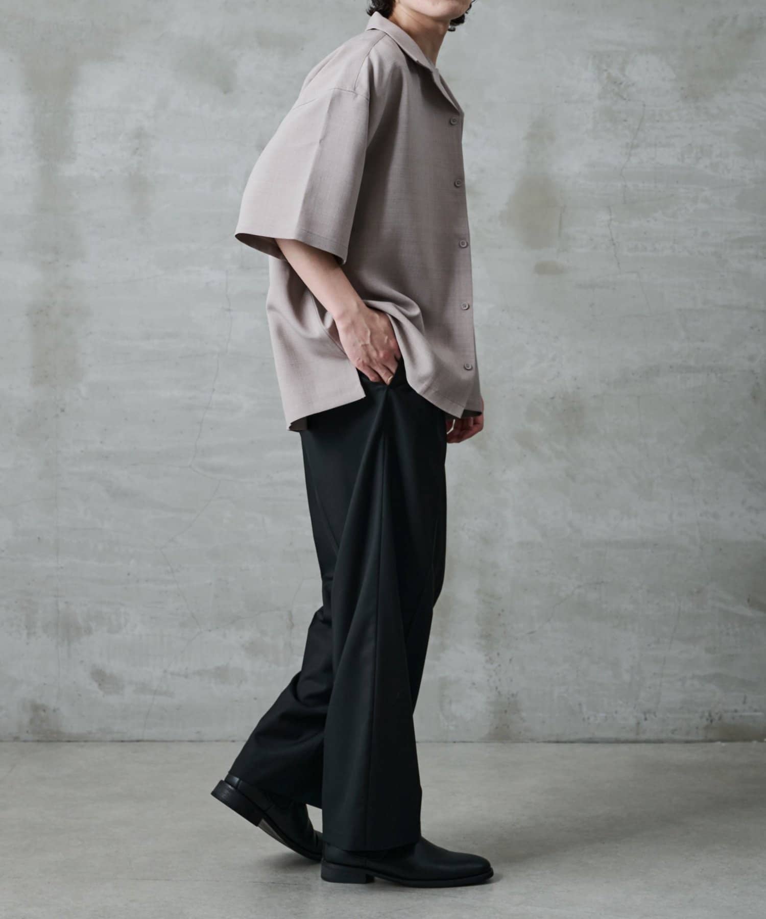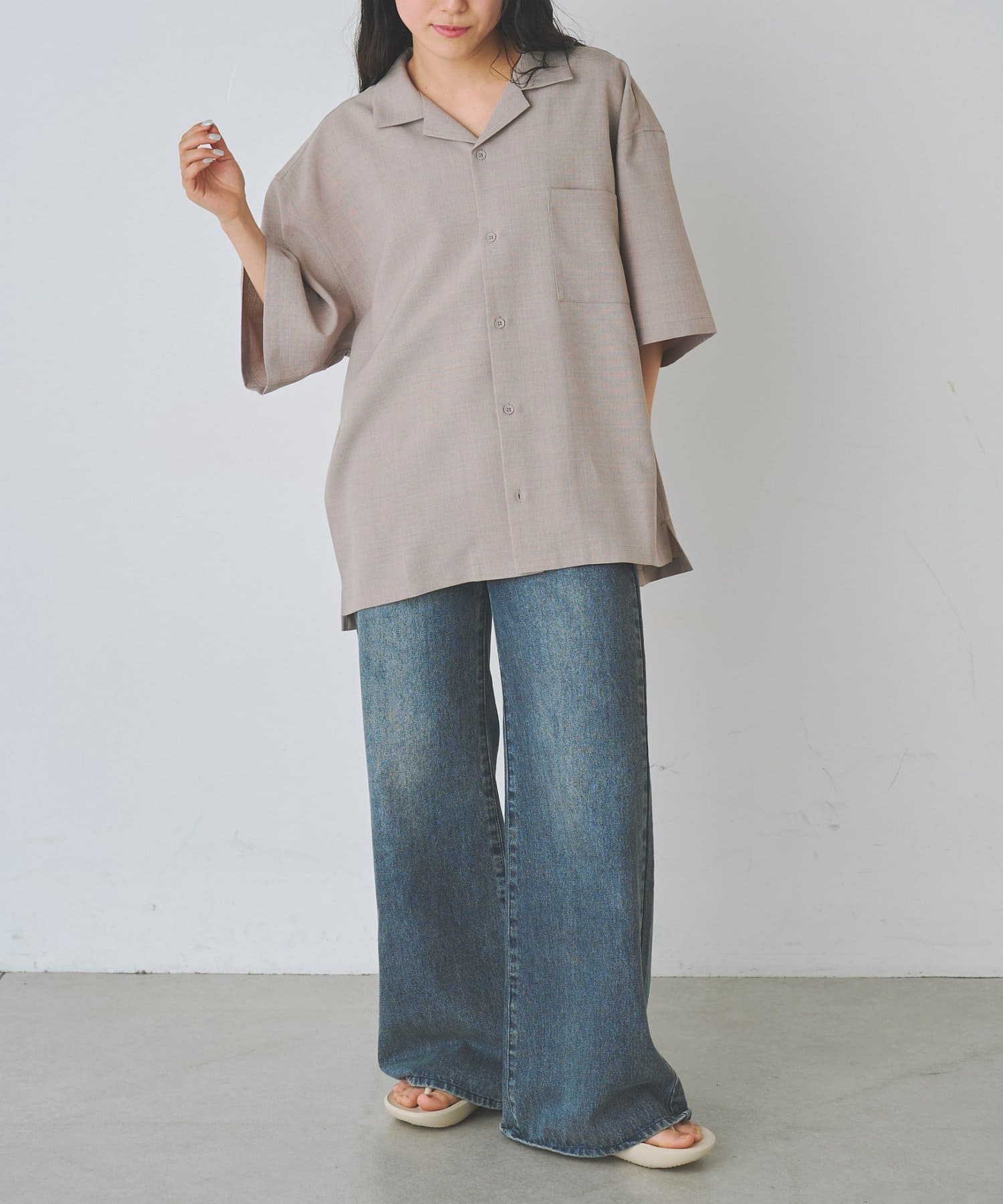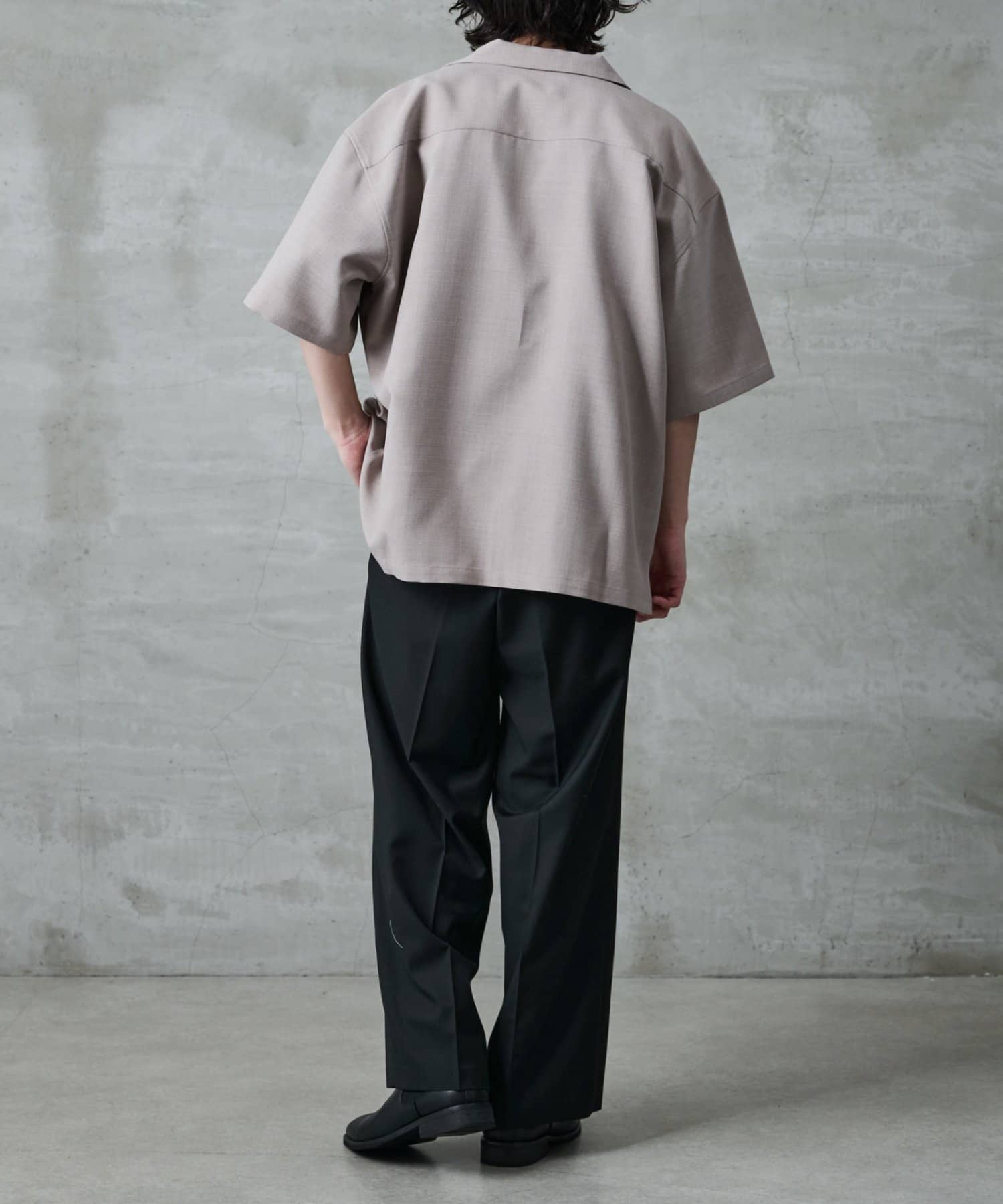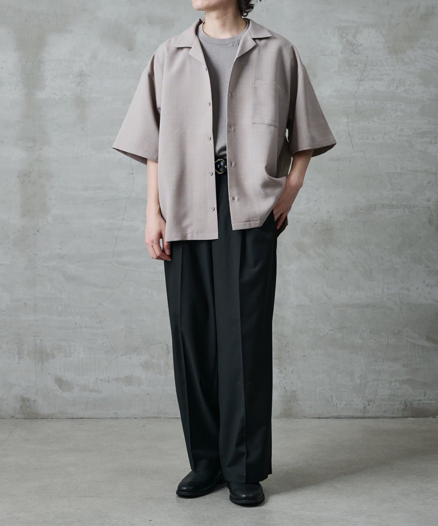 襟元はオープンカラーなので抜け感をプラスするだけでなく、ネックレスのレイヤードなどもお楽しみいただけます。