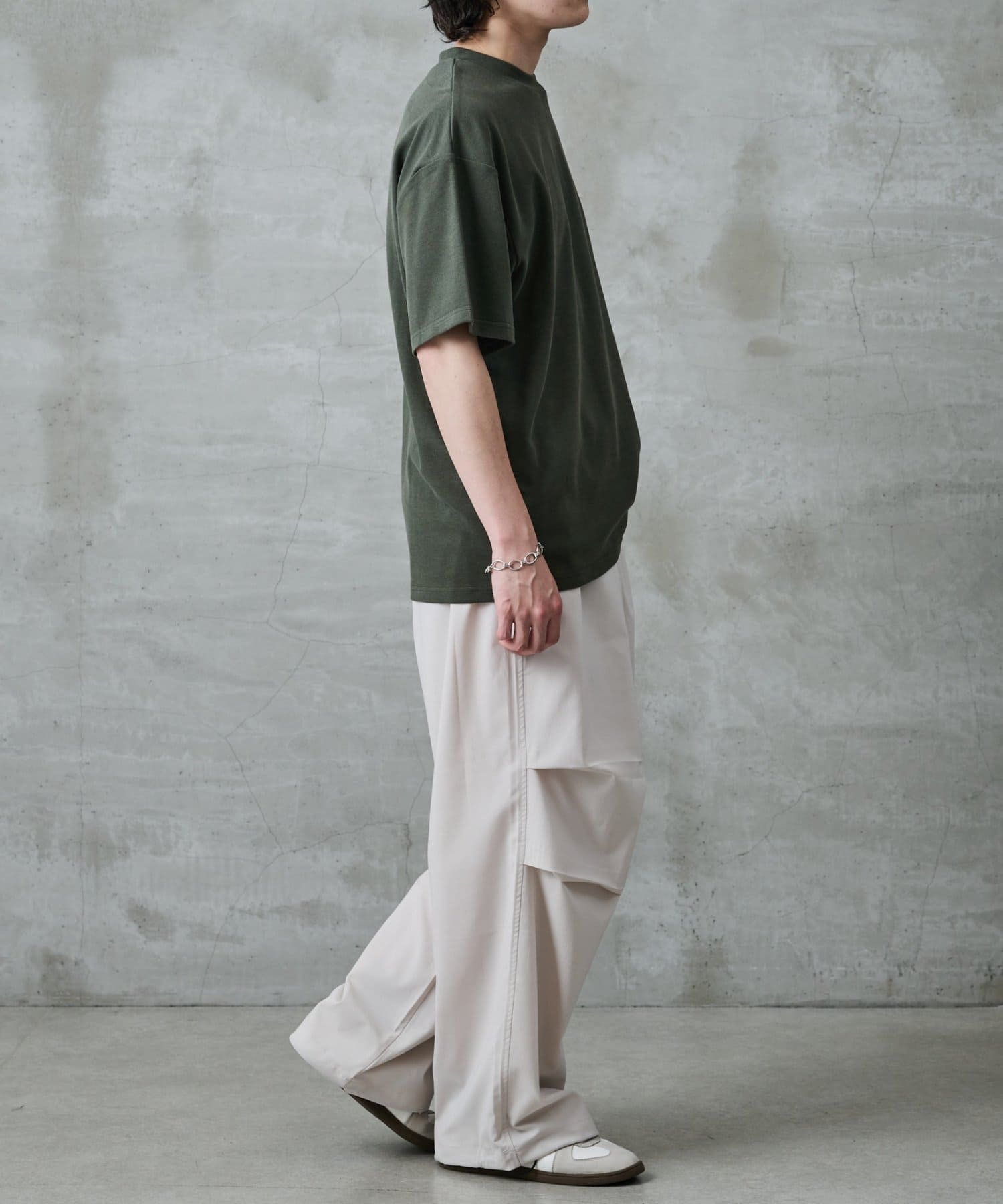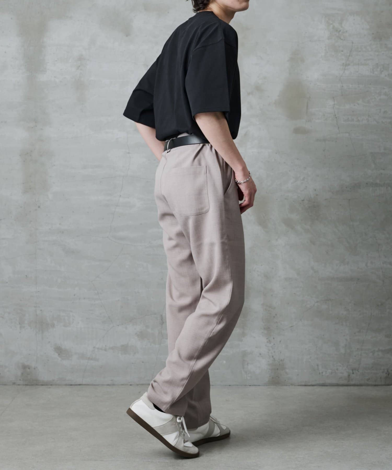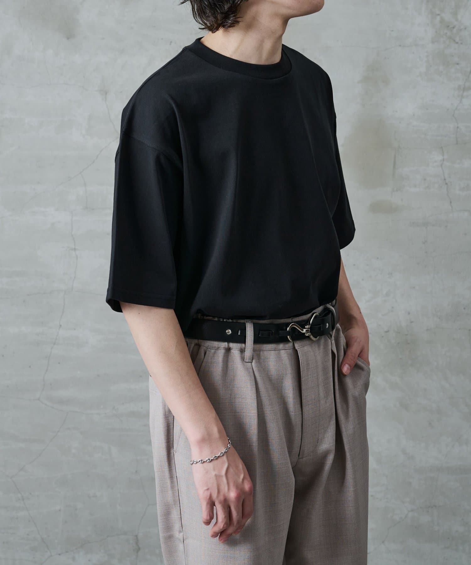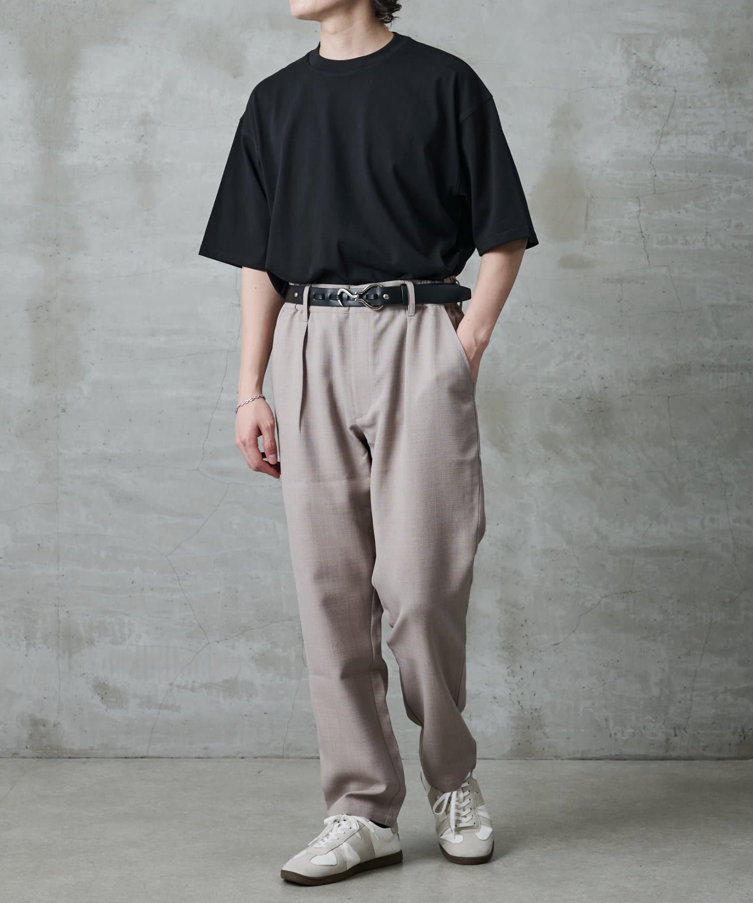 無地のTシャツなのでスラックスやデニム、フルレングスからハーフパンツまで