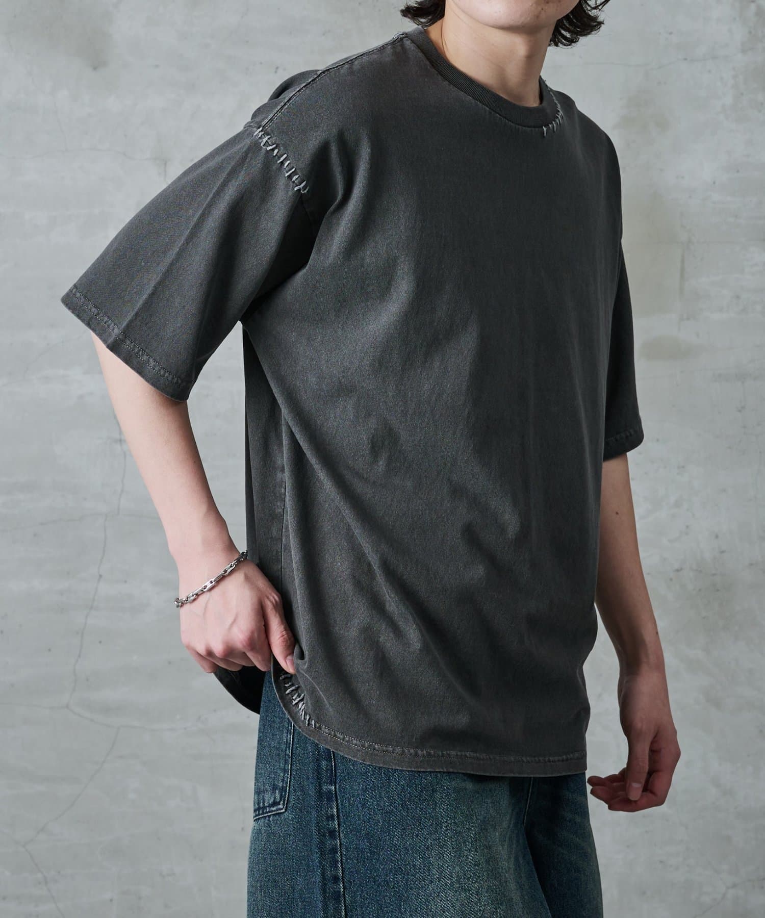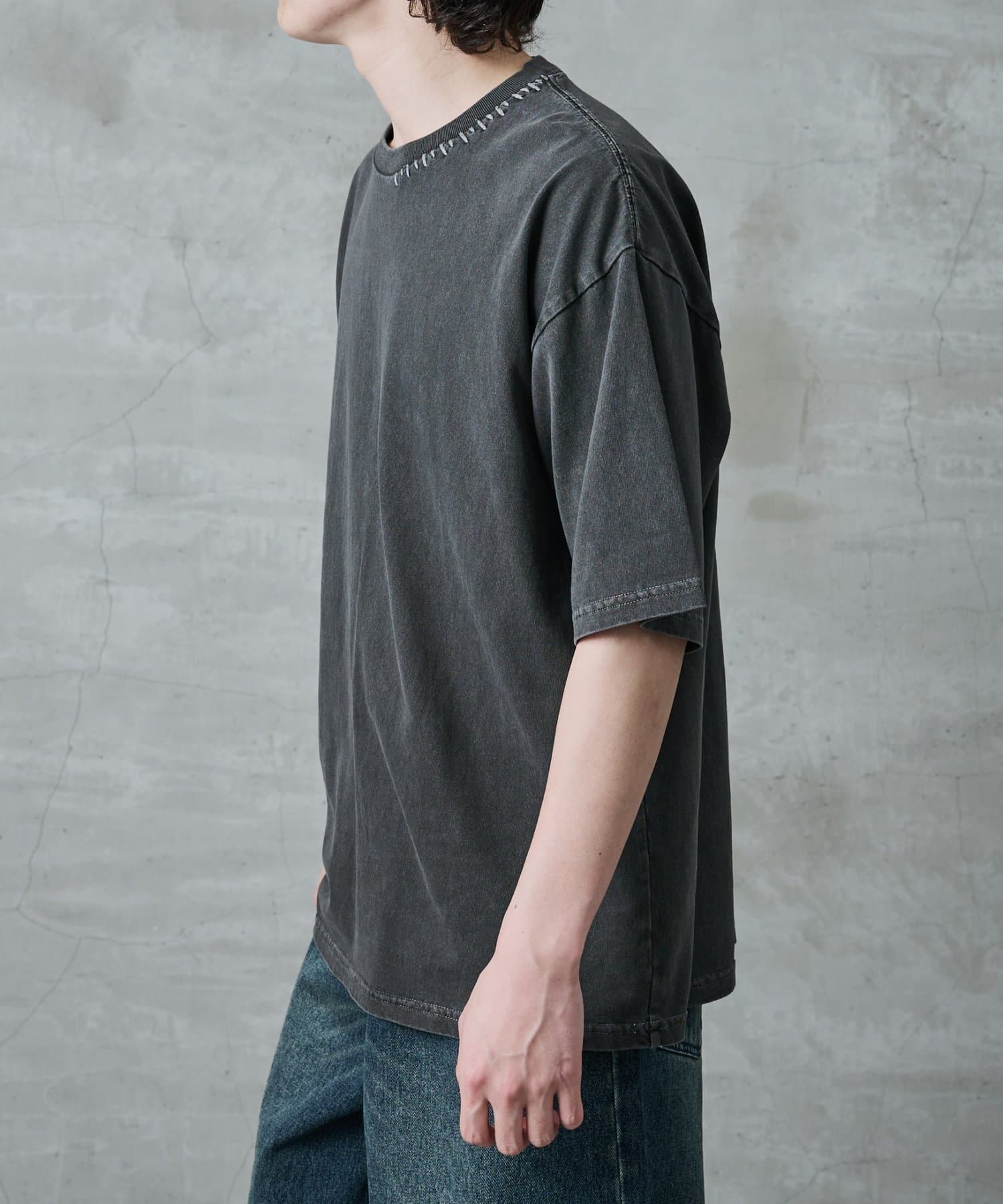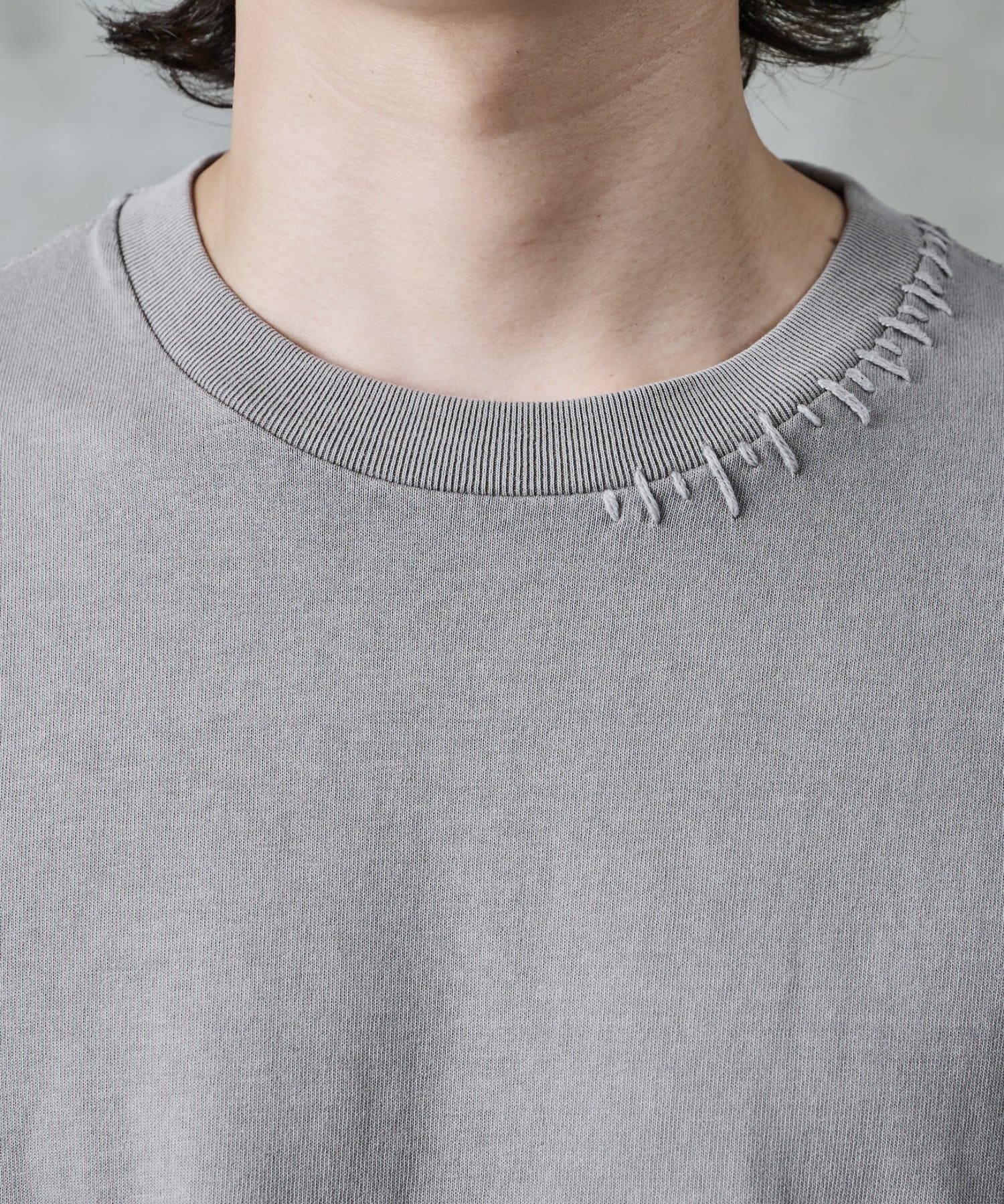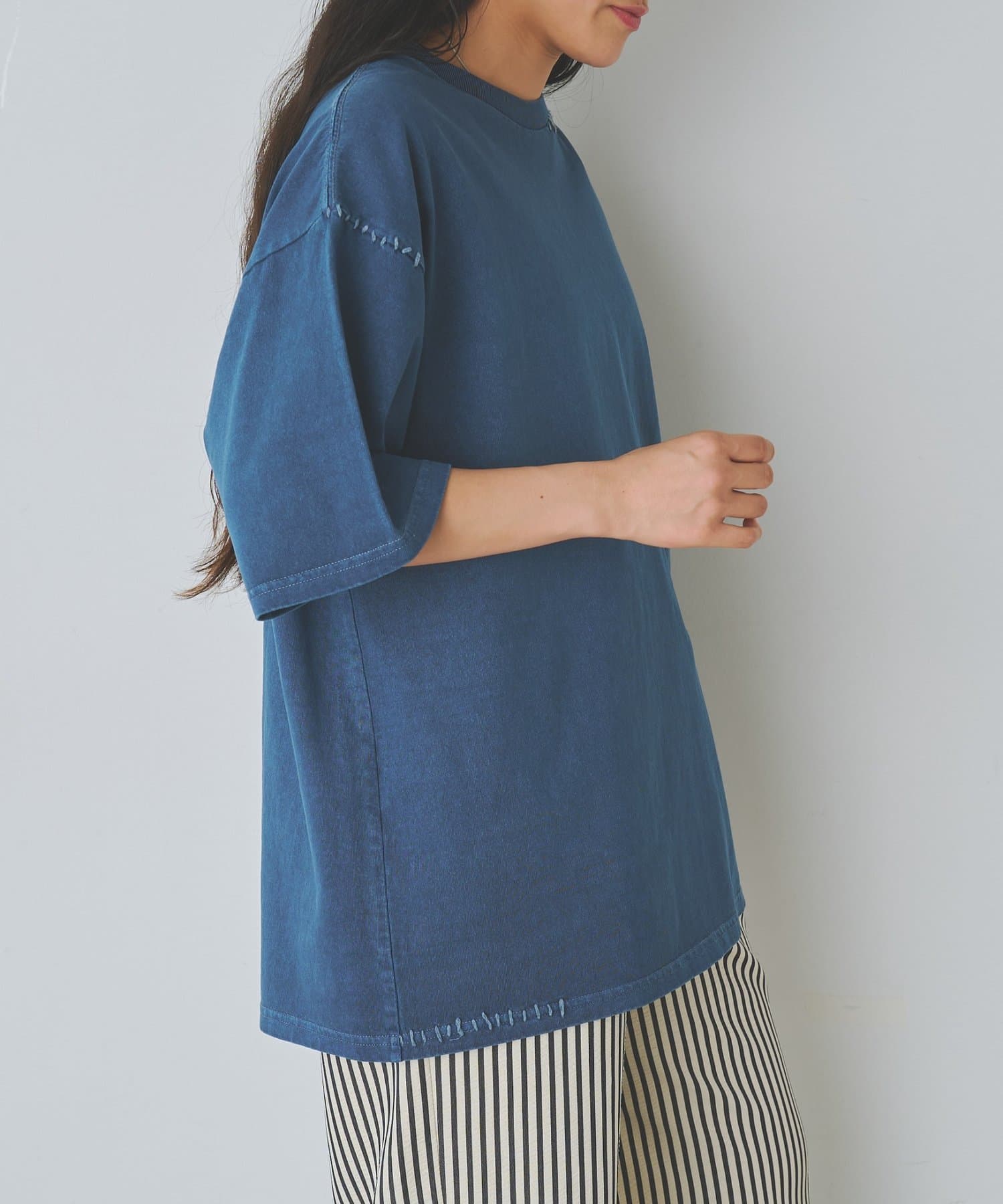 首元と裾にステッチを加えているためシンプルな服装のワンポイントに。