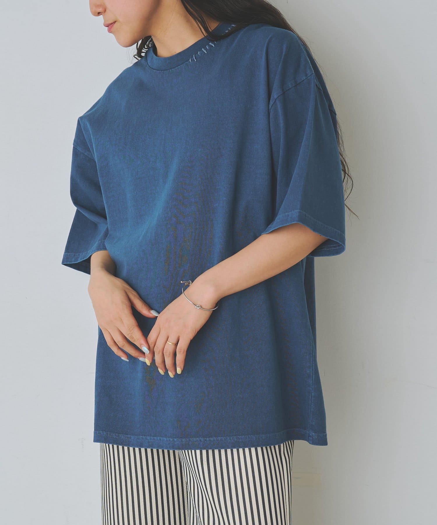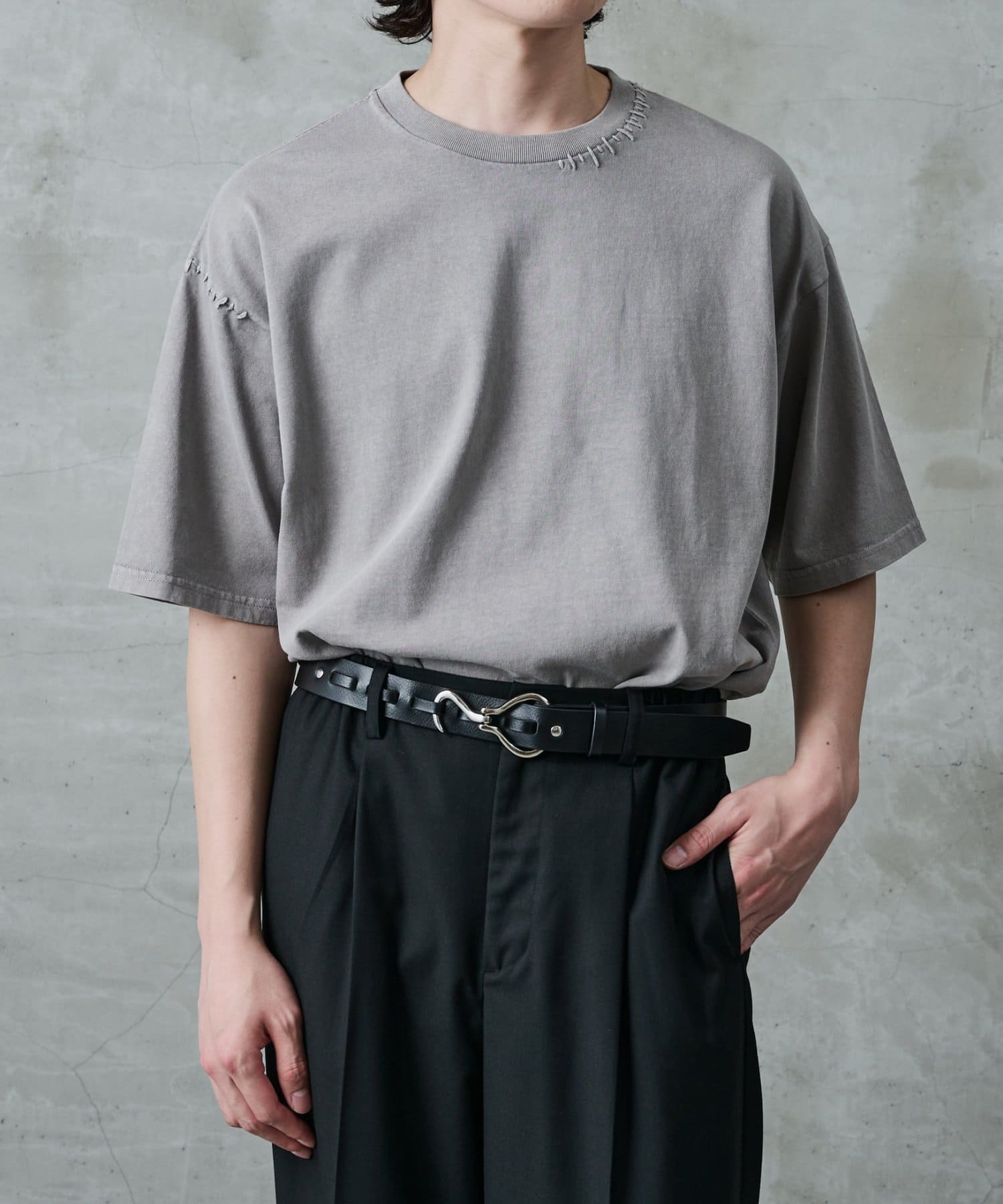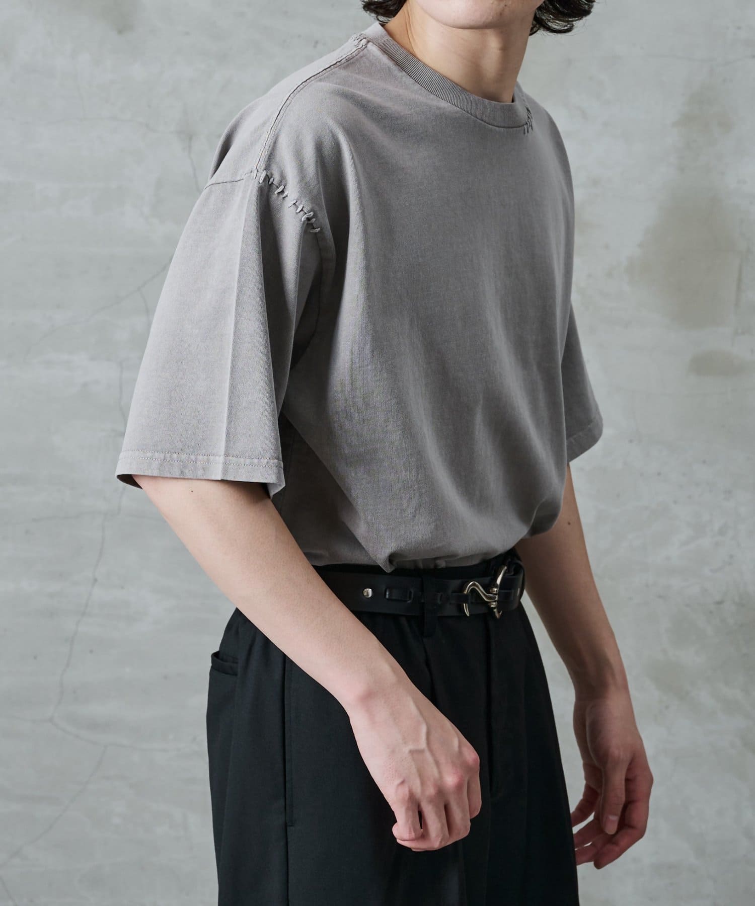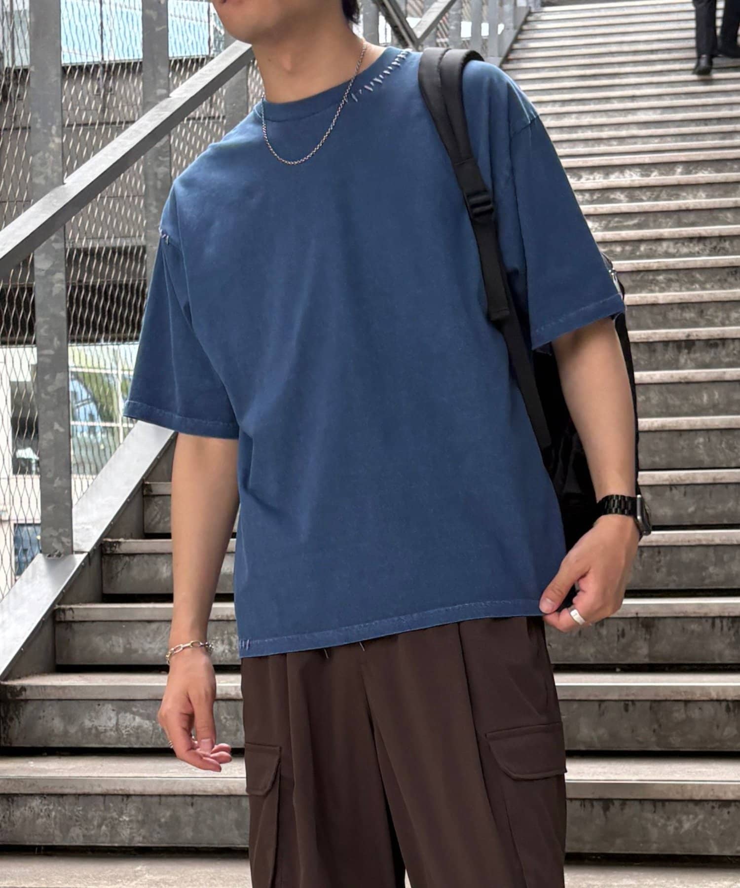 首元と裾にステッチを加えているためシンプルな服装のワンポイントに。