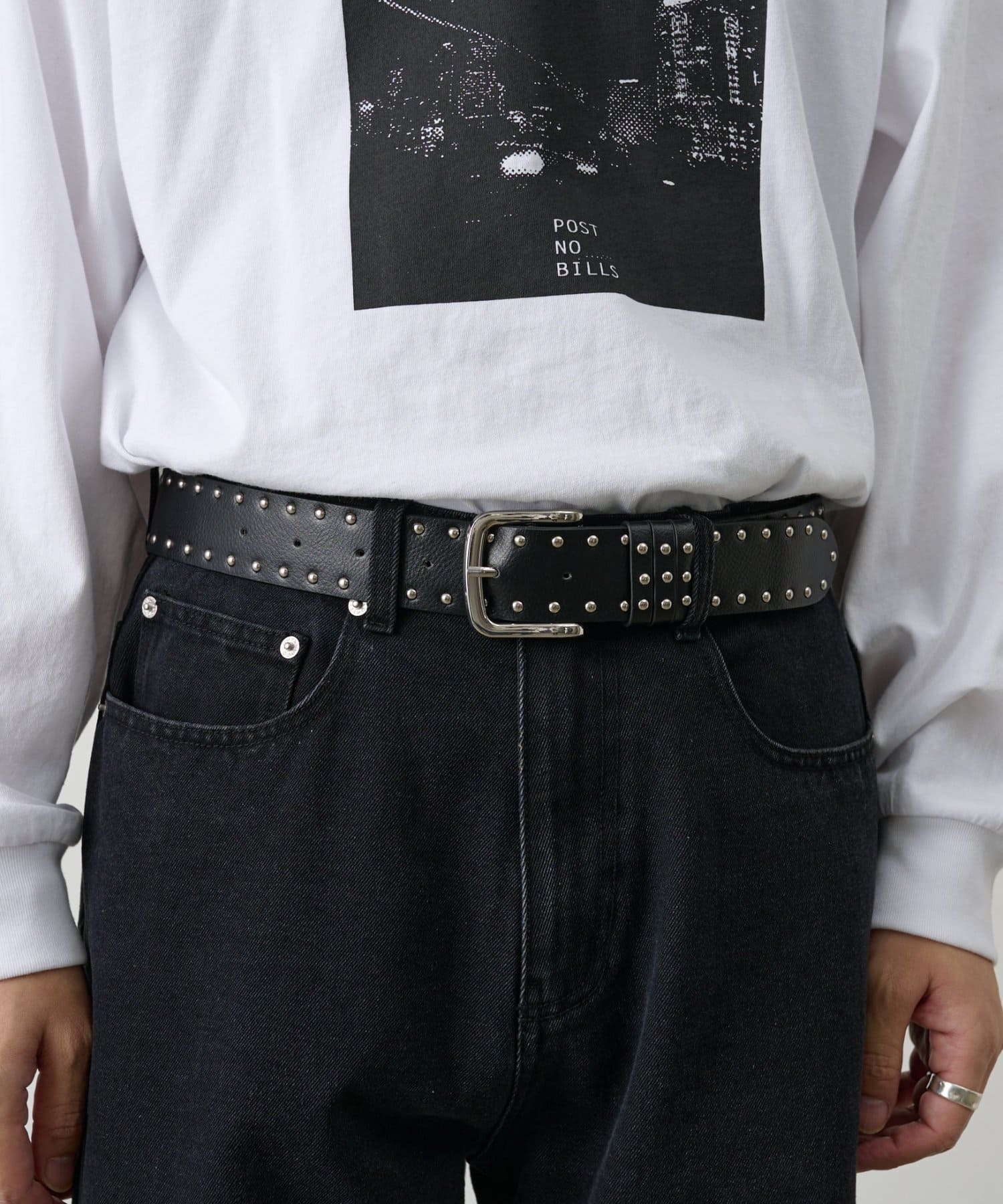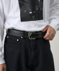 厚みのあるベルト幅とスタッズの存在感が絶妙にマッチし、デニムやチノパン、ワイドパンツなど幅広いボトムスと好相性。