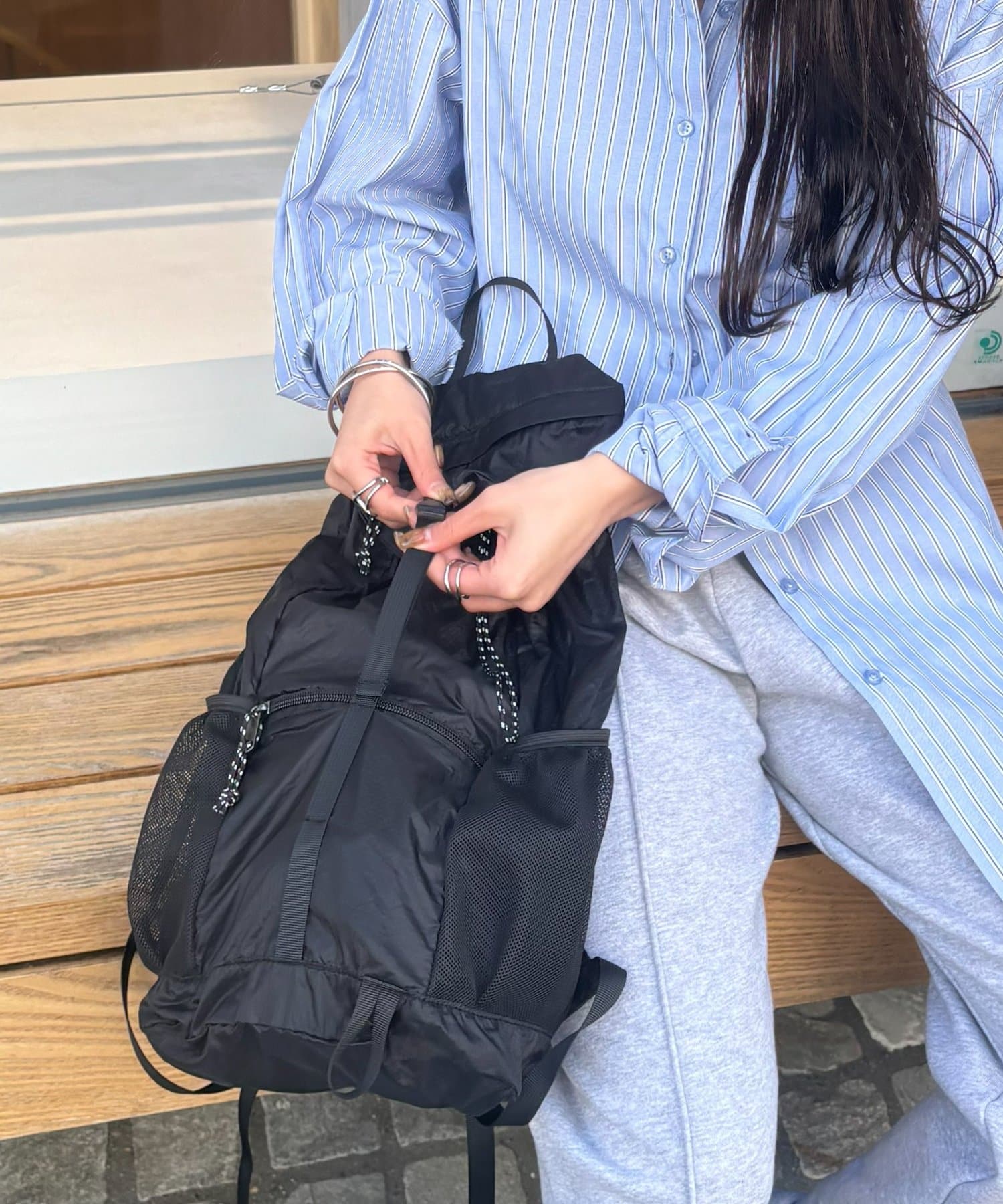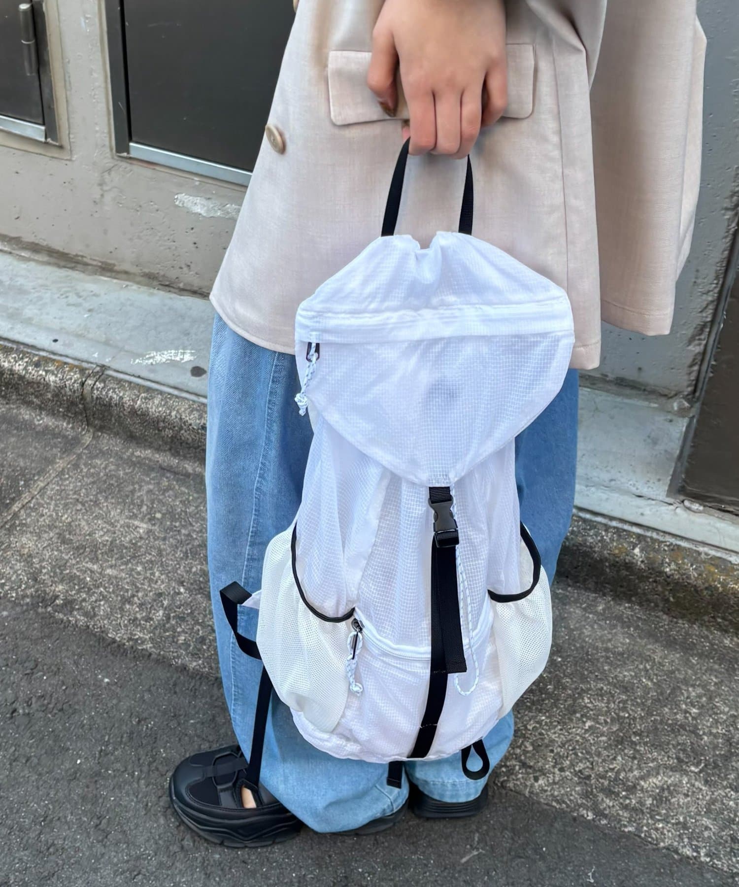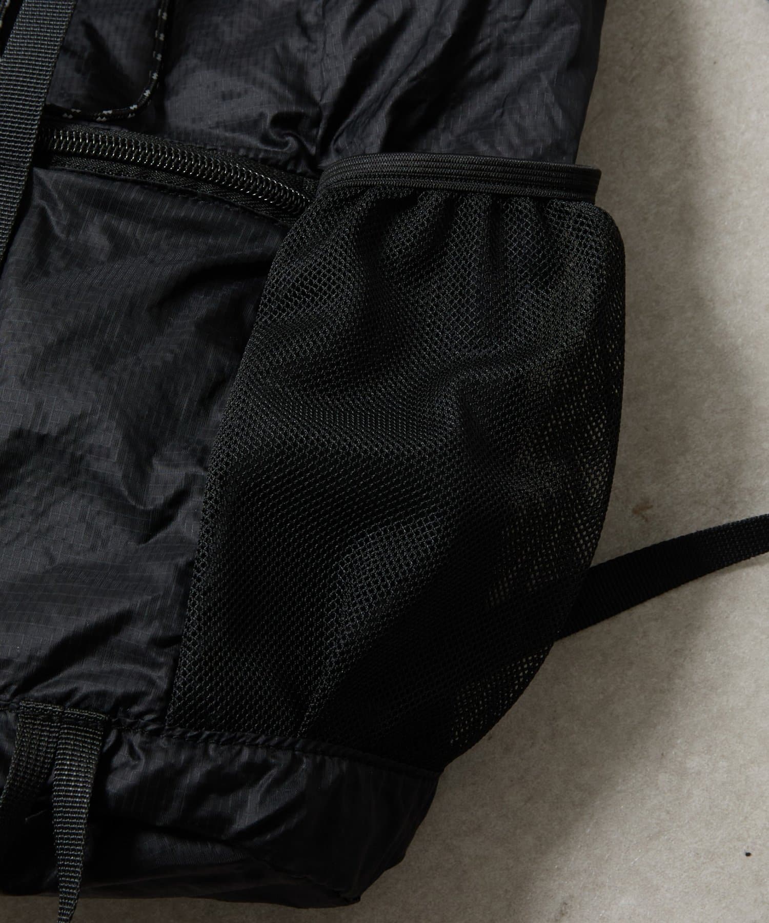 外側にはジップポケット、サイドにはメッシュポケットがあり、傘やペットボトルなどもさっと収納可能です。