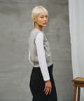 ボディが天竺編み、ネックや袖先、腰回りはリブ編み、フロントボタン部分は総針編みと3種類の編み地を組み合わせるこ とで、ミニマルながらシンプル過ぎないバランスに仕上げました。