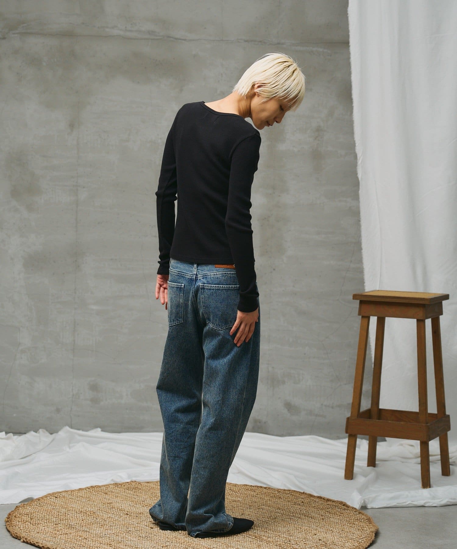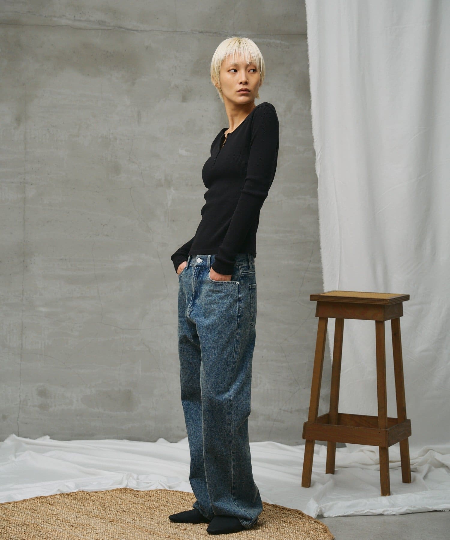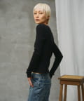 細身のシルエットと、衿ぐりの華奢なヘンリー仕様がポイントです。