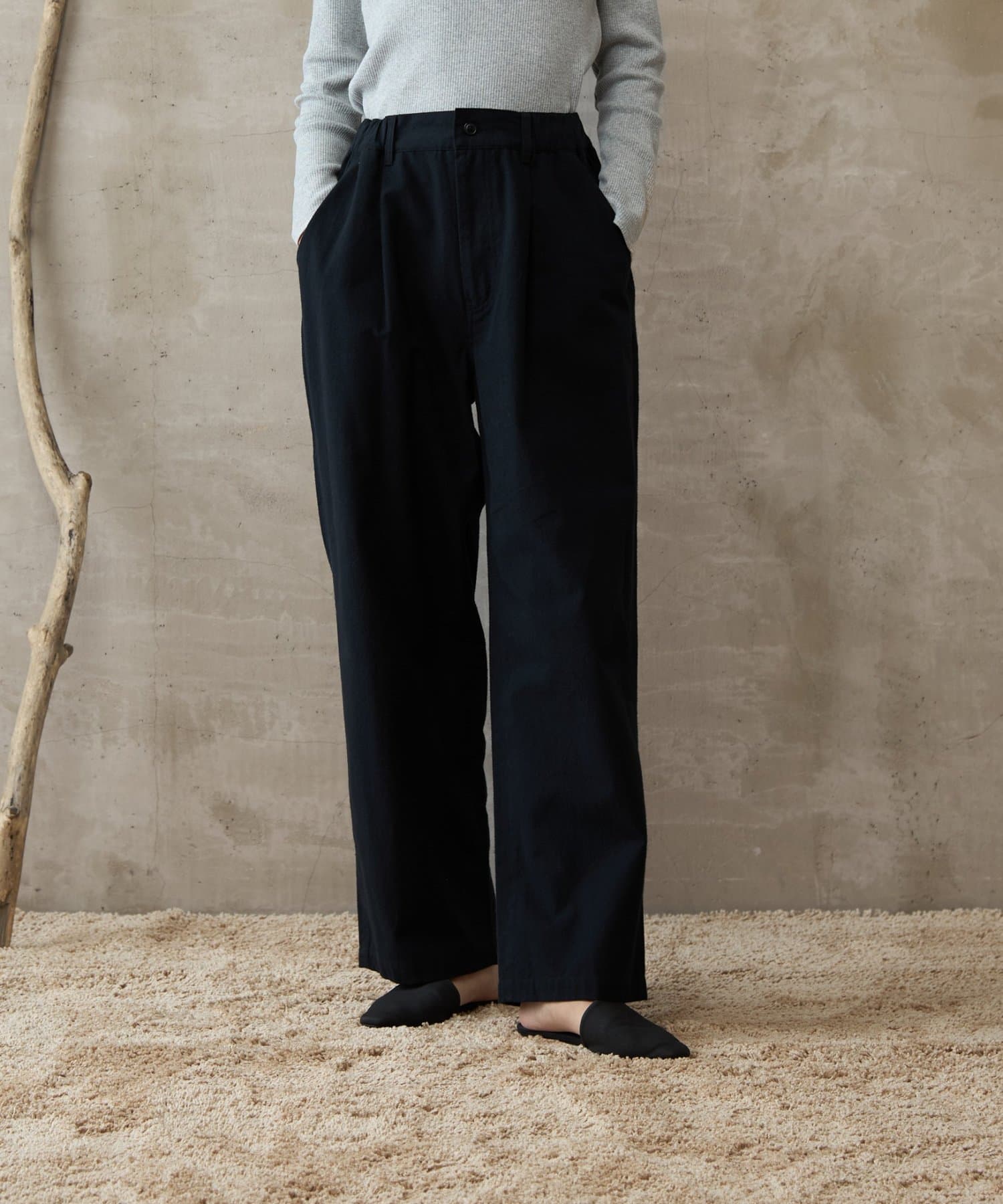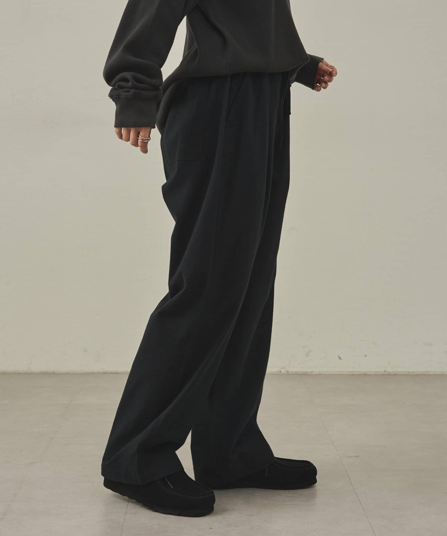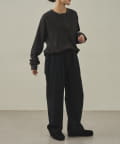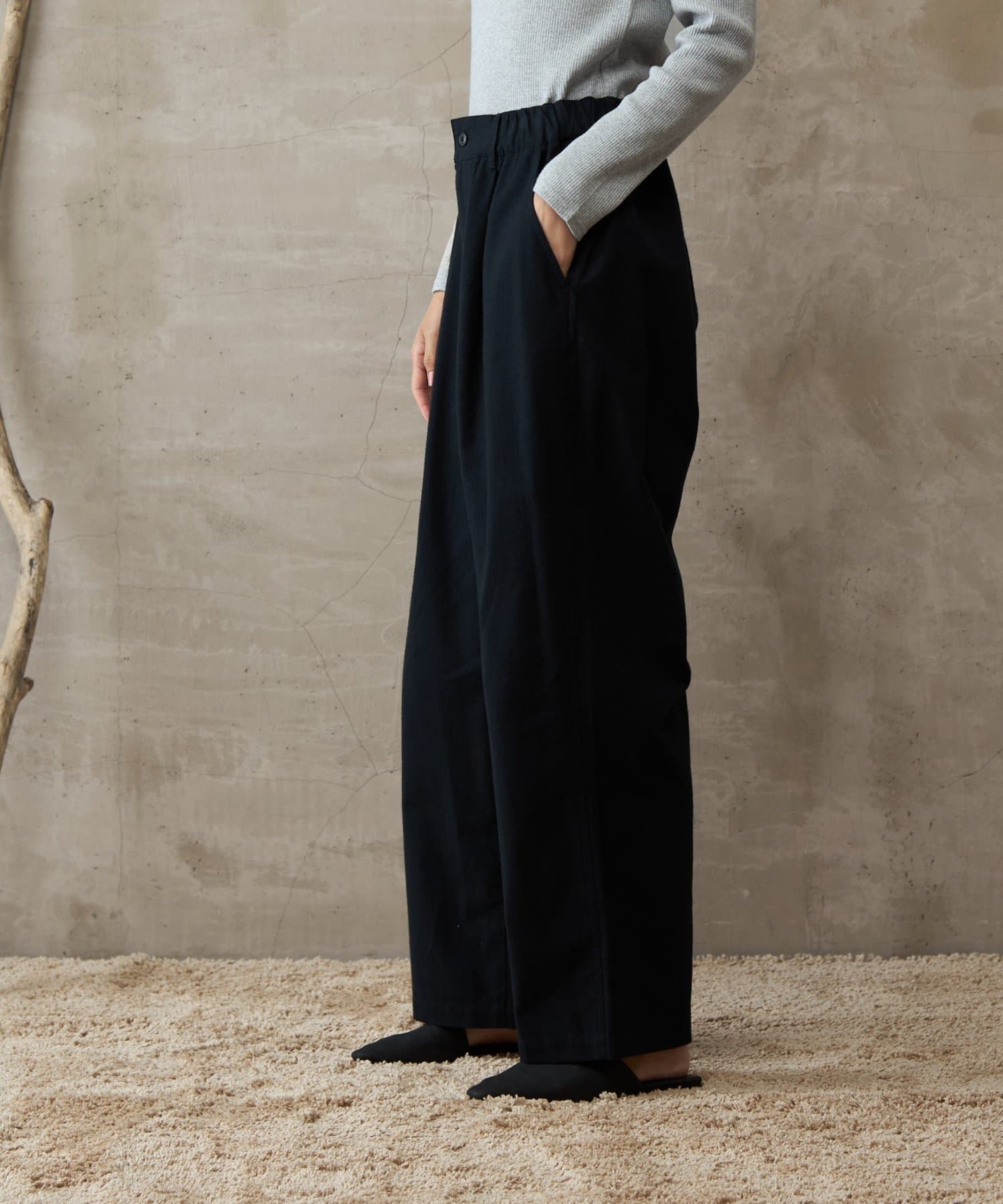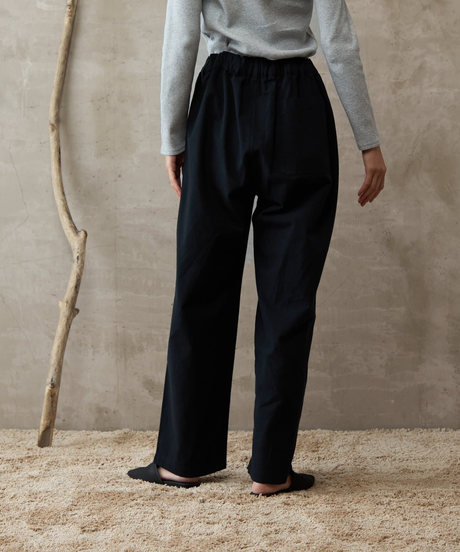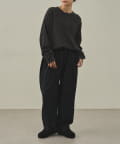 イージーパンツですが、裾が広がりすぎないキレイめなシルエットなので、そのまま穿いても、ウエストインしても、ルーズすぎず上品な印象で穿いていただけます。