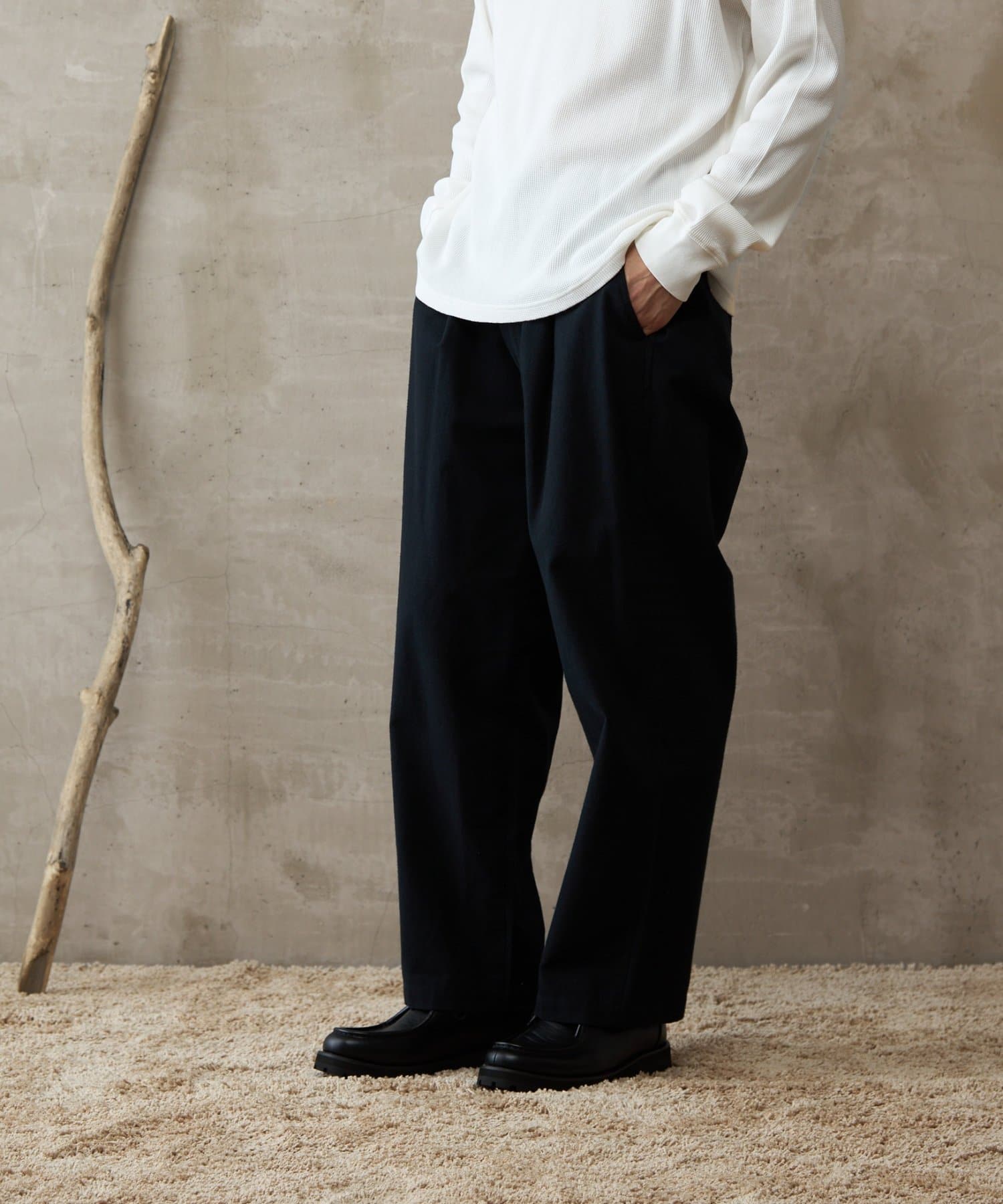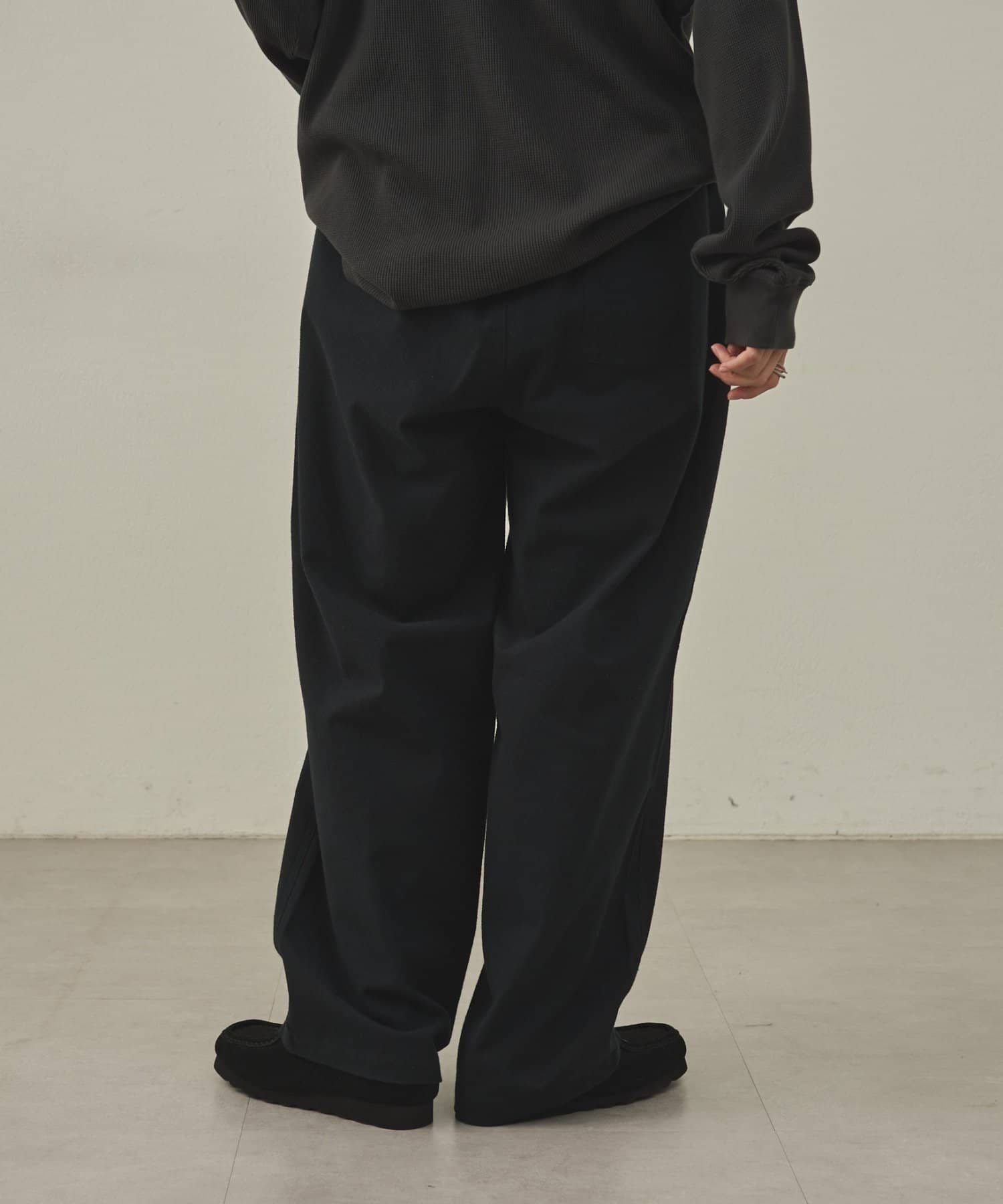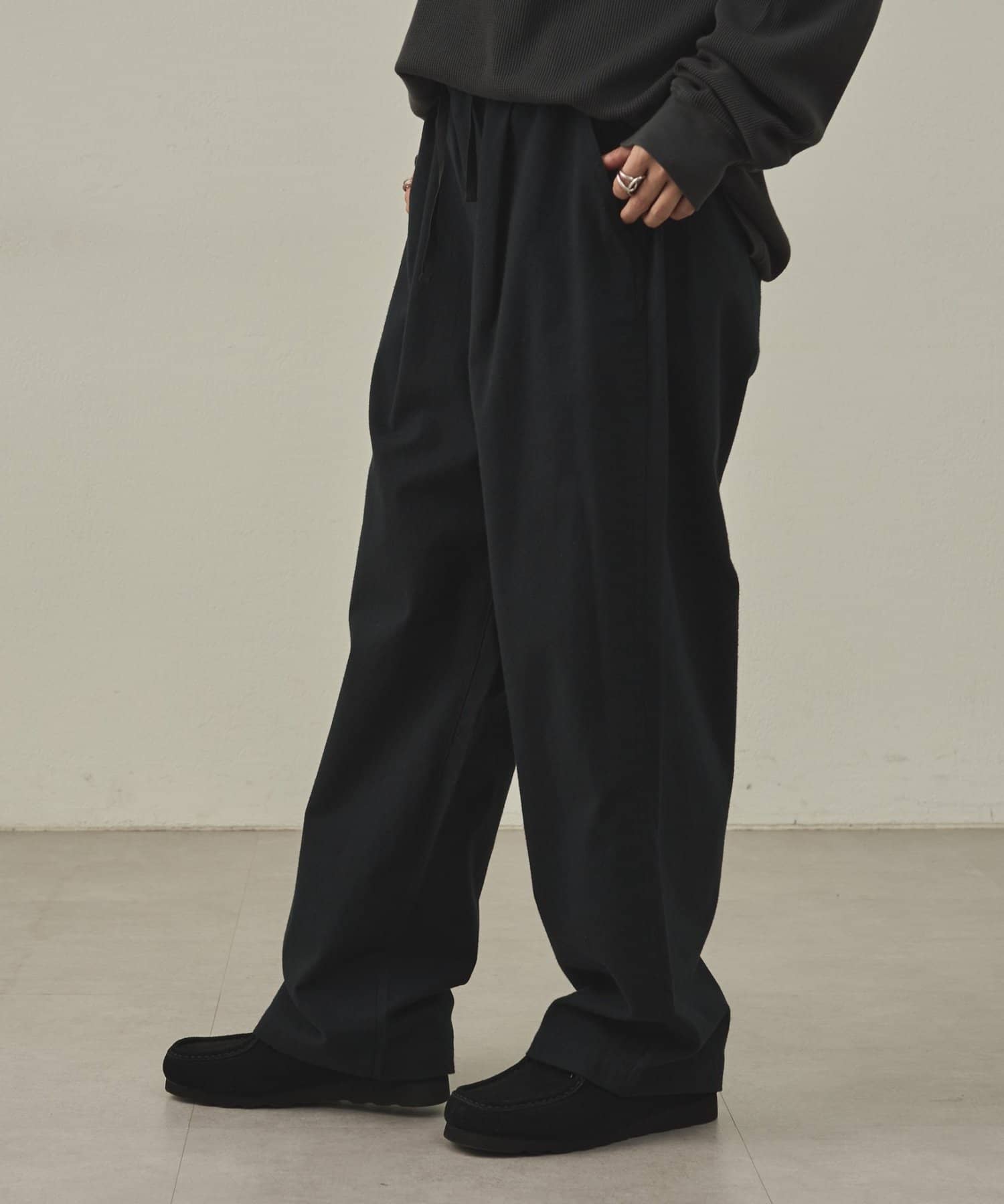 イージーパンツですが、裾が広がりすぎないキレイめなシルエットなので、そのまま穿いても、ウエストインしても、ルーズすぎず上品な印象で穿いていただけます。