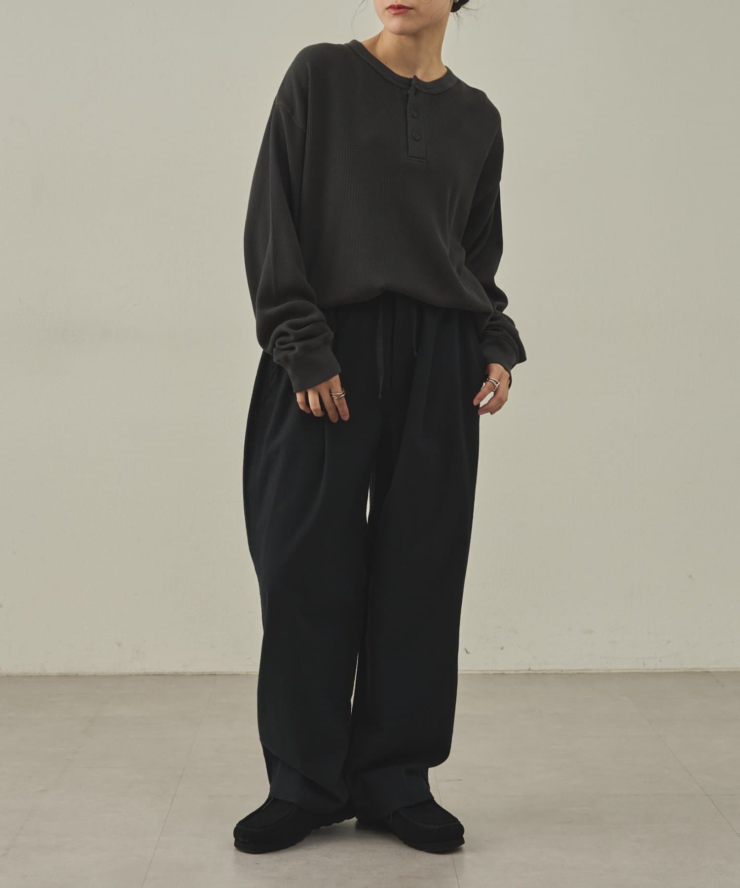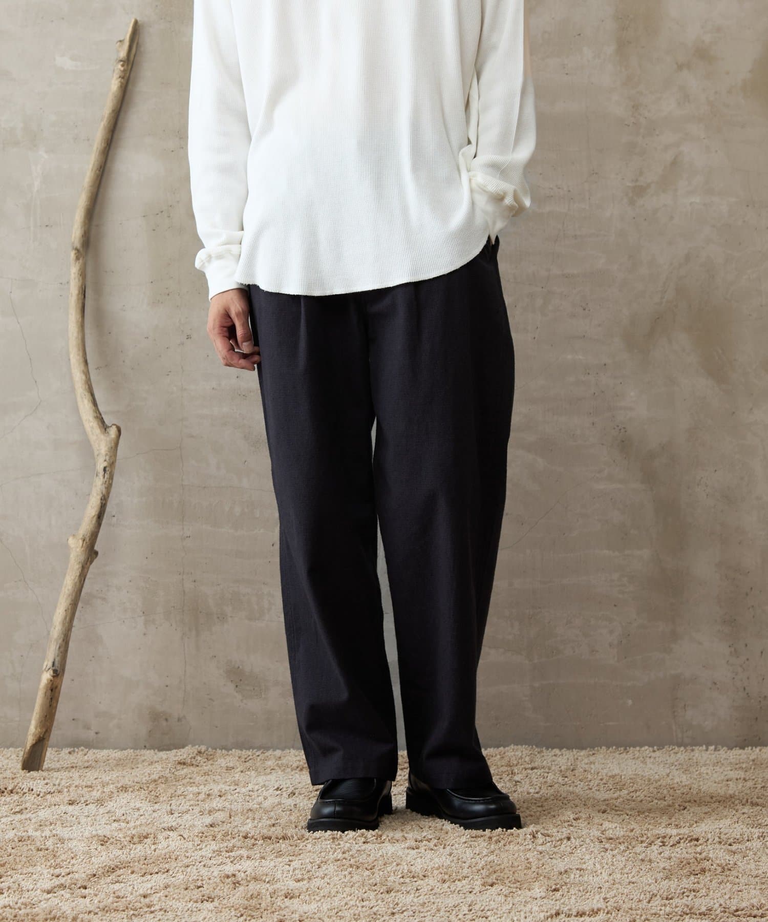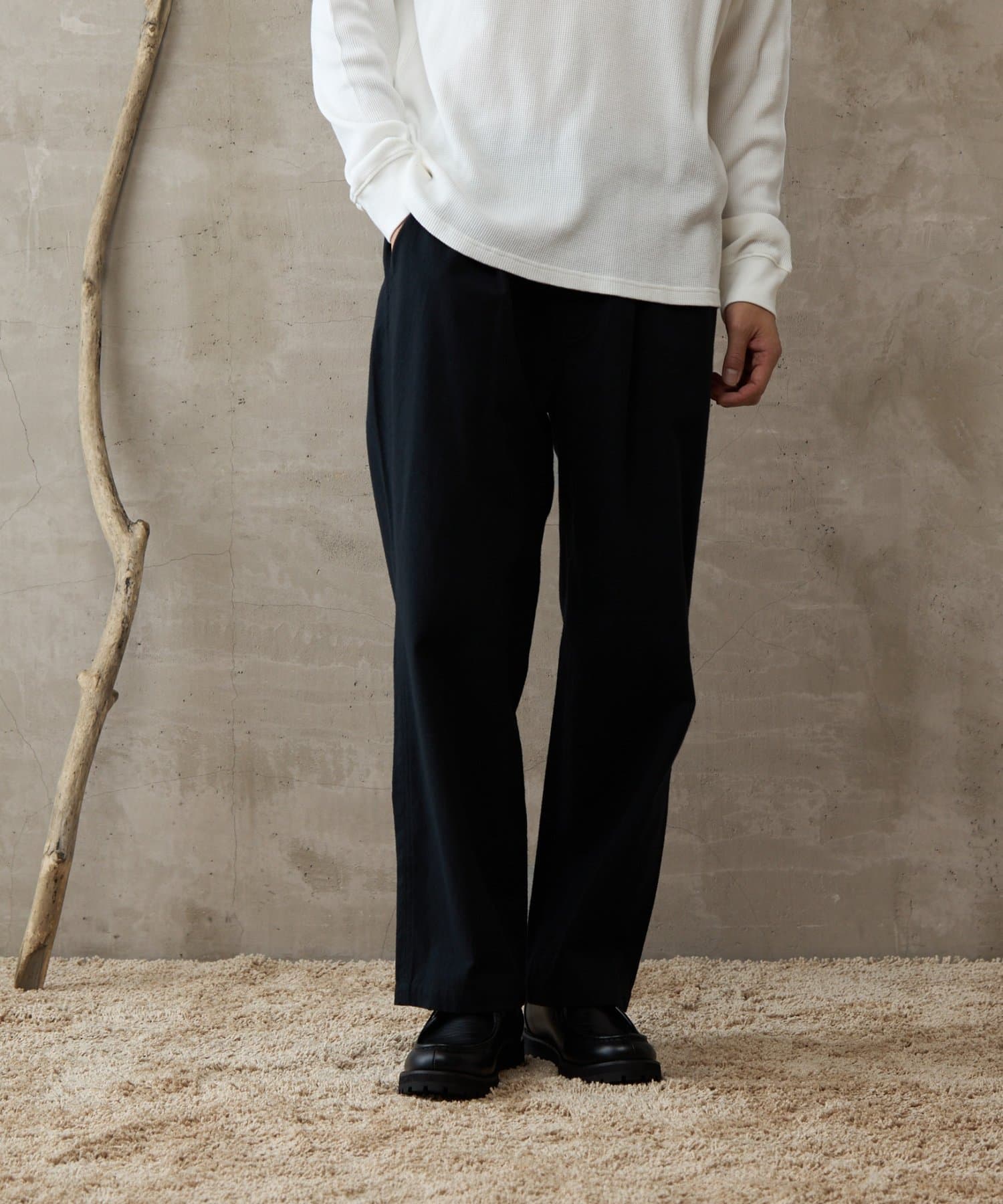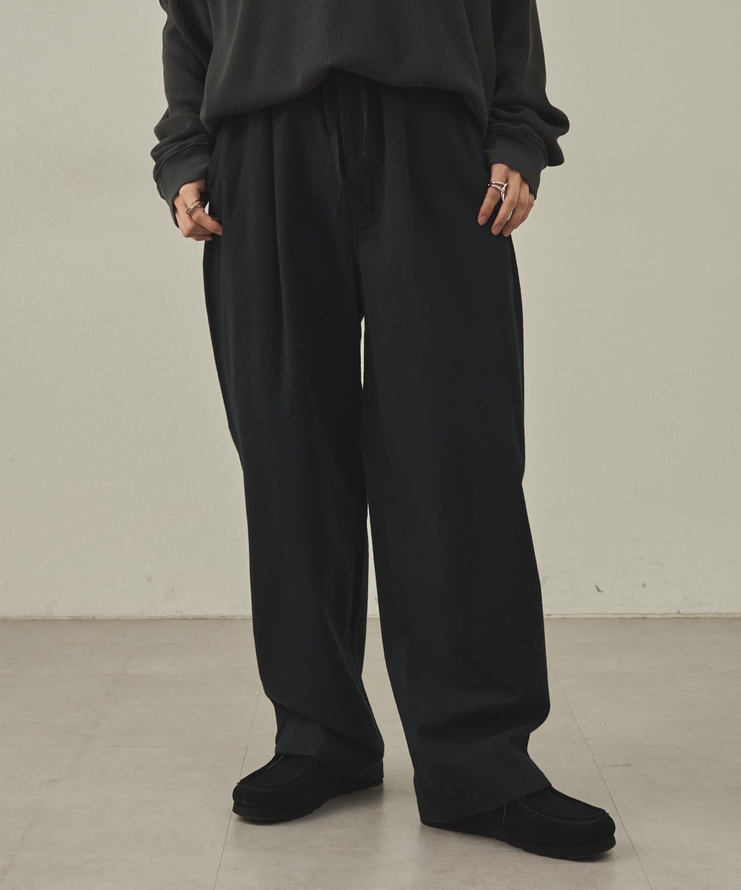 イージーパンツですが、裾が広がりすぎないキレイめなシルエットなので、そのまま穿いても、ウエストインしても、ルーズすぎず上品な印象で穿いていただけます。