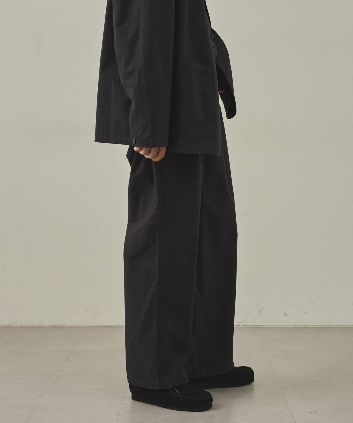 同素材のアイテムとセットアップとして合わせるスタイルもオススメです。