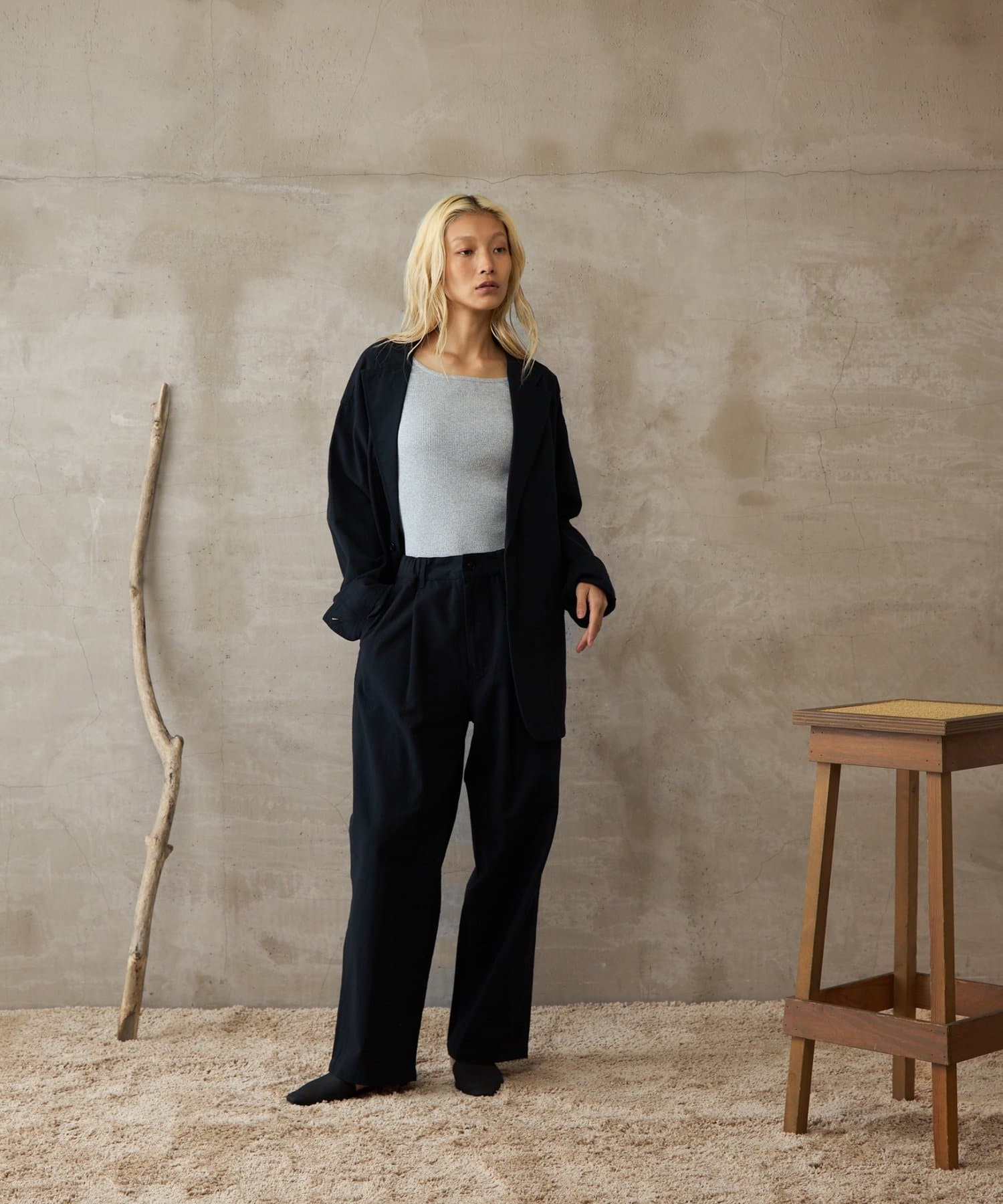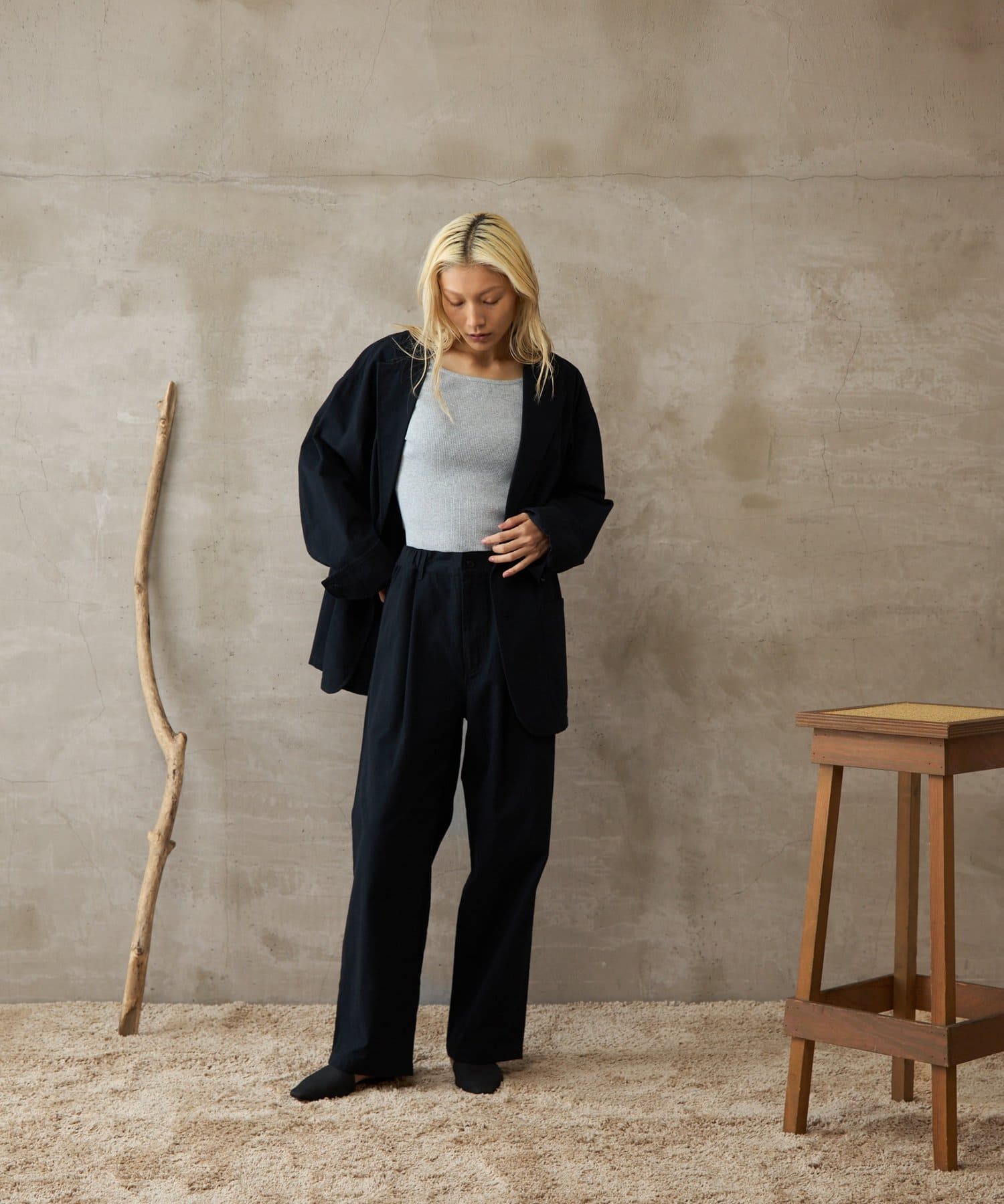 同素材のアイテムとセットアップとして合わせるのもおすすめです。