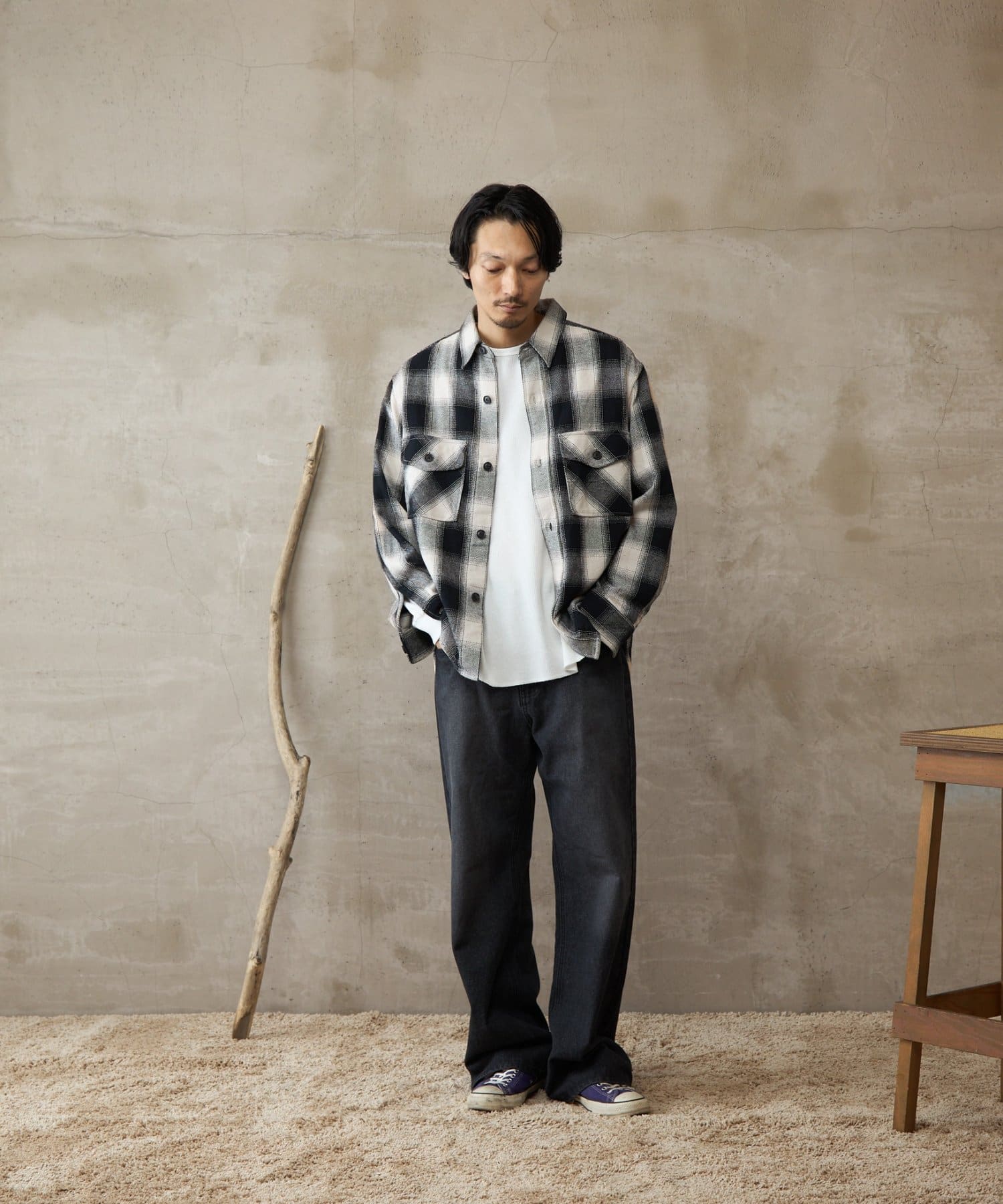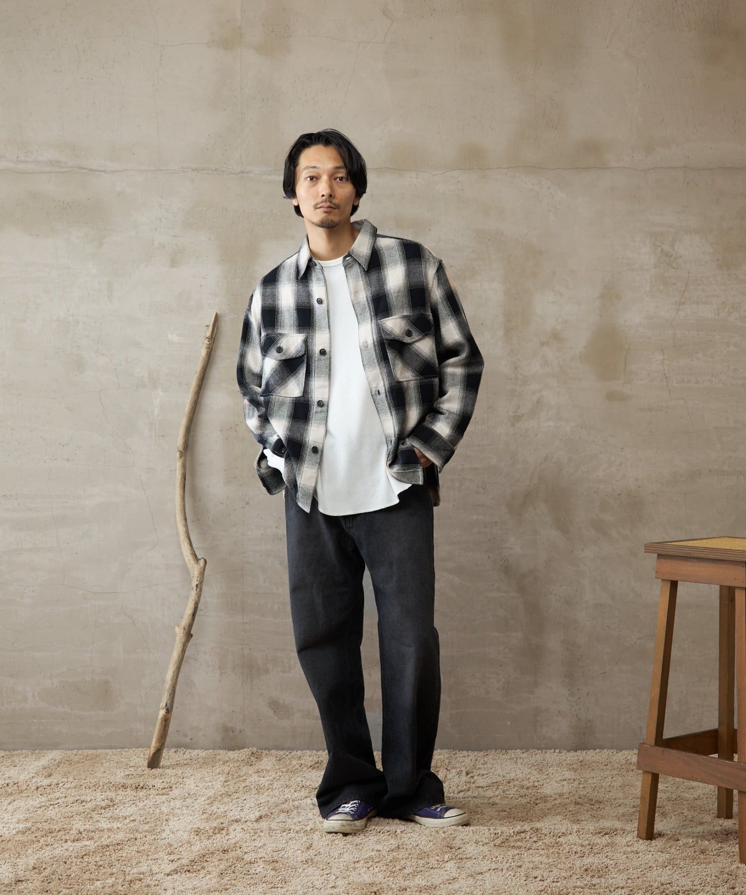 ほっこりしがちなチェックネルをアイボリーとブラックで構成された大人で暖かみもありながら都会的な表情に仕上げました。
