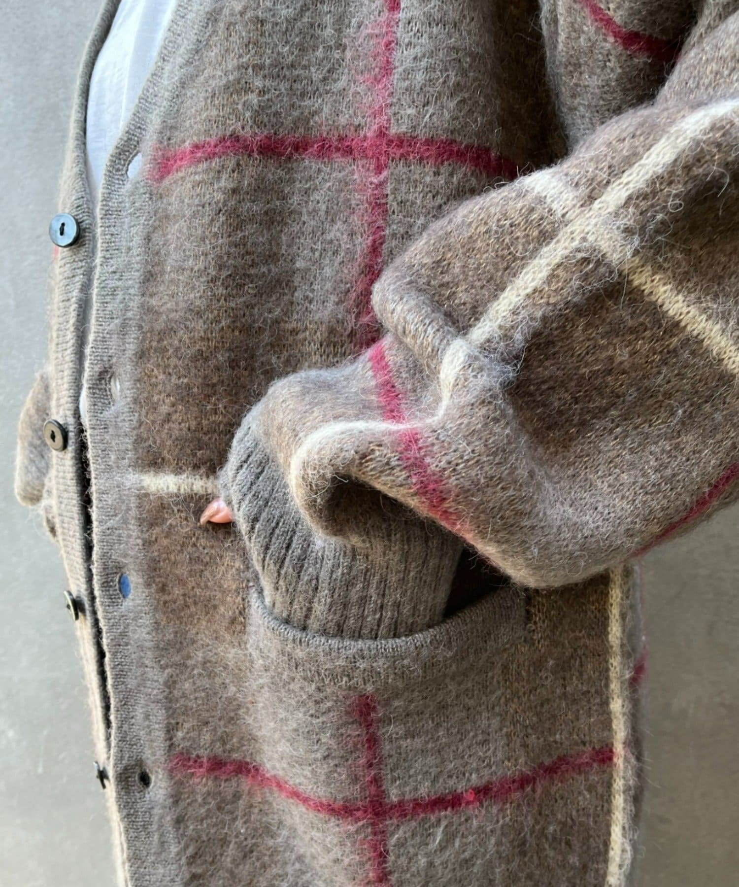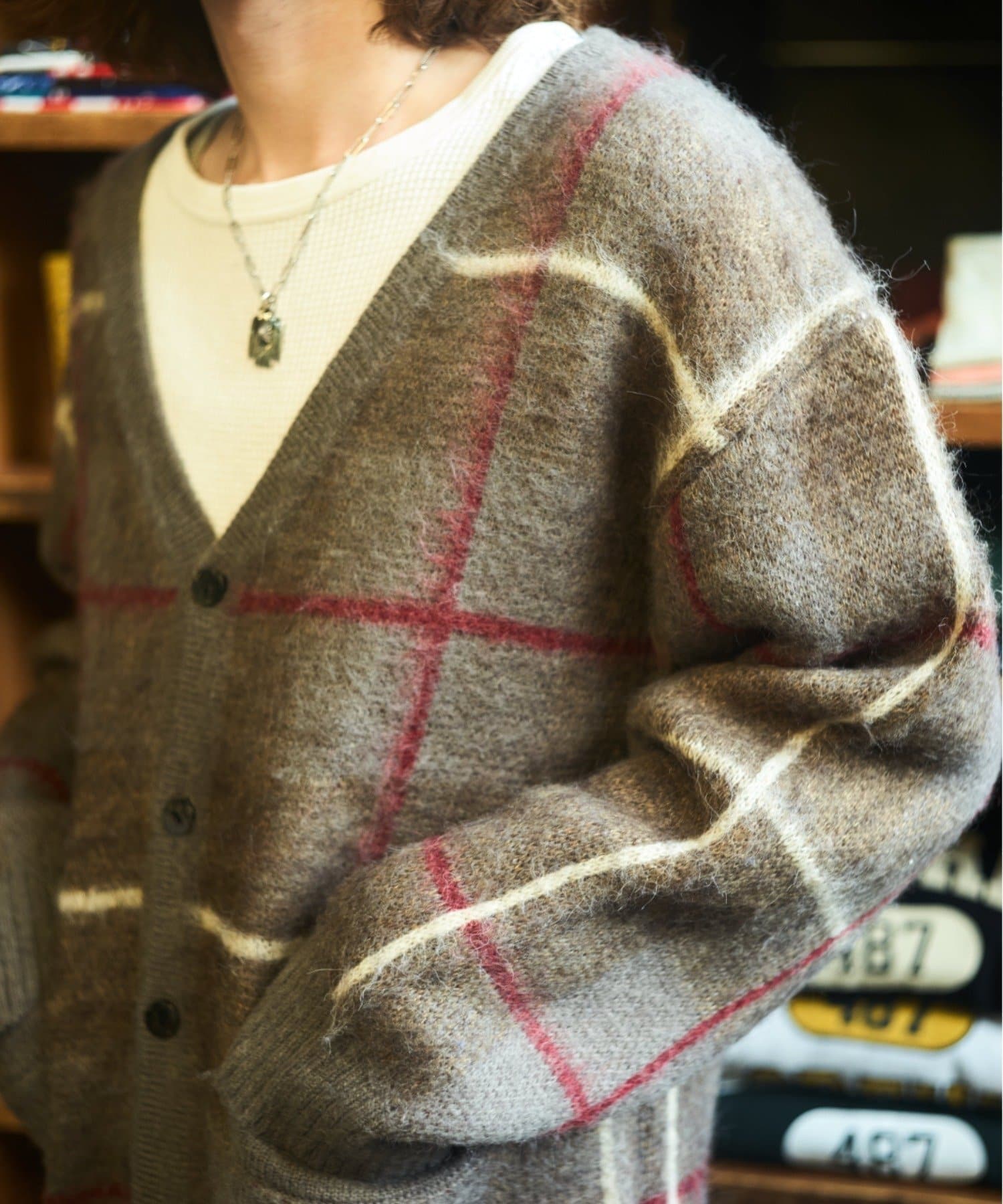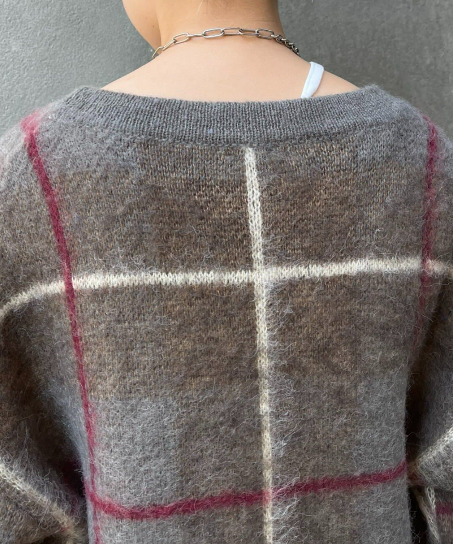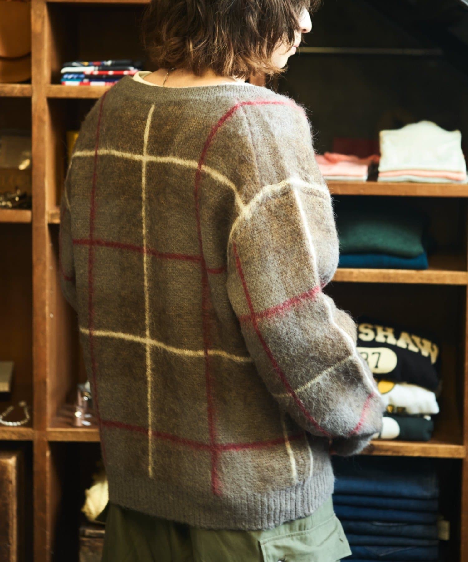 “60年代の古着ニット風”レトロなチェック柄のモヘアカーディガン