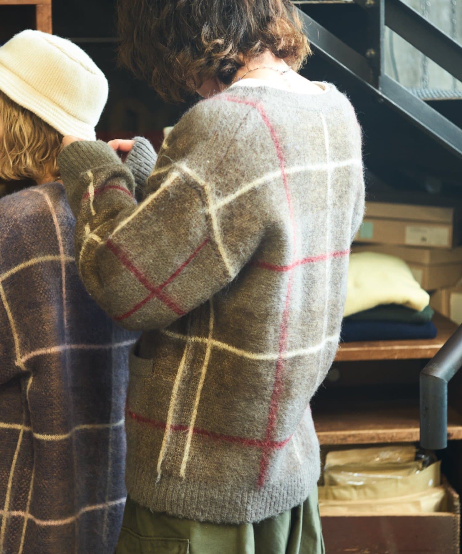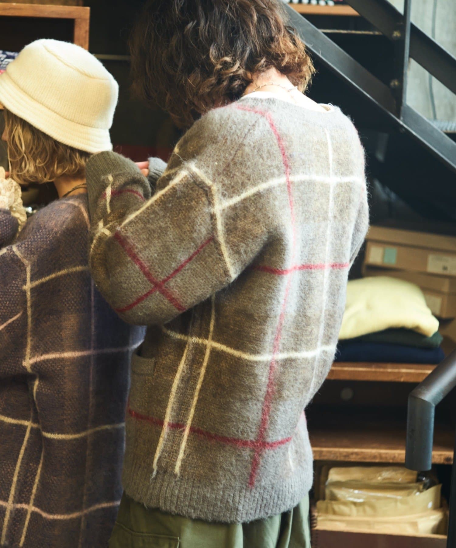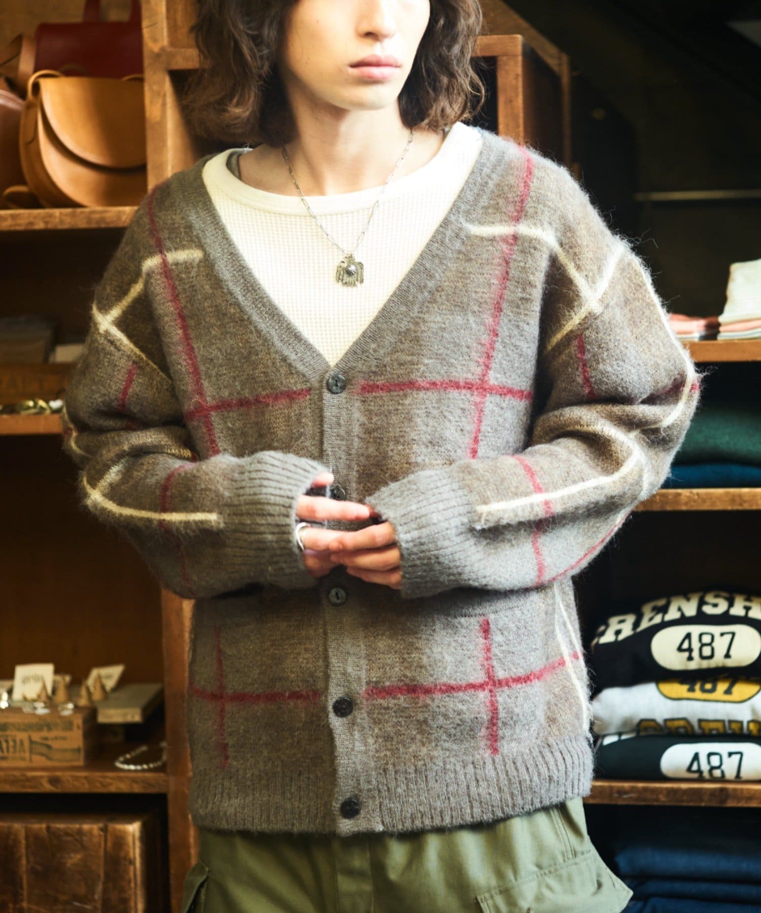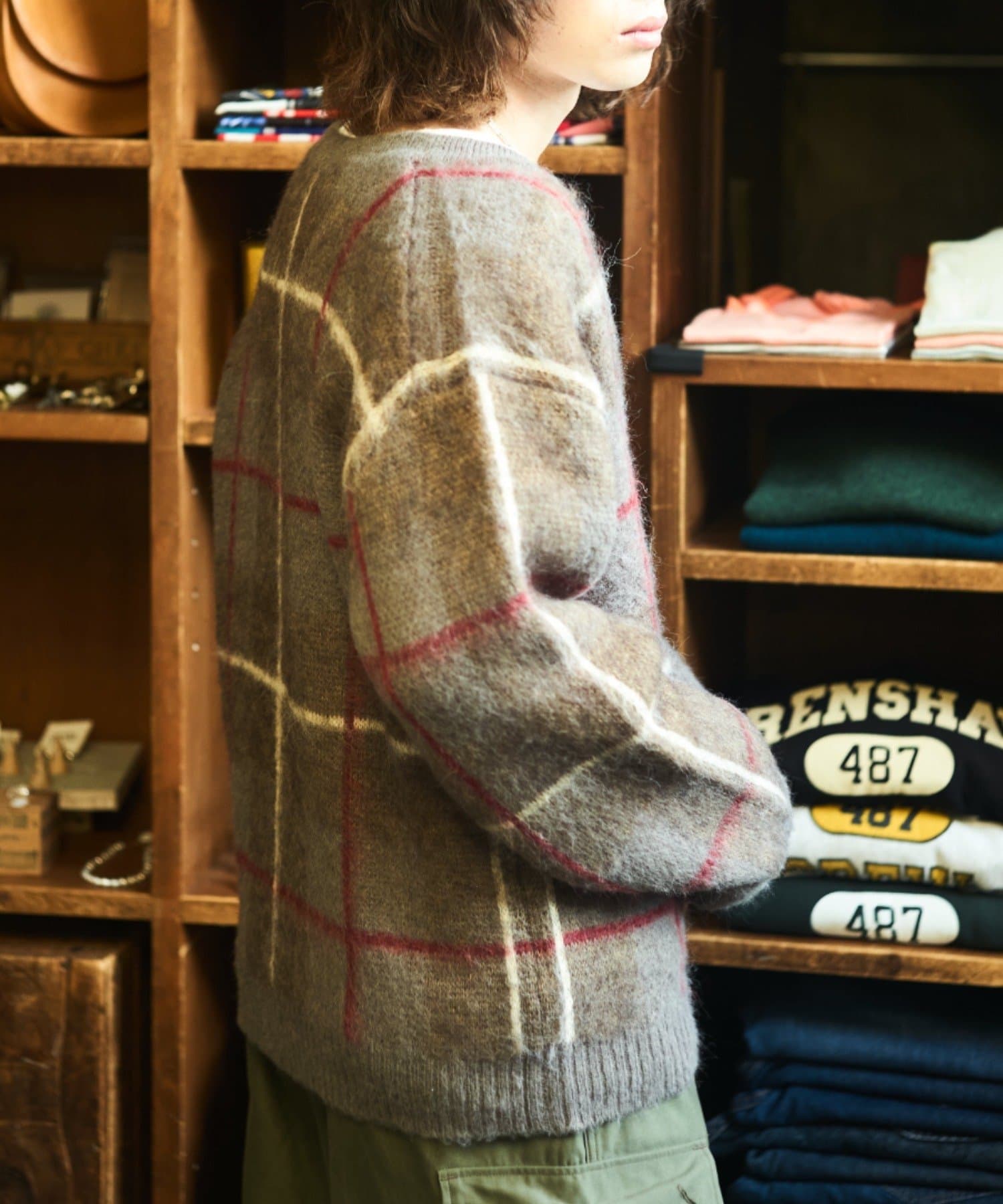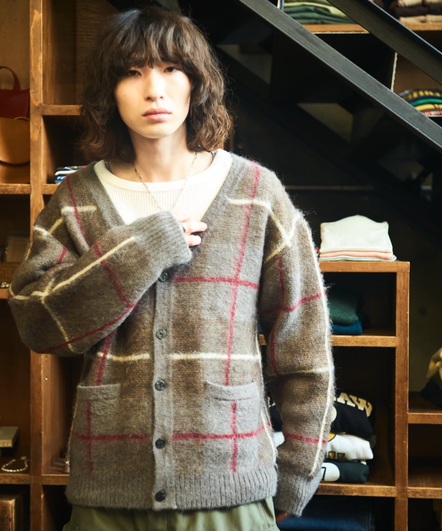 “60年代の古着ニット風”レトロなチェック柄のモヘアカーディガン