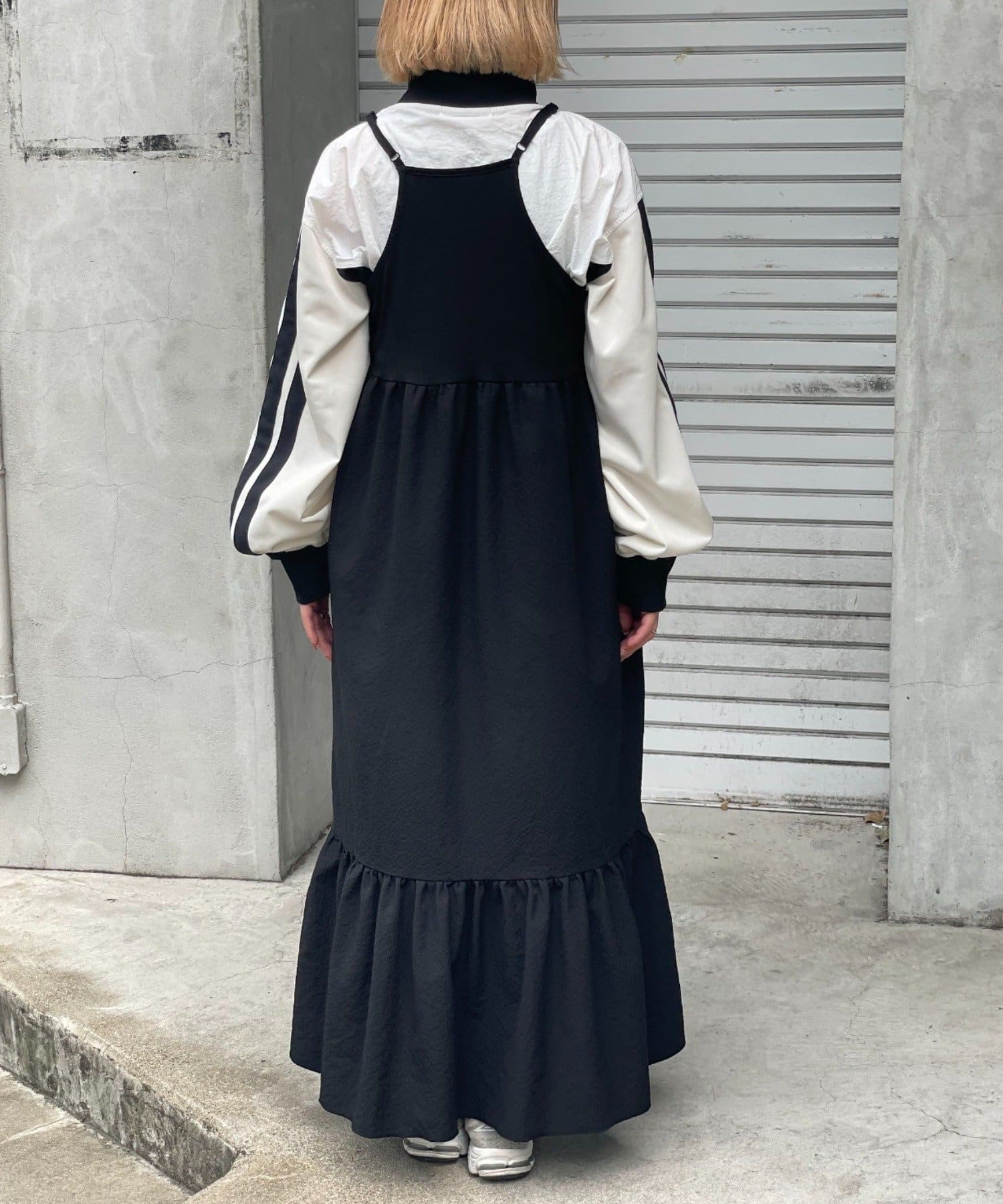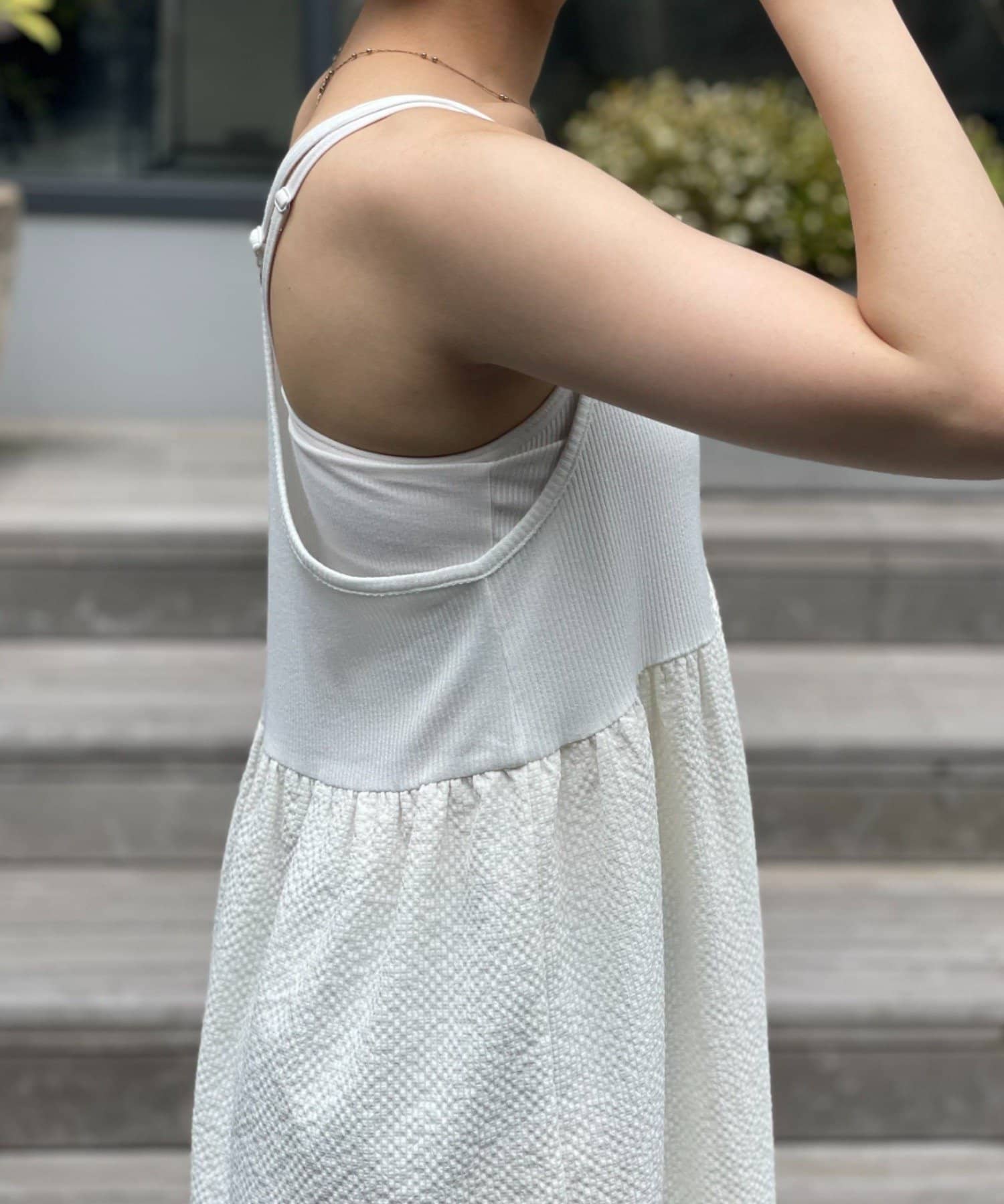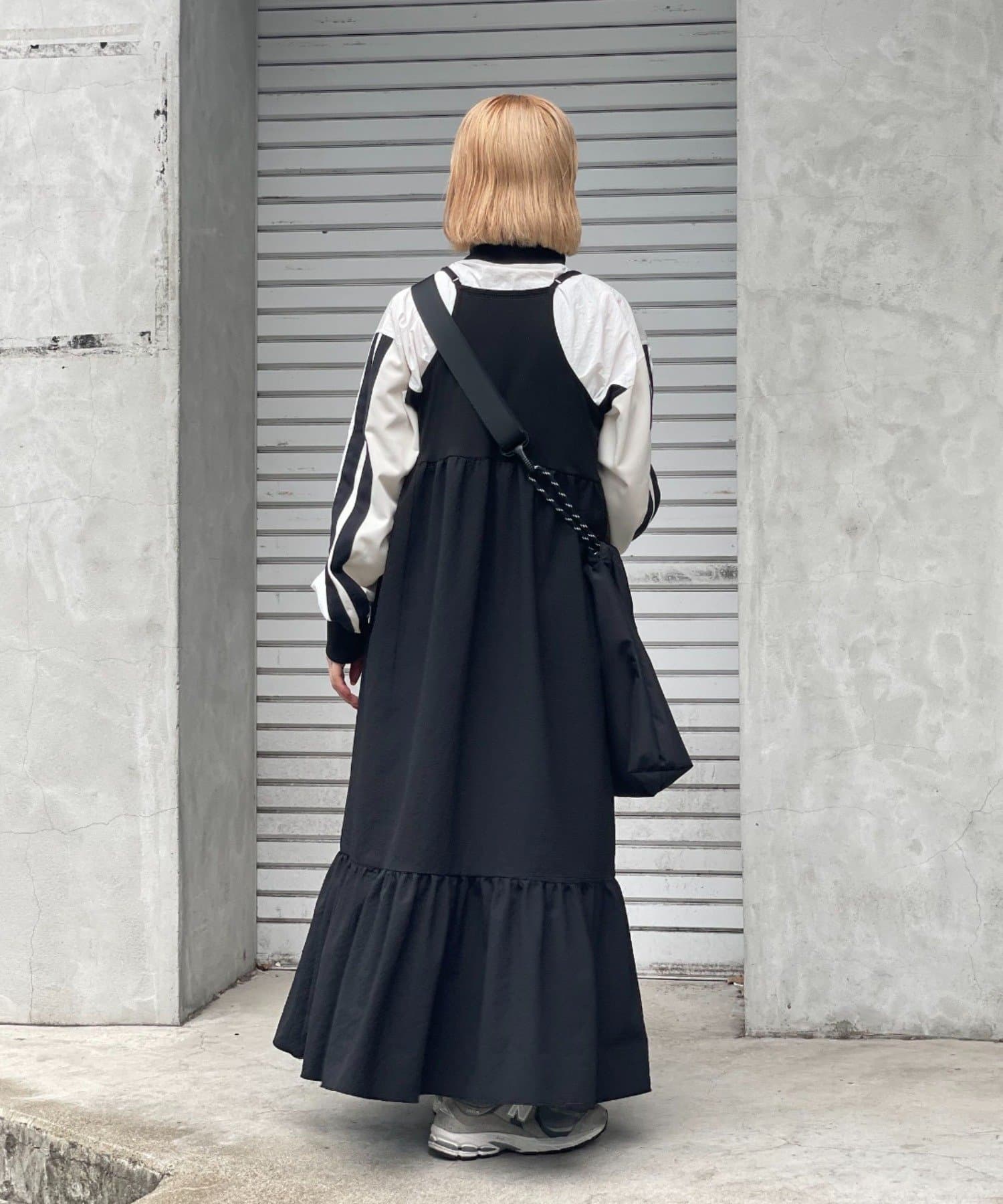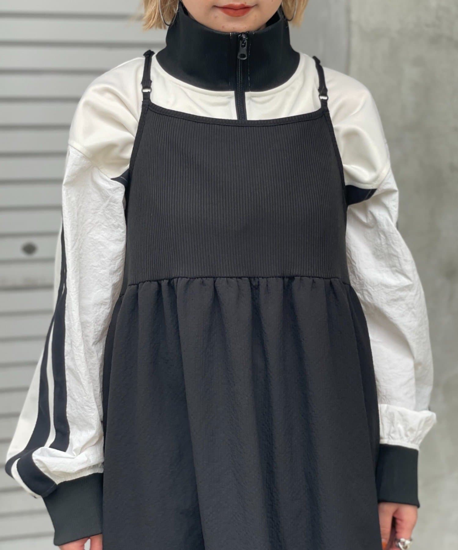 肩紐で着丈の長さうぃ調節できるので、低身長、高身長の方選ばず着用できます。バストがリブ素材なので伸縮性があり程よいフィット感でリラックスした着心地です。軽量でふわっと広がるシルエットがガーリーな雰囲気満載です◎