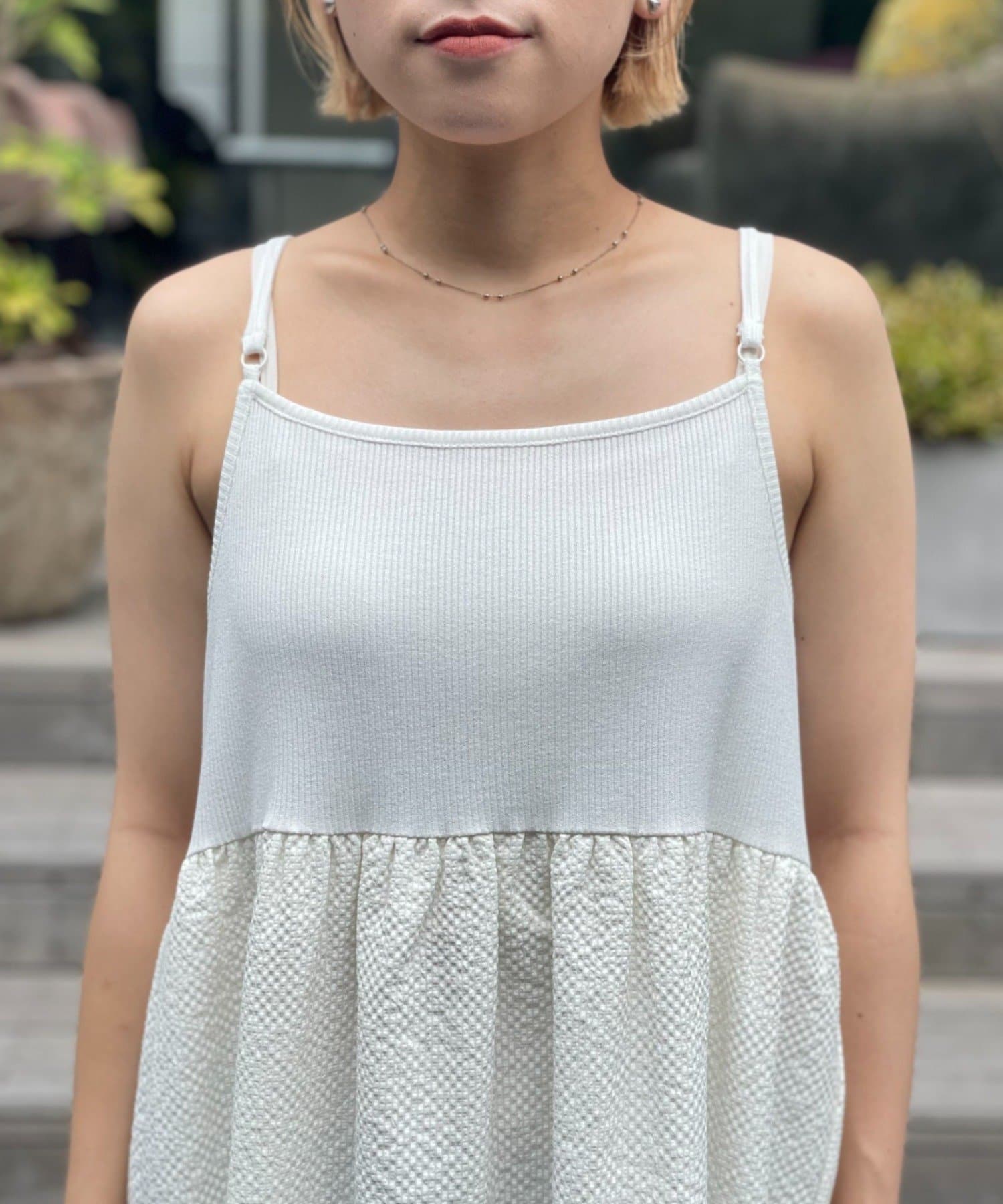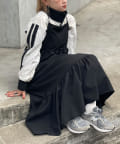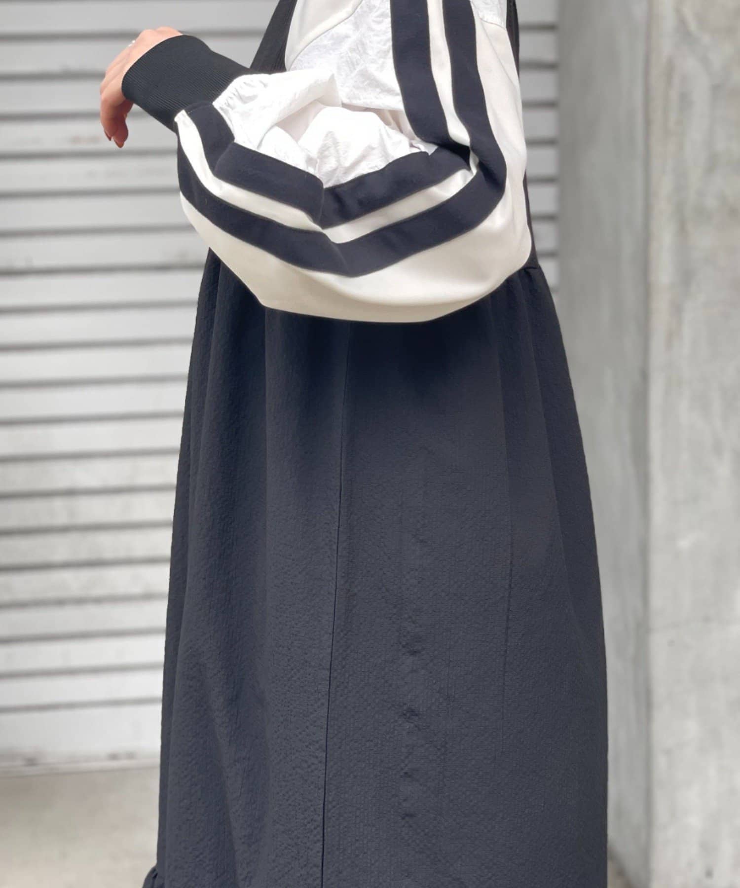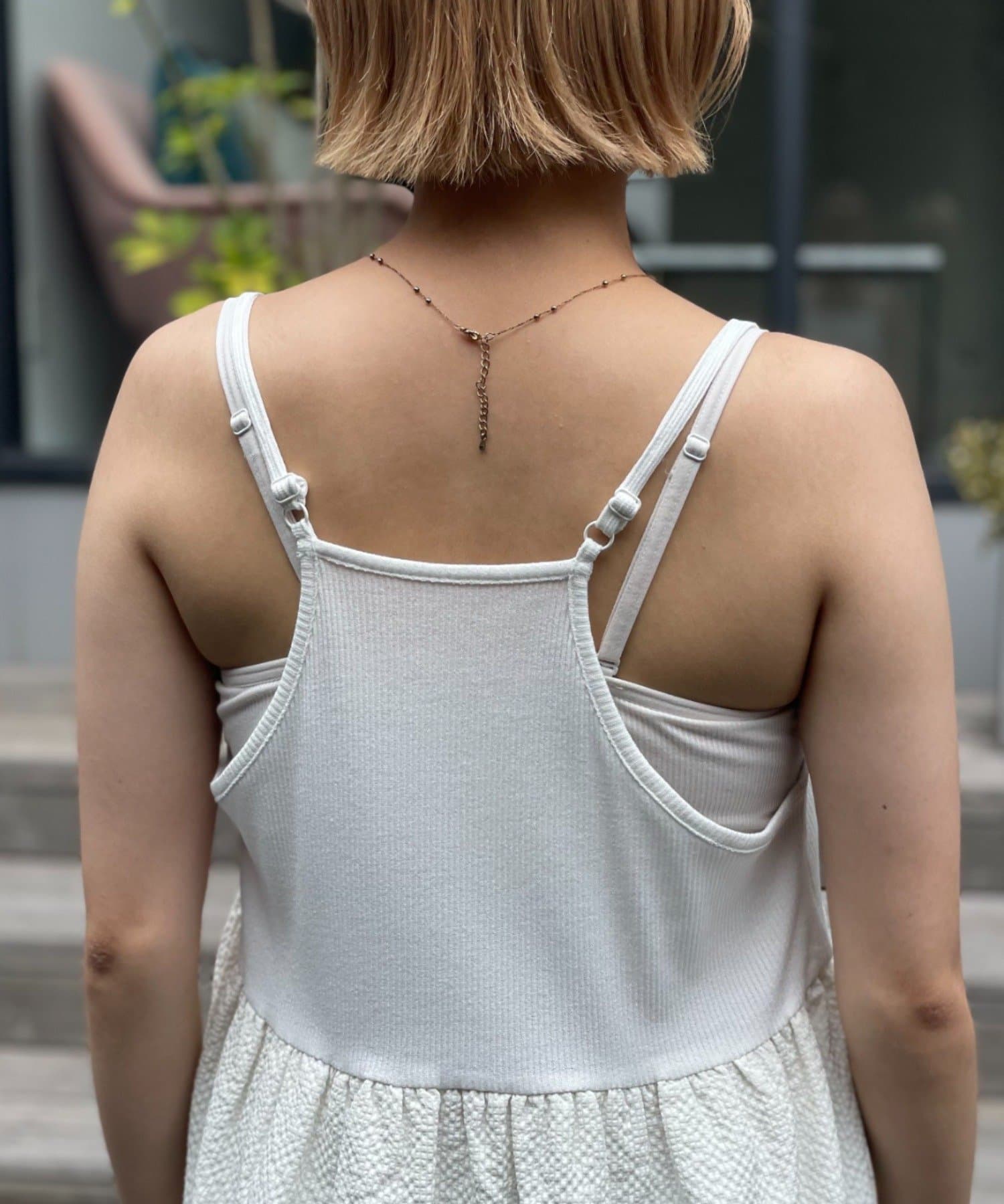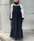 肩紐で着丈の長さうぃ調節できるので、低身長、高身長の方選ばず着用できます。バストがリブ素材なので伸縮性があり程よいフィット感でリラックスした着心地です。軽量でふわっと広がるシルエットがガーリーな雰囲気満載です◎