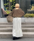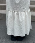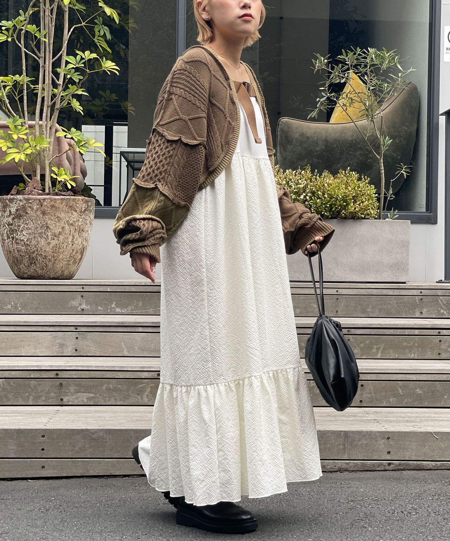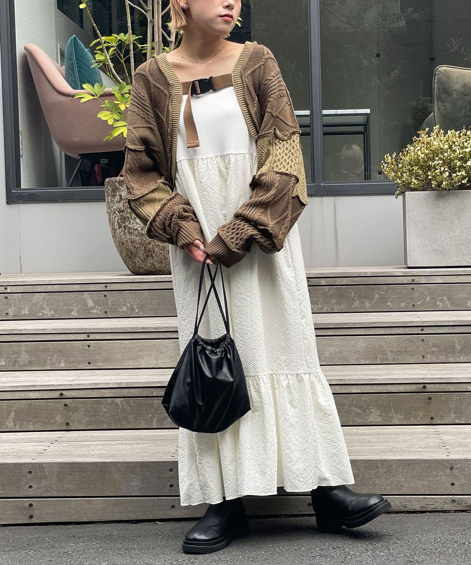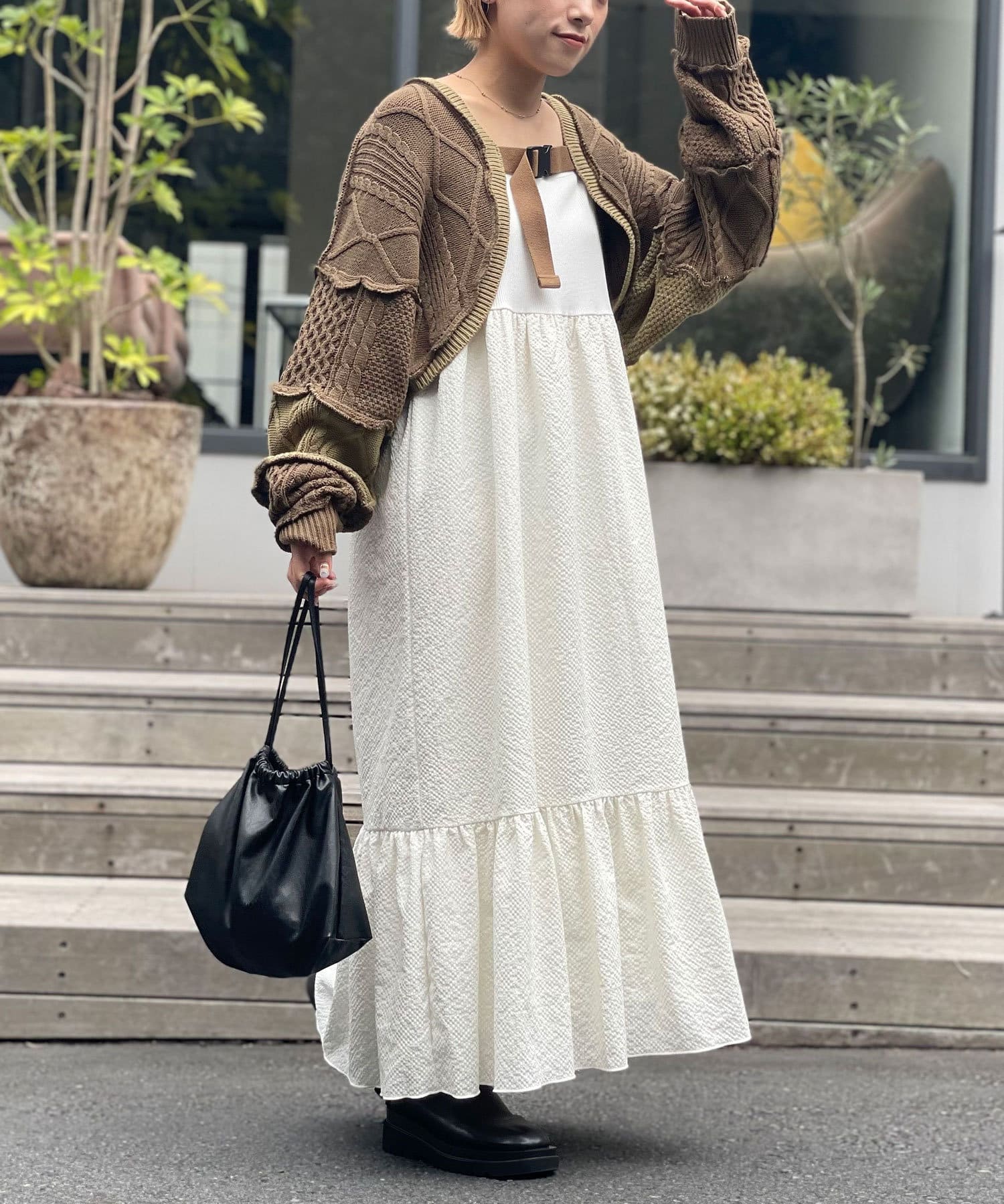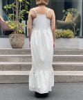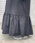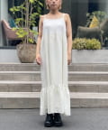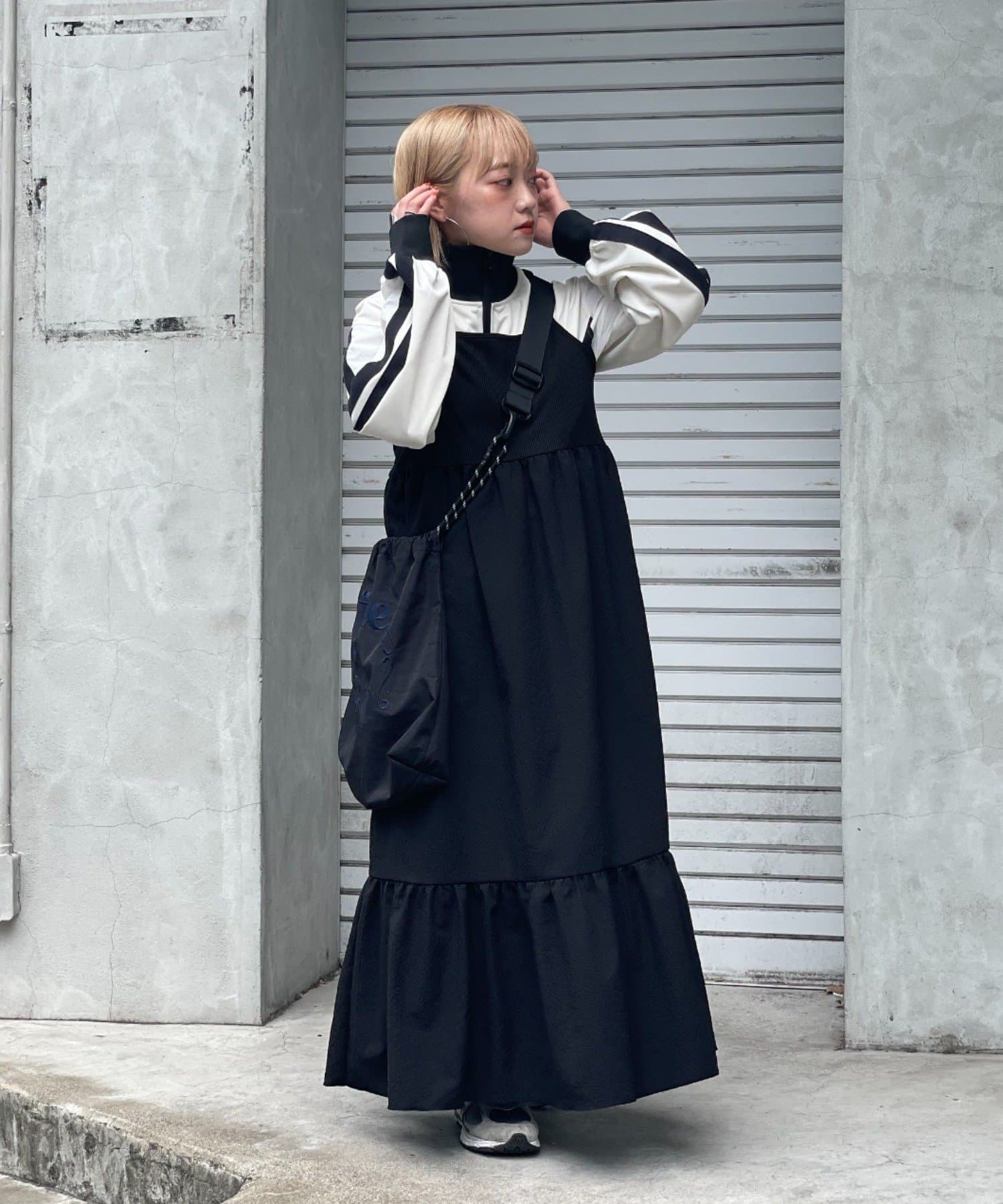 肩紐で着丈の長さうぃ調節できるので、低身長、高身長の方選ばず着用できます。バストがリブ素材なので伸縮性があり程よいフィット感でリラックスした着心地です。軽量でふわっと広がるシルエットがガーリーな雰囲気満載です◎