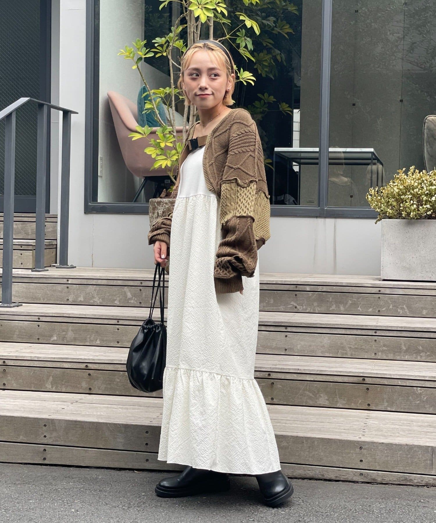 白いキャミワンピ。すその部分が切り替えのように程よくふんわりして、でも甘すぎないので、大人女子でも気遅れせずにかわいく着れます。生地も柔らかく着心地も良いです。はやりの短めのカーディガンなどと合わせたらすごくかわいいです。