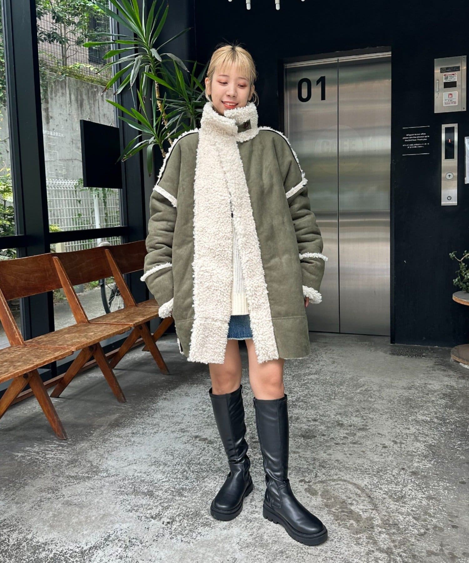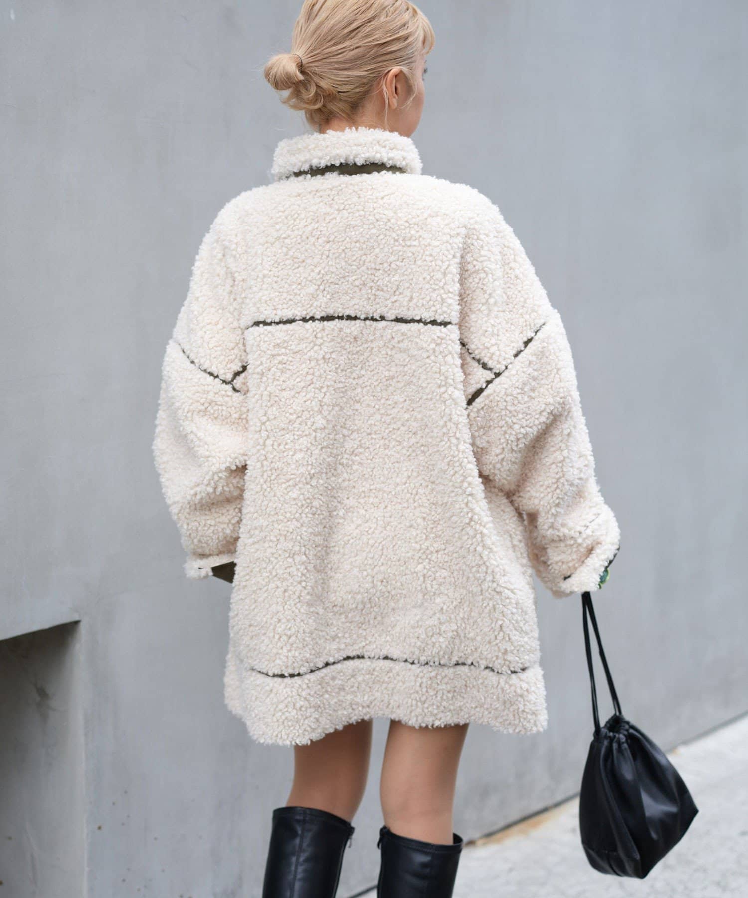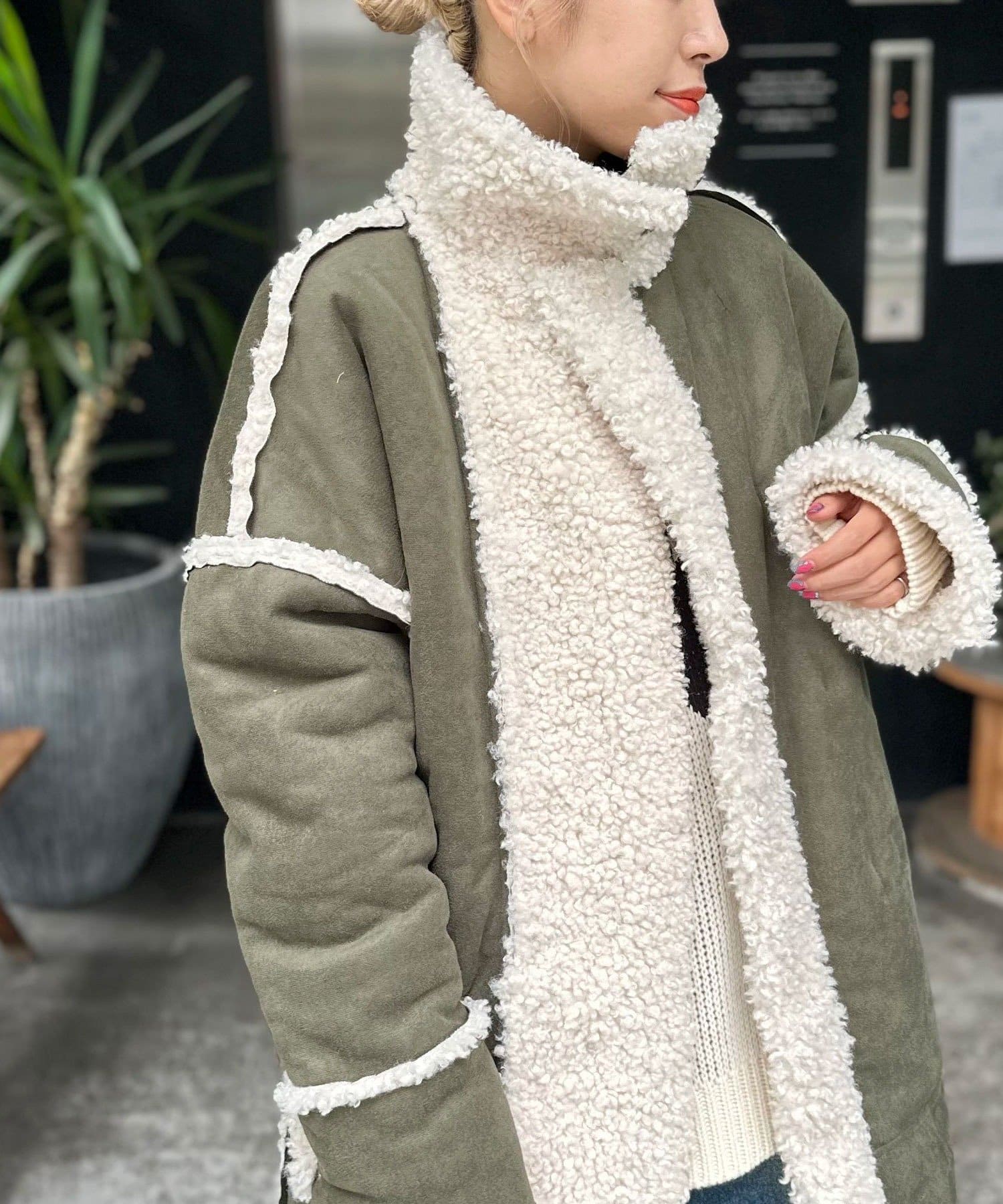 ヒップまですっぽりと覆う着丈に指先まで隠れる袖丈です。マフラーいらずで着用できるスタンドカラーなのも嬉しいポイントです◎軽量で厚手のニットもごわつかずに着用できるサイズ感なので真冬も快適に過ごせます!リバーシブルのスエードはボアよりも大人っぽいきれいめカジュアルで着用できます!