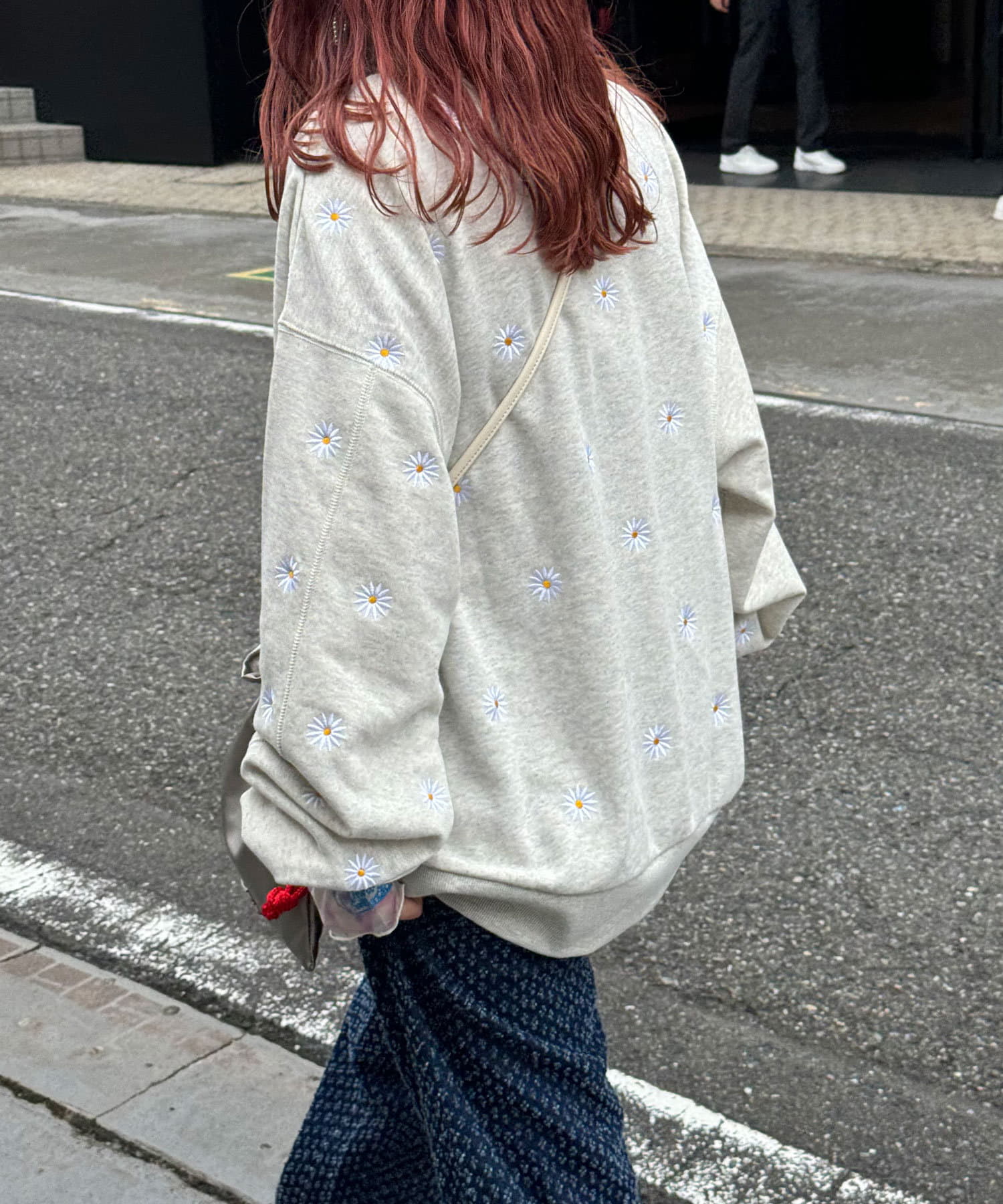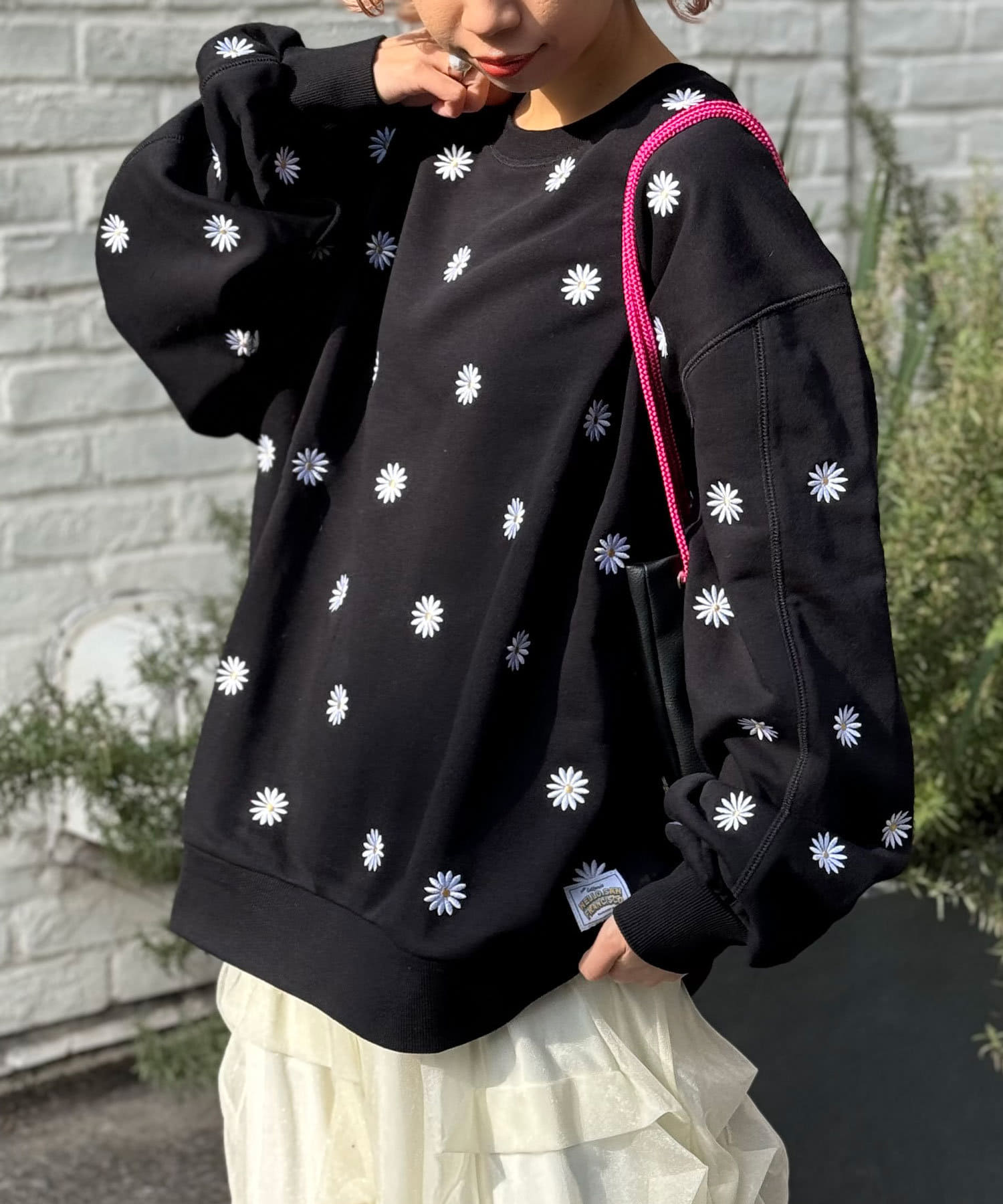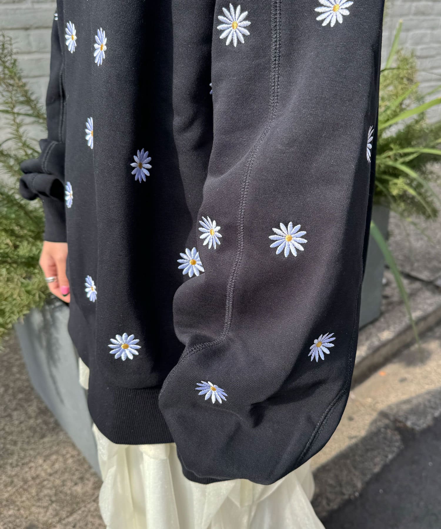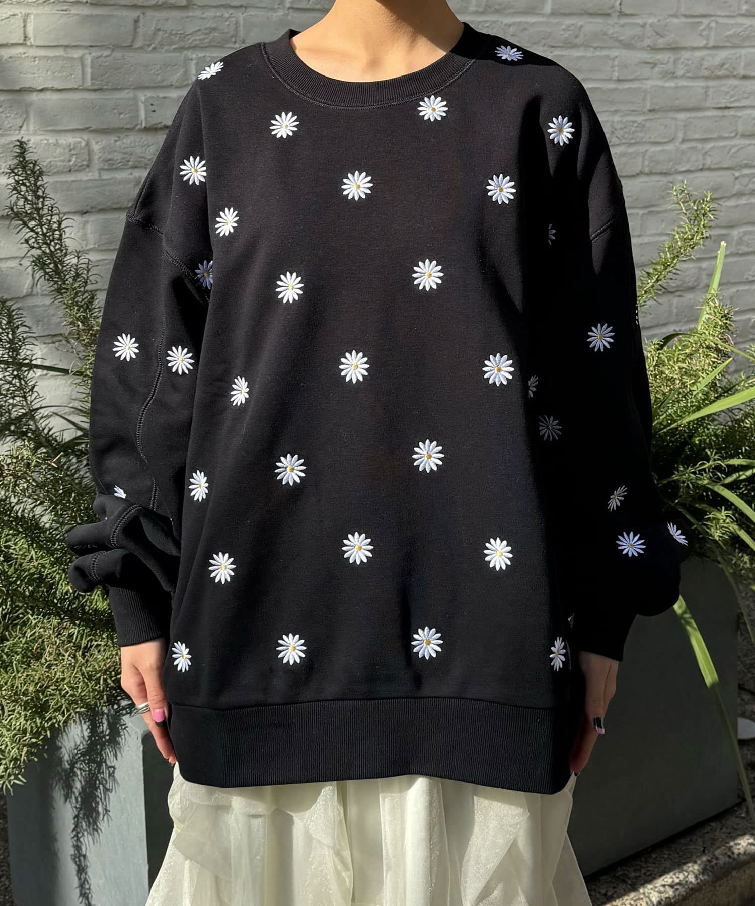 マーガレット刺繍が全体に散りばめられたオーバーサイズスウェット。