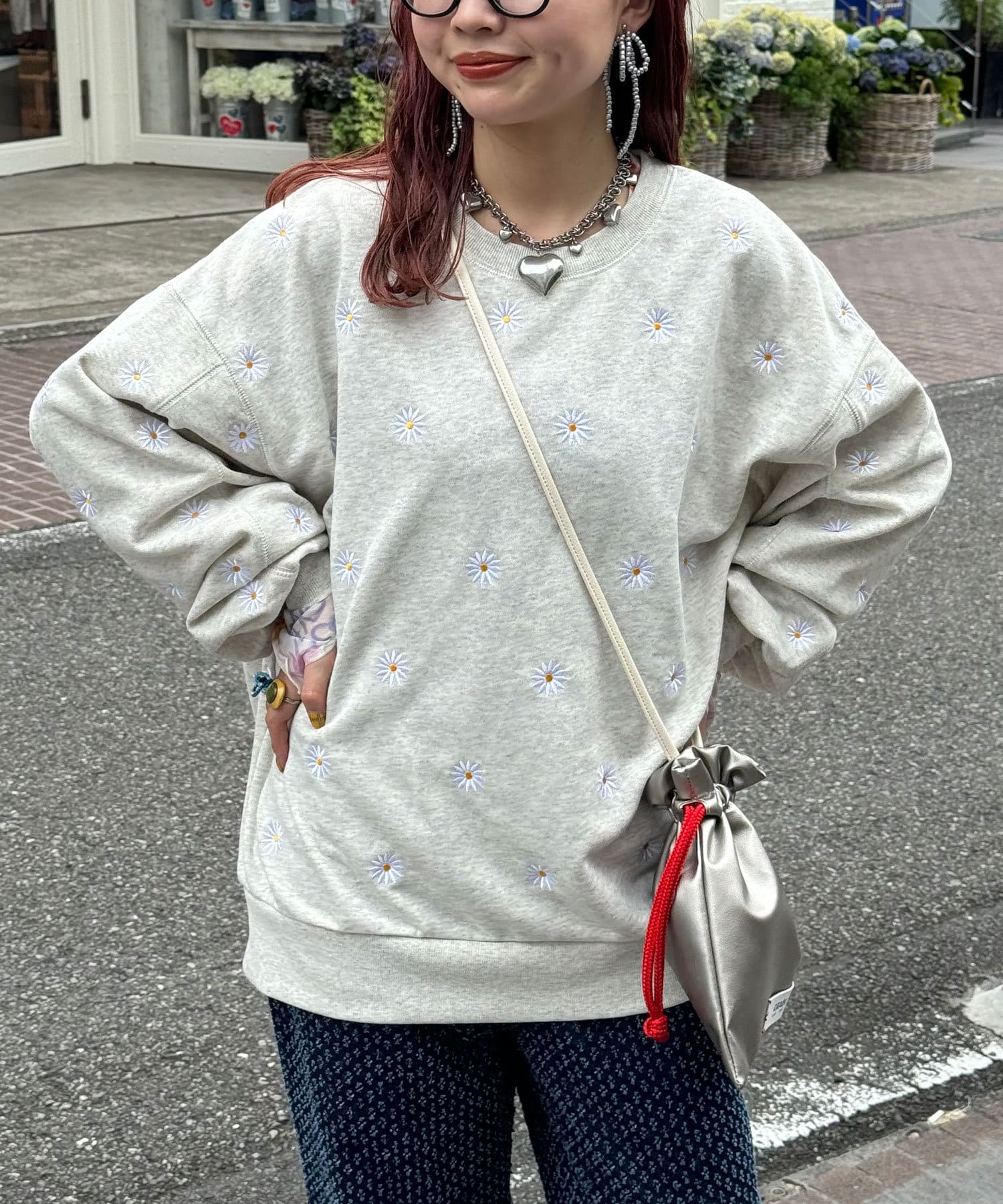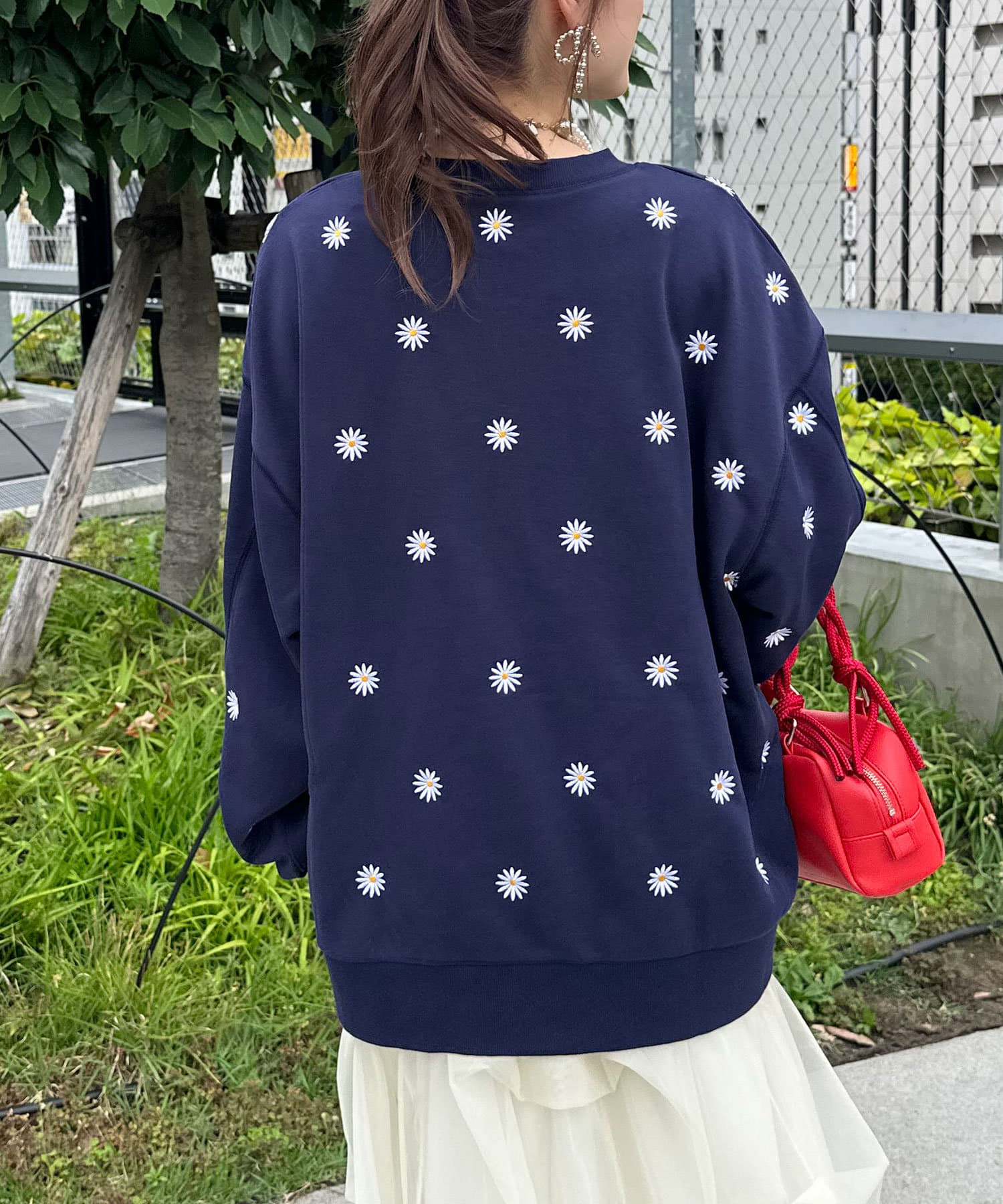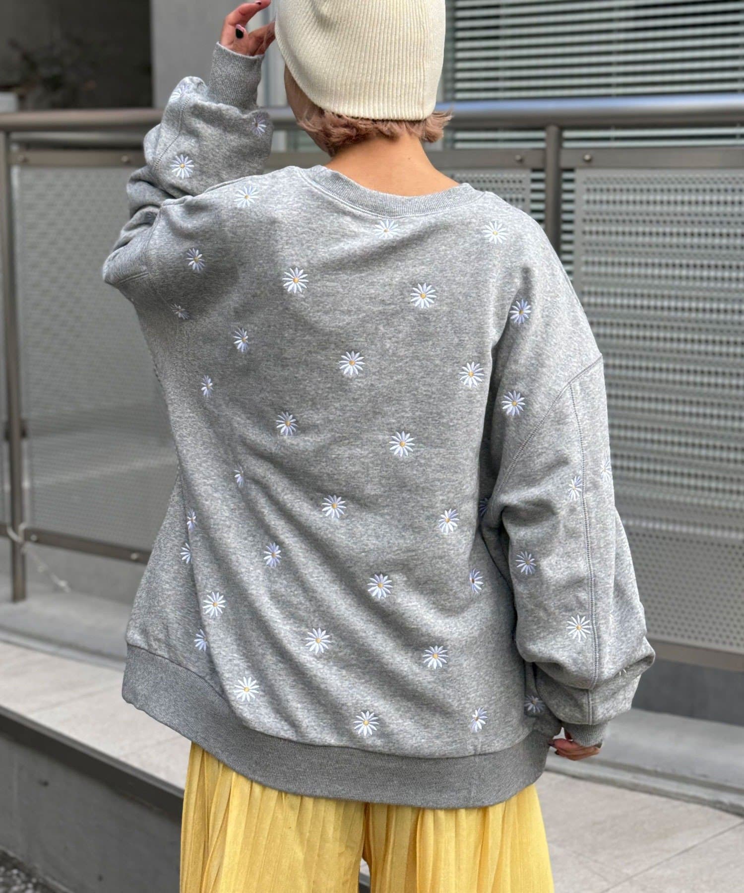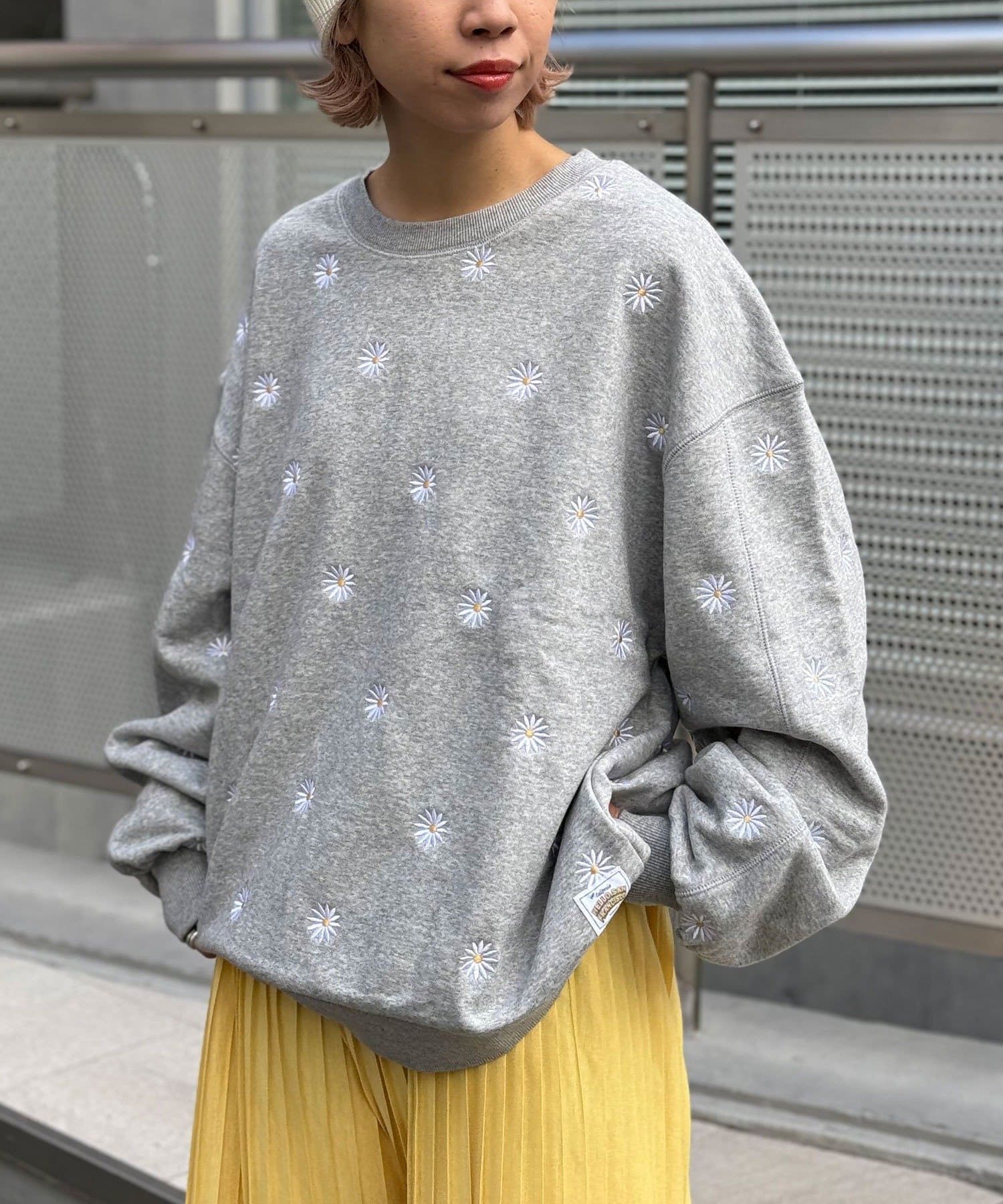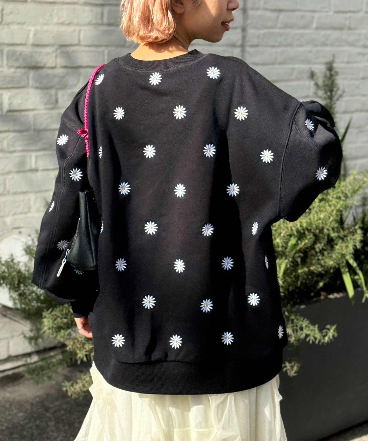 マーガレット刺繍が全体に散りばめられたオーバーサイズスウェット。