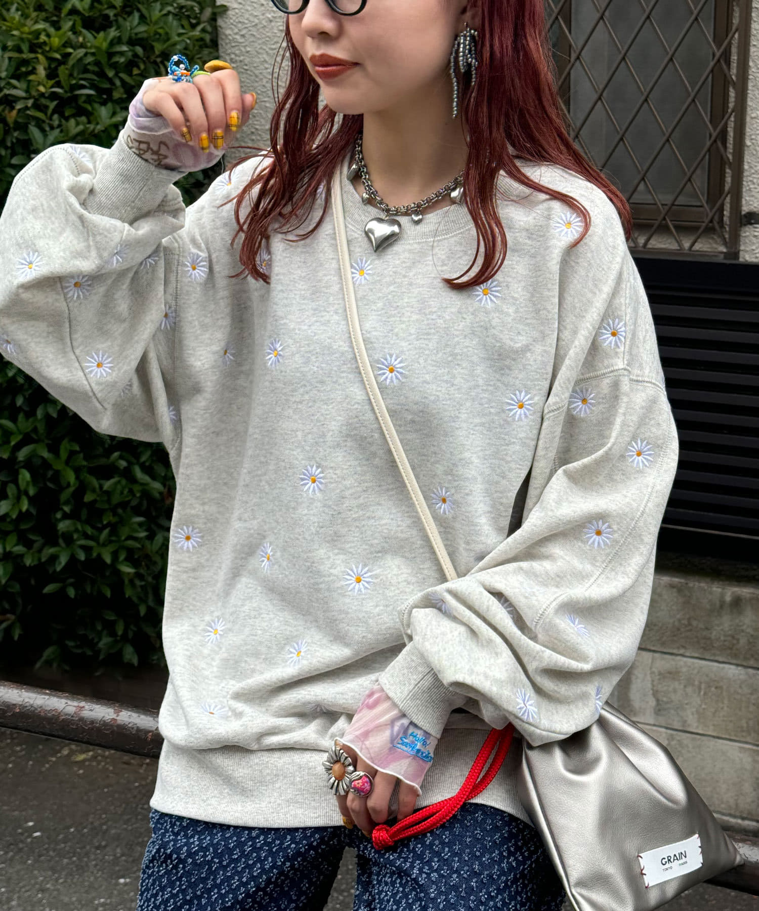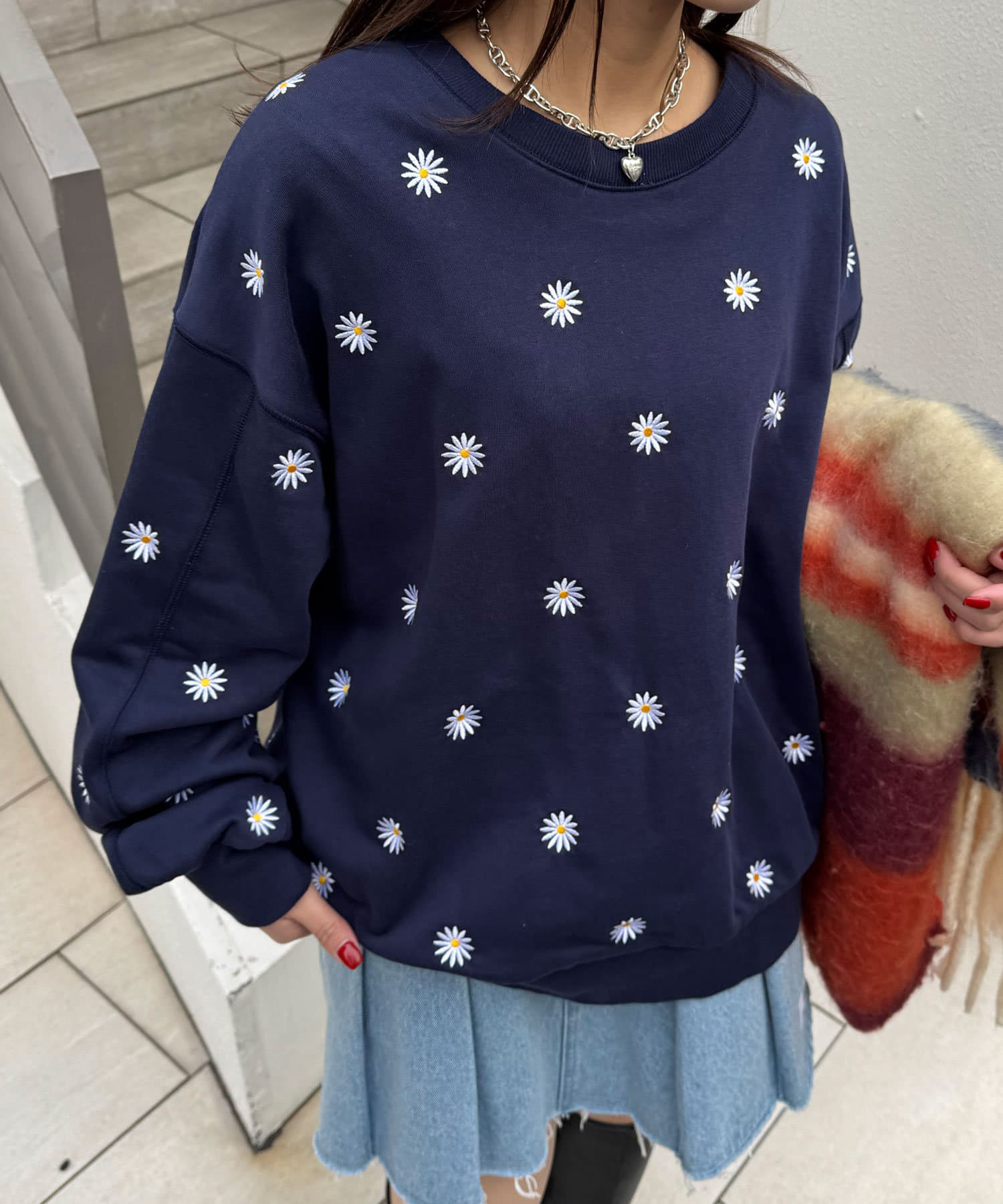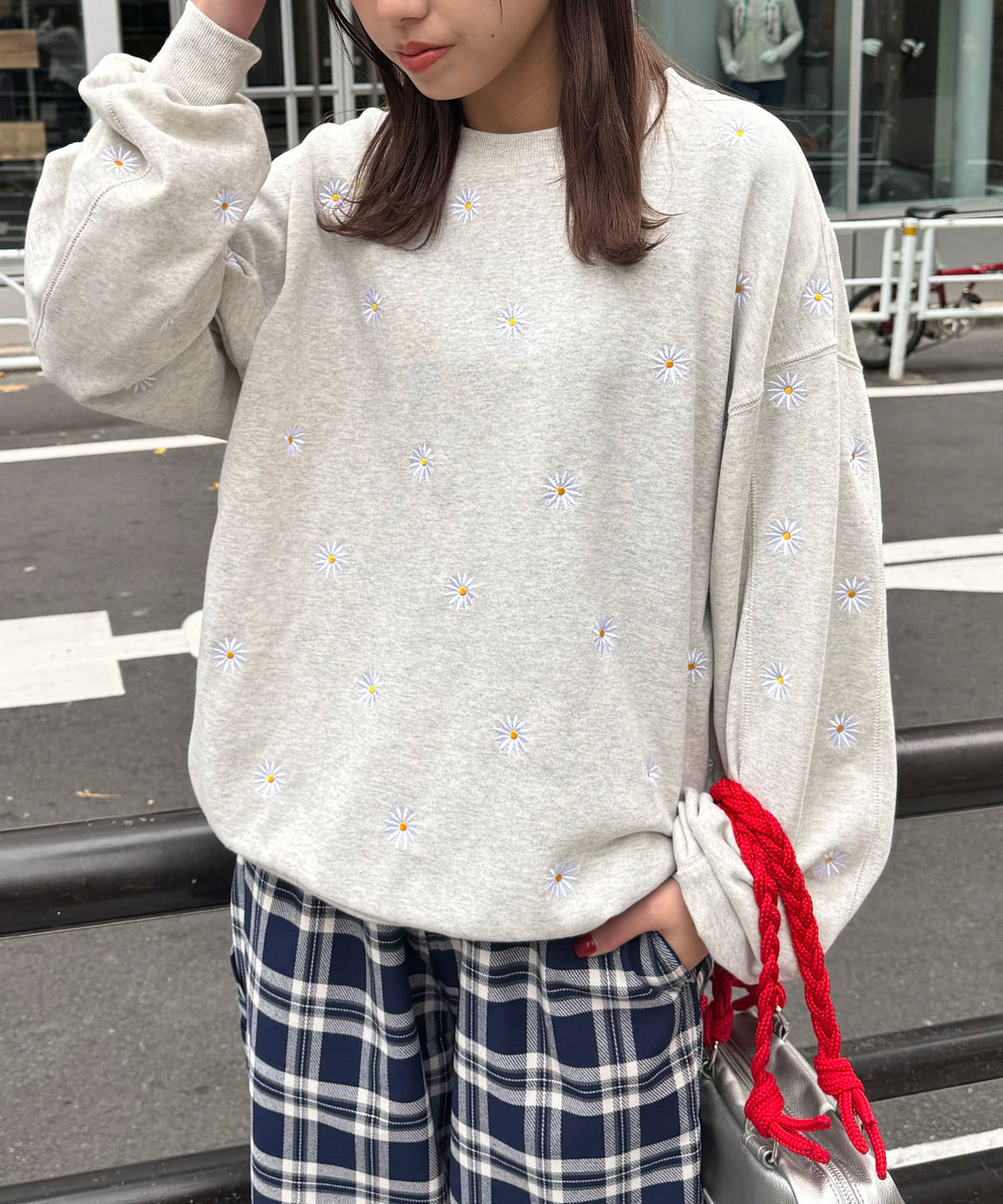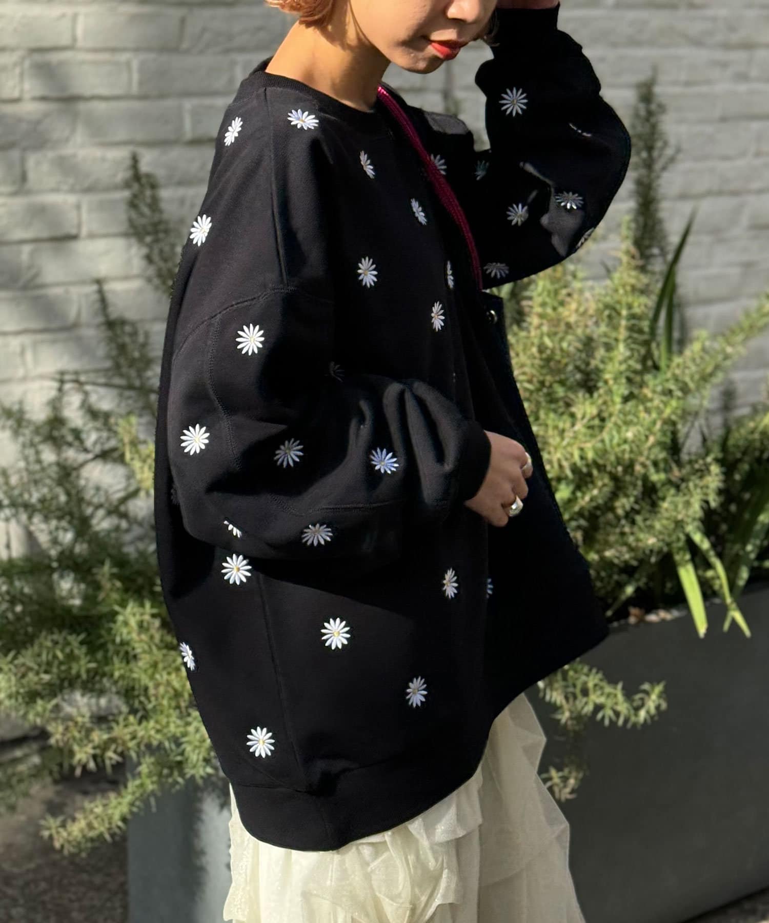 マーガレット刺繍が全体に散りばめられたオーバーサイズスウェット。