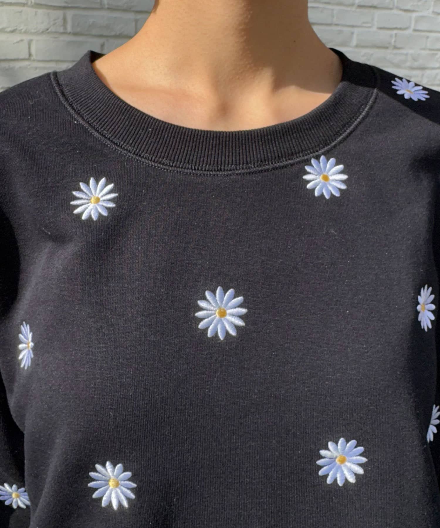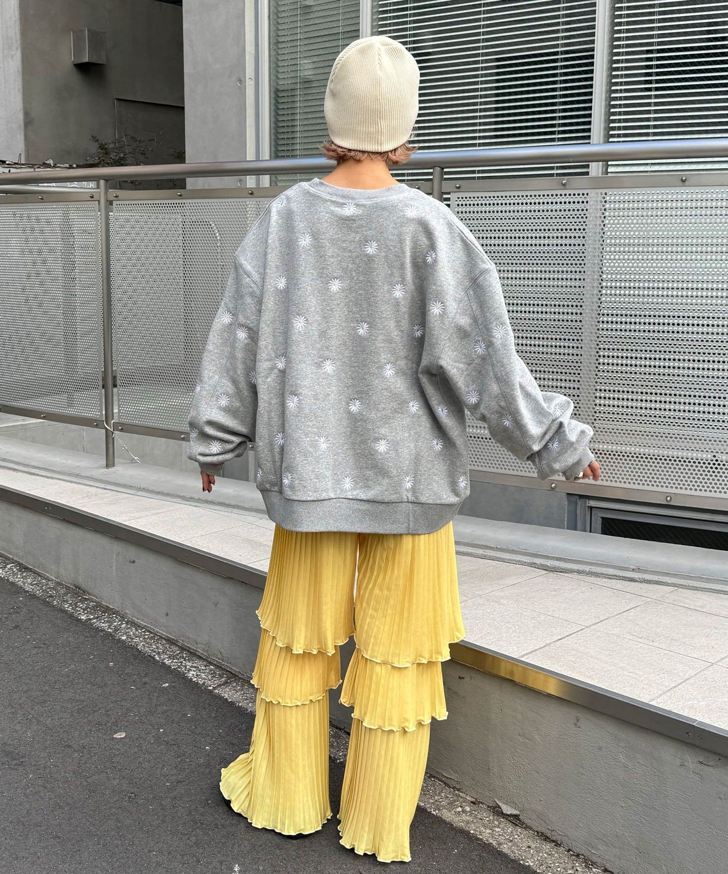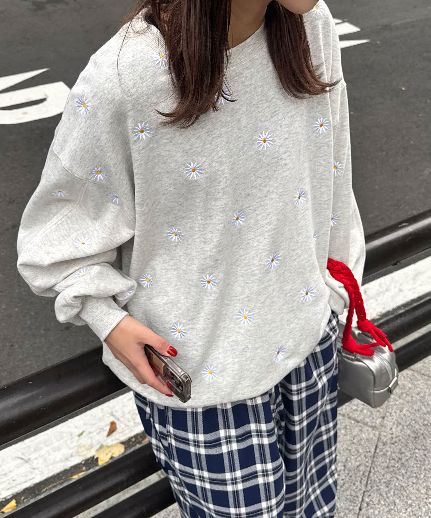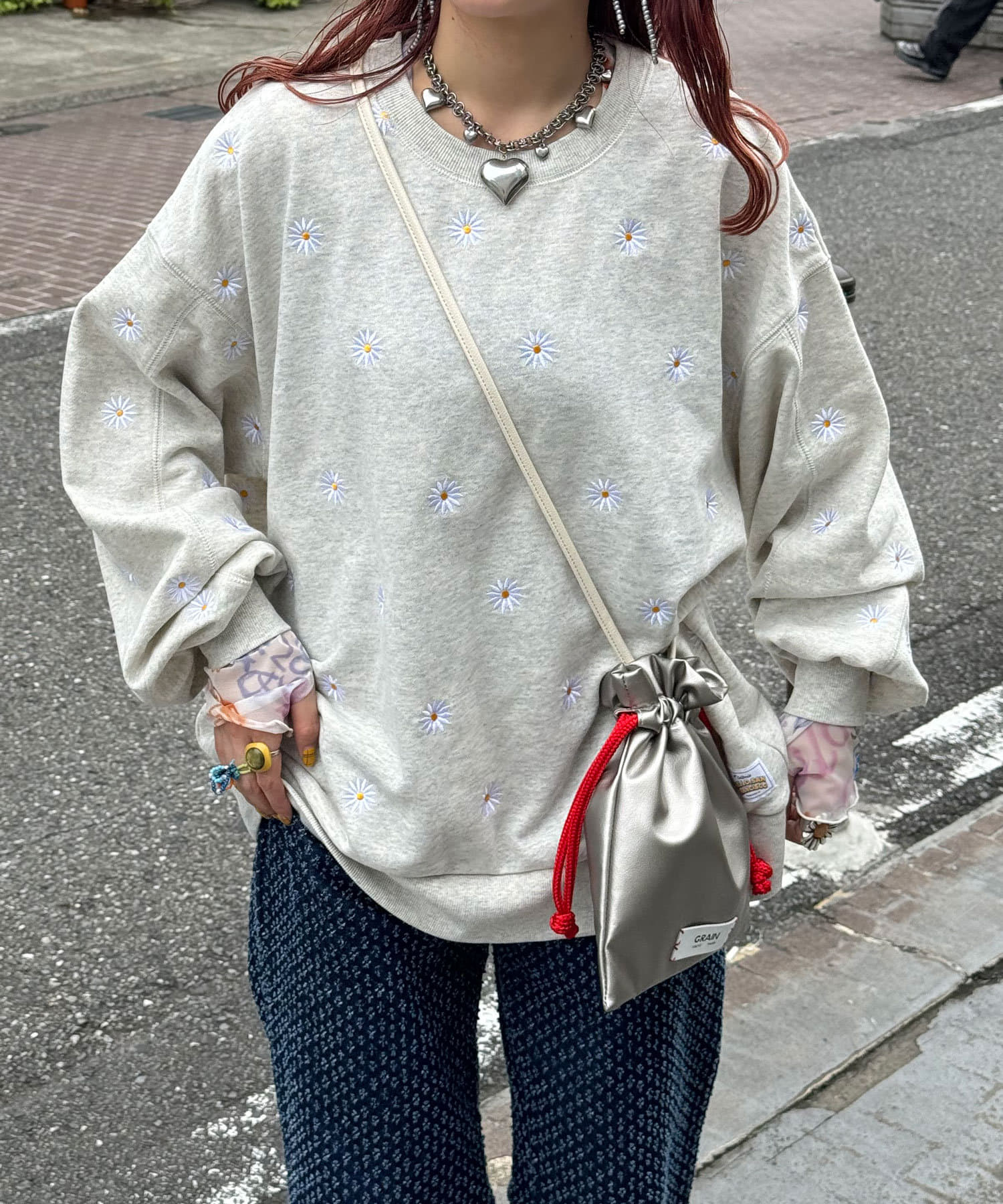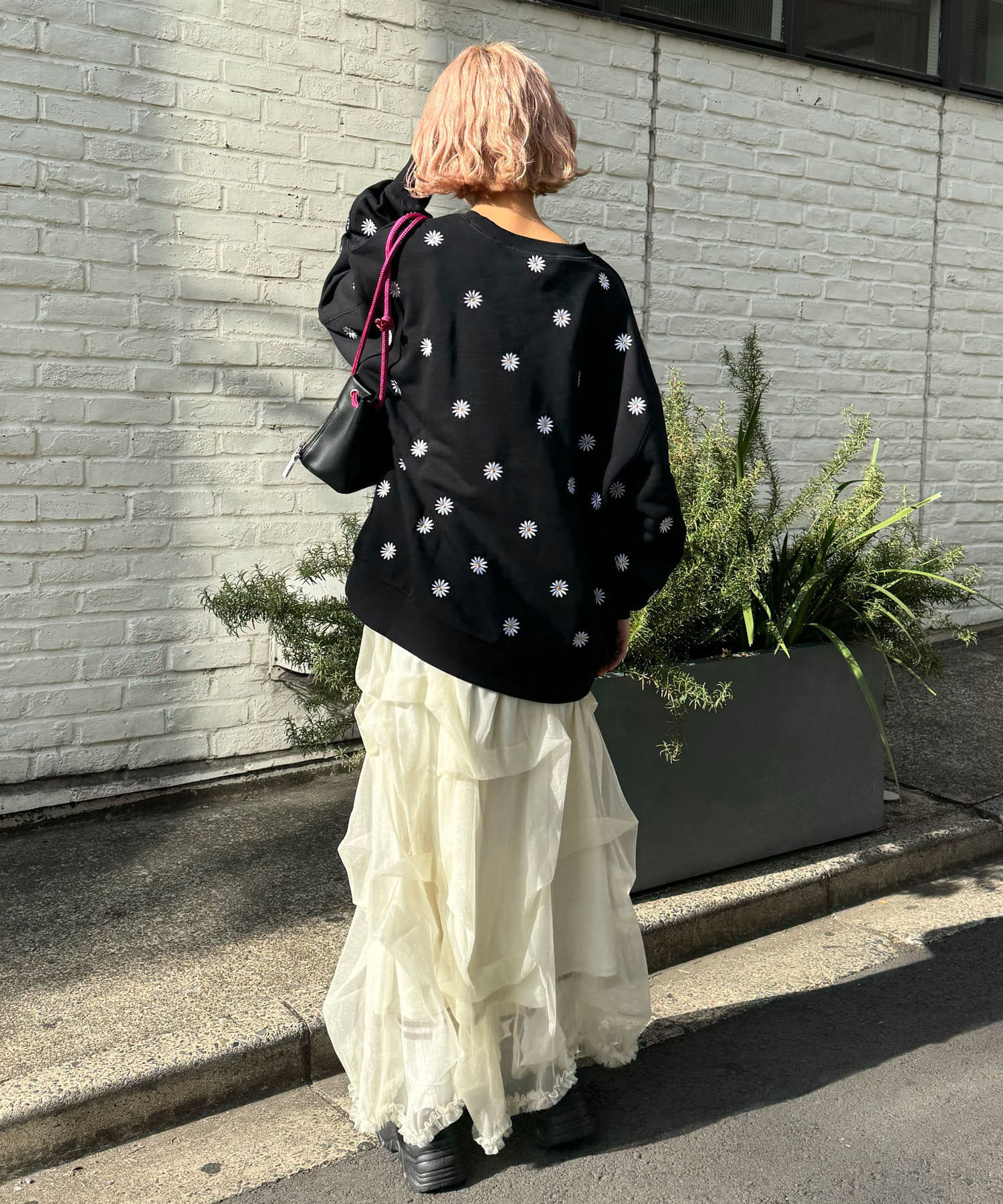 マーガレット刺繍が全体に散りばめられたオーバーサイズスウェット。