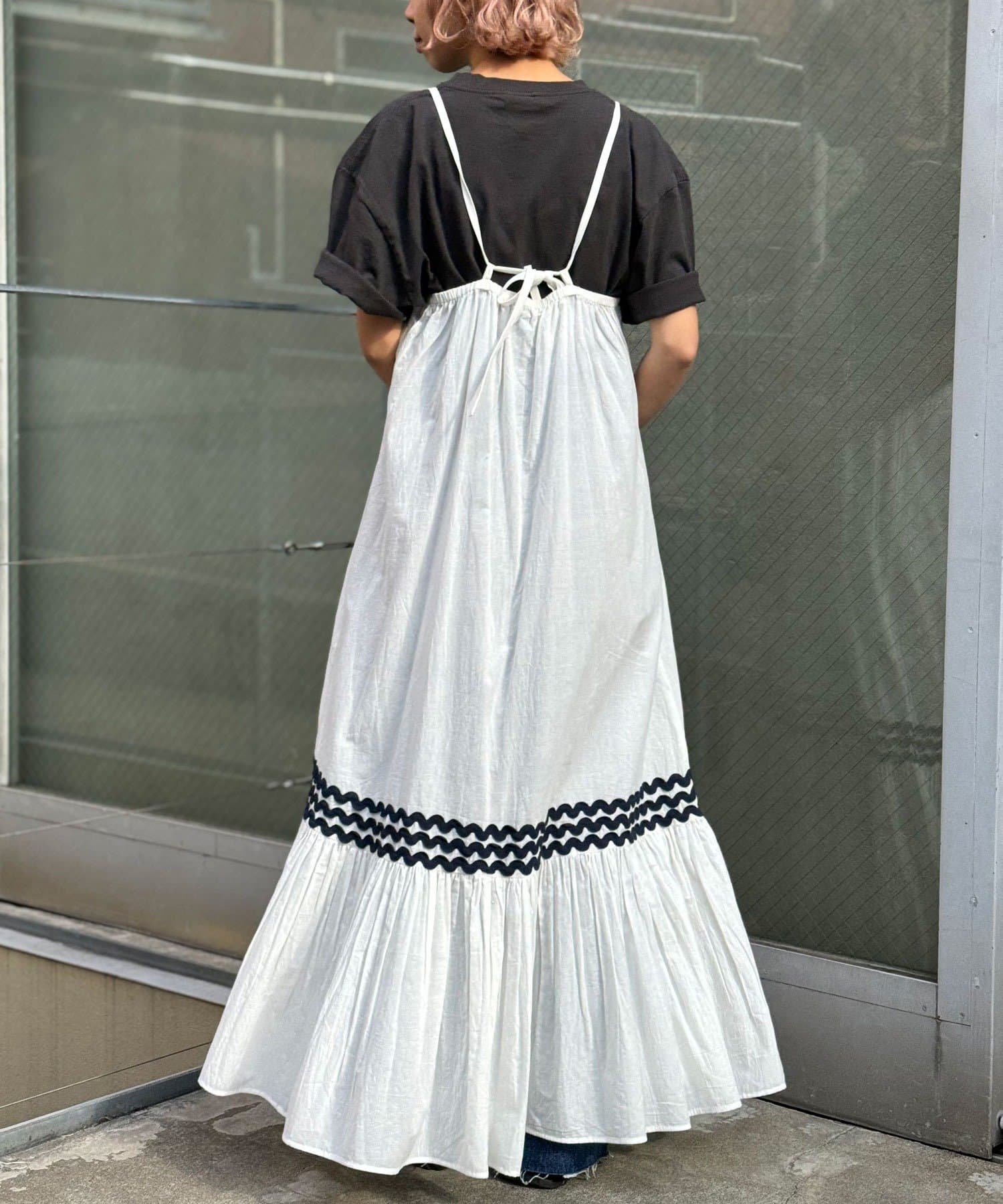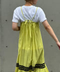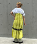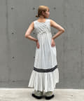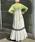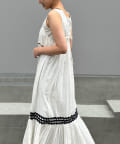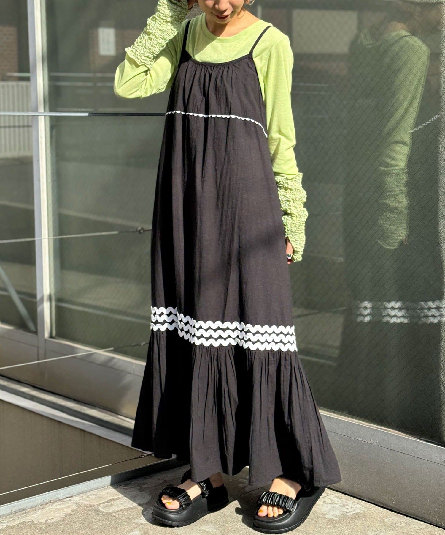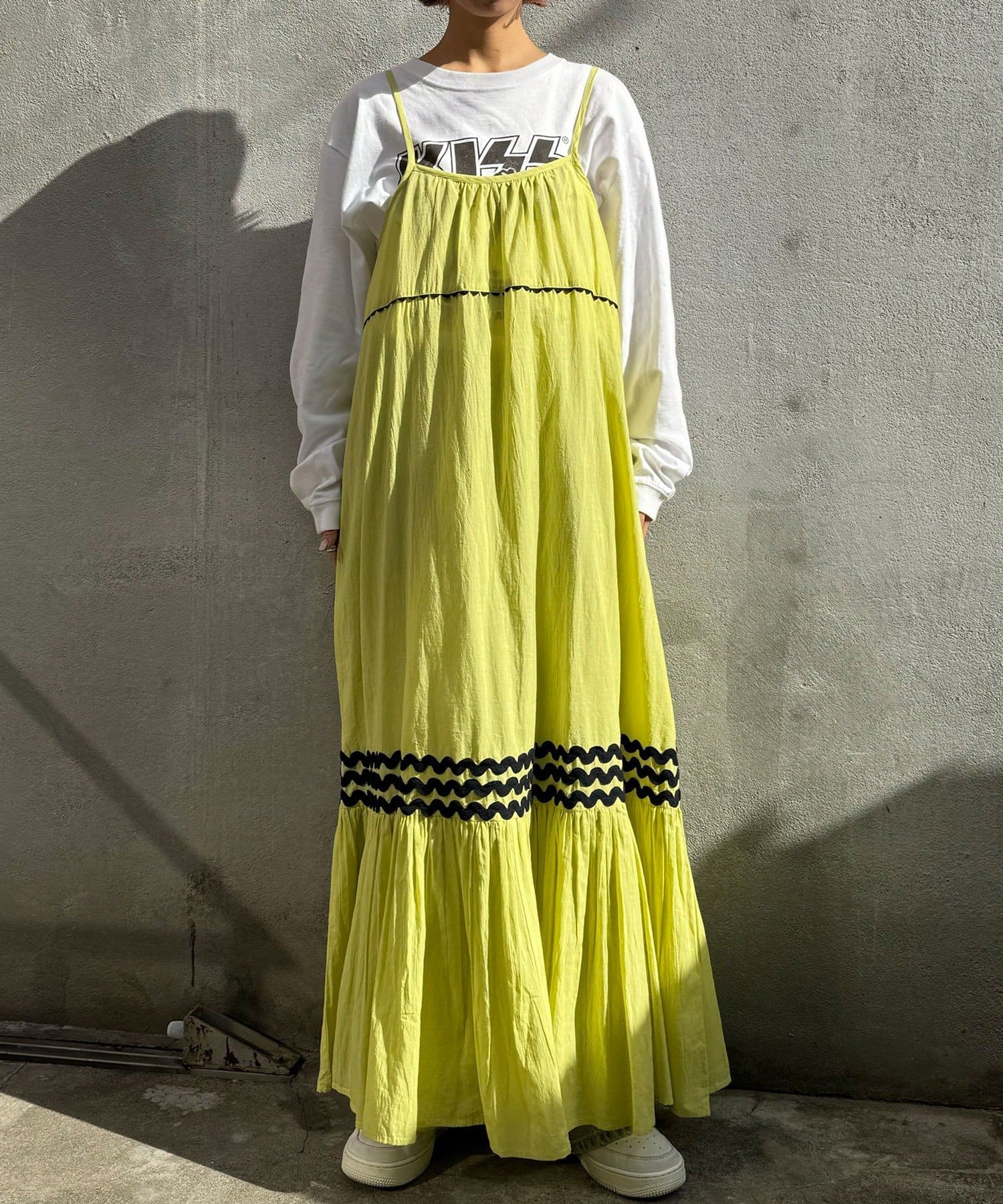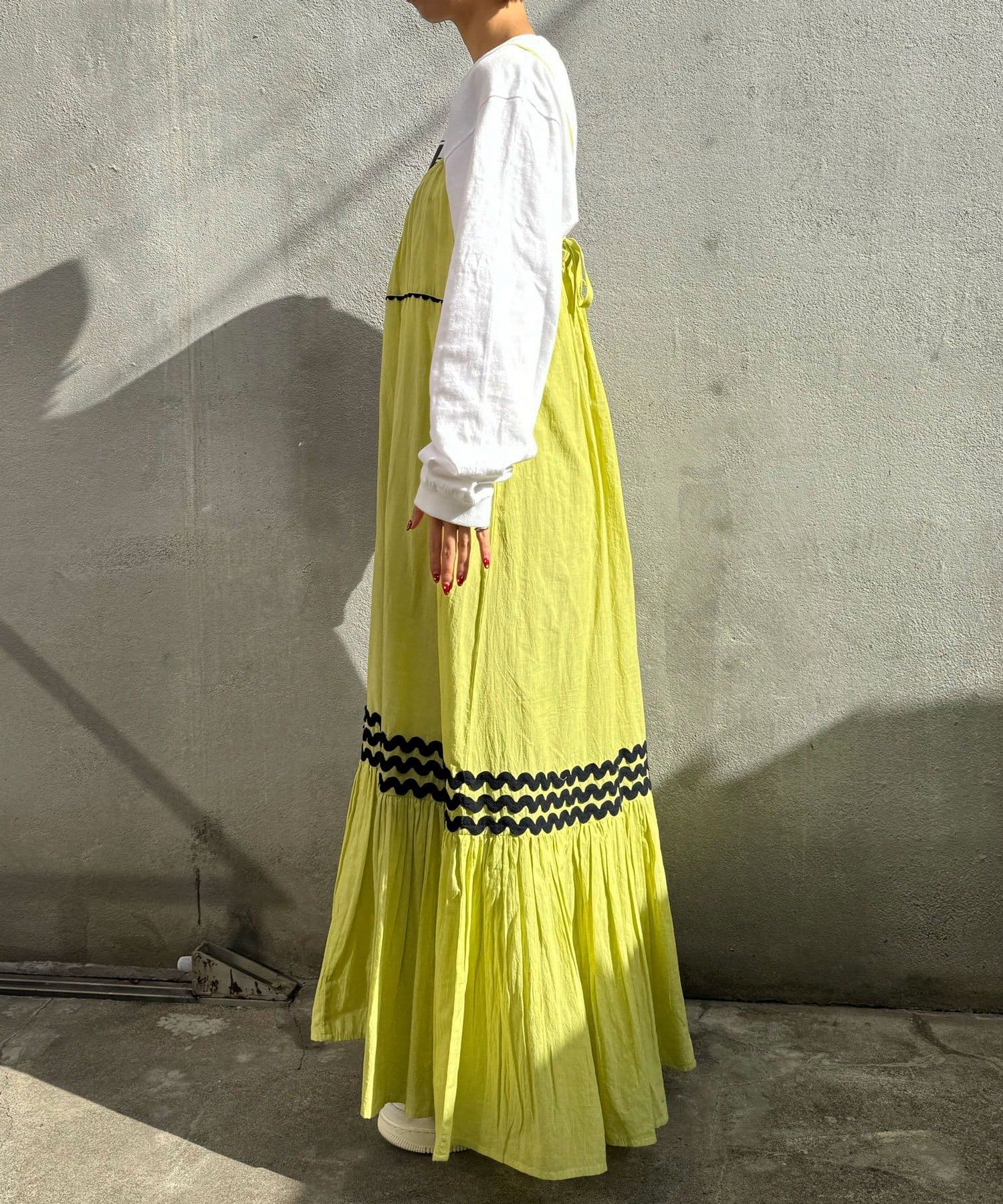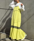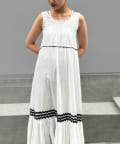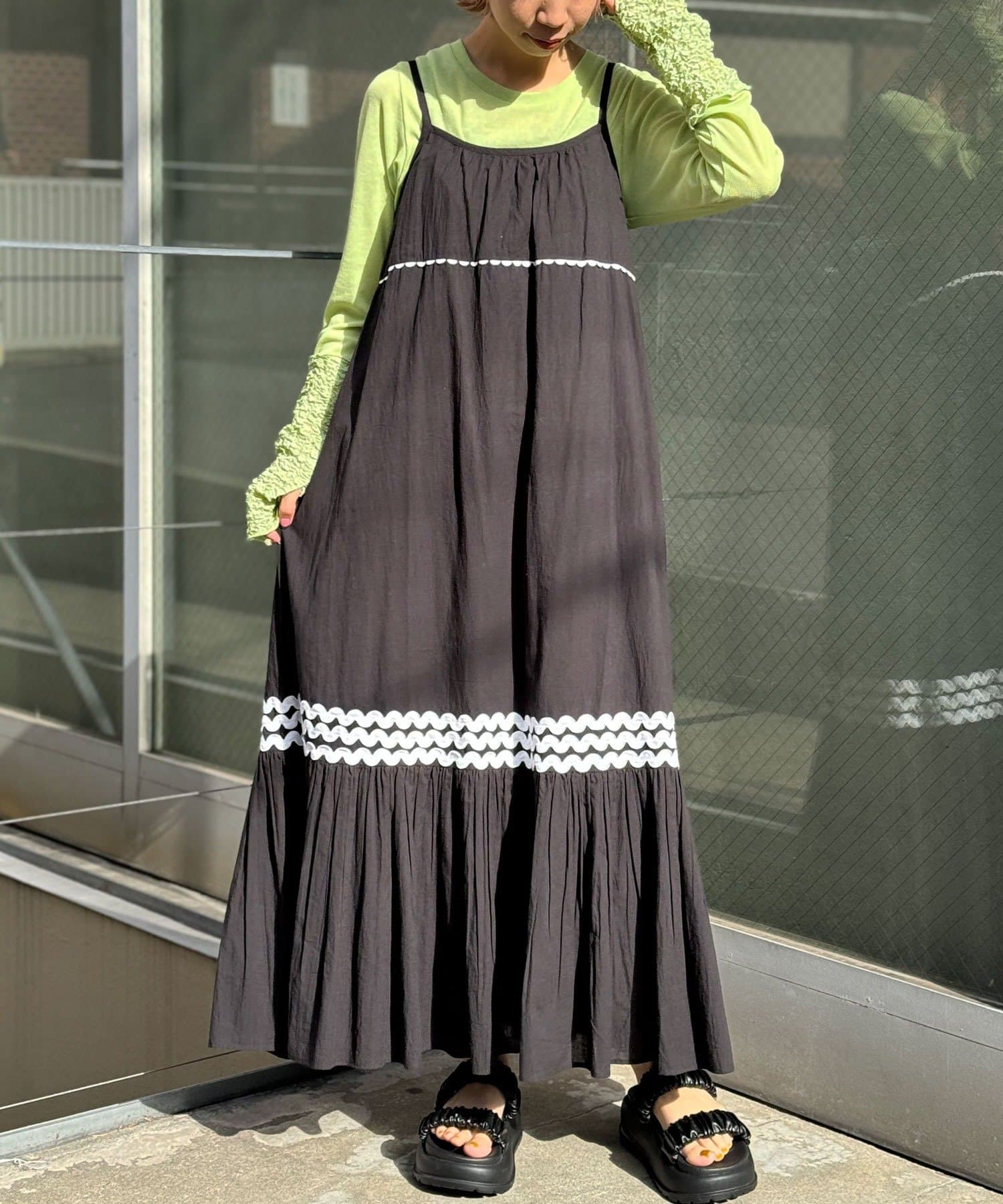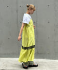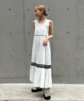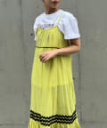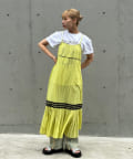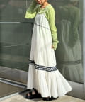 ウエストと裾部分に施された配色カラーのうねうねコードが目を惹くティアードワンピース。